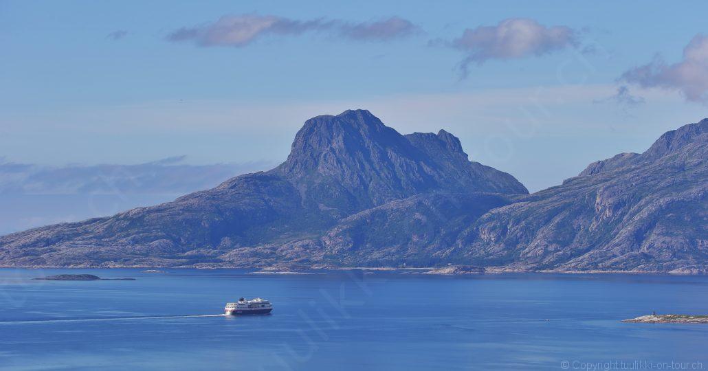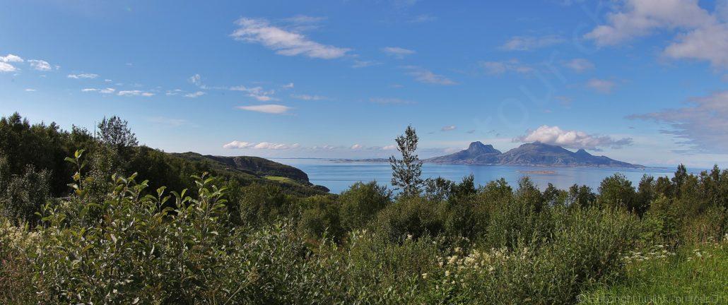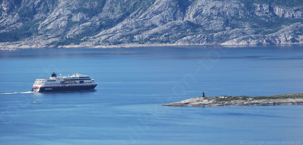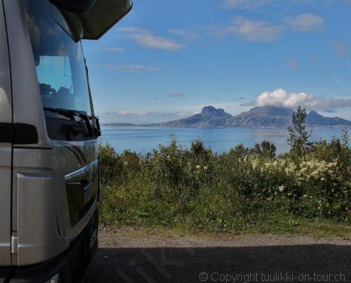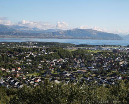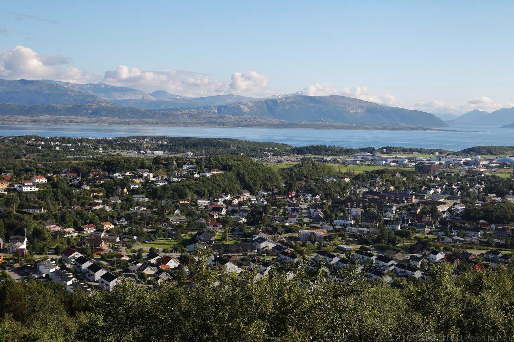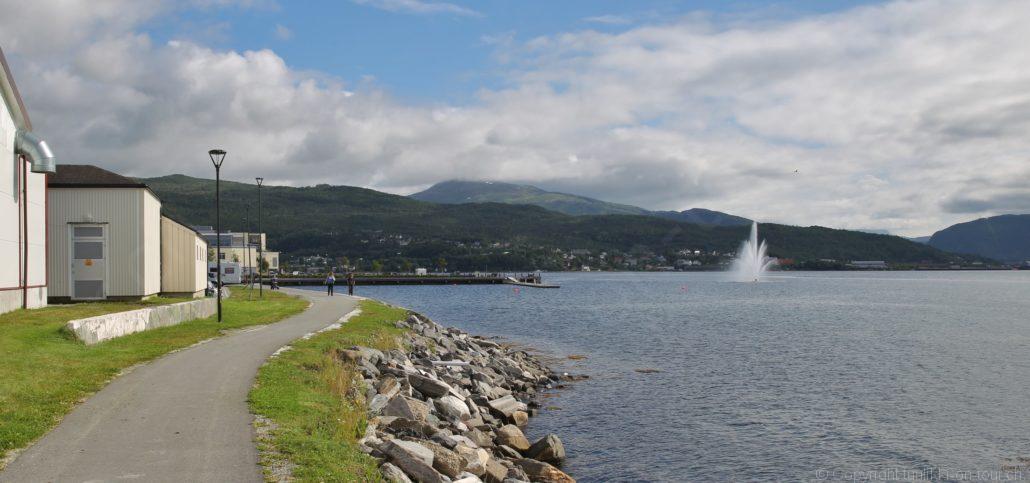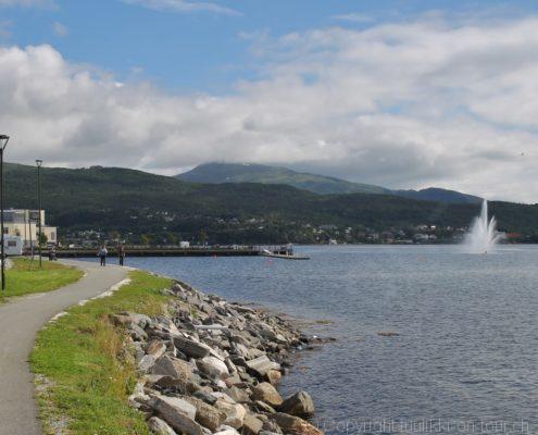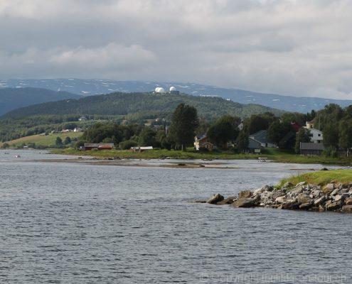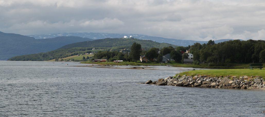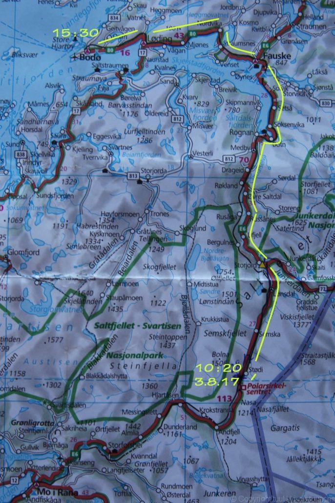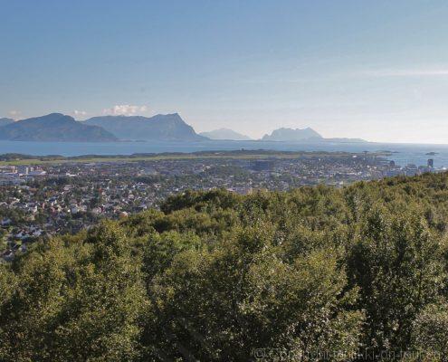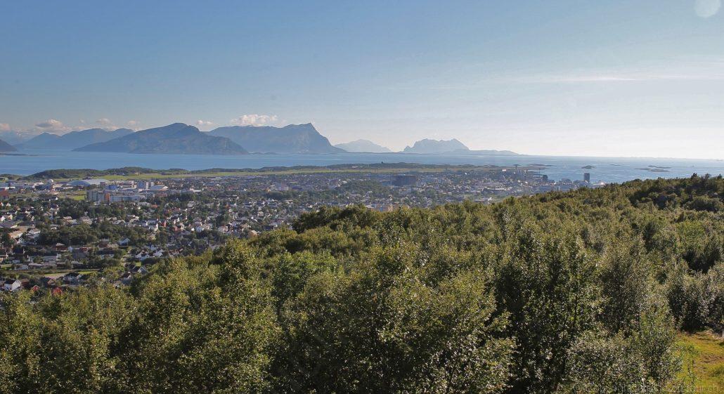 Wir nutzen die Gunst der frühen Morgenstunde und fahren von unserem einsamen Übernachtungsplatz zum arctic center, wo zig WoMos stehen, deren Insassen aber noch schlafen. Nun können wir in aller Ruhe durch die Gegend laufen und ganz alleine die vielen Steinmännchen bewundern, auf den Hügel hinauf ‘klettern’, um runter zu sehen und danach vor dem Polarkreis-Monument Fotos machen und einige Ansichtskarten einwerfen. Wir fahren dann 27 km zurück und weiter durch eine wahrhaft überwältigende Szenerie, entlang des z.T. recht reissenden Saltalselva und danach einem Fjord entlang: links Wasser, rechts Fels auf der E6 bis Fauske. Auf einem grossen Stellplatz am Meer parkieren wir und folgen dem Küstenweg zum ‘jet d’eau’ zu Fuss. Unterwegs erkundigen wir uns nach einer pre-paid SIM-Karte, aber leider funktioniert es in Norwegen nicht so einfach und günstig wie in Finnland. Für Nicht-residents gibt’s für umgerechnet CHF 25.- nur gerade 500 MB, was mit Foto-upload und Mails viel zu wenig ist. Auf aussichtsreicher Strecke folgen wir dann dem Fjord bis Bodo, der Hauptstadt von Nordland, die sehr prominent am Meer/Fjordeingang gelegen ist und regelmässig von den Hurtigruten-Schiffen angefahren wird. Es geht steil bergan zum Parkplatz des Ronvikfjell, von wo wir eine fantastische Aussicht auf die Stadt und die vorgelagerten Inseln haben. Die Wolken haben sich verzogen, blauer Himmel und Sonne herrschen vor und was sehen unsere Augen, soeben fährt das Hurtigruten-Schiff mit Ziel Lofoten aus. Von hier gehen verschiedene Wanderwege los, d.h. am Abend herrscht geradezu Grossandrang von Wanderern, Joggern und Hundespazierern sowie Velofahrern die hierhochgekraxelt sind. Das legt sich aber am späteren Abend und wir haben die herrliche Aussicht fast für uns alleine; das ist eben der Vorteil eines Wohnmobils, man hat alles dabei und kann bleiben, wenn die anderen heim müssen für’s Abendessen und Bett.