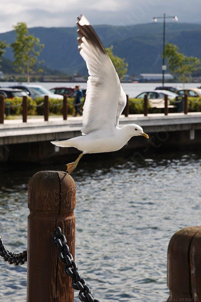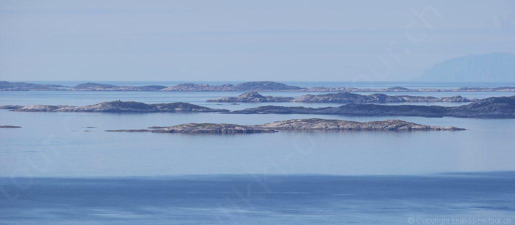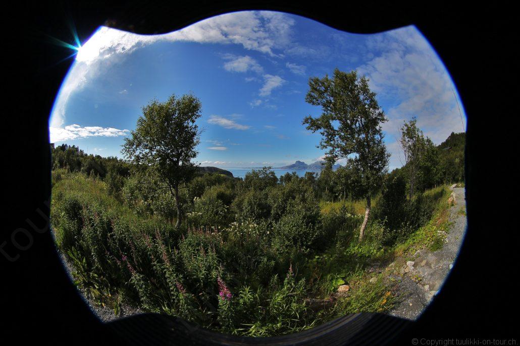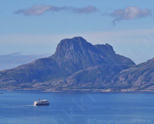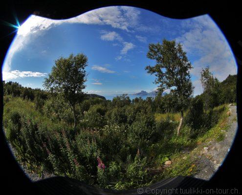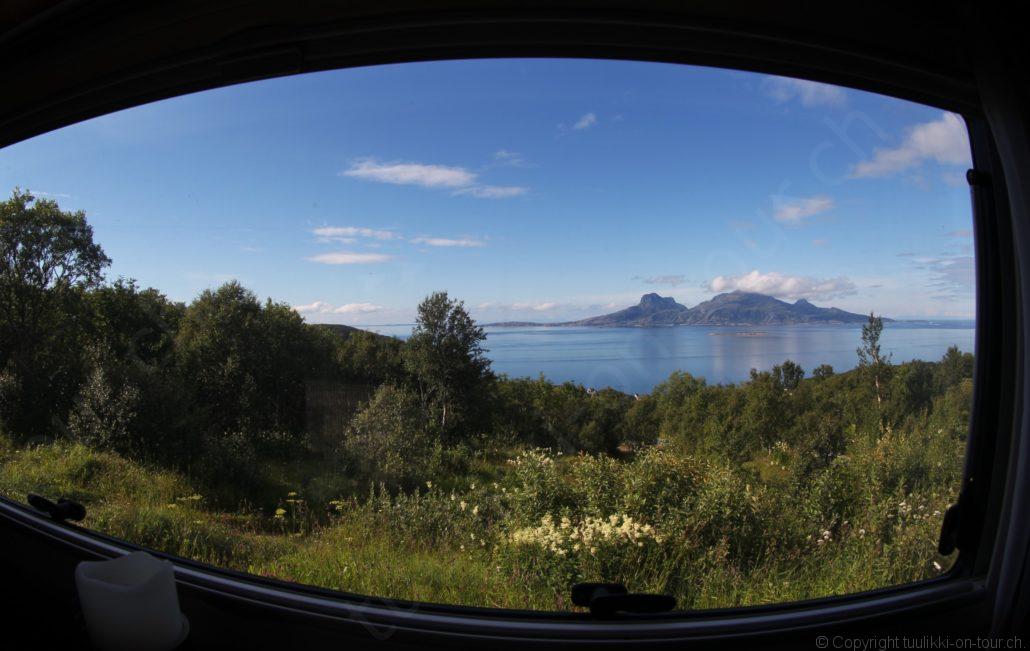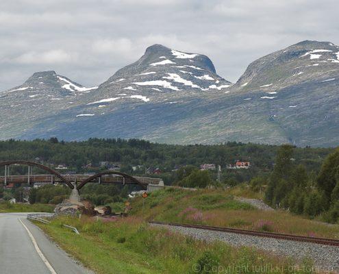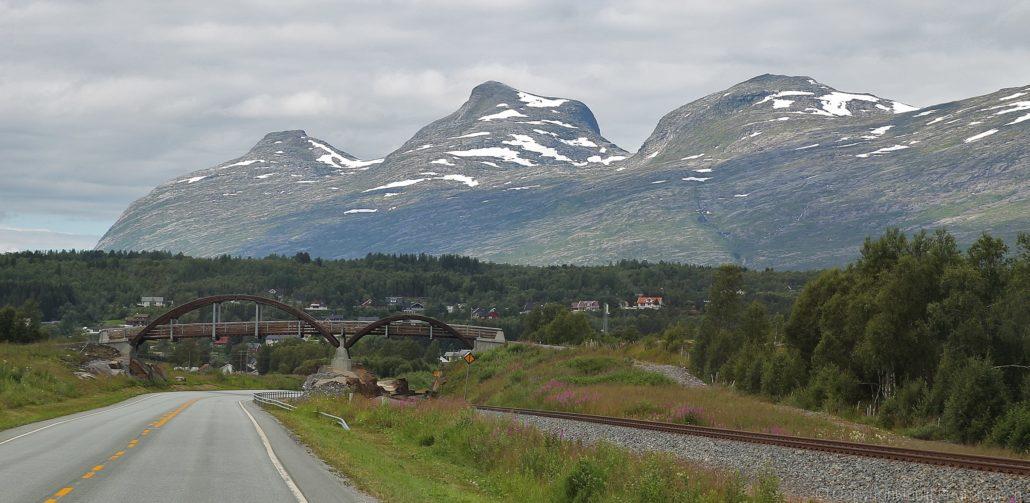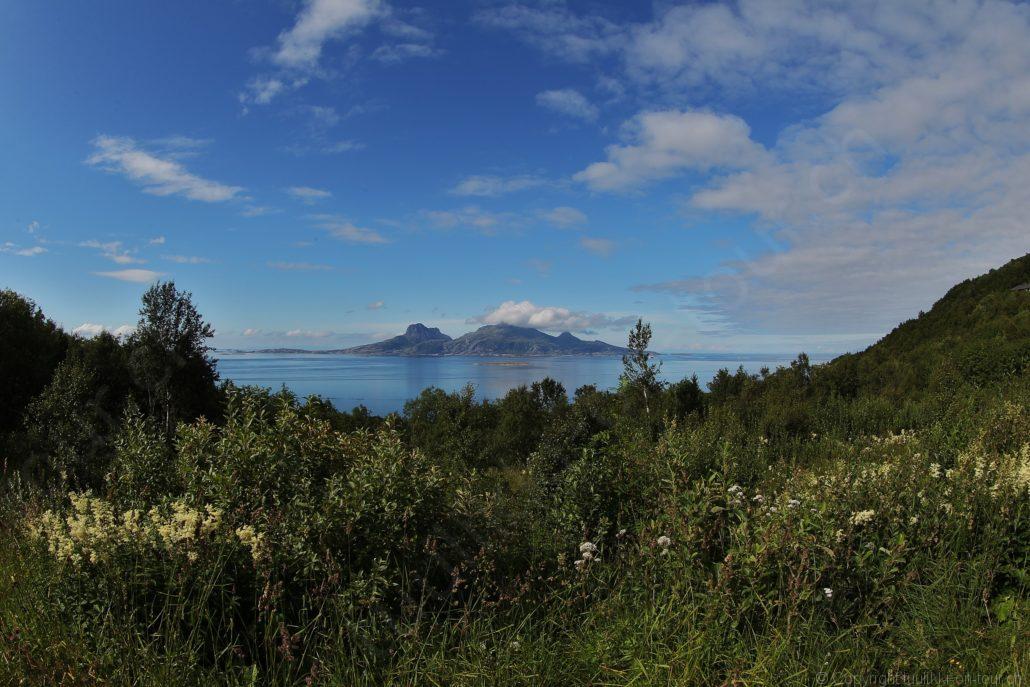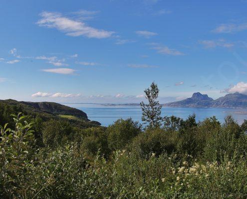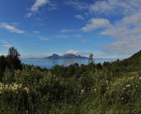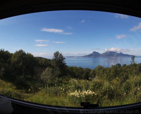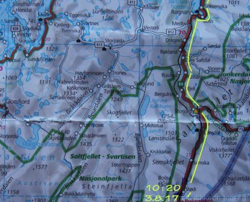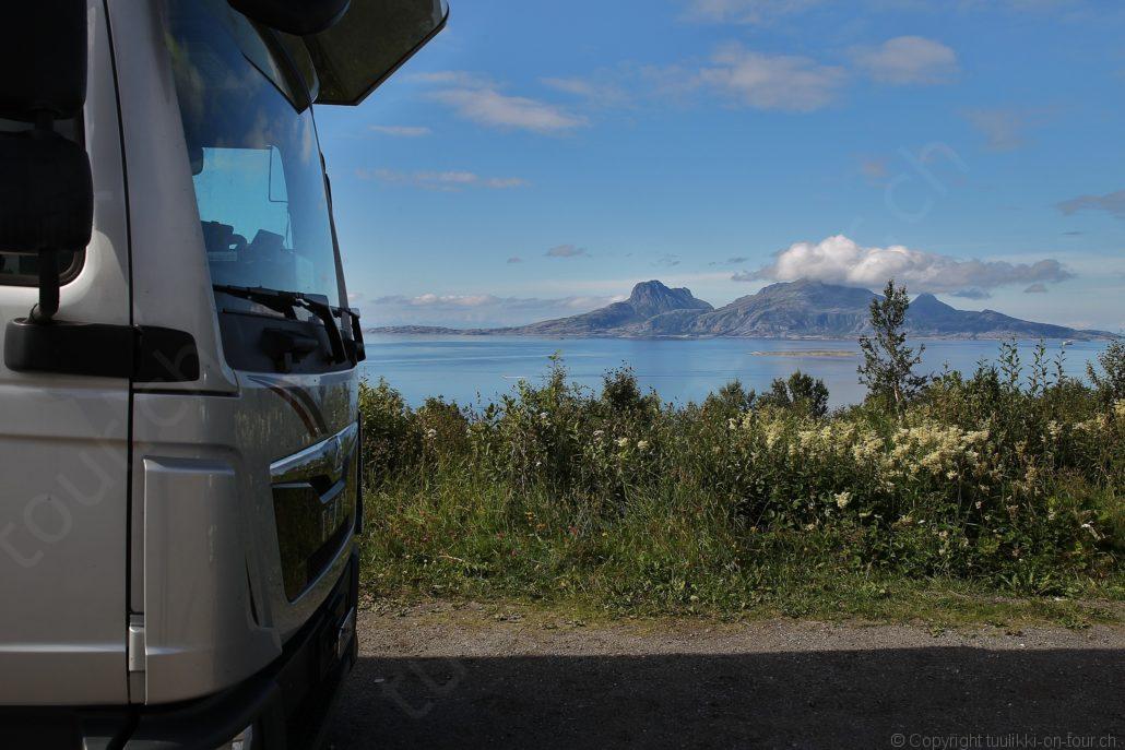 Wir nutzen die Gunst der frühen Morgenstunde und fahren von unserem einsamen Übernachtungsplatz zum arctic center, wo zig WoMos stehen, deren Insassen aber noch schlafen. Nun können wir in aller Ruhe durch die Gegend laufen und ganz alleine die vielen Steinmännchen bewundern, auf den Hügel hinauf ‘klettern’, um runter zu sehen und danach vor dem Polarkreis-Monument Fotos machen und einige Ansichtskarten einwerfen. Wir fahren dann 27 km zurück und weiter durch eine wahrhaft überwältigende Szenerie, entlang des z.T. recht reissenden Saltalselva und danach einem Fjord entlang: links Wasser, rechts Fels auf der E6 bis Fauske. Auf einem grossen Stellplatz am Meer parkieren wir und folgen dem Küstenweg zum ‘jet d’eau’ zu Fuss. Unterwegs erkundigen wir uns nach einer pre-paid SIM-Karte, aber leider funktioniert es in Norwegen nicht so einfach und günstig wie in Finnland. Für Nicht-residents gibt’s für umgerechnet CHF 25.- nur gerade 500 MB, was mit Foto-upload und Mails viel zu wenig ist. Auf aussichtsreicher Strecke folgen wir dann dem Fjord bis Bodo, der Hauptstadt von Nordland, die sehr prominent am Meer/Fjordeingang gelegen ist und regelmässig von den Hurtigruten-Schiffen angefahren wird. Es geht steil bergan zum Parkplatz des Ronvikfjell, von wo wir eine fantastische Aussicht auf die Stadt und die vorgelagerten Inseln haben. Die Wolken haben sich verzogen, blauer Himmel und Sonne herrschen vor und was sehen unsere Augen, soeben fährt das Hurtigruten-Schiff mit Ziel Lofoten aus. Von hier gehen verschiedene Wanderwege los, d.h. am Abend herrscht geradezu Grossandrang von Wanderern, Joggern und Hundespazierern sowie Velofahrern die hierhochgekraxelt sind. Das legt sich aber am späteren Abend und wir haben die herrliche Aussicht fast für uns alleine; das ist eben der Vorteil eines Wohnmobils, man hat alles dabei und kann bleiben, wenn die anderen heim müssen für’s Abendessen und Bett.