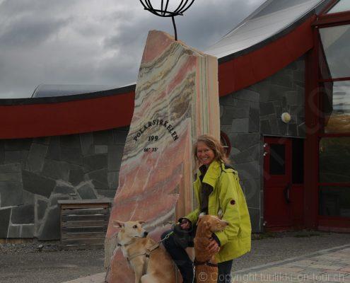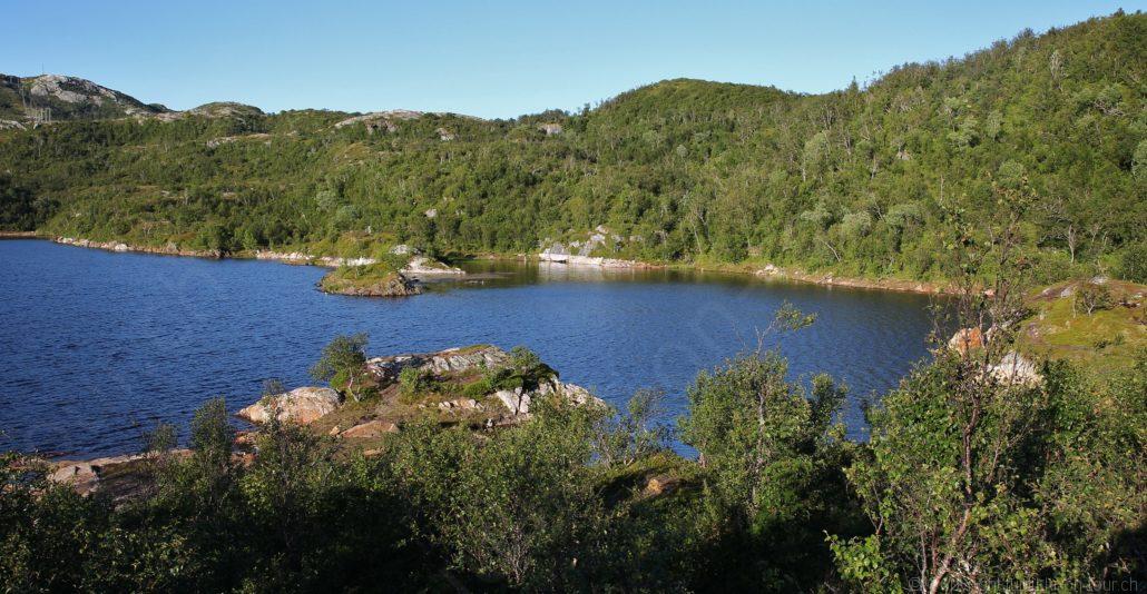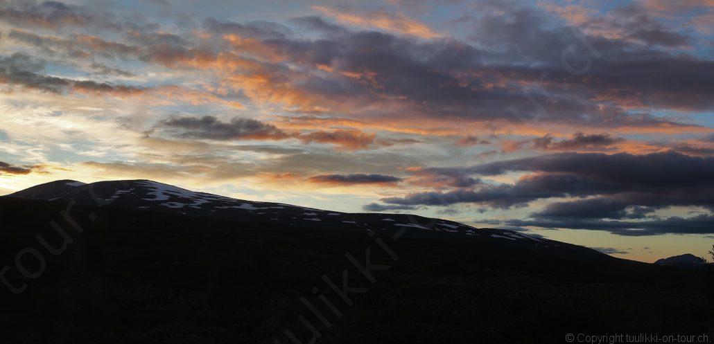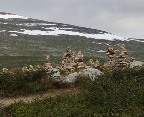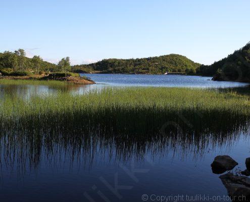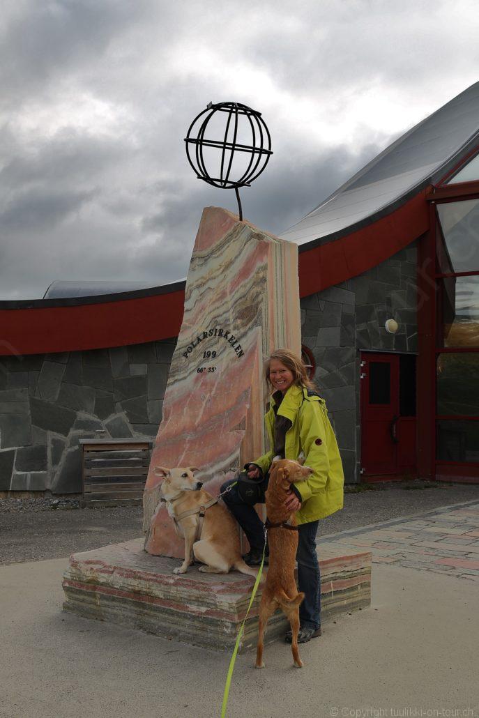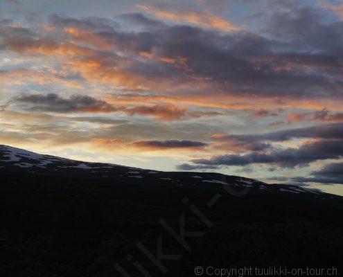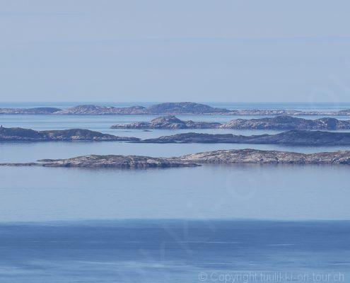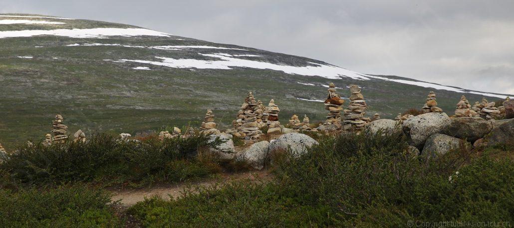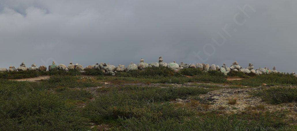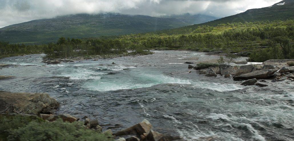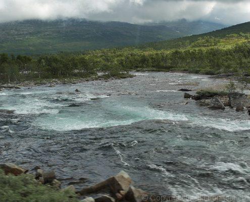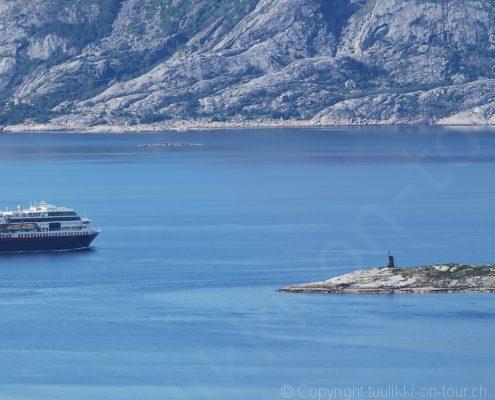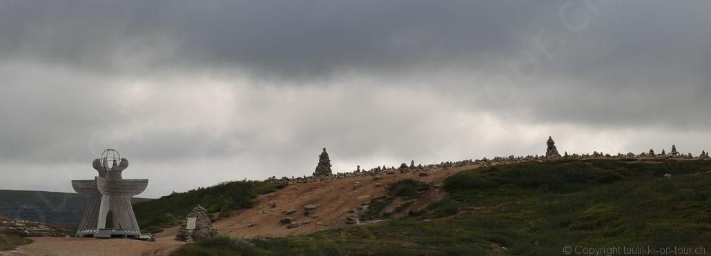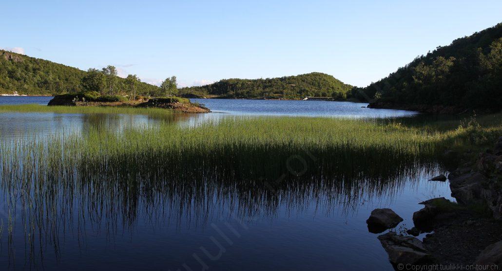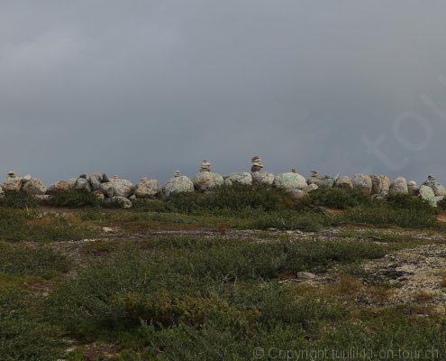 Wir nutzen die Gunst der frühen Morgenstunde und fahren von unserem einsamen Übernachtungsplatz zum arctic center, wo zig WoMos stehen, deren Insassen aber noch schlafen. Nun können wir in aller Ruhe durch die Gegend laufen und ganz alleine die vielen Steinmännchen bewundern, auf den Hügel hinauf ‘klettern’, um runter zu sehen und danach vor dem Polarkreis-Monument Fotos machen und einige Ansichtskarten einwerfen. Wir fahren dann 27 km zurück und weiter durch eine wahrhaft überwältigende Szenerie, entlang des z.T. recht reissenden Saltalselva und danach einem Fjord entlang: links Wasser, rechts Fels auf der E6 bis Fauske. Auf einem grossen Stellplatz am Meer parkieren wir und folgen dem Küstenweg zum ‘jet d’eau’ zu Fuss. Unterwegs erkundigen wir uns nach einer pre-paid SIM-Karte, aber leider funktioniert es in Norwegen nicht so einfach und günstig wie in Finnland. Für Nicht-residents gibt’s für umgerechnet CHF 25.- nur gerade 500 MB, was mit Foto-upload und Mails viel zu wenig ist. Auf aussichtsreicher Strecke folgen wir dann dem Fjord bis Bodo, der Hauptstadt von Nordland, die sehr prominent am Meer/Fjordeingang gelegen ist und regelmässig von den Hurtigruten-Schiffen angefahren wird. Es geht steil bergan zum Parkplatz des Ronvikfjell, von wo wir eine fantastische Aussicht auf die Stadt und die vorgelagerten Inseln haben. Die Wolken haben sich verzogen, blauer Himmel und Sonne herrschen vor und was sehen unsere Augen, soeben fährt das Hurtigruten-Schiff mit Ziel Lofoten aus. Von hier gehen verschiedene Wanderwege los, d.h. am Abend herrscht geradezu Grossandrang von Wanderern, Joggern und Hundespazierern sowie Velofahrern die hierhochgekraxelt sind. Das legt sich aber am späteren Abend und wir haben die herrliche Aussicht fast für uns alleine; das ist eben der Vorteil eines Wohnmobils, man hat alles dabei und kann bleiben, wenn die anderen heim müssen für’s Abendessen und Bett.