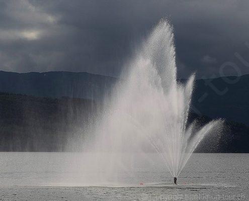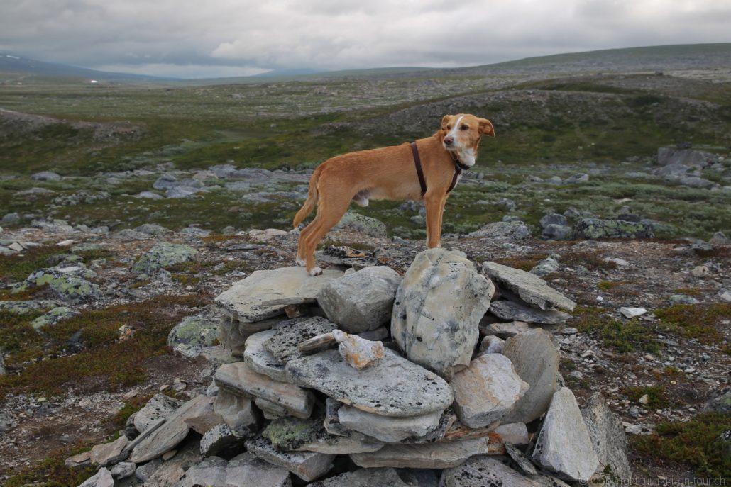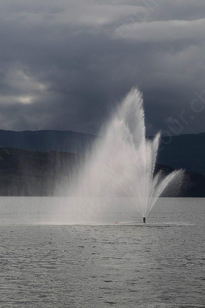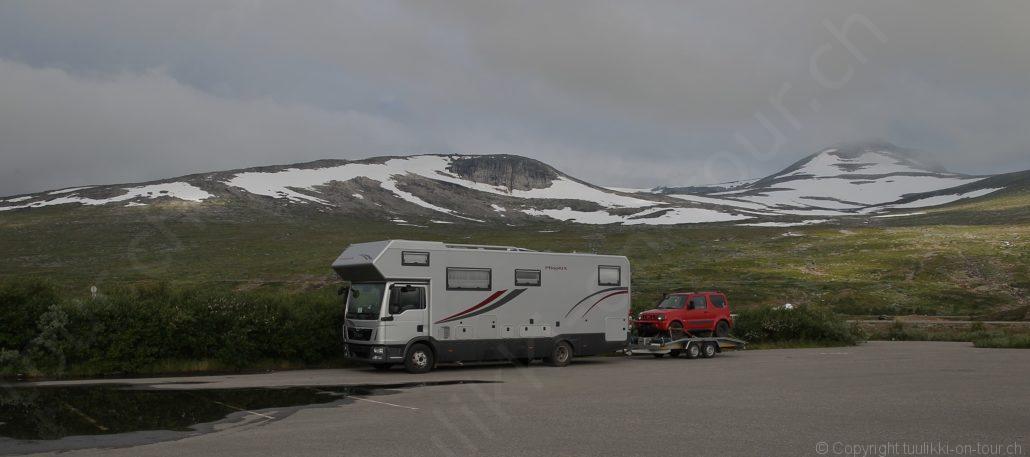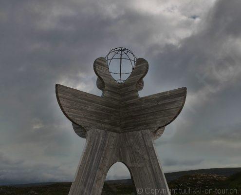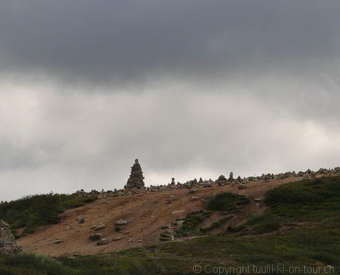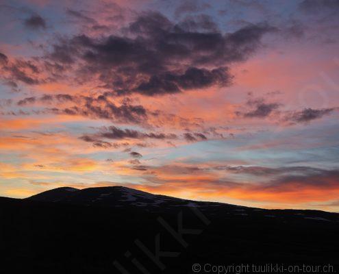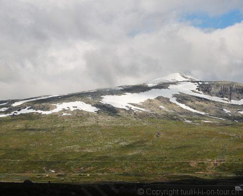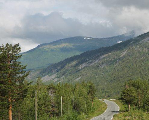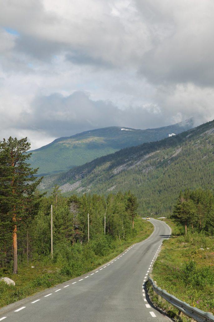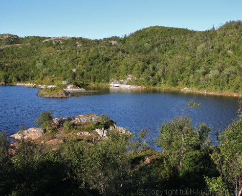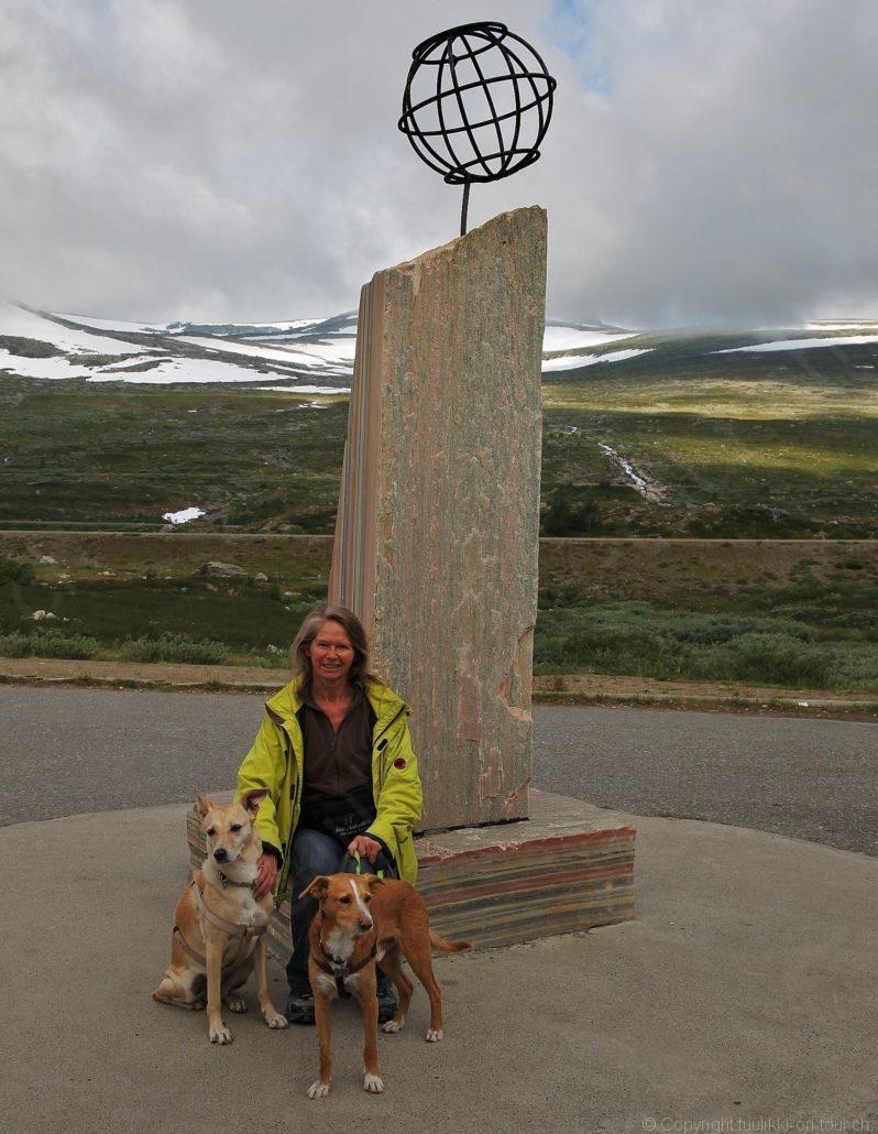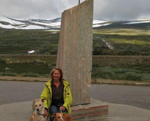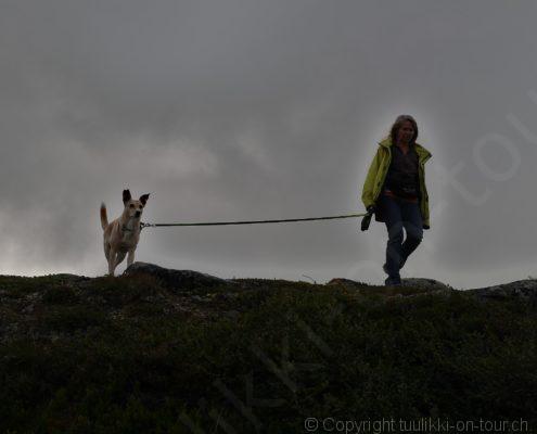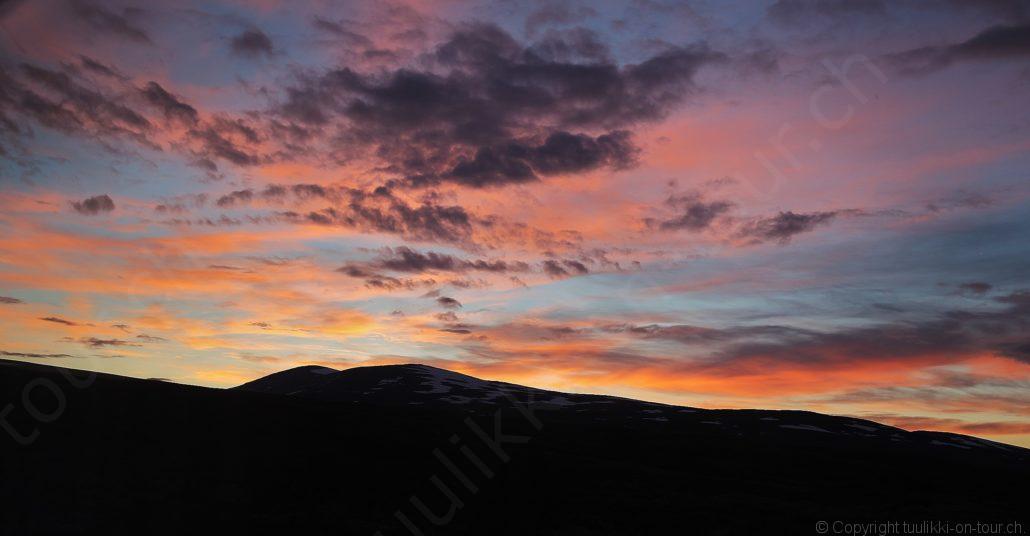Wir nutzen die Gunst der frühen Morgenstunde und fahren von unserem einsamen Übernachtungsplatz zum arctic center, wo zig WoMos stehen, deren Insassen aber noch schlafen. Nun können wir in aller Ruhe durch die Gegend laufen und ganz alleine die vielen Steinmännchen bewundern, auf den Hügel hinauf ‘klettern’, um runter zu sehen und danach vor dem Polarkreis-Monument Fotos machen und einige Ansichtskarten einwerfen. Wir fahren dann 27 km zurück und weiter durch eine wahrhaft überwältigende Szenerie, entlang des z.T. recht reissenden Saltalselva und danach einem Fjord entlang: links Wasser, rechts Fels auf der E6 bis Fauske. Auf einem grossen Stellplatz am Meer parkieren wir und folgen dem Küstenweg zum ‘jet d’eau’ zu Fuss. Unterwegs erkundigen wir uns nach einer pre-paid SIM-Karte, aber leider funktioniert es in Norwegen nicht so einfach und günstig wie in Finnland. Für Nicht-residents gibt’s für umgerechnet CHF 25.- nur gerade 500 MB, was mit Foto-upload und Mails viel zu wenig ist. Auf aussichtsreicher Strecke folgen wir dann dem Fjord bis Bodo, der Hauptstadt von Nordland, die sehr prominent am Meer/Fjordeingang gelegen ist und regelmässig von den Hurtigruten-Schiffen angefahren wird. Es geht steil bergan zum Parkplatz des Ronvikfjell, von wo wir eine fantastische Aussicht auf die Stadt und die vorgelagerten Inseln haben. Die Wolken haben sich verzogen, blauer Himmel und Sonne herrschen vor und was sehen unsere Augen, soeben fährt das Hurtigruten-Schiff mit Ziel Lofoten aus. Von hier gehen verschiedene Wanderwege los, d.h. am Abend herrscht geradezu Grossandrang von Wanderern, Joggern und Hundespazierern sowie Velofahrern die hierhochgekraxelt sind. Das legt sich aber am späteren Abend und wir haben die herrliche Aussicht fast für uns alleine; das ist eben der Vorteil eines Wohnmobils, man hat alles dabei und kann bleiben, wenn die anderen heim müssen für’s Abendessen und Bett.