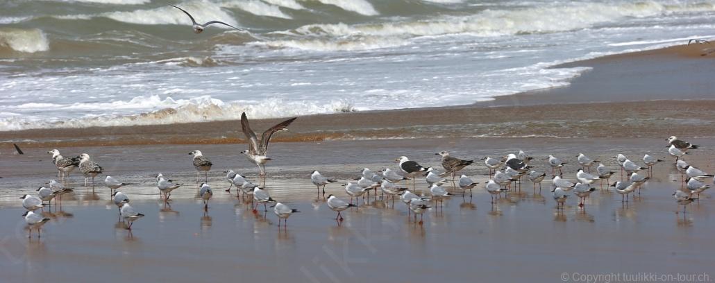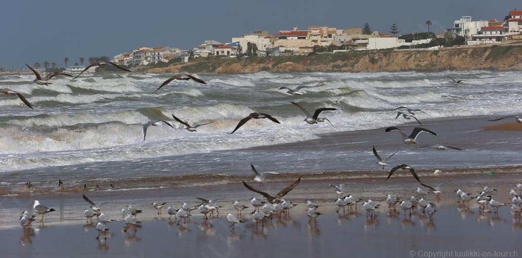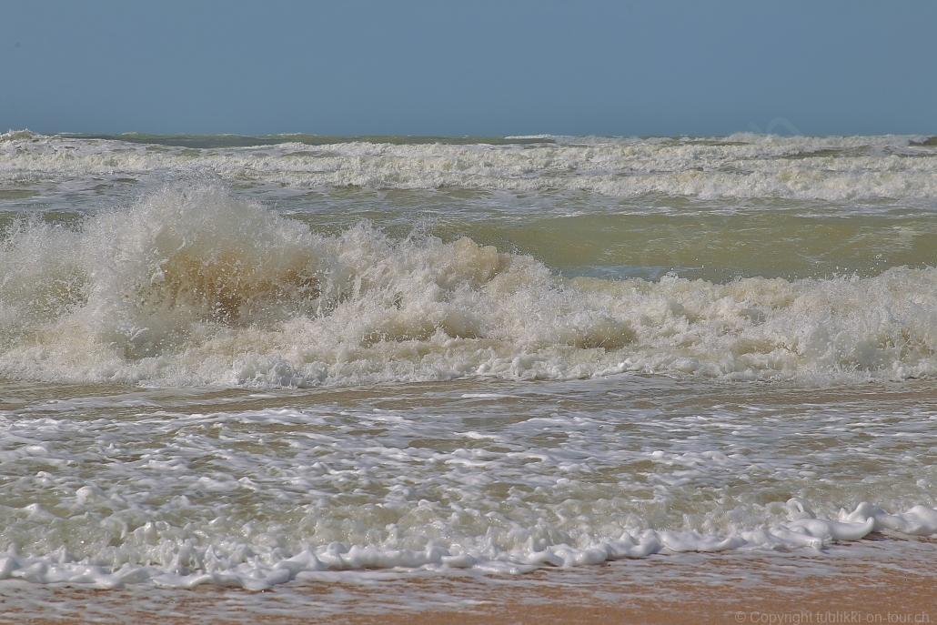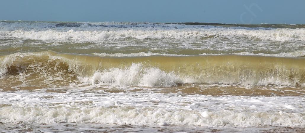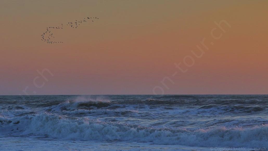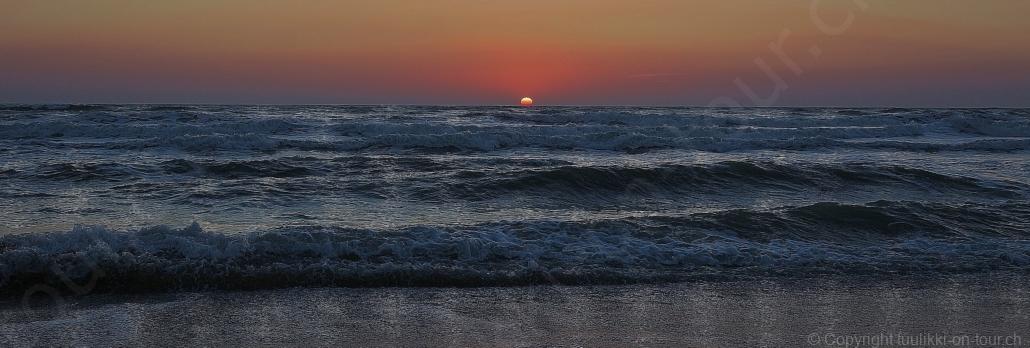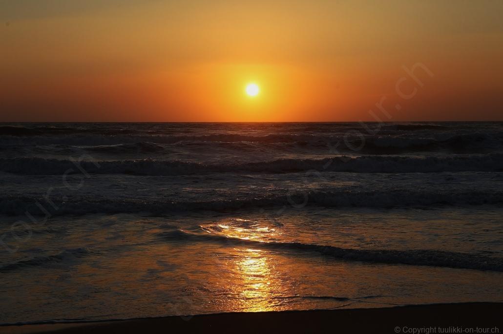 Am Abend wollen wir der Küste entlang zum Hafen spazieren; jetzt sehen wir von weitem, dass die Wellen an die Quaimauer schlagen und hohe Gischt spritzt, bis dann soll sich der Wind jedoch etwas legen. Leider gibt es keinen Durchgang, ohne dass man auf der Strasse läuft und bei diesen rasanten Tempi, die die Einheimischen anschlagen wagen wir es nicht. Dafür gibt es einmal mehr einen orange-güldenen Sonnenuntergang.
