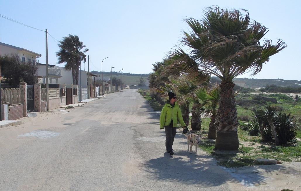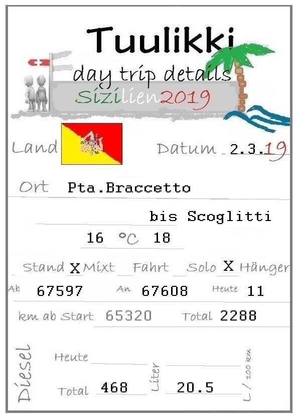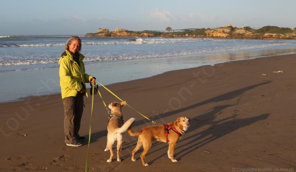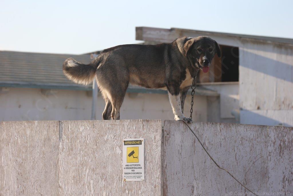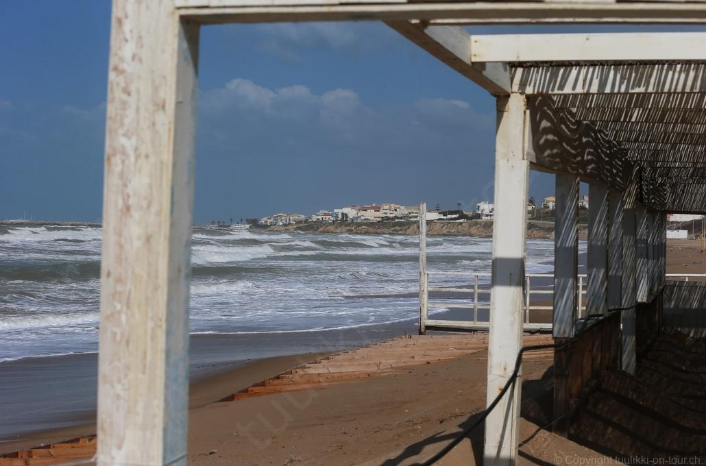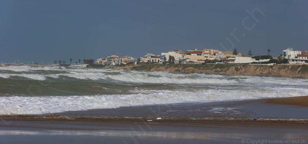 Nach dem Hundespaziergang und dem ersten Frühstück treffen wir Vorbereitungen zur Weiterfahrt: Wasser füllen, Strom abhängen, aussen und innen alles sicher verstauen. Ein letztes Mal kaufen wir beim ‚fliegenden‘ Bäcker ein und genehmigen uns dann gleich ein 2. Frühstück. Frisch gestärkt verabschieden wir uns dann von allen Camping-Nachbarn, anschliessend fährt Nils das WoMo raus, holt den Anhänger, belädt ihn mit dem Jimny und hängt ihn an. Währenddessen entsorge ich den Abfall und begleiche die Camping-Rechnung. Kurz vor 10 Uhr sind wir startklar, fahren der Südküste entlang westwärts und stoppen keine 20 Minuten später wieder. Kurz vor der Hafensiedlung Scoglitti lockt ein langer Sandstrand und endlose Parkplätze entlang der Uferstrasse. Es ist offenbar ein beliebter Ferienort (Juni – August) aber jetzt anfangs März menschenleer und scheint wie geschaffen für eine frühe Verschnaufpause. Sonnenschein und Temperaturen um die 18°C, begleitet von einem kräftigen Wind mit Böen bis 53 km/h (der gegen Abend nachlassen soll), bläst zwar kräftig quer zum WoMo und hohe Wellen mit weissen Gischtkronen donnern auf den Strand, aber Nils liebt dieses Wetter, also bleiben wir heute hier. Im leer stehenden, vernachlässigten einzeln stehenden Restaurant ‚la cantina a mare‘ schräg vis-à-vis entdecken wir einen jungen angeketteten Schäfer in einem Holzverschlag auf Sand. Als wir ihn ansprechen, beginnt er zu wedeln und freut sich riesig über etwas Zuspruch und Streicheleinheiten. Wir haben stark den Eindruck, dass er Durst hat, denn er hat nur eine leere Pfanne in der Ecke, die er ableckt und ein paar Pizza-Resten daneben. Wir bringen ihm Wasser und richtiges Futter; ein einheimischer Spaziergänger weiss scheinbar nicht, wer der Besitzer ist, berichtet uns aber, dass ‘man’ auf die schlechte Haltung bereits aufmerksam geworden und es auf Facebook gepostet habe. Später kommt ein weiterer junger Mann vorbei, der zum Hund hinunterläuft. Ich spreche ihn an und erfahre von Andrea, dass er in einer Umweltorganisation aktiv ist, den Strand vor 2 Wochen gereinigt hat und dabei auf die unakzeptable Haltung dieses Hundes aufmerksam geworden ist, dass offenbar noch ein weiterer Hund eingesperrt sein muss (man hört ihn bellen) und dass er das auch bereits weitergemeldet hat. Er macht ein Video in dem gezeigt wird, wie die junge Schäferhündin hausen muss und Aufnahmen wo ich als Touristin die schreckliche Hundehaltung und den unsäglichen Müll anspreche. Dieses will er den lokalen Zeitungen weiterleiten. Zufällig fährt die Polizei vorbei und Andrea fordert sie auf, etwas zu unternehmen und ich offeriere, den Hund dem Besitzer abzukaufen, wir stossen aber nur auf Ausflüchte. Facebook-Eintrag siehe: https://www.facebook.com/search/top/?q=https%3A%2F%2Fm.facebook.com%2Fstory.php%3Fstory_fbid%3D2161825434129688%26id%3D1468921723420066&epa=SEARCH_BOX