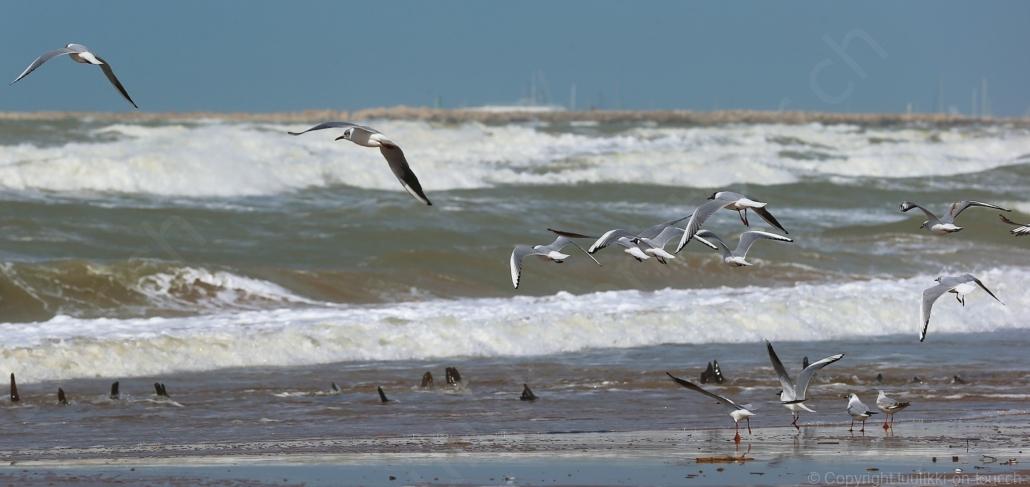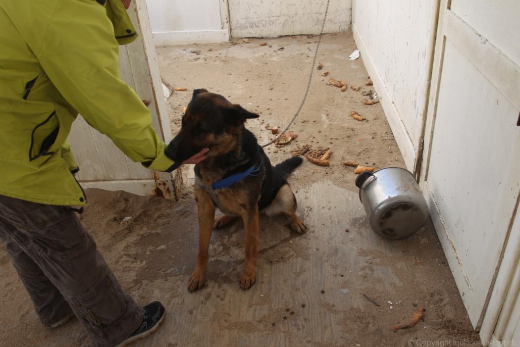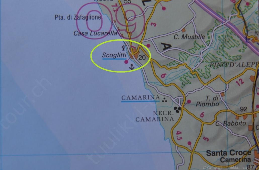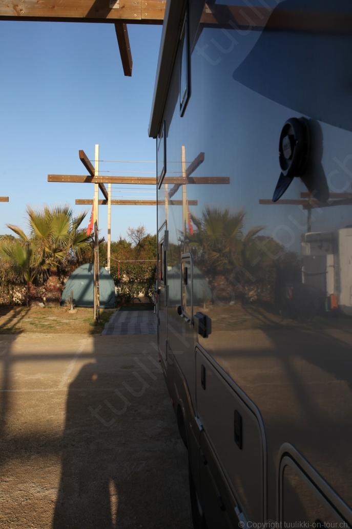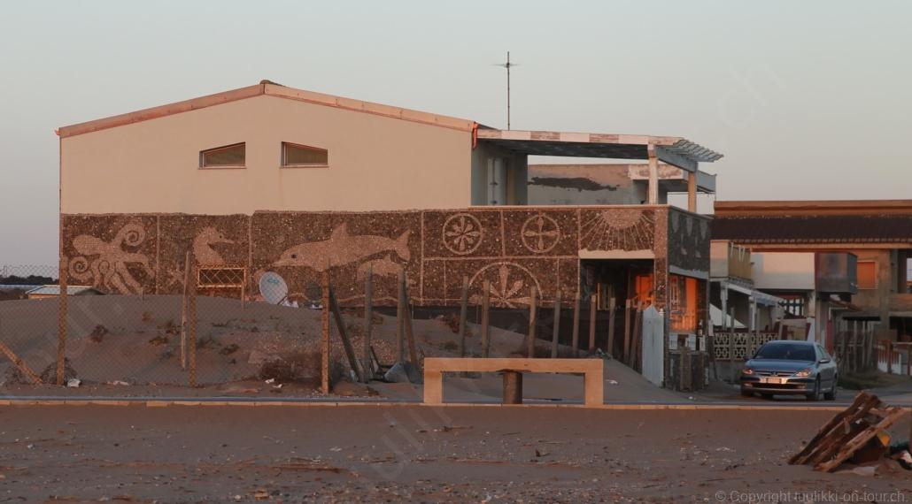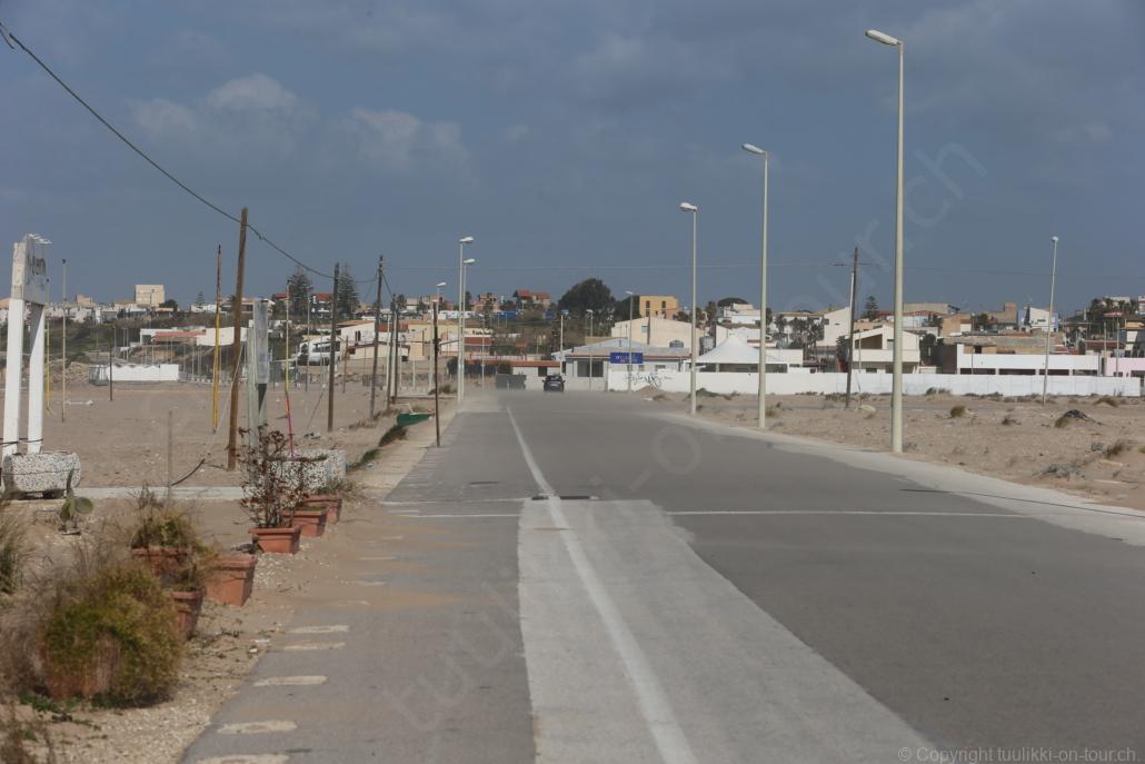 Nach dem Hundespaziergang und dem ersten Frühstück treffen wir Vorbereitungen zur Weiterfahrt: Wasser füllen, Strom abhängen, aussen und innen alles sicher verstauen. Ein letztes Mal kaufen wir beim ‚fliegenden‘ Bäcker ein und genehmigen uns dann gleich ein 2. Frühstück. Frisch gestärkt verabschieden wir uns dann von allen Camping-Nachbarn, anschliessend fährt Nils das WoMo raus, holt den Anhänger, belädt ihn mit dem Jimny und hängt ihn an. Währenddessen entsorge ich den Abfall und begleiche die Camping-Rechnung. Kurz vor 10 Uhr sind wir startklar, fahren der Südküste entlang westwärts und stoppen keine 20 Minuten später wieder. Kurz vor der Hafensiedlung Scoglitti lockt ein langer Sandstrand und endlose Parkplätze entlang der Uferstrasse. Es ist offenbar ein beliebter Ferienort (Juni – August) aber jetzt anfangs März menschenleer und scheint wie geschaffen für eine frühe Verschnaufpause. Sonnenschein und Temperaturen um die 18°C, begleitet von einem kräftigen Wind mit Böen bis 53 km/h (der gegen Abend nachlassen soll), bläst zwar kräftig quer zum WoMo und hohe Wellen mit weissen Gischtkronen donnern auf den Strand, aber Nils liebt dieses Wetter, also bleiben wir heute hier. Im leer stehenden, vernachlässigten einzeln stehenden Restaurant ‚la cantina a mare‘ schräg vis-à-vis entdecken wir einen jungen angeketteten Schäfer in einem Holzverschlag auf Sand. Als wir ihn ansprechen, beginnt er zu wedeln und freut sich riesig über etwas Zuspruch und Streicheleinheiten. Wir haben stark den Eindruck, dass er Durst hat, denn er hat nur eine leere Pfanne in der Ecke, die er ableckt und ein paar Pizza-Resten daneben. Wir bringen ihm Wasser und richtiges Futter; ein einheimischer Spaziergänger weiss scheinbar nicht, wer der Besitzer ist, berichtet uns aber, dass ‘man’ auf die schlechte Haltung bereits aufmerksam geworden und es auf Facebook gepostet habe. Später kommt ein weiterer junger Mann vorbei, der zum Hund hinunterläuft. Ich spreche ihn an und erfahre von Andrea, dass er in einer Umweltorganisation aktiv ist, den Strand vor 2 Wochen gereinigt hat und dabei auf die unakzeptable Haltung dieses Hundes aufmerksam geworden ist, dass offenbar noch ein weiterer Hund eingesperrt sein muss (man hört ihn bellen) und dass er das auch bereits weitergemeldet hat. Er macht ein Video in dem gezeigt wird, wie die junge Schäferhündin hausen muss und Aufnahmen wo ich als Touristin die schreckliche Hundehaltung und den unsäglichen Müll anspreche. Dieses will er den lokalen Zeitungen weiterleiten. Zufällig fährt die Polizei vorbei und Andrea fordert sie auf, etwas zu unternehmen und ich offeriere, den Hund dem Besitzer abzukaufen, wir stossen aber nur auf Ausflüchte. Facebook-Eintrag siehe: https://www.facebook.com/search/top/?q=https%3A%2F%2Fm.facebook.com%2Fstory.php%3Fstory_fbid%3D2161825434129688%26id%3D1468921723420066&epa=SEARCH_BOX