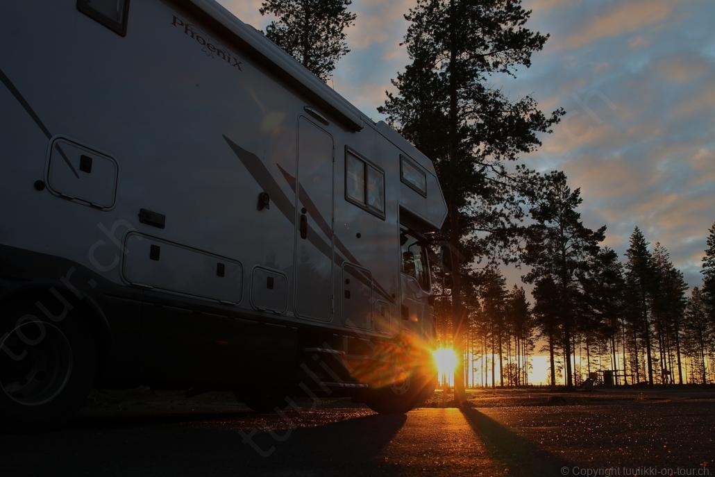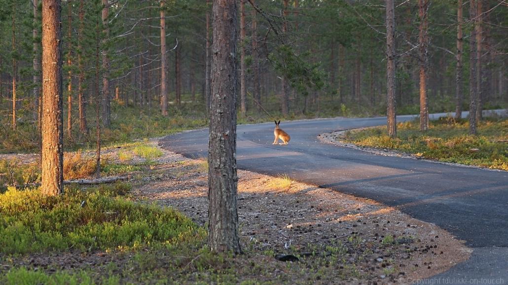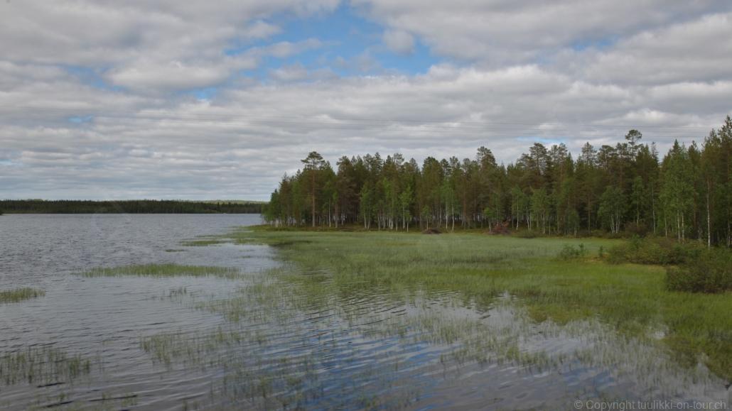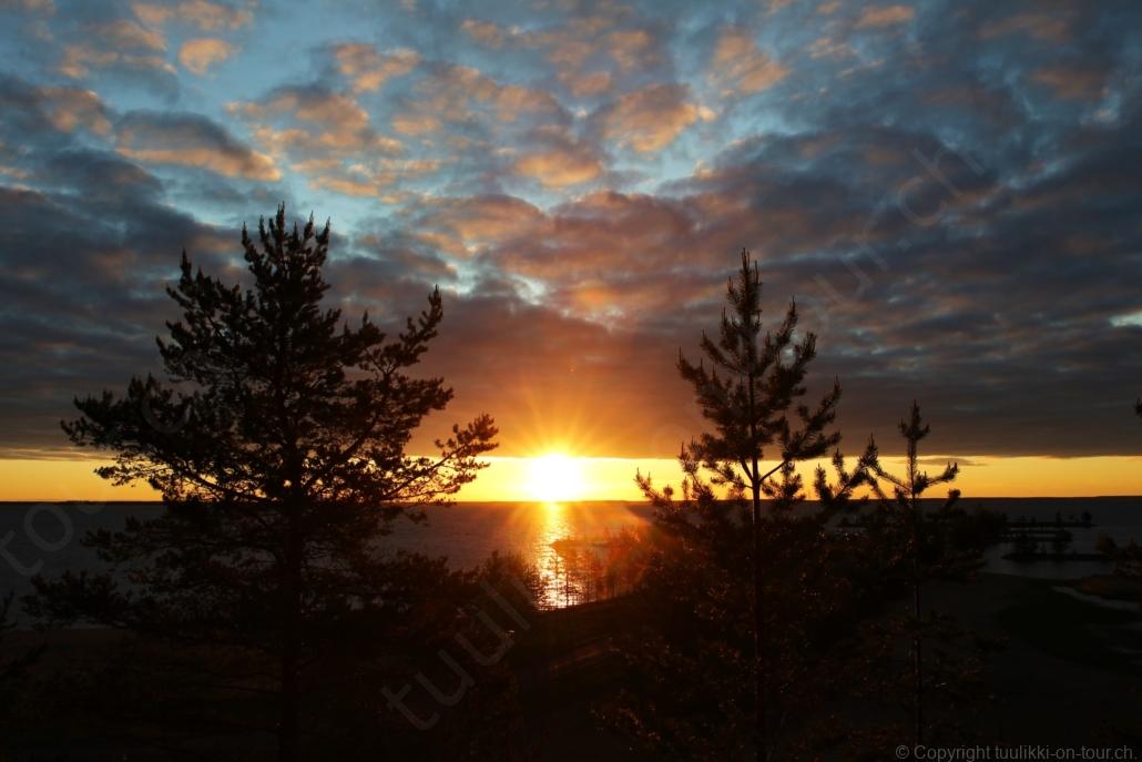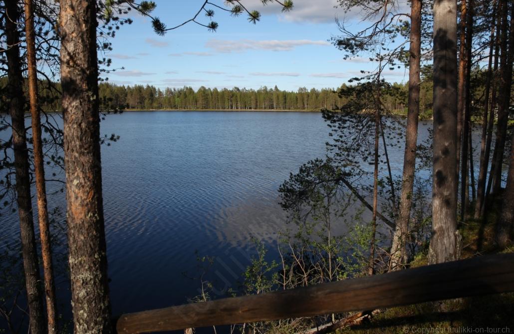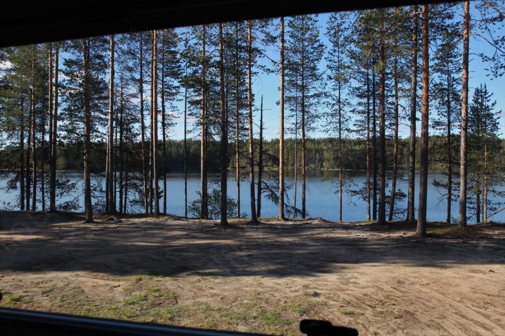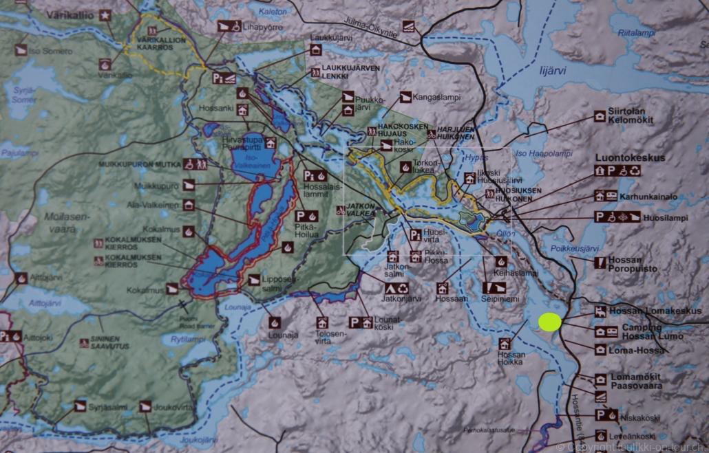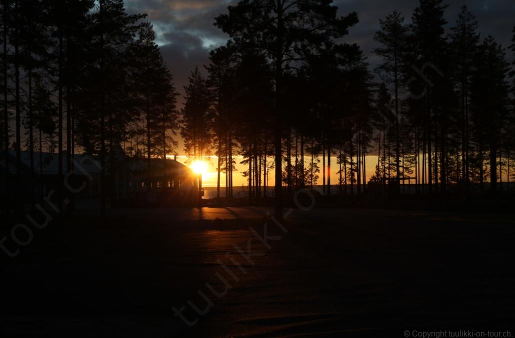 Sonnenaufgang in Säräisniemi, morgens um 03:15 Uhr, der Himmel am Horizont ist orange, man könnte meinen es brenne der Wald! Um 07:30 stehen wir zum 2. Mal auf, freuen uns am blauen Himmel und der schon hochstehenden Sonne und unternehmen eine letzten ausführlichen Spaziergang durch das weitverzweigte Wegnetz über dem Seeufer und unter Föhren hindurch auf weichem Waldboden. Nach einer kalten Dusche – irgendwie hat die Wassererwärmung heute nicht geklappt – starten wir dann weiter nordwärts und begegnen kurz darauf unserem ersten Rentier auf dieser Reise. Es trägt ein Halsband und trottet der Strasse entlang. Die Landschaft ist jetzt geprägt durch viele Birken, bewaldetes Hügelland, Sümpfe und Seen. Die Region liegt etwa 200 m über dem Meeresspiegel und ist bekannt für gute Wasserwandermöglichkeiten. Suomussalmi, das zu Nordfinnland gehört und im Osten an die russische Republik Karelien grenzt, lädt geradezu zu einem längeren Halt ein. Es präsentiert sich am Wasser gelegen mit grossflächigen, offenen Parkanlagen, die wir uns etwas näher betrachten. Der Via Karelia durch Ostfinnland der russischen Grenze folgend streben wir dann spannenden Zielen entgegen. Die stimmungsvolle, schöne Ost-Route 843 ist etwas schmaler aber immer noch zügig zu fahren; es herrscht wenig Verkehr. In der Wildnis dieses grenznahen östlichen Teils gibt es Bären, Wölfe, Vielfrasse und Luchse. Wir wollen es genau wissen und fahren über eine Naturstrasse zur 8 km entfernten geschlossenen Grenzstation Lehtovaara. Kein Wunder ist dieser Übergang zu, er ist mitten im Wald ohne Häuser in der Nähe und durch ein einfaches, geschlossenes Gittertor ‘gesichert’. So nahe am Putin’schen Russland waren wir noch nie … und just als wir vor dem Tor umkehren, läutet das Telefon … ganz leicht erschrocken bin ich dabei schon, obwohl wir nichts Unrechtes taten, aber unweigerlich kommen einen so Geschichten in den Sinn… Zurück über die Naturstrasse, erreichen wir auf der nordwärts führenden 843 am späten Nachmittag den Camping Hossan Lumo bei Hossa. Dieser empfehlenswerte Platz liegt malerisch leicht erhöht am Ufer des Sees Hossanjärvi, inmitten von weit auseinanderstehenden Föhren und bietet einen idealen Ausgangspunkt zum nahen Hossa-Nationalpark. Es werden Hütten, Kajak, Kanus, Ruderboote, Stand-up Bretter, Fahrräder und Schneeschuhe samt dazugehörender Ausrüstung vermietet, es gibt eine Sauna, eine Cafeteria mit Shop und kostenloses Wifi. Trotz dieses breiten Angebots macht der Camping jetzt Mitte Juni einen ruhigen und einfach sympathischen Eindruck, den das junge finnisch-irische Eignerpaar unterstreicht. Auch die Mücken sind hier viel weniger zahlreich und fast zahm, also eine gute Voraussetzung für einen gemütlichen Rundgang über die kleine Halbinsel, auf der wir uns de facto befinden. Vom ‘Wohnzimmer’-Fenster aus haben wir einen tollen Blick auf den warm im Abendlicht schimmernden See und Wald, fast als ob wir allein ‘in der Wildnis’ wären. Dank des sehr späten Sonnenuntergangs können wir dieses magische Licht bis Mitternacht geniessen.