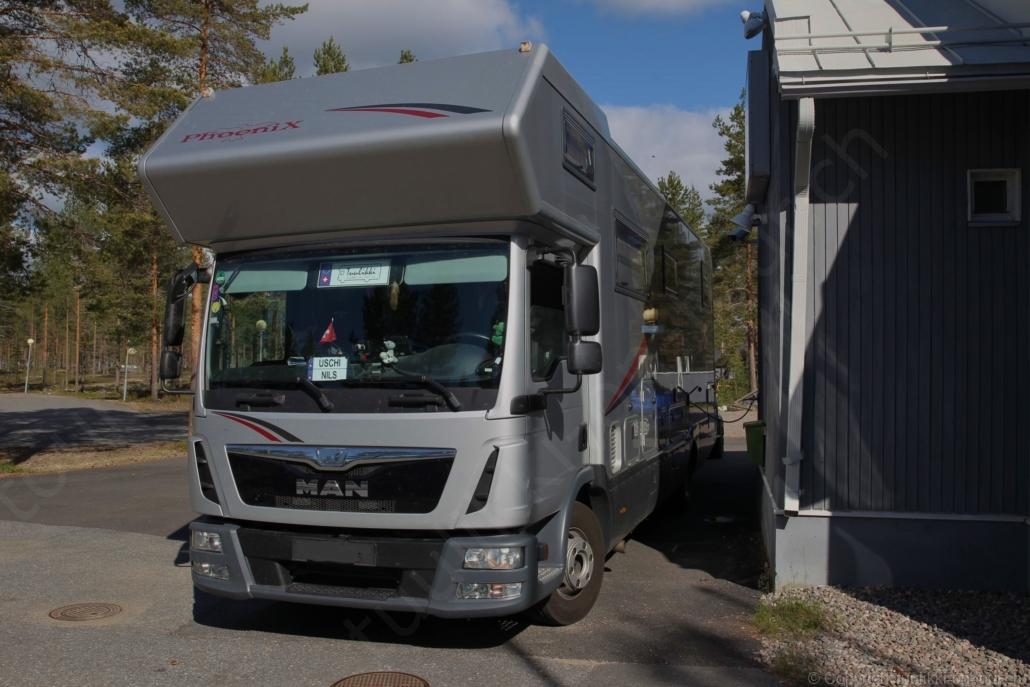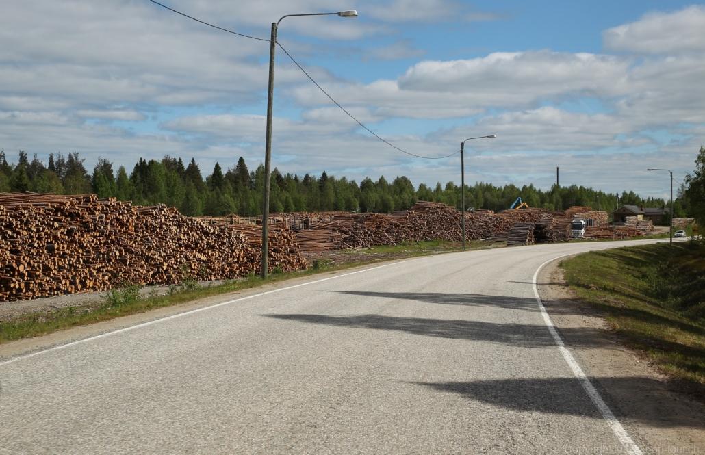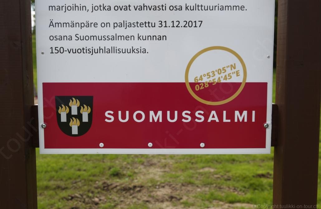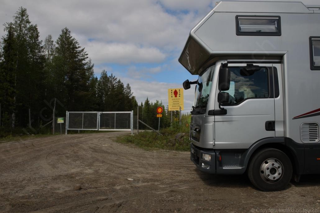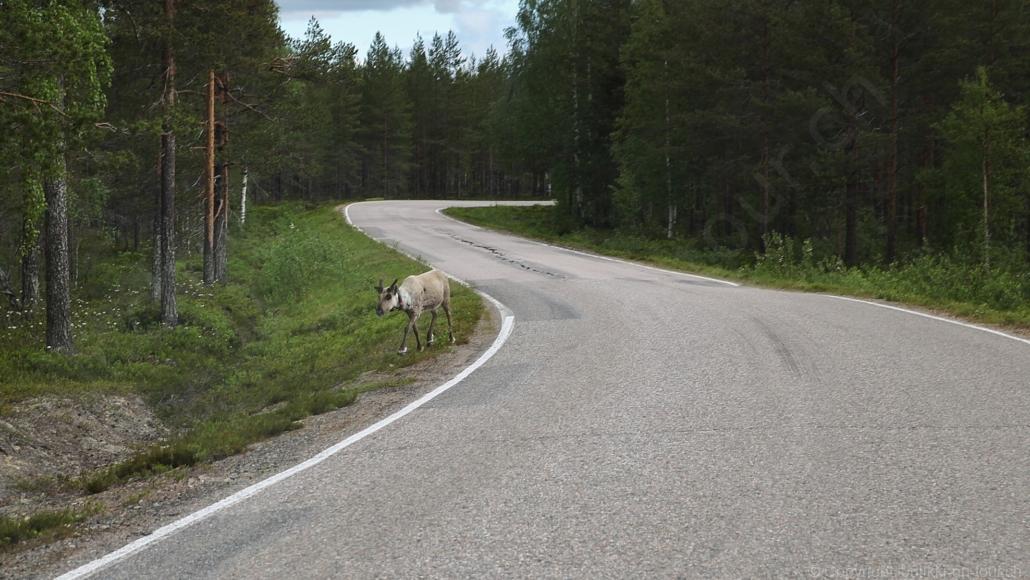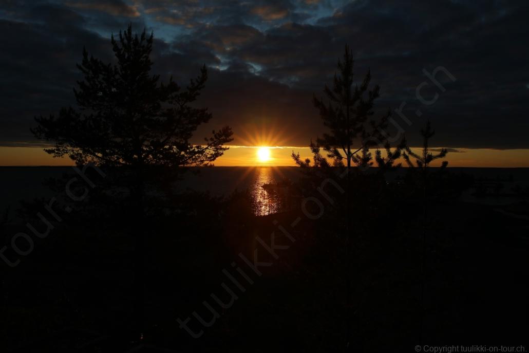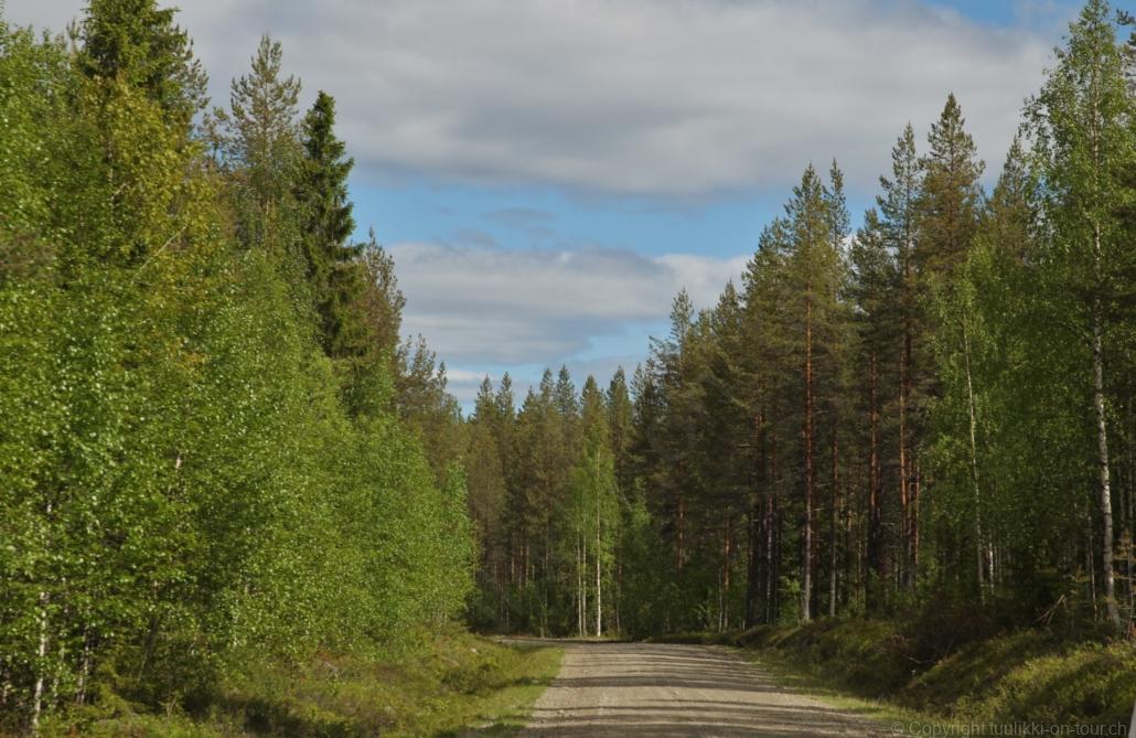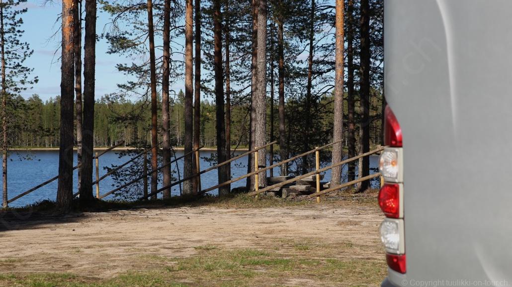 Sonnenaufgang in Säräisniemi, morgens um 03:15 Uhr, der Himmel am Horizont ist orange, man könnte meinen es brenne der Wald! Um 07:30 stehen wir zum 2. Mal auf, freuen uns am blauen Himmel und der schon hochstehenden Sonne und unternehmen eine letzten ausführlichen Spaziergang durch das weitverzweigte Wegnetz über dem Seeufer und unter Föhren hindurch auf weichem Waldboden. Nach einer kalten Dusche – irgendwie hat die Wassererwärmung heute nicht geklappt – starten wir dann weiter nordwärts und begegnen kurz darauf unserem ersten Rentier auf dieser Reise. Es trägt ein Halsband und trottet der Strasse entlang. Die Landschaft ist jetzt geprägt durch viele Birken, bewaldetes Hügelland, Sümpfe und Seen. Die Region liegt etwa 200 m über dem Meeresspiegel und ist bekannt für gute Wasserwandermöglichkeiten. Suomussalmi, das zu Nordfinnland gehört und im Osten an die russische Republik Karelien grenzt, lädt geradezu zu einem längeren Halt ein. Es präsentiert sich am Wasser gelegen mit grossflächigen, offenen Parkanlagen, die wir uns etwas näher betrachten. Der Via Karelia durch Ostfinnland der russischen Grenze folgend streben wir dann spannenden Zielen entgegen. Die stimmungsvolle, schöne Ost-Route 843 ist etwas schmaler aber immer noch zügig zu fahren; es herrscht wenig Verkehr. In der Wildnis dieses grenznahen östlichen Teils gibt es Bären, Wölfe, Vielfrasse und Luchse. Wir wollen es genau wissen und fahren über eine Naturstrasse zur 8 km entfernten geschlossenen Grenzstation Lehtovaara. Kein Wunder ist dieser Übergang zu, er ist mitten im Wald ohne Häuser in der Nähe und durch ein einfaches, geschlossenes Gittertor ‘gesichert’. So nahe am Putin’schen Russland waren wir noch nie … und just als wir vor dem Tor umkehren, läutet das Telefon … ganz leicht erschrocken bin ich dabei schon, obwohl wir nichts Unrechtes taten, aber unweigerlich kommen einen so Geschichten in den Sinn… Zurück über die Naturstrasse, erreichen wir auf der nordwärts führenden 843 am späten Nachmittag den Camping Hossan Lumo bei Hossa. Dieser empfehlenswerte Platz liegt malerisch leicht erhöht am Ufer des Sees Hossanjärvi, inmitten von weit auseinanderstehenden Föhren und bietet einen idealen Ausgangspunkt zum nahen Hossa-Nationalpark. Es werden Hütten, Kajak, Kanus, Ruderboote, Stand-up Bretter, Fahrräder und Schneeschuhe samt dazugehörender Ausrüstung vermietet, es gibt eine Sauna, eine Cafeteria mit Shop und kostenloses Wifi. Trotz dieses breiten Angebots macht der Camping jetzt Mitte Juni einen ruhigen und einfach sympathischen Eindruck, den das junge finnisch-irische Eignerpaar unterstreicht. Auch die Mücken sind hier viel weniger zahlreich und fast zahm, also eine gute Voraussetzung für einen gemütlichen Rundgang über die kleine Halbinsel, auf der wir uns de facto befinden. Vom ‘Wohnzimmer’-Fenster aus haben wir einen tollen Blick auf den warm im Abendlicht schimmernden See und Wald, fast als ob wir allein ‘in der Wildnis’ wären. Dank des sehr späten Sonnenuntergangs können wir dieses magische Licht bis Mitternacht geniessen.