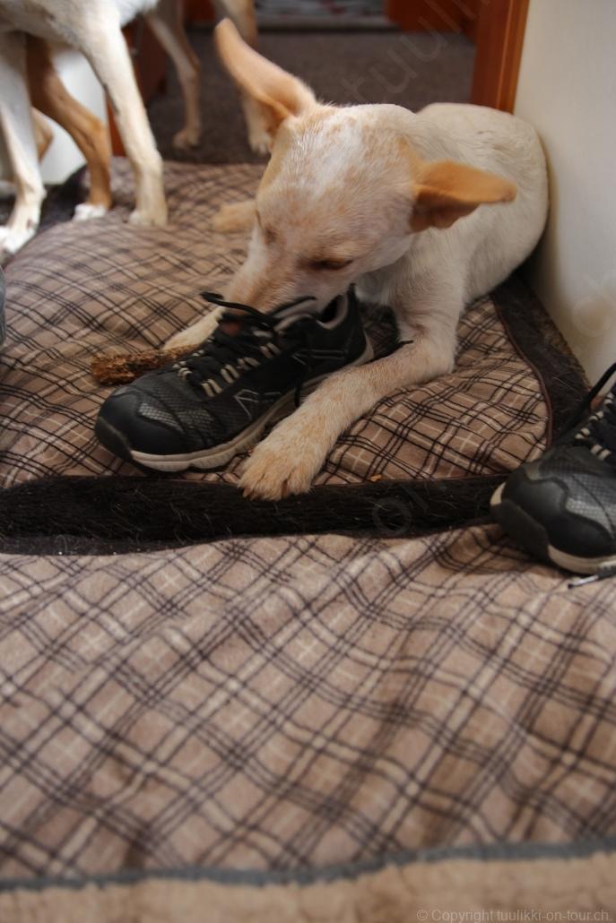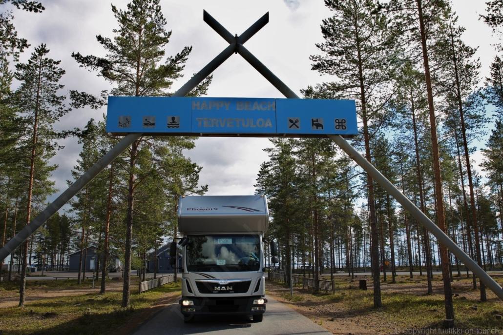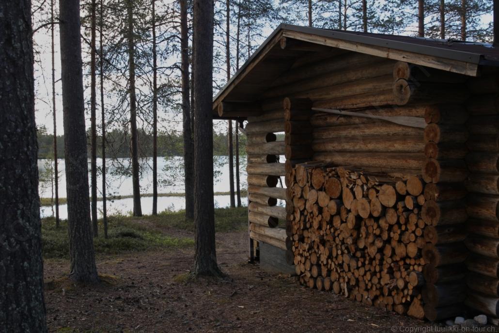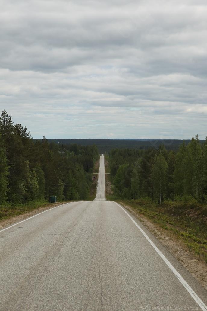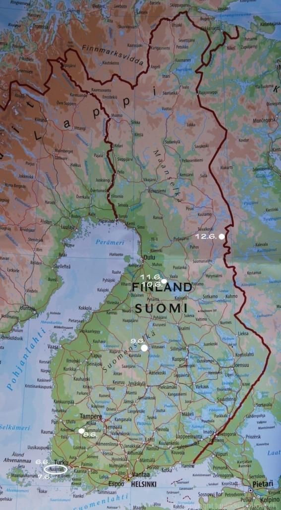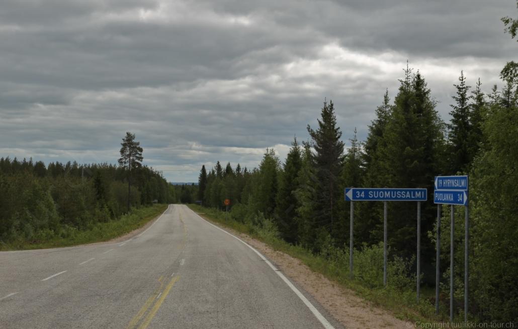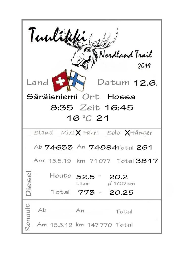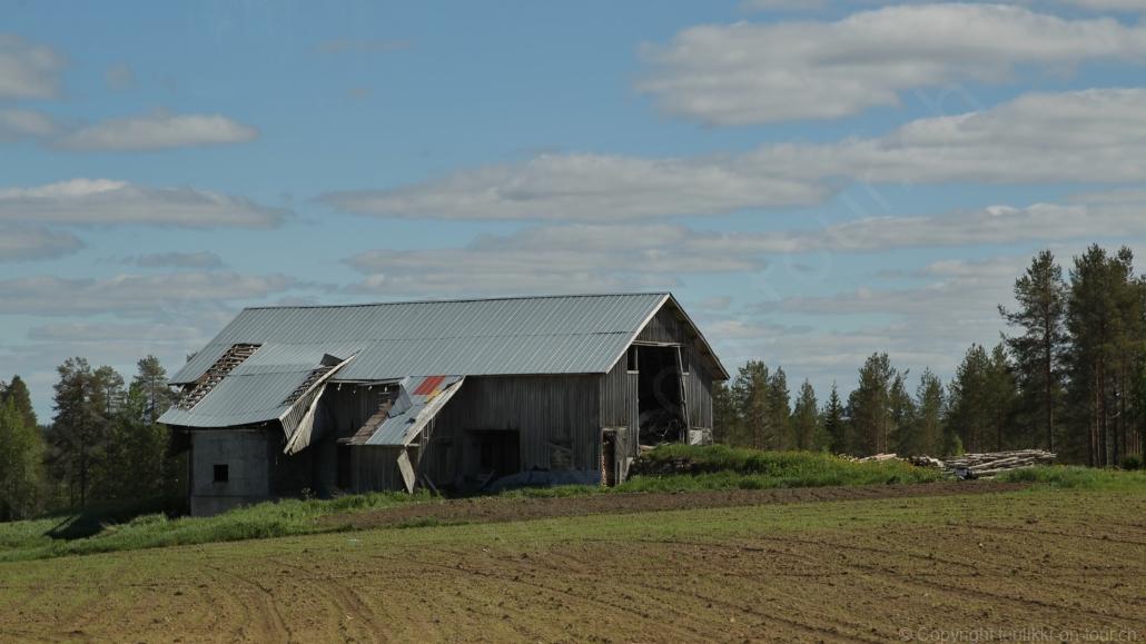 Sonnenaufgang in Säräisniemi, morgens um 03:15 Uhr, der Himmel am Horizont ist orange, man könnte meinen es brenne der Wald! Um 07:30 stehen wir zum 2. Mal auf, freuen uns am blauen Himmel und der schon hochstehenden Sonne und unternehmen eine letzten ausführlichen Spaziergang durch das weitverzweigte Wegnetz über dem Seeufer und unter Föhren hindurch auf weichem Waldboden. Nach einer kalten Dusche – irgendwie hat die Wassererwärmung heute nicht geklappt – starten wir dann weiter nordwärts und begegnen kurz darauf unserem ersten Rentier auf dieser Reise. Es trägt ein Halsband und trottet der Strasse entlang. Die Landschaft ist jetzt geprägt durch viele Birken, bewaldetes Hügelland, Sümpfe und Seen. Die Region liegt etwa 200 m über dem Meeresspiegel und ist bekannt für gute Wasserwandermöglichkeiten. Suomussalmi, das zu Nordfinnland gehört und im Osten an die russische Republik Karelien grenzt, lädt geradezu zu einem längeren Halt ein. Es präsentiert sich am Wasser gelegen mit grossflächigen, offenen Parkanlagen, die wir uns etwas näher betrachten. Der Via Karelia durch Ostfinnland der russischen Grenze folgend streben wir dann spannenden Zielen entgegen. Die stimmungsvolle, schöne Ost-Route 843 ist etwas schmaler aber immer noch zügig zu fahren; es herrscht wenig Verkehr. In der Wildnis dieses grenznahen östlichen Teils gibt es Bären, Wölfe, Vielfrasse und Luchse. Wir wollen es genau wissen und fahren über eine Naturstrasse zur 8 km entfernten geschlossenen Grenzstation Lehtovaara. Kein Wunder ist dieser Übergang zu, er ist mitten im Wald ohne Häuser in der Nähe und durch ein einfaches, geschlossenes Gittertor ‘gesichert’. So nahe am Putin’schen Russland waren wir noch nie … und just als wir vor dem Tor umkehren, läutet das Telefon … ganz leicht erschrocken bin ich dabei schon, obwohl wir nichts Unrechtes taten, aber unweigerlich kommen einen so Geschichten in den Sinn… Zurück über die Naturstrasse, erreichen wir auf der nordwärts führenden 843 am späten Nachmittag den Camping Hossan Lumo bei Hossa. Dieser empfehlenswerte Platz liegt malerisch leicht erhöht am Ufer des Sees Hossanjärvi, inmitten von weit auseinanderstehenden Föhren und bietet einen idealen Ausgangspunkt zum nahen Hossa-Nationalpark. Es werden Hütten, Kajak, Kanus, Ruderboote, Stand-up Bretter, Fahrräder und Schneeschuhe samt dazugehörender Ausrüstung vermietet, es gibt eine Sauna, eine Cafeteria mit Shop und kostenloses Wifi. Trotz dieses breiten Angebots macht der Camping jetzt Mitte Juni einen ruhigen und einfach sympathischen Eindruck, den das junge finnisch-irische Eignerpaar unterstreicht. Auch die Mücken sind hier viel weniger zahlreich und fast zahm, also eine gute Voraussetzung für einen gemütlichen Rundgang über die kleine Halbinsel, auf der wir uns de facto befinden. Vom ‘Wohnzimmer’-Fenster aus haben wir einen tollen Blick auf den warm im Abendlicht schimmernden See und Wald, fast als ob wir allein ‘in der Wildnis’ wären. Dank des sehr späten Sonnenuntergangs können wir dieses magische Licht bis Mitternacht geniessen.