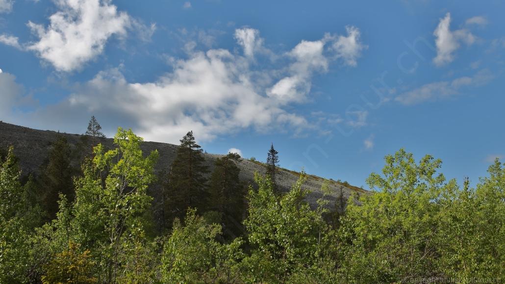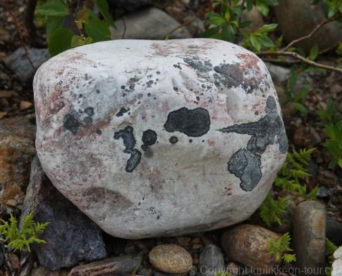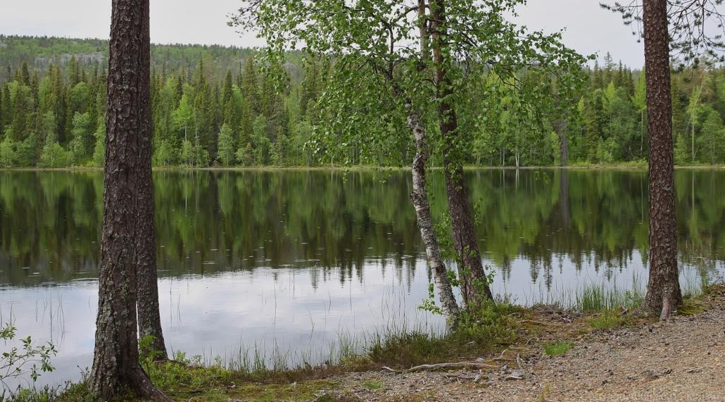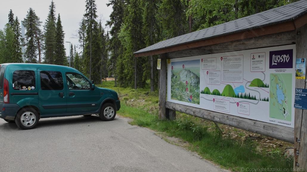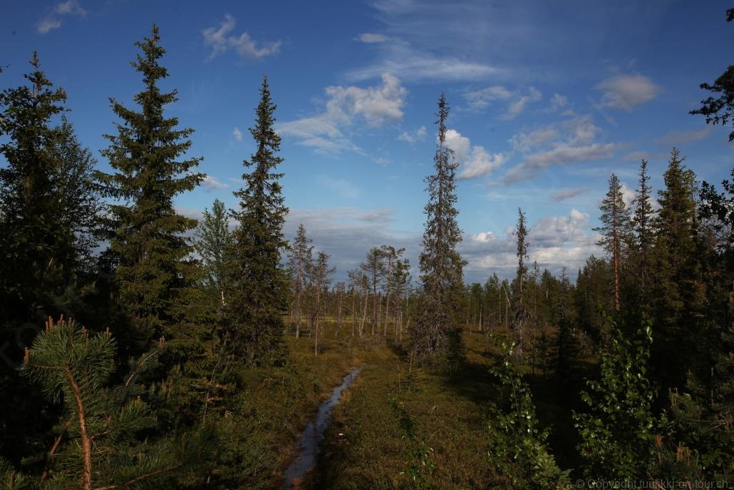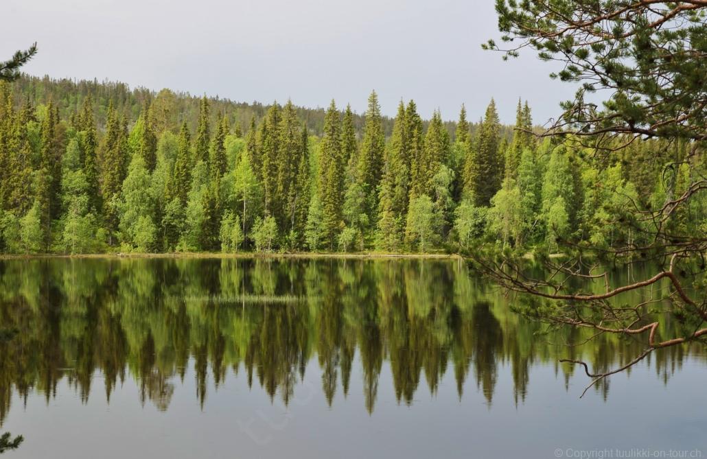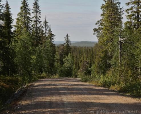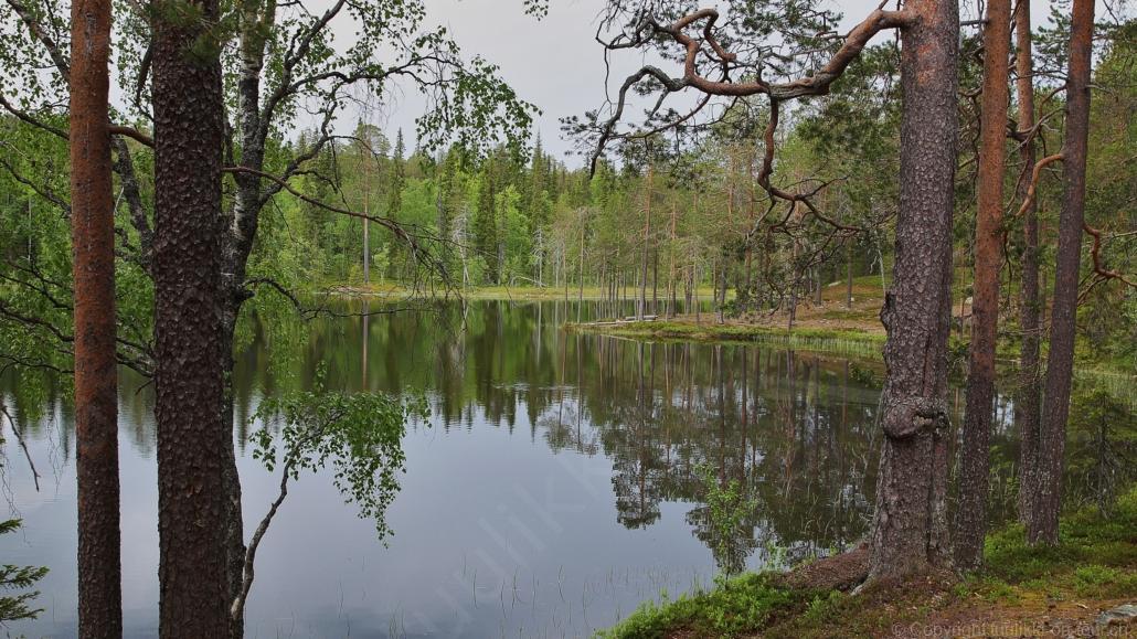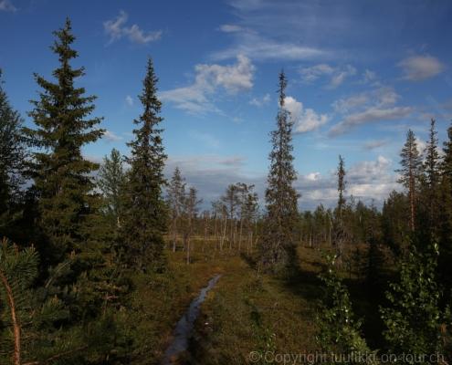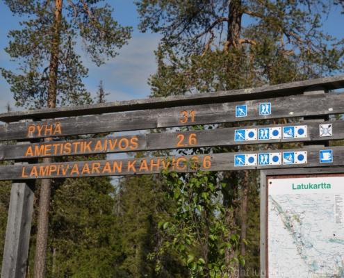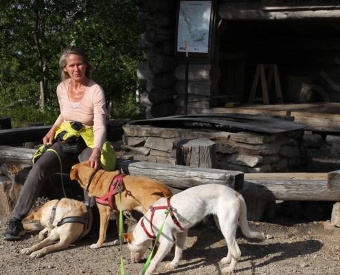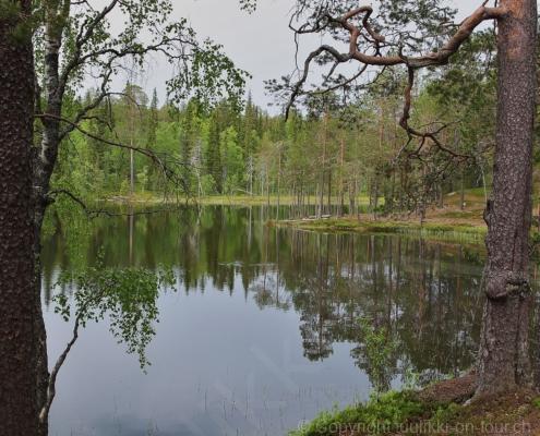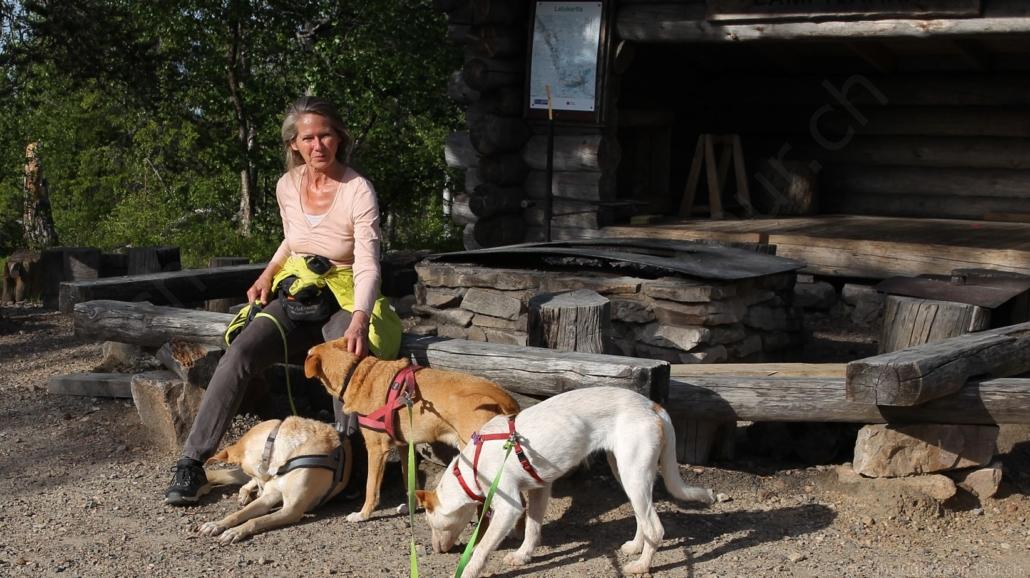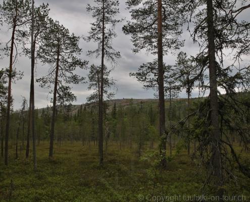 Heute wollen wir uns in Luosto umsehen, die ‘alten’ Orte besuchen und schauen, ob es uns immer noch so gut gefällt wie vor 2 Jahren. Dazu nimmt Nils den Kangoo vom Anhänger; er ist voller Staub von der Fahrt über die Naturstrassen und wenn wir die Fenster öffnen, ‘chroset’ es gewaltig. Jawohl, unser erster Eindruck ist sehr positiv; beim Morgenspaziergang begrüsst uns auch gleich ein weisses Rentier, das sich von unseren bellenden Hunden überhaupt nicht beeindrucken lässt; umso mehr beeindruckt davon sind unsere 3 Feuchtnasen. Beim Veterinär im nächstgrösseren Ort bestellen wir telefonisch das Spezialfutter und die Medis für Oxi, die wir gegen Ende Woche dort abholen und den 3 Hunden gleich die nächste ‘tapeworm’ Behandlung zukommen lassen können. Das heisst, dass wir hier in Luosto noch mind. 3-4 Tage rumhängen können; wie praktisch! Im kleinen K-Markt besorgen wir uns Mückenspray und im Café nebenan treffen wir die nette Verkäuferin von vor 2 Jahren und so fühlen wir uns gleich wieder heimisch. Beim Rundgang um den Ahvenlampi See beginnt es leicht zu regnen und die Mücken, die dieses Wetter lieben sind sehr präsent, aber wir ja jetzt gerüstet. Nebst einem Häschen begegnen uns drei Huskies und ihre Führerin; für Abwechslung ist also gesorgt! Die Natur hier ist grandios, dazu zählt auch das schnell wechselnde Wetter, von dem wir heute alles kurz abbekommen: Sonne-Wolken-Regen-Sonne-Wolken. Am Abend wandern wir zur Amethyst-Mine und sind ganz alleine auf diesem Trail unterwegs. Erst dort oben hat es Fat bike-Fahrer (wegen der dicken Pneus) und Wanderer mit grossen Rucksäcken. Ja klar, bei uns müsste man sich langsam beeilen, um vor dem Eindunkeln eine Unterkunft zu finden, hier oben in Lappland könnte man um diese Jahreszeit von der Helligkeit her eigentlich rund um die Uhr unterwegs sein.