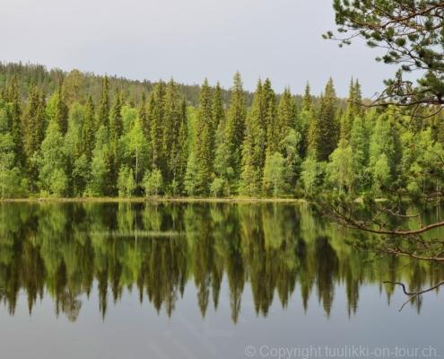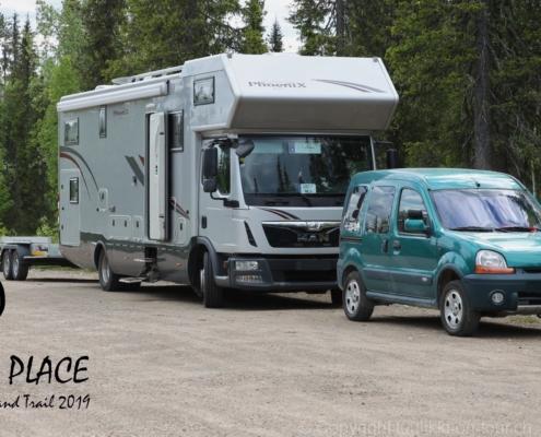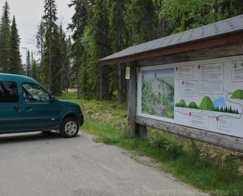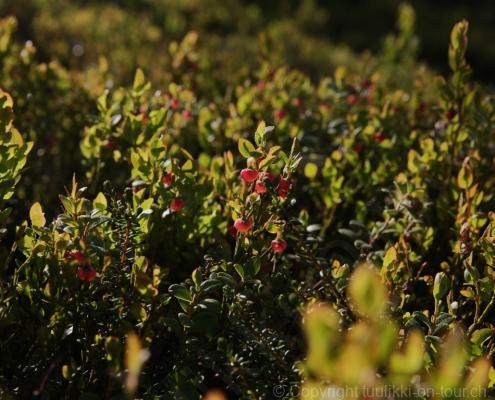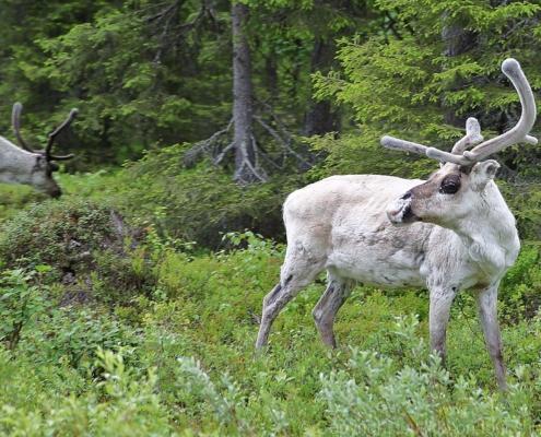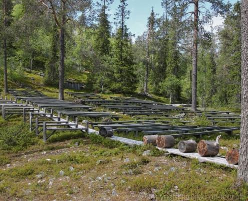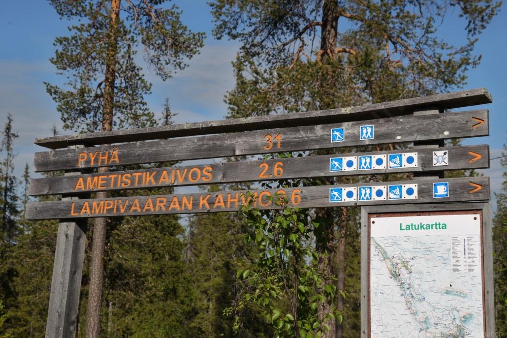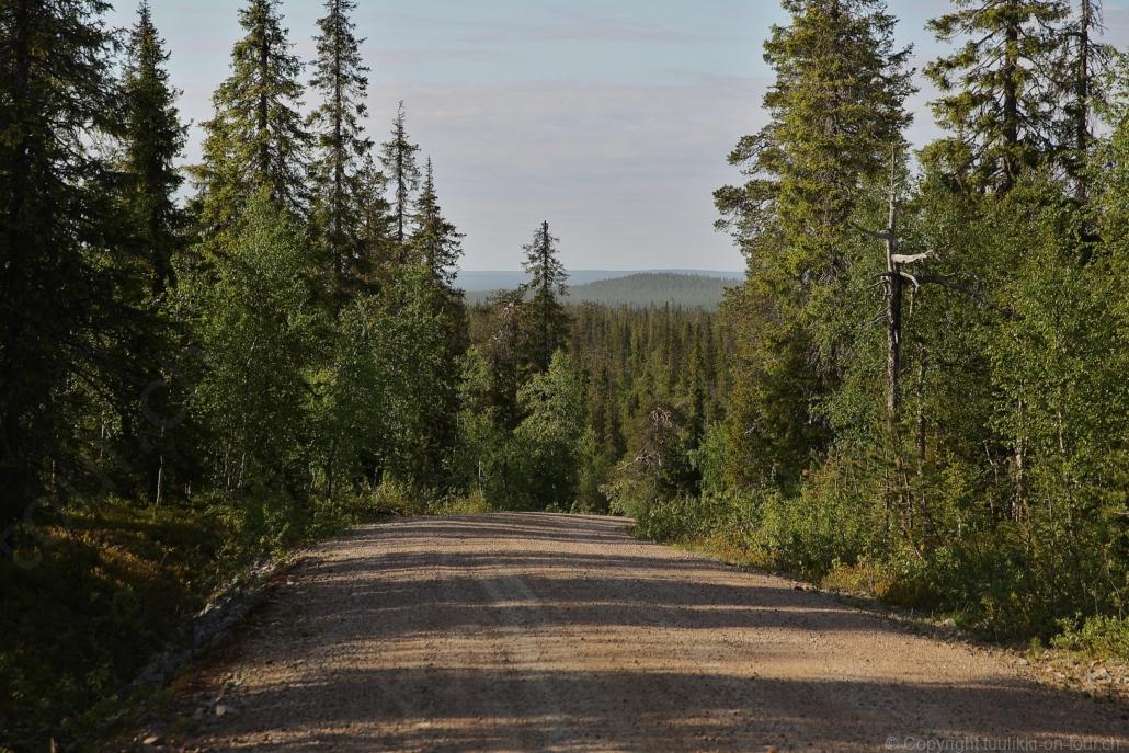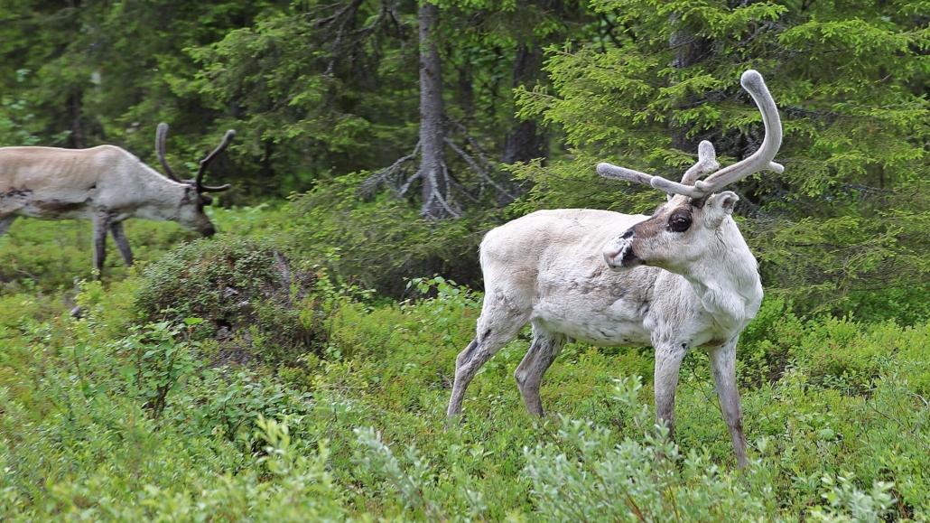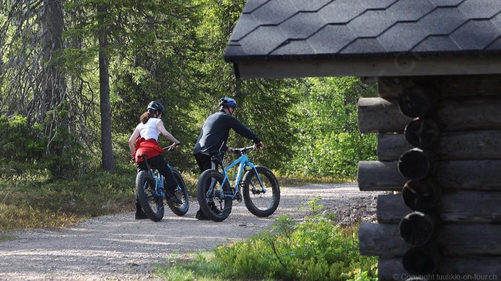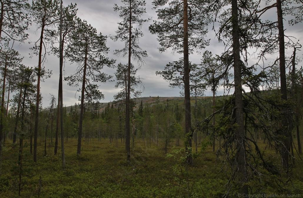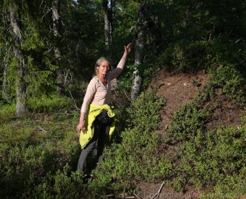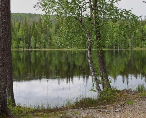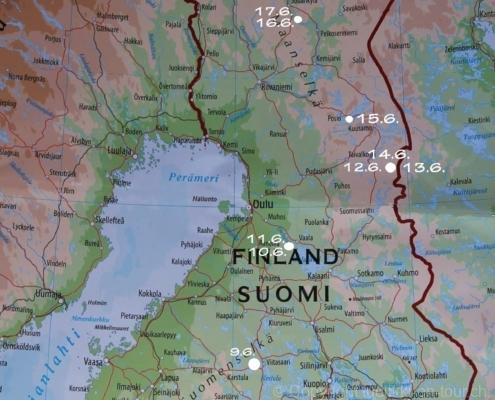 Heute wollen wir uns in Luosto umsehen, die ‘alten’ Orte besuchen und schauen, ob es uns immer noch so gut gefällt wie vor 2 Jahren. Dazu nimmt Nils den Kangoo vom Anhänger; er ist voller Staub von der Fahrt über die Naturstrassen und wenn wir die Fenster öffnen, ‘chroset’ es gewaltig. Jawohl, unser erster Eindruck ist sehr positiv; beim Morgenspaziergang begrüsst uns auch gleich ein weisses Rentier, das sich von unseren bellenden Hunden überhaupt nicht beeindrucken lässt; umso mehr beeindruckt davon sind unsere 3 Feuchtnasen. Beim Veterinär im nächstgrösseren Ort bestellen wir telefonisch das Spezialfutter und die Medis für Oxi, die wir gegen Ende Woche dort abholen und den 3 Hunden gleich die nächste ‘tapeworm’ Behandlung zukommen lassen können. Das heisst, dass wir hier in Luosto noch mind. 3-4 Tage rumhängen können; wie praktisch! Im kleinen K-Markt besorgen wir uns Mückenspray und im Café nebenan treffen wir die nette Verkäuferin von vor 2 Jahren und so fühlen wir uns gleich wieder heimisch. Beim Rundgang um den Ahvenlampi See beginnt es leicht zu regnen und die Mücken, die dieses Wetter lieben sind sehr präsent, aber wir ja jetzt gerüstet. Nebst einem Häschen begegnen uns drei Huskies und ihre Führerin; für Abwechslung ist also gesorgt! Die Natur hier ist grandios, dazu zählt auch das schnell wechselnde Wetter, von dem wir heute alles kurz abbekommen: Sonne-Wolken-Regen-Sonne-Wolken. Am Abend wandern wir zur Amethyst-Mine und sind ganz alleine auf diesem Trail unterwegs. Erst dort oben hat es Fat bike-Fahrer (wegen der dicken Pneus) und Wanderer mit grossen Rucksäcken. Ja klar, bei uns müsste man sich langsam beeilen, um vor dem Eindunkeln eine Unterkunft zu finden, hier oben in Lappland könnte man um diese Jahreszeit von der Helligkeit her eigentlich rund um die Uhr unterwegs sein.