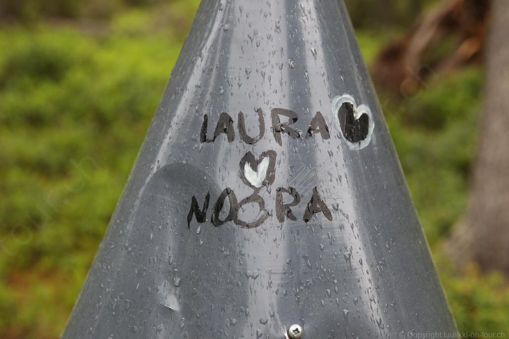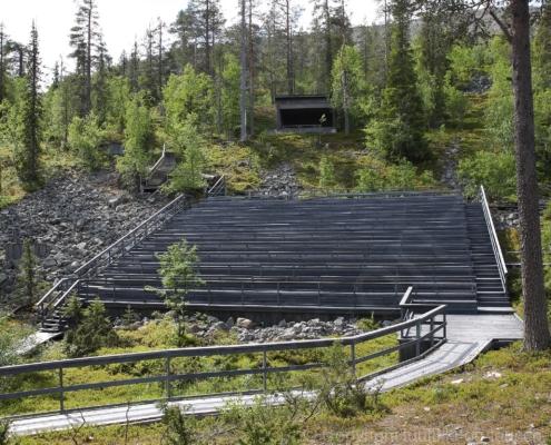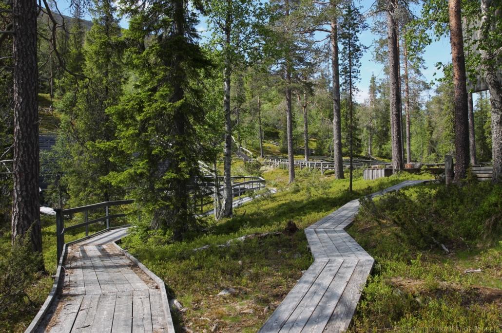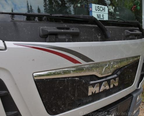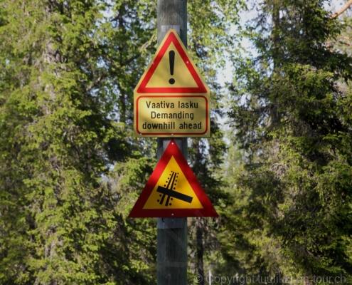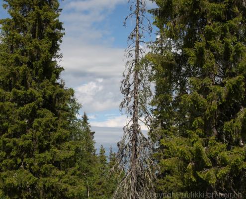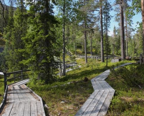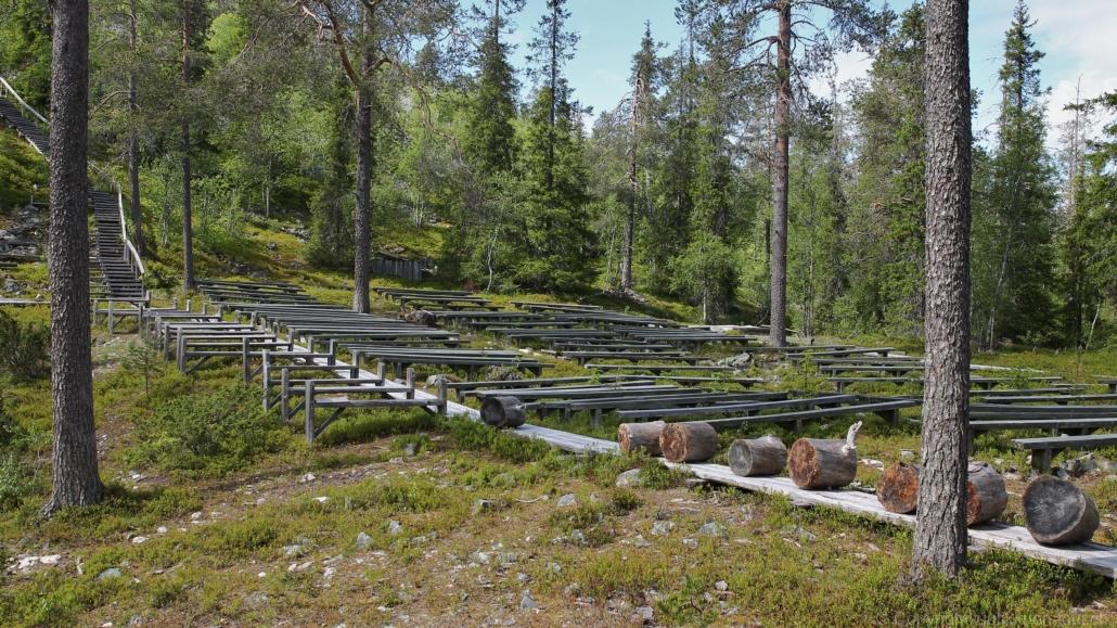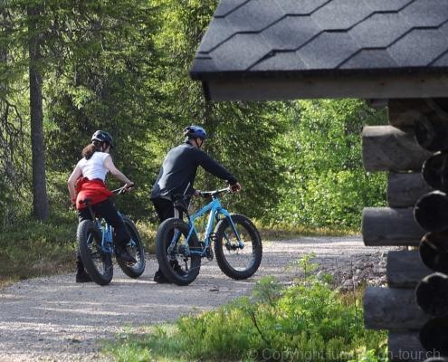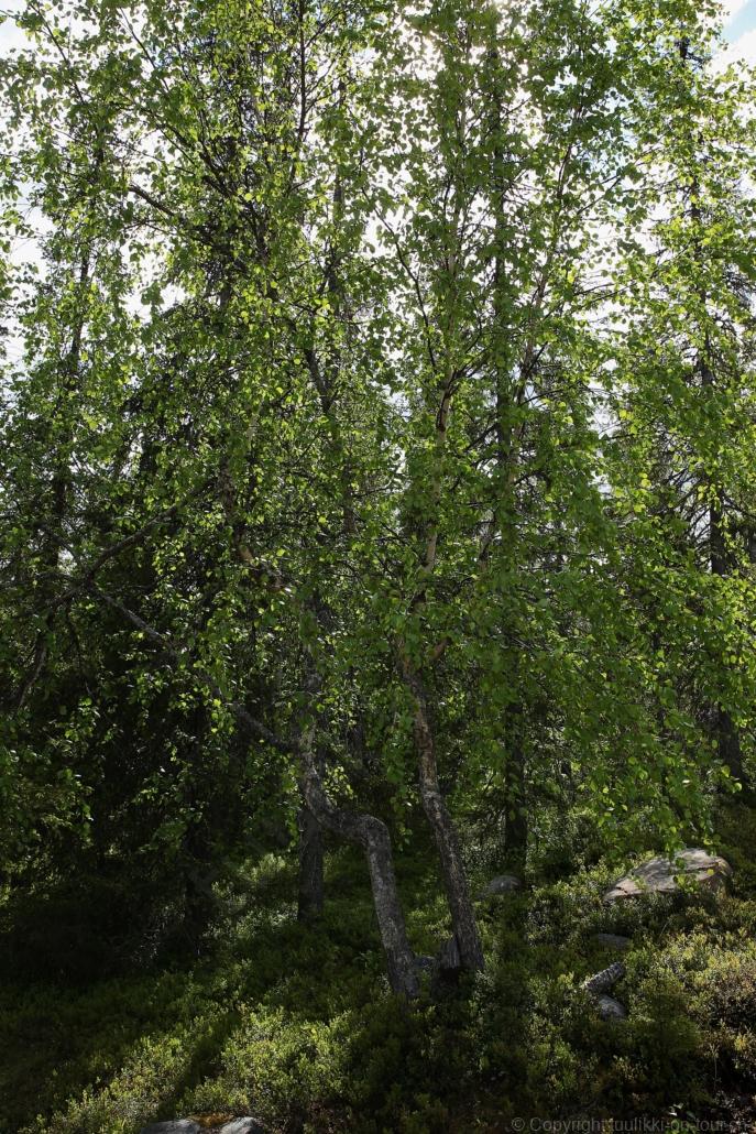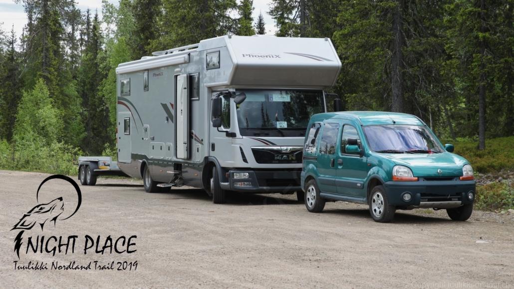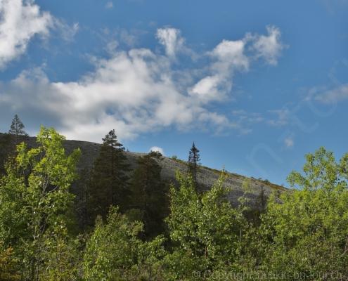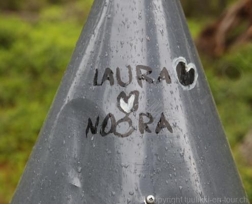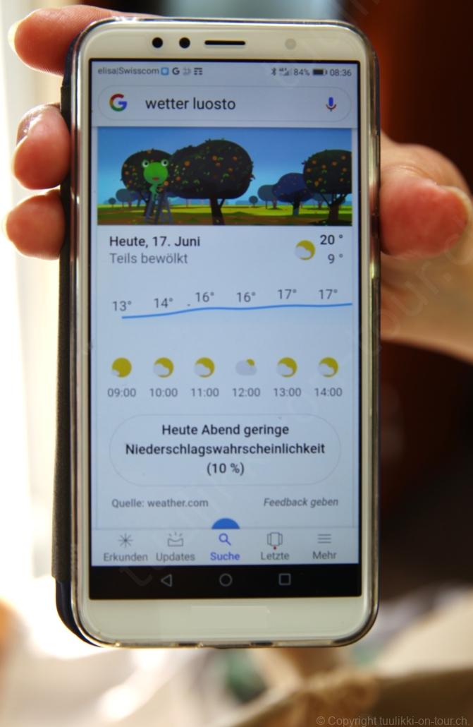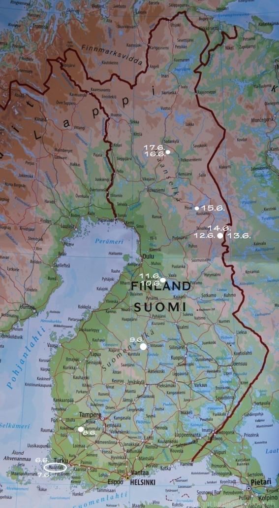 Heute wollen wir uns in Luosto umsehen, die ‘alten’ Orte besuchen und schauen, ob es uns immer noch so gut gefällt wie vor 2 Jahren. Dazu nimmt Nils den Kangoo vom Anhänger; er ist voller Staub von der Fahrt über die Naturstrassen und wenn wir die Fenster öffnen, ‘chroset’ es gewaltig. Jawohl, unser erster Eindruck ist sehr positiv; beim Morgenspaziergang begrüsst uns auch gleich ein weisses Rentier, das sich von unseren bellenden Hunden überhaupt nicht beeindrucken lässt; umso mehr beeindruckt davon sind unsere 3 Feuchtnasen. Beim Veterinär im nächstgrösseren Ort bestellen wir telefonisch das Spezialfutter und die Medis für Oxi, die wir gegen Ende Woche dort abholen und den 3 Hunden gleich die nächste ‘tapeworm’ Behandlung zukommen lassen können. Das heisst, dass wir hier in Luosto noch mind. 3-4 Tage rumhängen können; wie praktisch! Im kleinen K-Markt besorgen wir uns Mückenspray und im Café nebenan treffen wir die nette Verkäuferin von vor 2 Jahren und so fühlen wir uns gleich wieder heimisch. Beim Rundgang um den Ahvenlampi See beginnt es leicht zu regnen und die Mücken, die dieses Wetter lieben sind sehr präsent, aber wir ja jetzt gerüstet. Nebst einem Häschen begegnen uns drei Huskies und ihre Führerin; für Abwechslung ist also gesorgt! Die Natur hier ist grandios, dazu zählt auch das schnell wechselnde Wetter, von dem wir heute alles kurz abbekommen: Sonne-Wolken-Regen-Sonne-Wolken. Am Abend wandern wir zur Amethyst-Mine und sind ganz alleine auf diesem Trail unterwegs. Erst dort oben hat es Fat bike-Fahrer (wegen der dicken Pneus) und Wanderer mit grossen Rucksäcken. Ja klar, bei uns müsste man sich langsam beeilen, um vor dem Eindunkeln eine Unterkunft zu finden, hier oben in Lappland könnte man um diese Jahreszeit von der Helligkeit her eigentlich rund um die Uhr unterwegs sein.