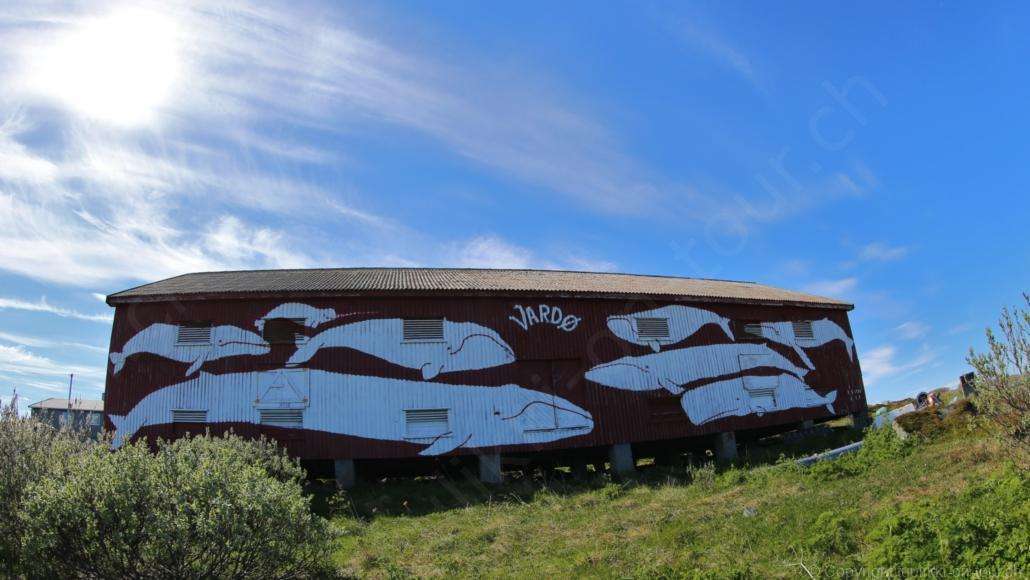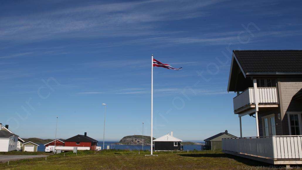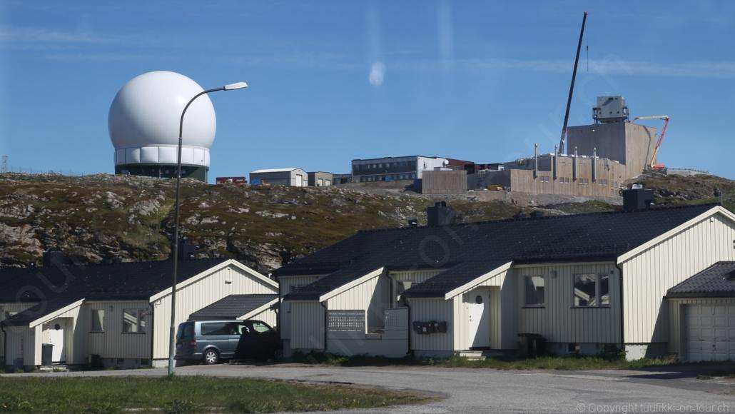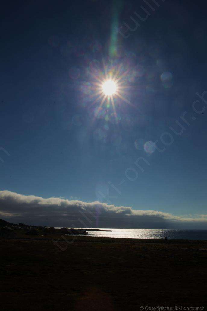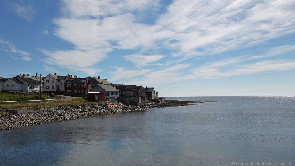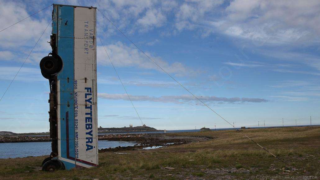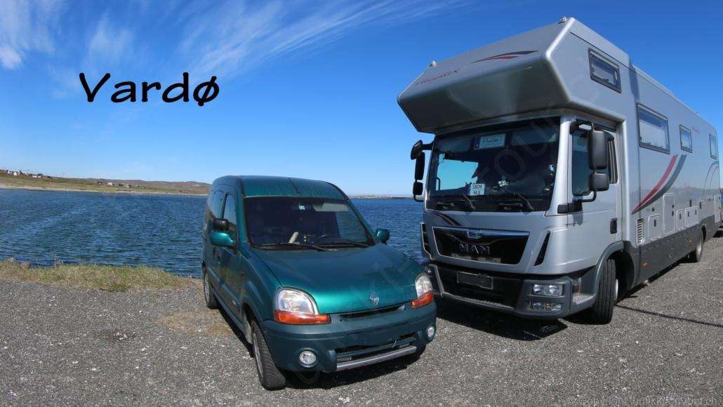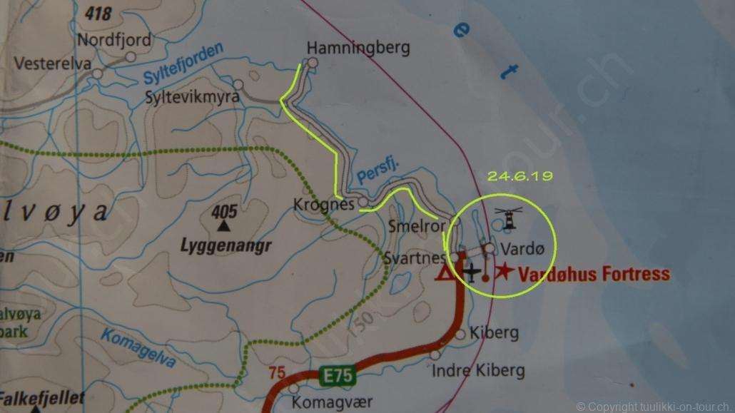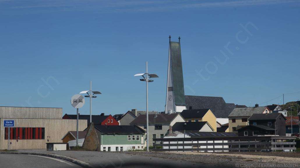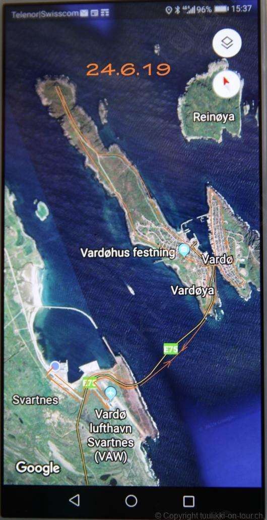 Eigentlich ist es ja hier so, dass der Tag nicht endet und die Nacht nicht beginnt (Mitternachtssonne: es ist wirklich 24 Stunden lang taghell und sonnig, denn die Sonne sinkt nicht unter den Horizont). Unser Tag (kurz vor oder nach 7 Uhr) beginnt also mit Sonnenschein pur und Frühstück bei offener Türe. Nichtsdestotrotz wollen wir heute zurück, d.h. den ersten Teil des Rückwegs, die abwechslungsreiche, einsame Märchenstrecke von Hamningberg bis Vardo mit vollen Sinnen geniessen: zackige dunkle Felsen, baumlose grüne Felder mit Schafen, weisse Gischt, die von der Barentsee an die Felsen geworfen wird und Sanddünen mit blauem Wasser und weissem Sandstrand, dazwischen ein schmales Strassenband. Nach einer Stunde erreichen wir den Festland-Teil von Vardo. Dort stellen wir unser WoMo ab und wechseln auf den Kangoo. Zuerst schauen wir uns den Flughafen an, ein neueres, langgezogenes Gebäude mit Kontrollturm und Piste in Richtung Fjord. Es hat einige geparkte Autos, aber sonst ist keinerlei Bewegung auszumachen. Also spazieren wir mit den Hunden die Umgebung ab, die leider noch mit Aushub, Bauschutt und Abfall verunstaltet ist, in dem sich Schafe nach Fressbarem umsehen. Und wie es der Zufall so will, ist eine Propellermaschine im Anflug … und startet nach höchstens einer Viertelstunde wieder: Danach ist das Flughafen-Gebäude bis am Abend geschlossen. Der Inselteil von Vardo ist weder über eine Brücke, noch per Fähre erreichbar. Ein 2,98 km langer, bis 88 m unter Meeresspiegel führender Tunnel (Ishavstunnel) verbindet das Festland mit der Insel Vardoya, wo auch die E75 endet, die in Kreta startet! Hier unter dem Eismeer durch sind wir östlicher als Istanbul, Kairo oder St.Petersburg! Die Temperaturen bewegen sich dank des warmen Golfstroms im Mittel von -5 bis +9°! Heute haben wir bei vollem Sonnenschein das Mittel erreicht! Am Auffälligsten hier auf der Insel sind wohl die ‘Kugeln’: während des Kalten Krieges unterhielt die NATO hier ein Frühwarnsystem und seit 1998 gibt es eine Radarstation, eine zweite ist im Bau und soll nächstes Jahr fertig werden. Im 17. Jahrhundert fanden in Vardo gegen 100 Hexenverbrennungen statt (Frauen + Männer); dazu wurde ein Mahnmal errichtet, entworfen vom Schweizer Peter Zumthor und der Französin Louise Bourgeois. Der östliche Teil der Insel ist überbaut mit farbigen Holzhäusern, in der Hafengegend brüten Möwen sehr fotogen in den Fensternischen. Der nördliche Teil dagegen ist baum- und menschenleer und nur über eine steinige, ausgefahrene Naturstrasse erreichbar, die zu einem Leuchtturm, Bunkeranlagen und einer spektakulären Holzinstallation mit Elementen eines Wikingerschiffes, eines Dinosauriers und eines Wals auf einen Fels gesetzt, führt. Der blaue Himmel mit den malerisch weissen aufziehenden Wolken und der Brandung an den Felsen unten: ein unvergessliches Szenario. Wir lassen es auf uns wirken und schiessen unzählige Fotos. Dann, zusammen mit der Bewölkung geht’s zurück zum WoMo, wo wir den heutigen erlebnisreichen Tag in Worte fassen, die besten Aufnahmen auswählen und auf unsere Reise-Homepage hochladen wollen. Dazwischen aber kommt wieder die Sonne hervor und so geht’s nochmals auf eine Spazierrunde über Wiesen mit Schafen, zum Festland-Hafen, an den Sandstrand. Dann gibt’s Nachtessen … wieder ist uns die Zeit davongelaufen, weil die Sonne noch so hoch am Himmel steht, ist’s unbemerkt schon 20:30 Uhr geworden und der tuulikki-Beitrag noch nicht bereit. Aber, wir lassen uns nur ein ganz klein wenig davon stressen; den Abend toppen wir mit einem zartschmelzenden Eis.