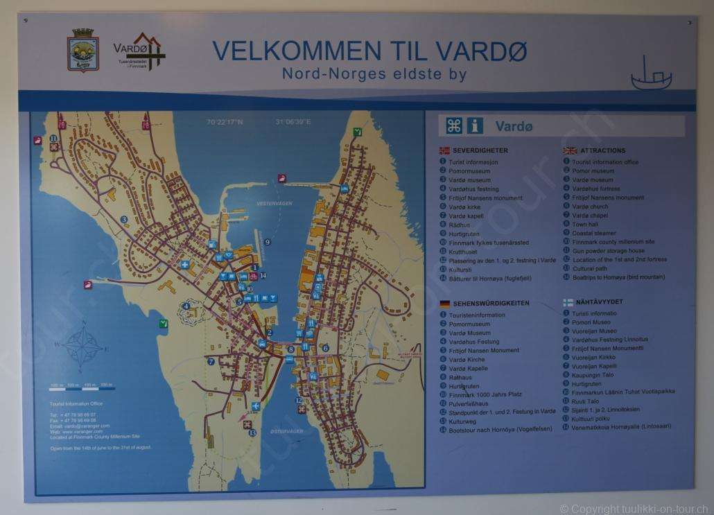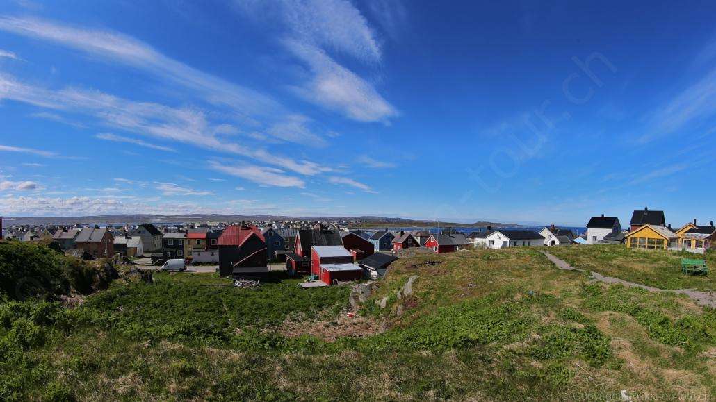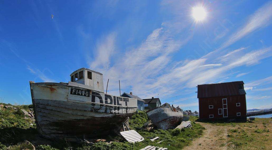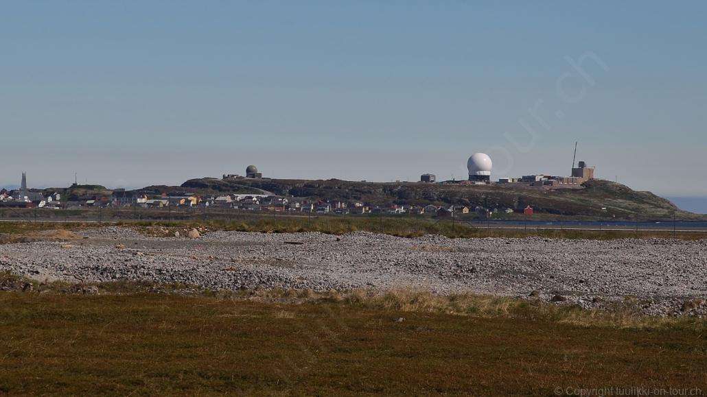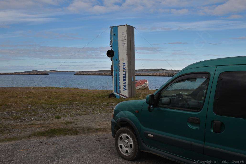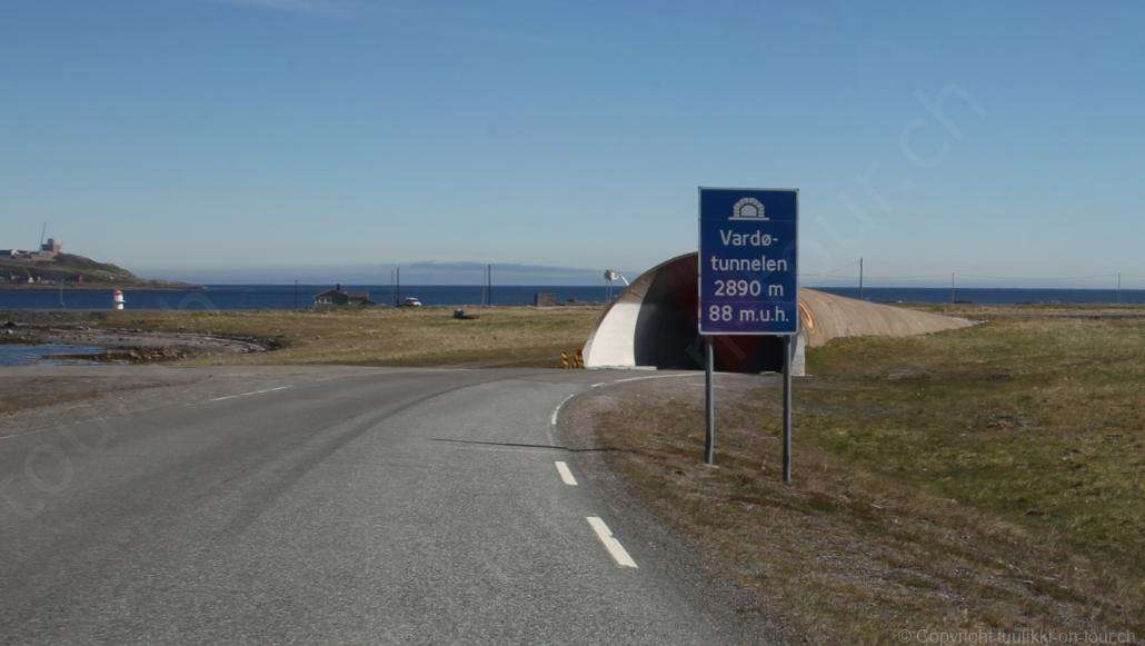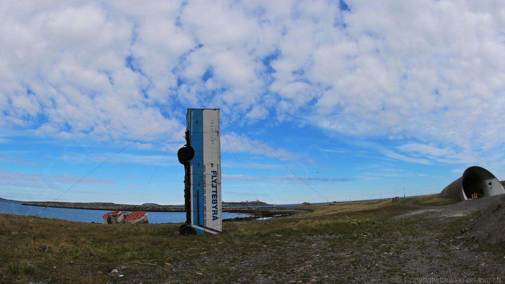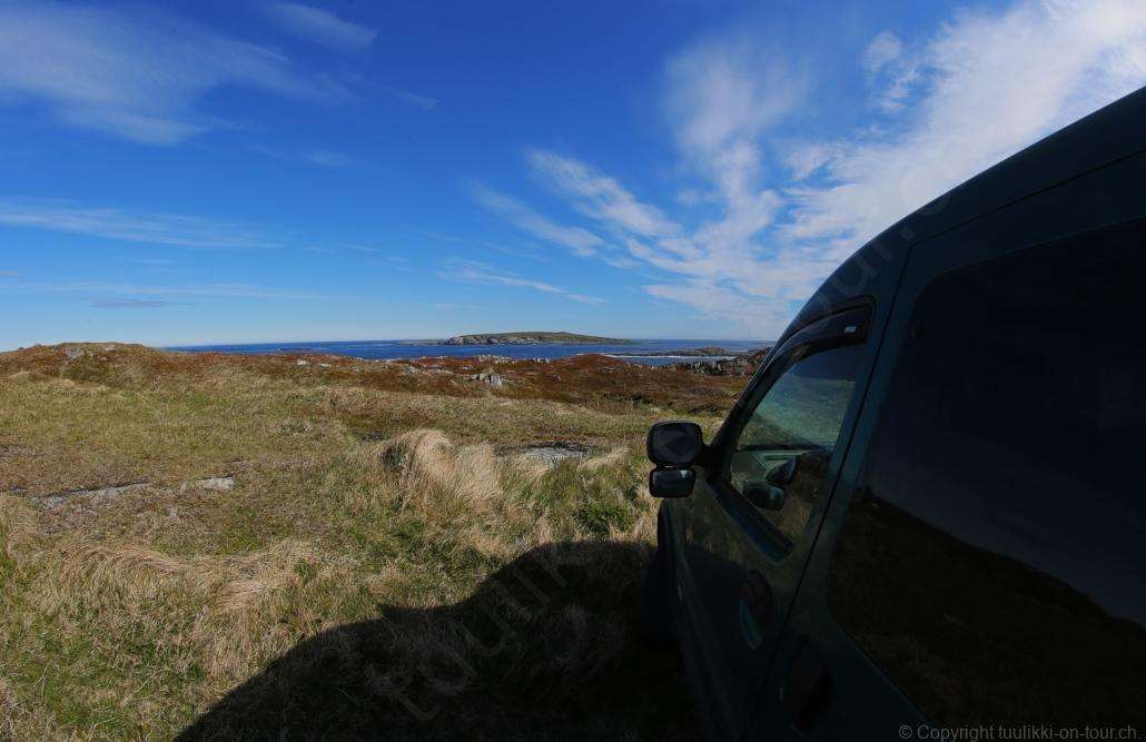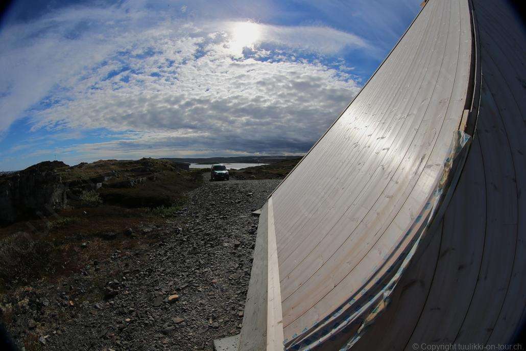 Eigentlich ist es ja hier so, dass der Tag nicht endet und die Nacht nicht beginnt (Mitternachtssonne: es ist wirklich 24 Stunden lang taghell und sonnig, denn die Sonne sinkt nicht unter den Horizont). Unser Tag (kurz vor oder nach 7 Uhr) beginnt also mit Sonnenschein pur und Frühstück bei offener Türe. Nichtsdestotrotz wollen wir heute zurück, d.h. den ersten Teil des Rückwegs, die abwechslungsreiche, einsame Märchenstrecke von Hamningberg bis Vardo mit vollen Sinnen geniessen: zackige dunkle Felsen, baumlose grüne Felder mit Schafen, weisse Gischt, die von der Barentsee an die Felsen geworfen wird und Sanddünen mit blauem Wasser und weissem Sandstrand, dazwischen ein schmales Strassenband. Nach einer Stunde erreichen wir den Festland-Teil von Vardo. Dort stellen wir unser WoMo ab und wechseln auf den Kangoo. Zuerst schauen wir uns den Flughafen an, ein neueres, langgezogenes Gebäude mit Kontrollturm und Piste in Richtung Fjord. Es hat einige geparkte Autos, aber sonst ist keinerlei Bewegung auszumachen. Also spazieren wir mit den Hunden die Umgebung ab, die leider noch mit Aushub, Bauschutt und Abfall verunstaltet ist, in dem sich Schafe nach Fressbarem umsehen. Und wie es der Zufall so will, ist eine Propellermaschine im Anflug … und startet nach höchstens einer Viertelstunde wieder: Danach ist das Flughafen-Gebäude bis am Abend geschlossen. Der Inselteil von Vardo ist weder über eine Brücke, noch per Fähre erreichbar. Ein 2,98 km langer, bis 88 m unter Meeresspiegel führender Tunnel (Ishavstunnel) verbindet das Festland mit der Insel Vardoya, wo auch die E75 endet, die in Kreta startet! Hier unter dem Eismeer durch sind wir östlicher als Istanbul, Kairo oder St.Petersburg! Die Temperaturen bewegen sich dank des warmen Golfstroms im Mittel von -5 bis +9°! Heute haben wir bei vollem Sonnenschein das Mittel erreicht! Am Auffälligsten hier auf der Insel sind wohl die ‘Kugeln’: während des Kalten Krieges unterhielt die NATO hier ein Frühwarnsystem und seit 1998 gibt es eine Radarstation, eine zweite ist im Bau und soll nächstes Jahr fertig werden. Im 17. Jahrhundert fanden in Vardo gegen 100 Hexenverbrennungen statt (Frauen + Männer); dazu wurde ein Mahnmal errichtet, entworfen vom Schweizer Peter Zumthor und der Französin Louise Bourgeois. Der östliche Teil der Insel ist überbaut mit farbigen Holzhäusern, in der Hafengegend brüten Möwen sehr fotogen in den Fensternischen. Der nördliche Teil dagegen ist baum- und menschenleer und nur über eine steinige, ausgefahrene Naturstrasse erreichbar, die zu einem Leuchtturm, Bunkeranlagen und einer spektakulären Holzinstallation mit Elementen eines Wikingerschiffes, eines Dinosauriers und eines Wals auf einen Fels gesetzt, führt. Der blaue Himmel mit den malerisch weissen aufziehenden Wolken und der Brandung an den Felsen unten: ein unvergessliches Szenario. Wir lassen es auf uns wirken und schiessen unzählige Fotos. Dann, zusammen mit der Bewölkung geht’s zurück zum WoMo, wo wir den heutigen erlebnisreichen Tag in Worte fassen, die besten Aufnahmen auswählen und auf unsere Reise-Homepage hochladen wollen. Dazwischen aber kommt wieder die Sonne hervor und so geht’s nochmals auf eine Spazierrunde über Wiesen mit Schafen, zum Festland-Hafen, an den Sandstrand. Dann gibt’s Nachtessen … wieder ist uns die Zeit davongelaufen, weil die Sonne noch so hoch am Himmel steht, ist’s unbemerkt schon 20:30 Uhr geworden und der tuulikki-Beitrag noch nicht bereit. Aber, wir lassen uns nur ein ganz klein wenig davon stressen; den Abend toppen wir mit einem zartschmelzenden Eis.
