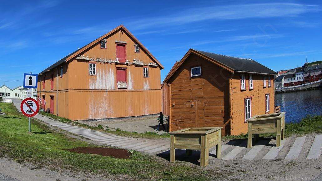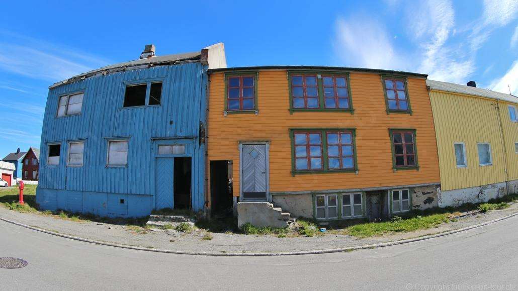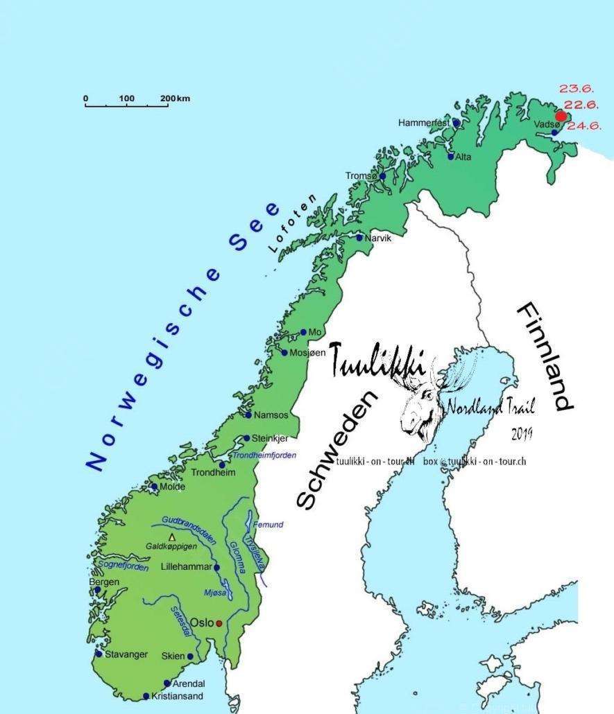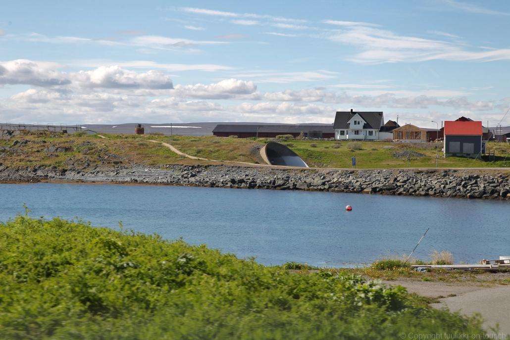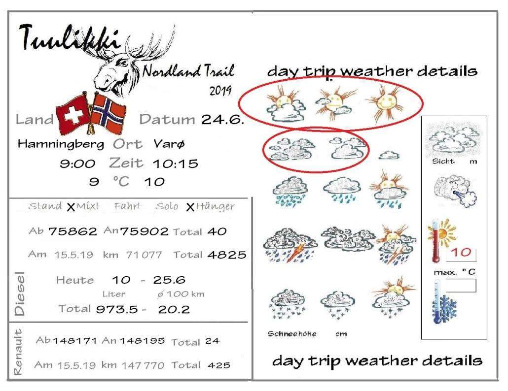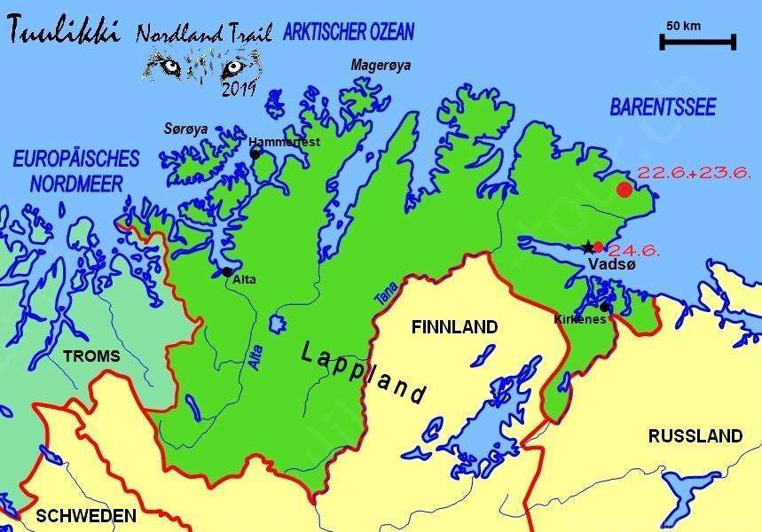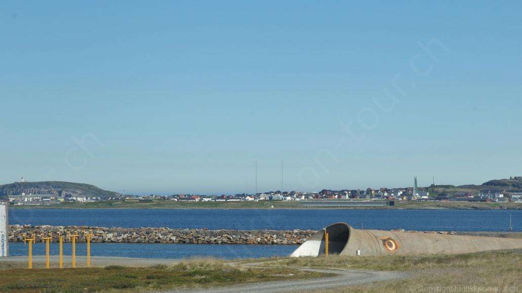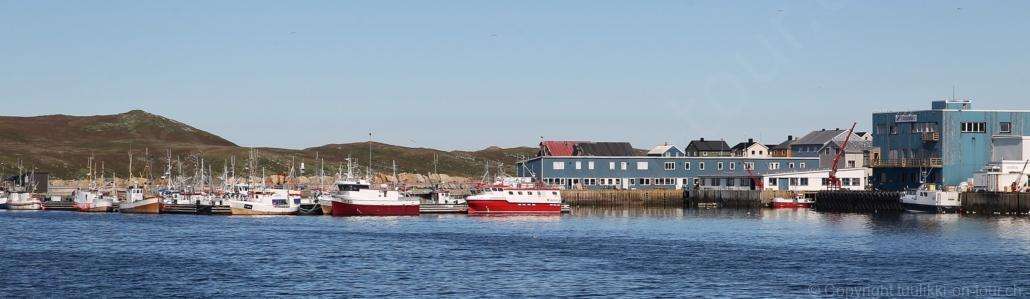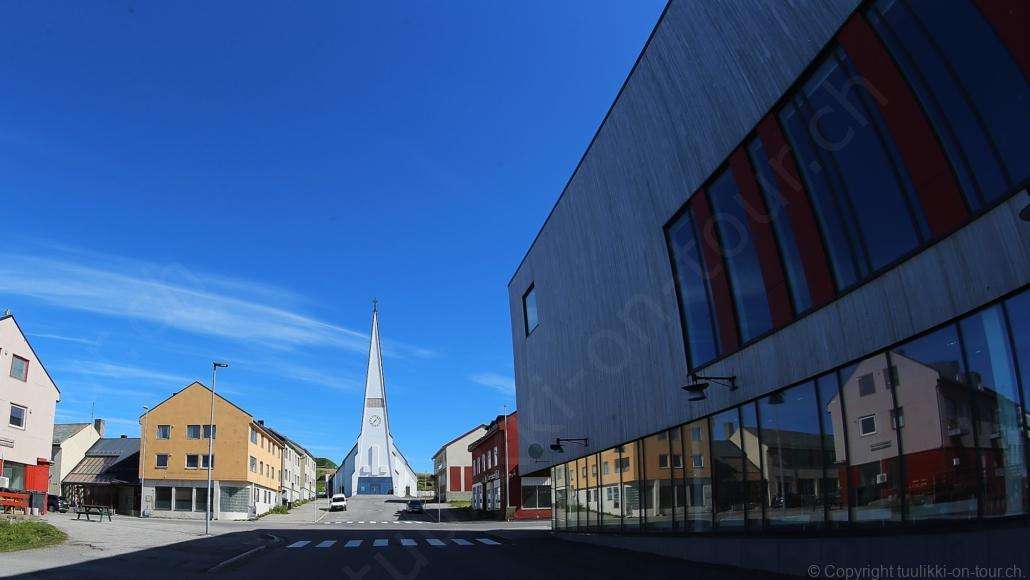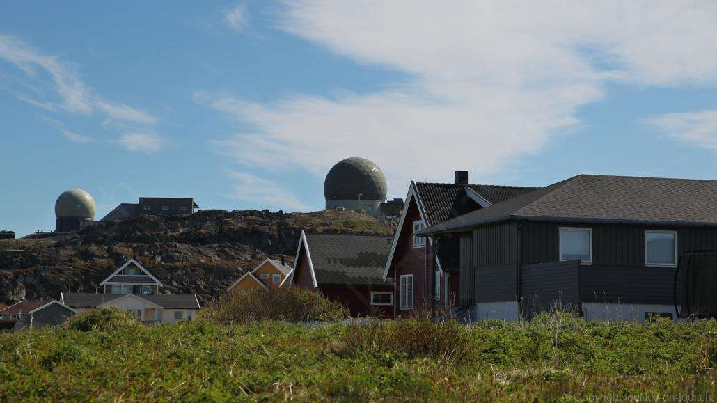 Eigentlich ist es ja hier so, dass der Tag nicht endet und die Nacht nicht beginnt (Mitternachtssonne: es ist wirklich 24 Stunden lang taghell und sonnig, denn die Sonne sinkt nicht unter den Horizont). Unser Tag (kurz vor oder nach 7 Uhr) beginnt also mit Sonnenschein pur und Frühstück bei offener Türe. Nichtsdestotrotz wollen wir heute zurück, d.h. den ersten Teil des Rückwegs, die abwechslungsreiche, einsame Märchenstrecke von Hamningberg bis Vardo mit vollen Sinnen geniessen: zackige dunkle Felsen, baumlose grüne Felder mit Schafen, weisse Gischt, die von der Barentsee an die Felsen geworfen wird und Sanddünen mit blauem Wasser und weissem Sandstrand, dazwischen ein schmales Strassenband. Nach einer Stunde erreichen wir den Festland-Teil von Vardo. Dort stellen wir unser WoMo ab und wechseln auf den Kangoo. Zuerst schauen wir uns den Flughafen an, ein neueres, langgezogenes Gebäude mit Kontrollturm und Piste in Richtung Fjord. Es hat einige geparkte Autos, aber sonst ist keinerlei Bewegung auszumachen. Also spazieren wir mit den Hunden die Umgebung ab, die leider noch mit Aushub, Bauschutt und Abfall verunstaltet ist, in dem sich Schafe nach Fressbarem umsehen. Und wie es der Zufall so will, ist eine Propellermaschine im Anflug … und startet nach höchstens einer Viertelstunde wieder: Danach ist das Flughafen-Gebäude bis am Abend geschlossen. Der Inselteil von Vardo ist weder über eine Brücke, noch per Fähre erreichbar. Ein 2,98 km langer, bis 88 m unter Meeresspiegel führender Tunnel (Ishavstunnel) verbindet das Festland mit der Insel Vardoya, wo auch die E75 endet, die in Kreta startet! Hier unter dem Eismeer durch sind wir östlicher als Istanbul, Kairo oder St.Petersburg! Die Temperaturen bewegen sich dank des warmen Golfstroms im Mittel von -5 bis +9°! Heute haben wir bei vollem Sonnenschein das Mittel erreicht! Am Auffälligsten hier auf der Insel sind wohl die ‘Kugeln’: während des Kalten Krieges unterhielt die NATO hier ein Frühwarnsystem und seit 1998 gibt es eine Radarstation, eine zweite ist im Bau und soll nächstes Jahr fertig werden. Im 17. Jahrhundert fanden in Vardo gegen 100 Hexenverbrennungen statt (Frauen + Männer); dazu wurde ein Mahnmal errichtet, entworfen vom Schweizer Peter Zumthor und der Französin Louise Bourgeois. Der östliche Teil der Insel ist überbaut mit farbigen Holzhäusern, in der Hafengegend brüten Möwen sehr fotogen in den Fensternischen. Der nördliche Teil dagegen ist baum- und menschenleer und nur über eine steinige, ausgefahrene Naturstrasse erreichbar, die zu einem Leuchtturm, Bunkeranlagen und einer spektakulären Holzinstallation mit Elementen eines Wikingerschiffes, eines Dinosauriers und eines Wals auf einen Fels gesetzt, führt. Der blaue Himmel mit den malerisch weissen aufziehenden Wolken und der Brandung an den Felsen unten: ein unvergessliches Szenario. Wir lassen es auf uns wirken und schiessen unzählige Fotos. Dann, zusammen mit der Bewölkung geht’s zurück zum WoMo, wo wir den heutigen erlebnisreichen Tag in Worte fassen, die besten Aufnahmen auswählen und auf unsere Reise-Homepage hochladen wollen. Dazwischen aber kommt wieder die Sonne hervor und so geht’s nochmals auf eine Spazierrunde über Wiesen mit Schafen, zum Festland-Hafen, an den Sandstrand. Dann gibt’s Nachtessen … wieder ist uns die Zeit davongelaufen, weil die Sonne noch so hoch am Himmel steht, ist’s unbemerkt schon 20:30 Uhr geworden und der tuulikki-Beitrag noch nicht bereit. Aber, wir lassen uns nur ein ganz klein wenig davon stressen; den Abend toppen wir mit einem zartschmelzenden Eis.