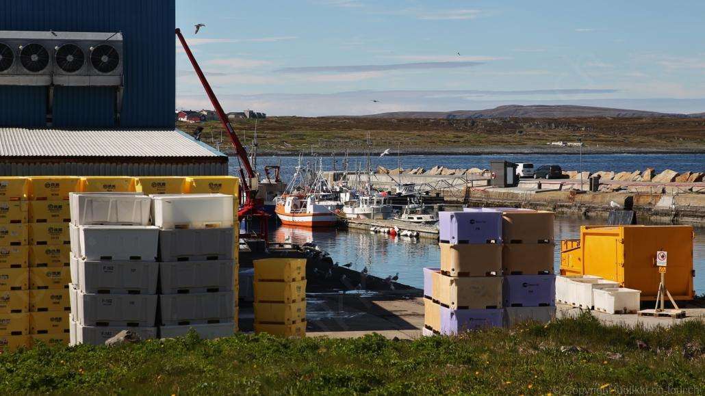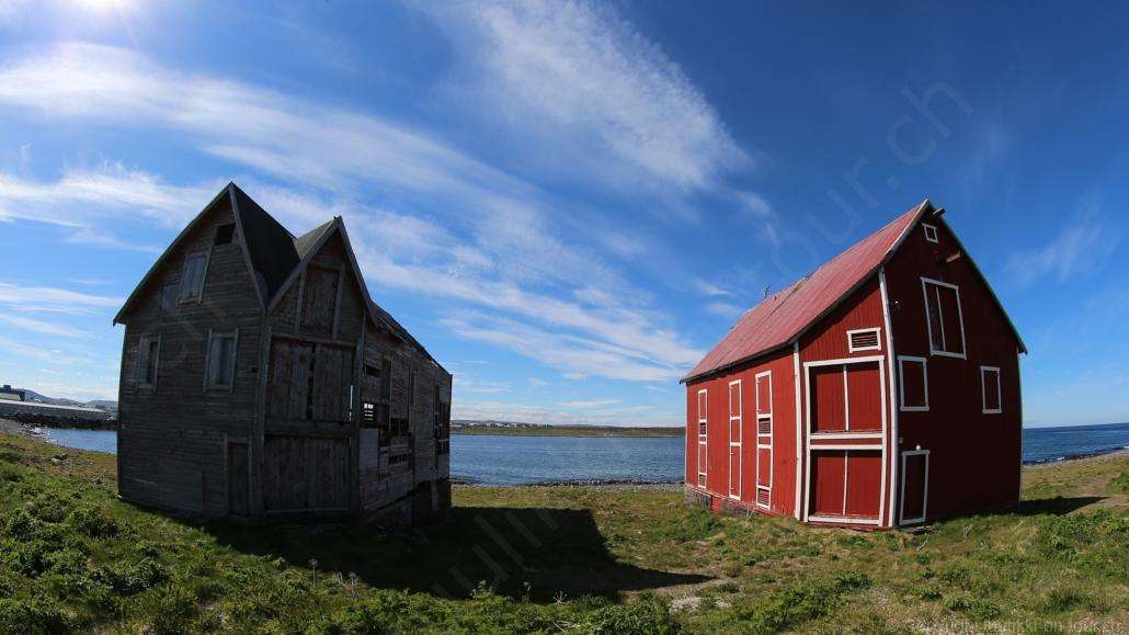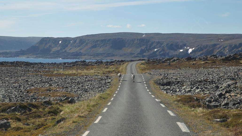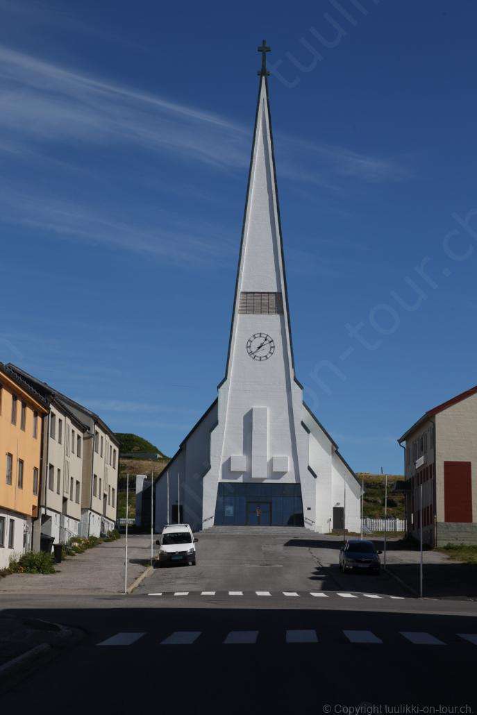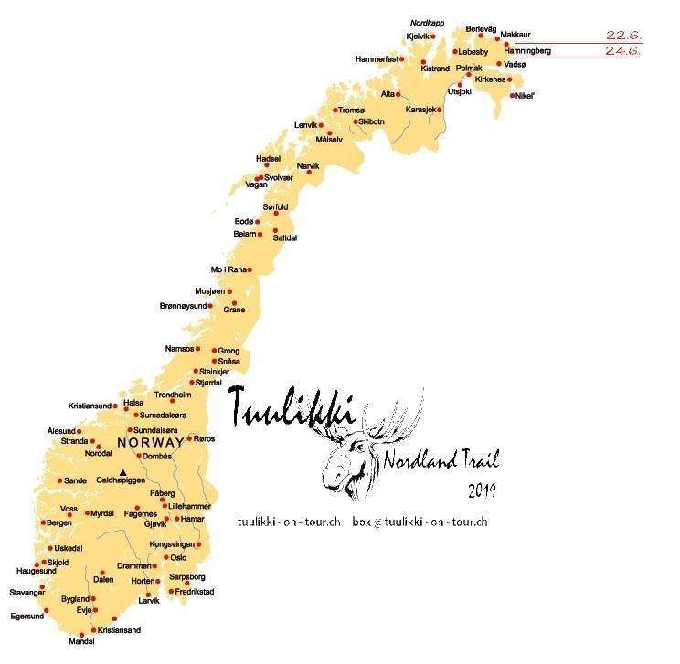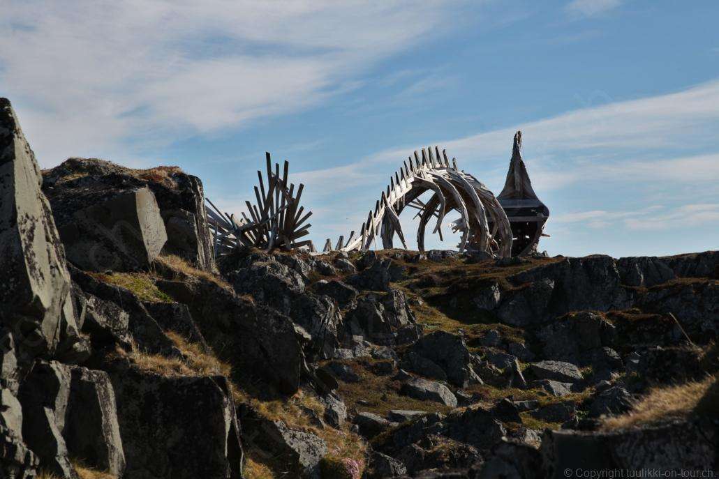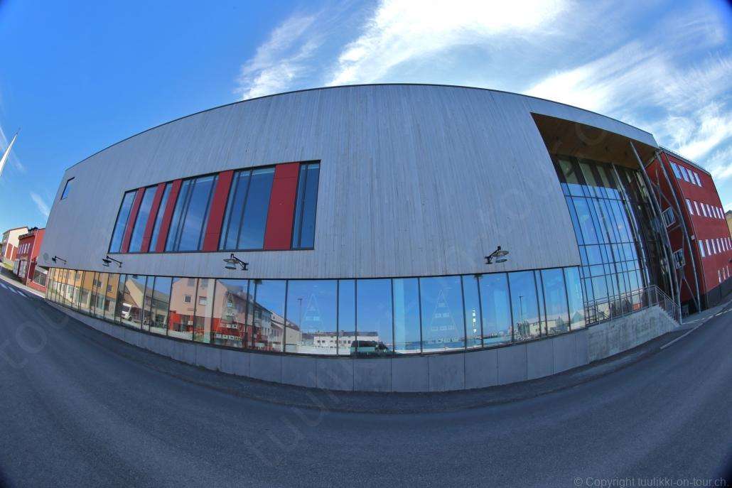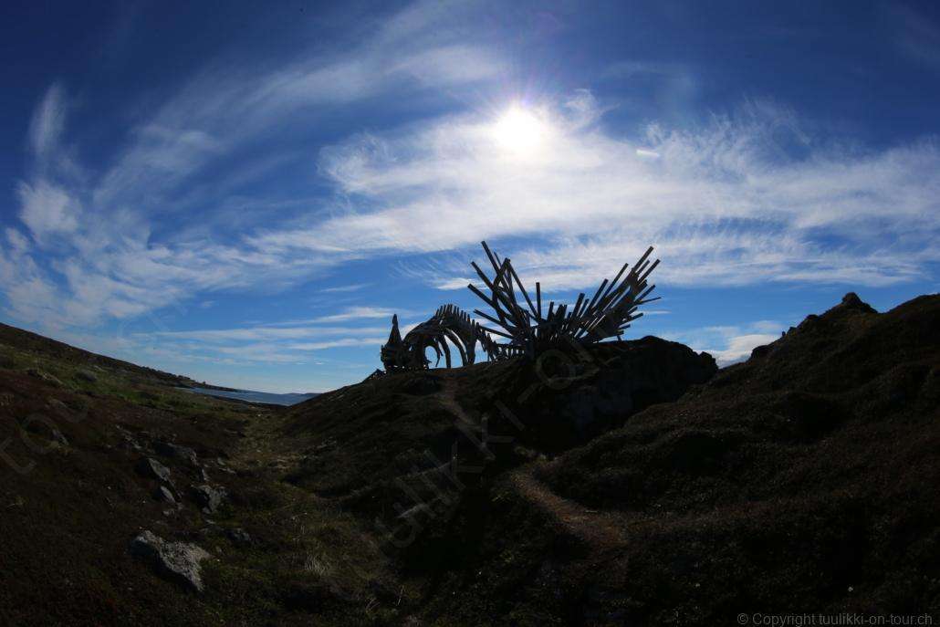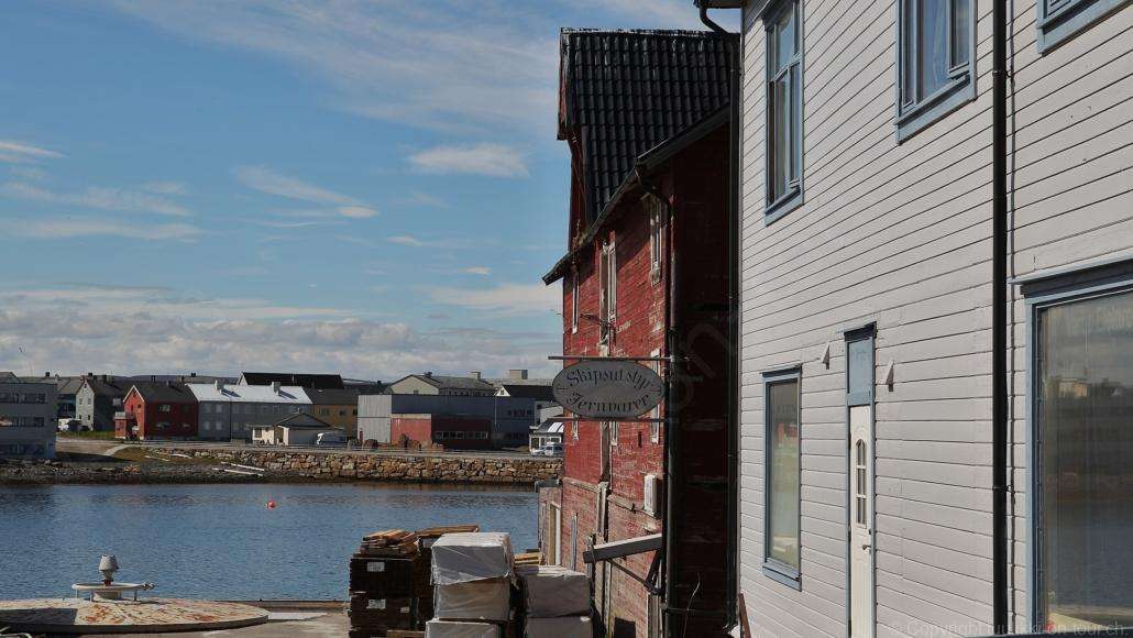 Eigentlich ist es ja hier so, dass der Tag nicht endet und die Nacht nicht beginnt (Mitternachtssonne: es ist wirklich 24 Stunden lang taghell und sonnig, denn die Sonne sinkt nicht unter den Horizont). Unser Tag (kurz vor oder nach 7 Uhr) beginnt also mit Sonnenschein pur und Frühstück bei offener Türe. Nichtsdestotrotz wollen wir heute zurück, d.h. den ersten Teil des Rückwegs, die abwechslungsreiche, einsame Märchenstrecke von Hamningberg bis Vardo mit vollen Sinnen geniessen: zackige dunkle Felsen, baumlose grüne Felder mit Schafen, weisse Gischt, die von der Barentsee an die Felsen geworfen wird und Sanddünen mit blauem Wasser und weissem Sandstrand, dazwischen ein schmales Strassenband. Nach einer Stunde erreichen wir den Festland-Teil von Vardo. Dort stellen wir unser WoMo ab und wechseln auf den Kangoo. Zuerst schauen wir uns den Flughafen an, ein neueres, langgezogenes Gebäude mit Kontrollturm und Piste in Richtung Fjord. Es hat einige geparkte Autos, aber sonst ist keinerlei Bewegung auszumachen. Also spazieren wir mit den Hunden die Umgebung ab, die leider noch mit Aushub, Bauschutt und Abfall verunstaltet ist, in dem sich Schafe nach Fressbarem umsehen. Und wie es der Zufall so will, ist eine Propellermaschine im Anflug … und startet nach höchstens einer Viertelstunde wieder: Danach ist das Flughafen-Gebäude bis am Abend geschlossen. Der Inselteil von Vardo ist weder über eine Brücke, noch per Fähre erreichbar. Ein 2,98 km langer, bis 88 m unter Meeresspiegel führender Tunnel (Ishavstunnel) verbindet das Festland mit der Insel Vardoya, wo auch die E75 endet, die in Kreta startet! Hier unter dem Eismeer durch sind wir östlicher als Istanbul, Kairo oder St.Petersburg! Die Temperaturen bewegen sich dank des warmen Golfstroms im Mittel von -5 bis +9°! Heute haben wir bei vollem Sonnenschein das Mittel erreicht! Am Auffälligsten hier auf der Insel sind wohl die ‘Kugeln’: während des Kalten Krieges unterhielt die NATO hier ein Frühwarnsystem und seit 1998 gibt es eine Radarstation, eine zweite ist im Bau und soll nächstes Jahr fertig werden. Im 17. Jahrhundert fanden in Vardo gegen 100 Hexenverbrennungen statt (Frauen + Männer); dazu wurde ein Mahnmal errichtet, entworfen vom Schweizer Peter Zumthor und der Französin Louise Bourgeois. Der östliche Teil der Insel ist überbaut mit farbigen Holzhäusern, in der Hafengegend brüten Möwen sehr fotogen in den Fensternischen. Der nördliche Teil dagegen ist baum- und menschenleer und nur über eine steinige, ausgefahrene Naturstrasse erreichbar, die zu einem Leuchtturm, Bunkeranlagen und einer spektakulären Holzinstallation mit Elementen eines Wikingerschiffes, eines Dinosauriers und eines Wals auf einen Fels gesetzt, führt. Der blaue Himmel mit den malerisch weissen aufziehenden Wolken und der Brandung an den Felsen unten: ein unvergessliches Szenario. Wir lassen es auf uns wirken und schiessen unzählige Fotos. Dann, zusammen mit der Bewölkung geht’s zurück zum WoMo, wo wir den heutigen erlebnisreichen Tag in Worte fassen, die besten Aufnahmen auswählen und auf unsere Reise-Homepage hochladen wollen. Dazwischen aber kommt wieder die Sonne hervor und so geht’s nochmals auf eine Spazierrunde über Wiesen mit Schafen, zum Festland-Hafen, an den Sandstrand. Dann gibt’s Nachtessen … wieder ist uns die Zeit davongelaufen, weil die Sonne noch so hoch am Himmel steht, ist’s unbemerkt schon 20:30 Uhr geworden und der tuulikki-Beitrag noch nicht bereit. Aber, wir lassen uns nur ein ganz klein wenig davon stressen; den Abend toppen wir mit einem zartschmelzenden Eis.