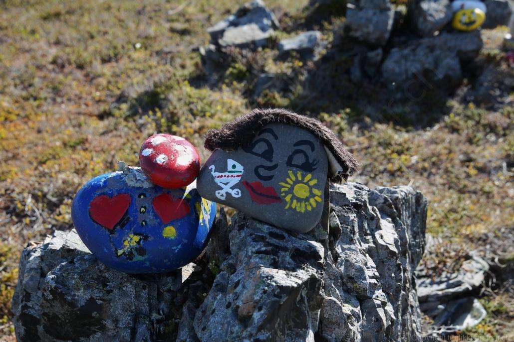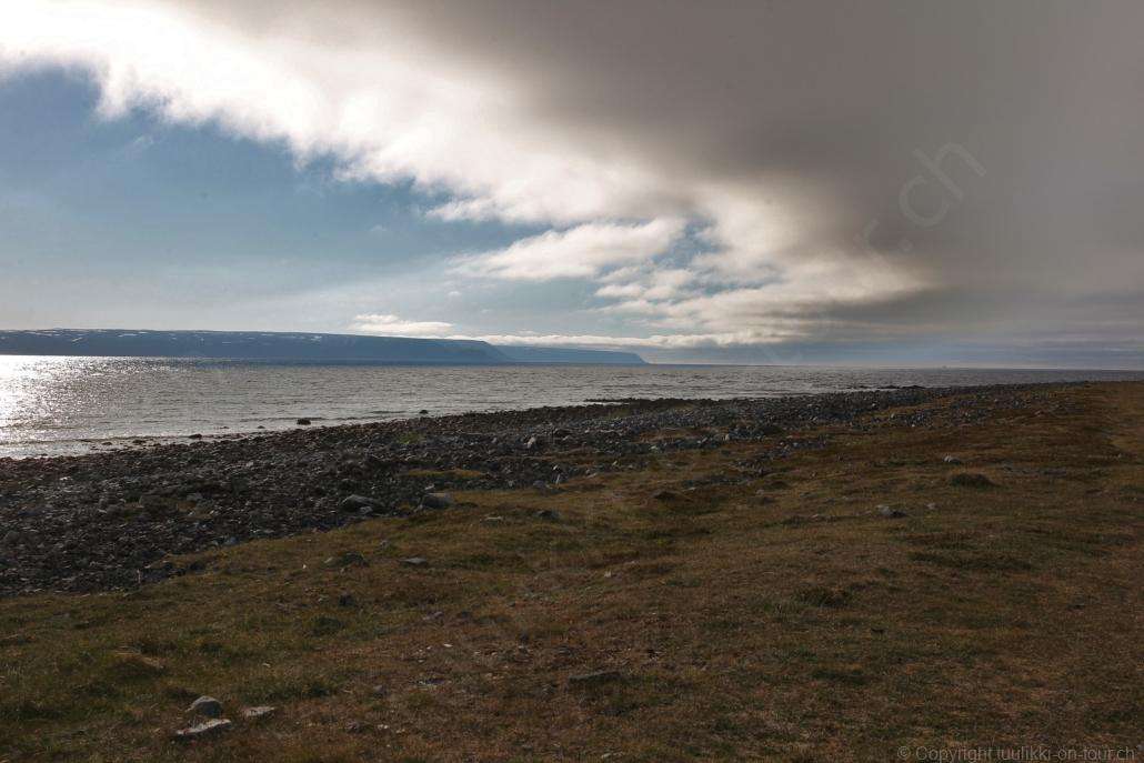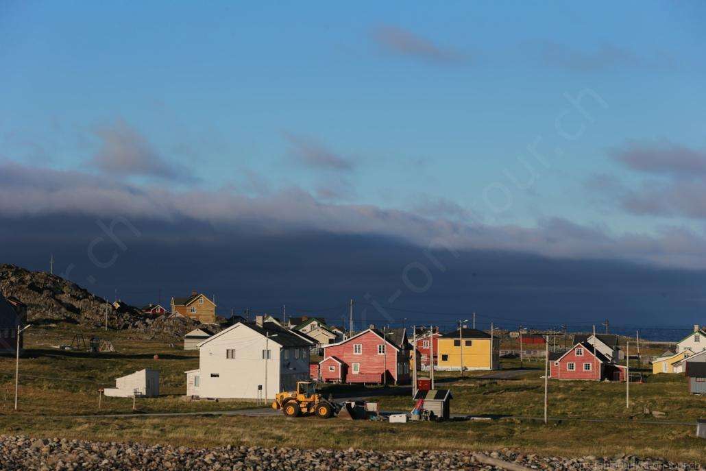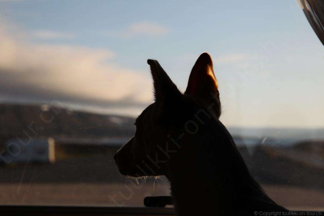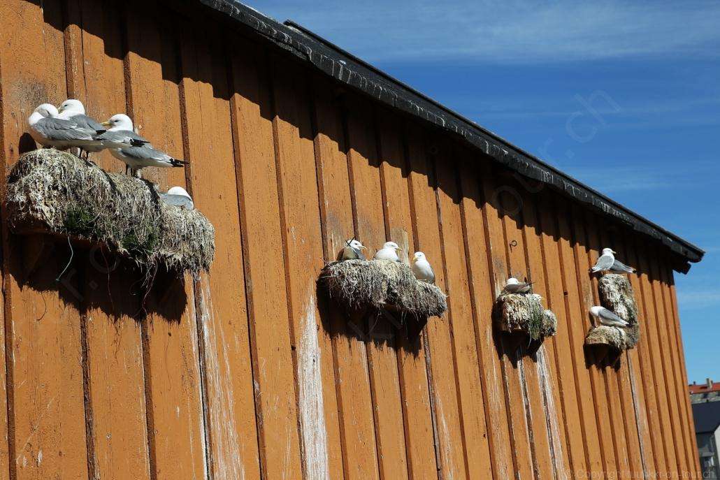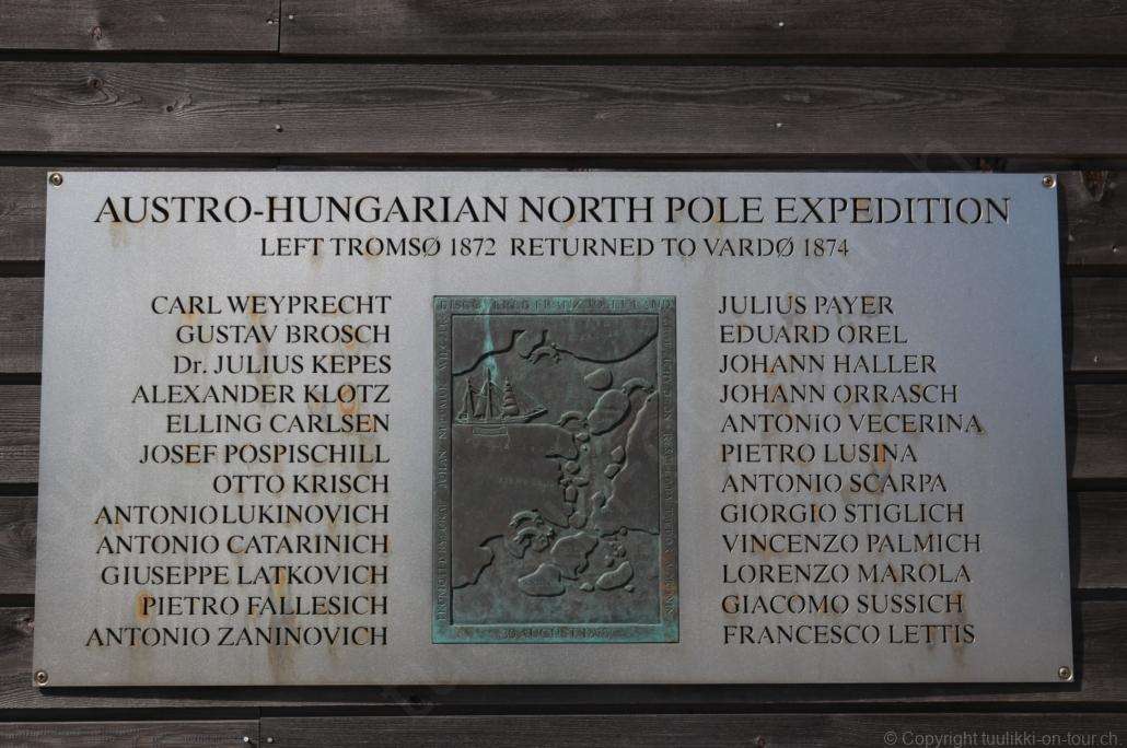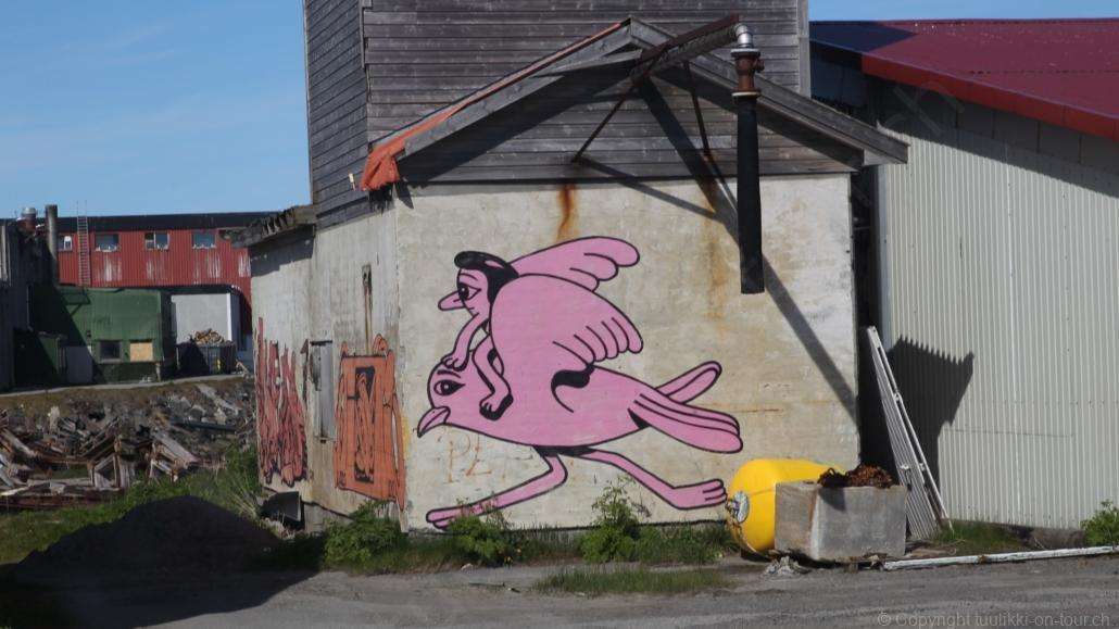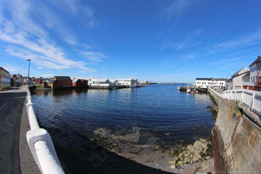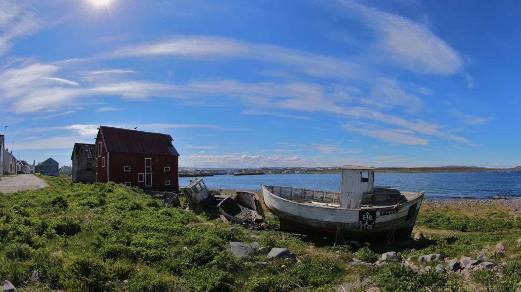 Eigentlich ist es ja hier so, dass der Tag nicht endet und die Nacht nicht beginnt (Mitternachtssonne: es ist wirklich 24 Stunden lang taghell und sonnig, denn die Sonne sinkt nicht unter den Horizont). Unser Tag (kurz vor oder nach 7 Uhr) beginnt also mit Sonnenschein pur und Frühstück bei offener Türe. Nichtsdestotrotz wollen wir heute zurück, d.h. den ersten Teil des Rückwegs, die abwechslungsreiche, einsame Märchenstrecke von Hamningberg bis Vardo mit vollen Sinnen geniessen: zackige dunkle Felsen, baumlose grüne Felder mit Schafen, weisse Gischt, die von der Barentsee an die Felsen geworfen wird und Sanddünen mit blauem Wasser und weissem Sandstrand, dazwischen ein schmales Strassenband. Nach einer Stunde erreichen wir den Festland-Teil von Vardo. Dort stellen wir unser WoMo ab und wechseln auf den Kangoo. Zuerst schauen wir uns den Flughafen an, ein neueres, langgezogenes Gebäude mit Kontrollturm und Piste in Richtung Fjord. Es hat einige geparkte Autos, aber sonst ist keinerlei Bewegung auszumachen. Also spazieren wir mit den Hunden die Umgebung ab, die leider noch mit Aushub, Bauschutt und Abfall verunstaltet ist, in dem sich Schafe nach Fressbarem umsehen. Und wie es der Zufall so will, ist eine Propellermaschine im Anflug … und startet nach höchstens einer Viertelstunde wieder: Danach ist das Flughafen-Gebäude bis am Abend geschlossen. Der Inselteil von Vardo ist weder über eine Brücke, noch per Fähre erreichbar. Ein 2,98 km langer, bis 88 m unter Meeresspiegel führender Tunnel (Ishavstunnel) verbindet das Festland mit der Insel Vardoya, wo auch die E75 endet, die in Kreta startet! Hier unter dem Eismeer durch sind wir östlicher als Istanbul, Kairo oder St.Petersburg! Die Temperaturen bewegen sich dank des warmen Golfstroms im Mittel von -5 bis +9°! Heute haben wir bei vollem Sonnenschein das Mittel erreicht! Am Auffälligsten hier auf der Insel sind wohl die ‘Kugeln’: während des Kalten Krieges unterhielt die NATO hier ein Frühwarnsystem und seit 1998 gibt es eine Radarstation, eine zweite ist im Bau und soll nächstes Jahr fertig werden. Im 17. Jahrhundert fanden in Vardo gegen 100 Hexenverbrennungen statt (Frauen + Männer); dazu wurde ein Mahnmal errichtet, entworfen vom Schweizer Peter Zumthor und der Französin Louise Bourgeois. Der östliche Teil der Insel ist überbaut mit farbigen Holzhäusern, in der Hafengegend brüten Möwen sehr fotogen in den Fensternischen. Der nördliche Teil dagegen ist baum- und menschenleer und nur über eine steinige, ausgefahrene Naturstrasse erreichbar, die zu einem Leuchtturm, Bunkeranlagen und einer spektakulären Holzinstallation mit Elementen eines Wikingerschiffes, eines Dinosauriers und eines Wals auf einen Fels gesetzt, führt. Der blaue Himmel mit den malerisch weissen aufziehenden Wolken und der Brandung an den Felsen unten: ein unvergessliches Szenario. Wir lassen es auf uns wirken und schiessen unzählige Fotos. Dann, zusammen mit der Bewölkung geht’s zurück zum WoMo, wo wir den heutigen erlebnisreichen Tag in Worte fassen, die besten Aufnahmen auswählen und auf unsere Reise-Homepage hochladen wollen. Dazwischen aber kommt wieder die Sonne hervor und so geht’s nochmals auf eine Spazierrunde über Wiesen mit Schafen, zum Festland-Hafen, an den Sandstrand. Dann gibt’s Nachtessen … wieder ist uns die Zeit davongelaufen, weil die Sonne noch so hoch am Himmel steht, ist’s unbemerkt schon 20:30 Uhr geworden und der tuulikki-Beitrag noch nicht bereit. Aber, wir lassen uns nur ein ganz klein wenig davon stressen; den Abend toppen wir mit einem zartschmelzenden Eis.