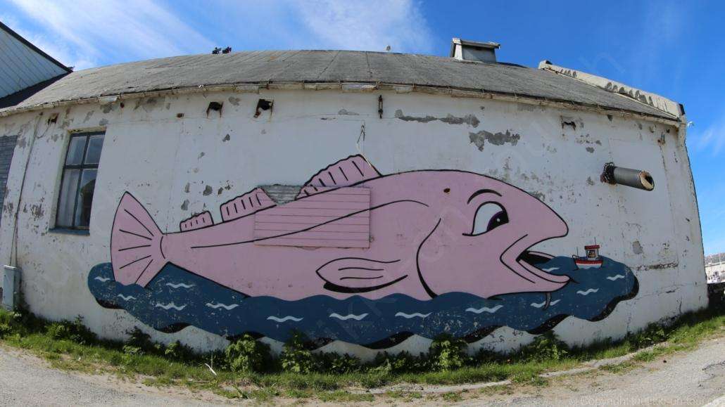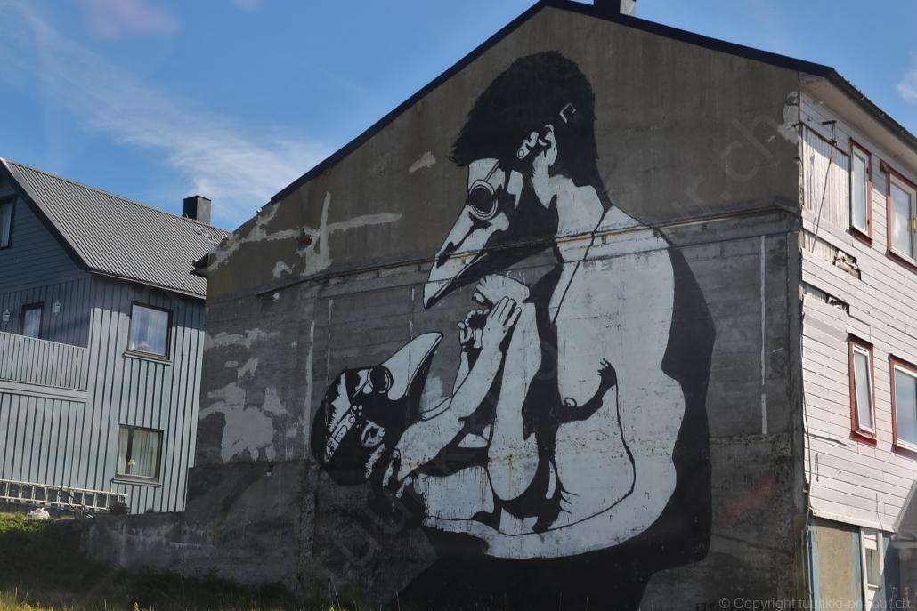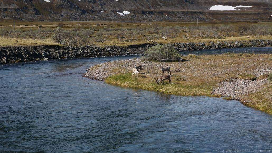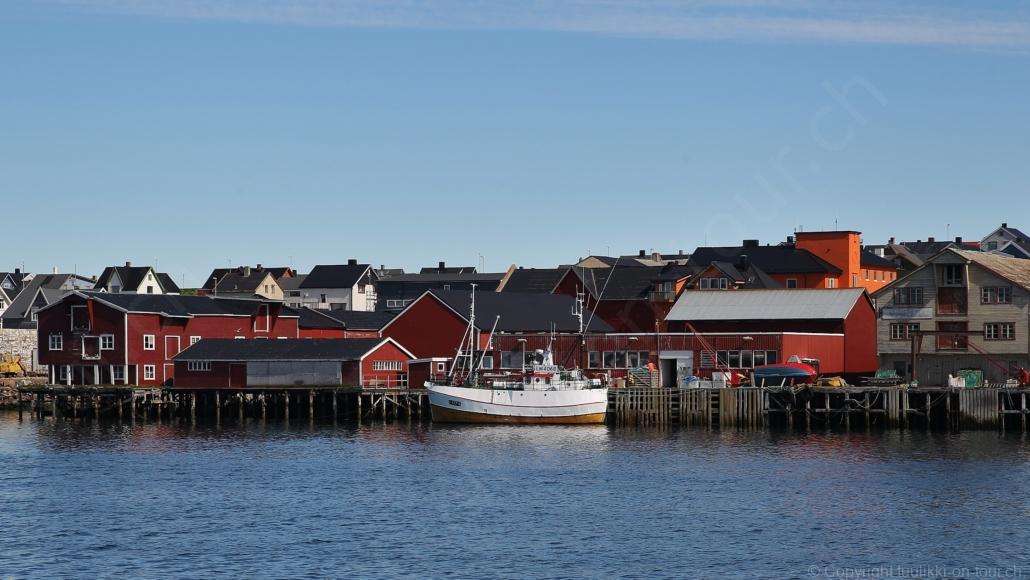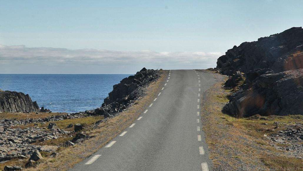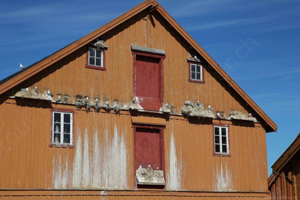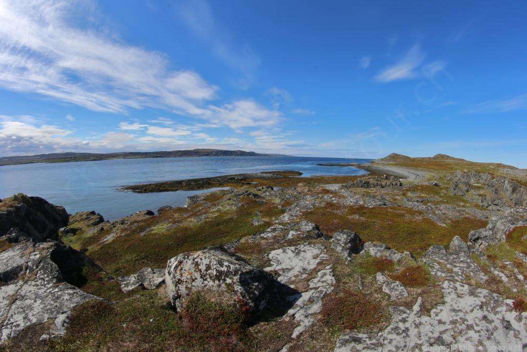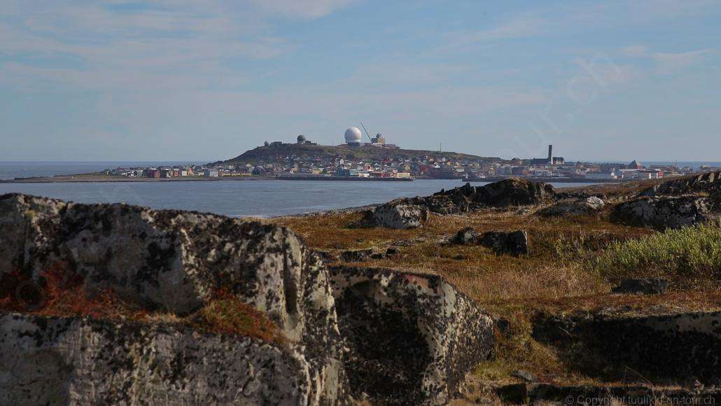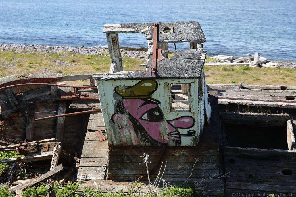 Eigentlich ist es ja hier so, dass der Tag nicht endet und die Nacht nicht beginnt (Mitternachtssonne: es ist wirklich 24 Stunden lang taghell und sonnig, denn die Sonne sinkt nicht unter den Horizont). Unser Tag (kurz vor oder nach 7 Uhr) beginnt also mit Sonnenschein pur und Frühstück bei offener Türe. Nichtsdestotrotz wollen wir heute zurück, d.h. den ersten Teil des Rückwegs, die abwechslungsreiche, einsame Märchenstrecke von Hamningberg bis Vardo mit vollen Sinnen geniessen: zackige dunkle Felsen, baumlose grüne Felder mit Schafen, weisse Gischt, die von der Barentsee an die Felsen geworfen wird und Sanddünen mit blauem Wasser und weissem Sandstrand, dazwischen ein schmales Strassenband. Nach einer Stunde erreichen wir den Festland-Teil von Vardo. Dort stellen wir unser WoMo ab und wechseln auf den Kangoo. Zuerst schauen wir uns den Flughafen an, ein neueres, langgezogenes Gebäude mit Kontrollturm und Piste in Richtung Fjord. Es hat einige geparkte Autos, aber sonst ist keinerlei Bewegung auszumachen. Also spazieren wir mit den Hunden die Umgebung ab, die leider noch mit Aushub, Bauschutt und Abfall verunstaltet ist, in dem sich Schafe nach Fressbarem umsehen. Und wie es der Zufall so will, ist eine Propellermaschine im Anflug … und startet nach höchstens einer Viertelstunde wieder: Danach ist das Flughafen-Gebäude bis am Abend geschlossen. Der Inselteil von Vardo ist weder über eine Brücke, noch per Fähre erreichbar. Ein 2,98 km langer, bis 88 m unter Meeresspiegel führender Tunnel (Ishavstunnel) verbindet das Festland mit der Insel Vardoya, wo auch die E75 endet, die in Kreta startet! Hier unter dem Eismeer durch sind wir östlicher als Istanbul, Kairo oder St.Petersburg! Die Temperaturen bewegen sich dank des warmen Golfstroms im Mittel von -5 bis +9°! Heute haben wir bei vollem Sonnenschein das Mittel erreicht! Am Auffälligsten hier auf der Insel sind wohl die ‘Kugeln’: während des Kalten Krieges unterhielt die NATO hier ein Frühwarnsystem und seit 1998 gibt es eine Radarstation, eine zweite ist im Bau und soll nächstes Jahr fertig werden. Im 17. Jahrhundert fanden in Vardo gegen 100 Hexenverbrennungen statt (Frauen + Männer); dazu wurde ein Mahnmal errichtet, entworfen vom Schweizer Peter Zumthor und der Französin Louise Bourgeois. Der östliche Teil der Insel ist überbaut mit farbigen Holzhäusern, in der Hafengegend brüten Möwen sehr fotogen in den Fensternischen. Der nördliche Teil dagegen ist baum- und menschenleer und nur über eine steinige, ausgefahrene Naturstrasse erreichbar, die zu einem Leuchtturm, Bunkeranlagen und einer spektakulären Holzinstallation mit Elementen eines Wikingerschiffes, eines Dinosauriers und eines Wals auf einen Fels gesetzt, führt. Der blaue Himmel mit den malerisch weissen aufziehenden Wolken und der Brandung an den Felsen unten: ein unvergessliches Szenario. Wir lassen es auf uns wirken und schiessen unzählige Fotos. Dann, zusammen mit der Bewölkung geht’s zurück zum WoMo, wo wir den heutigen erlebnisreichen Tag in Worte fassen, die besten Aufnahmen auswählen und auf unsere Reise-Homepage hochladen wollen. Dazwischen aber kommt wieder die Sonne hervor und so geht’s nochmals auf eine Spazierrunde über Wiesen mit Schafen, zum Festland-Hafen, an den Sandstrand. Dann gibt’s Nachtessen … wieder ist uns die Zeit davongelaufen, weil die Sonne noch so hoch am Himmel steht, ist’s unbemerkt schon 20:30 Uhr geworden und der tuulikki-Beitrag noch nicht bereit. Aber, wir lassen uns nur ein ganz klein wenig davon stressen; den Abend toppen wir mit einem zartschmelzenden Eis.