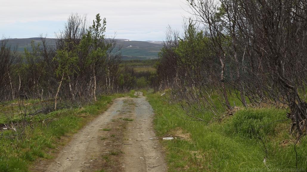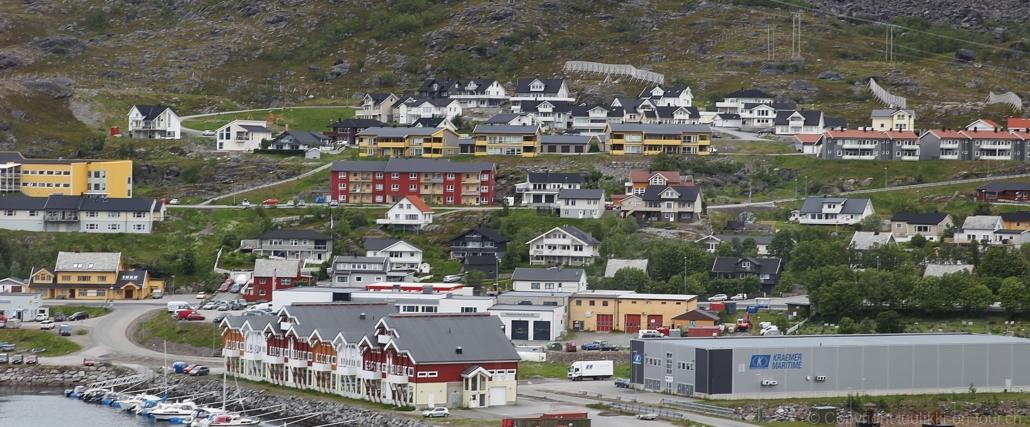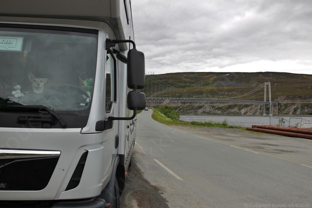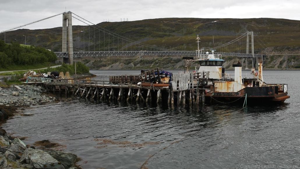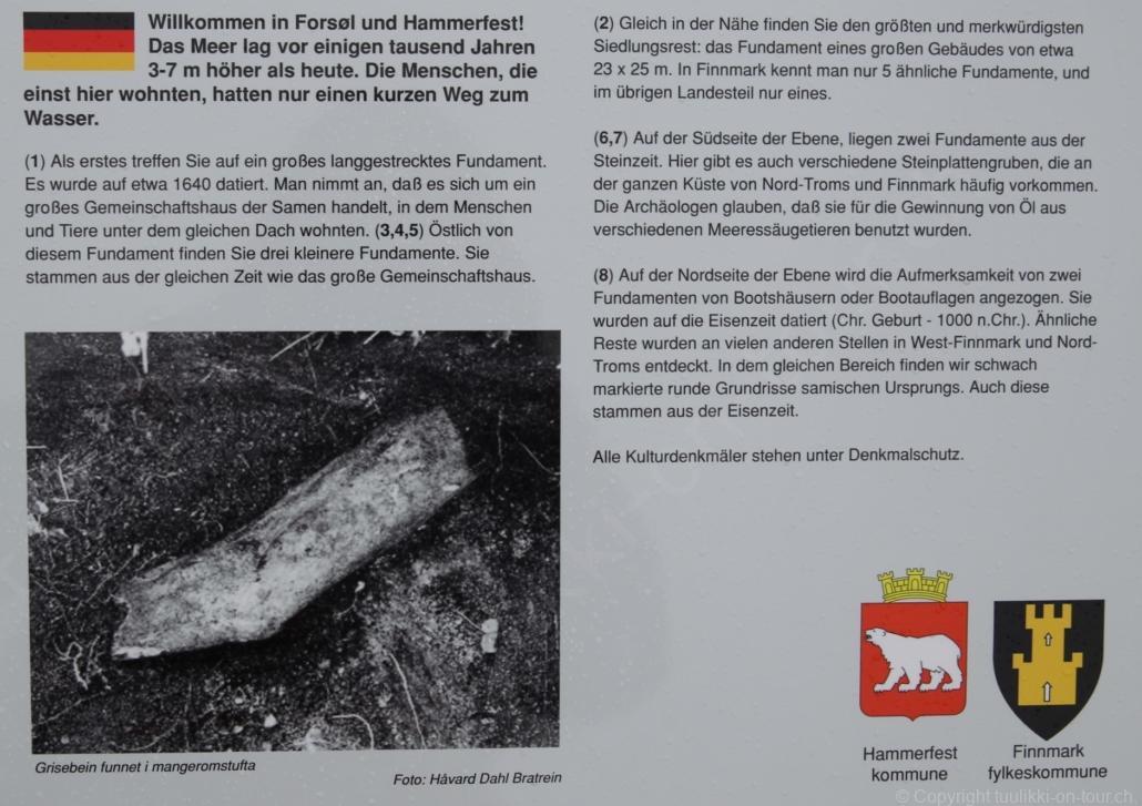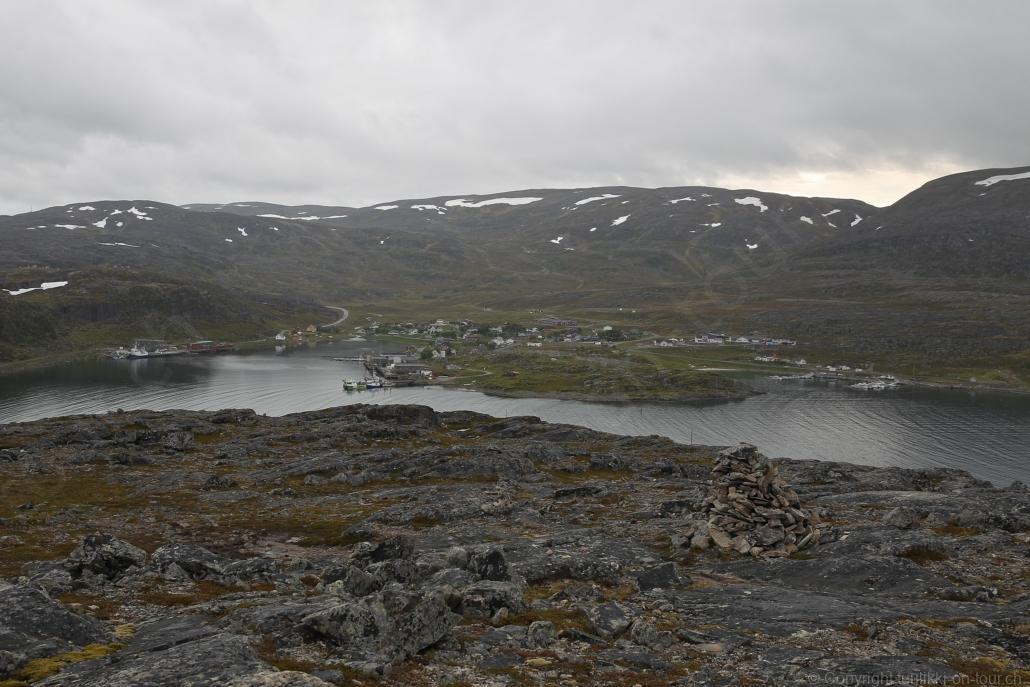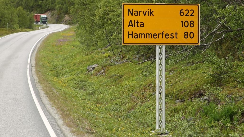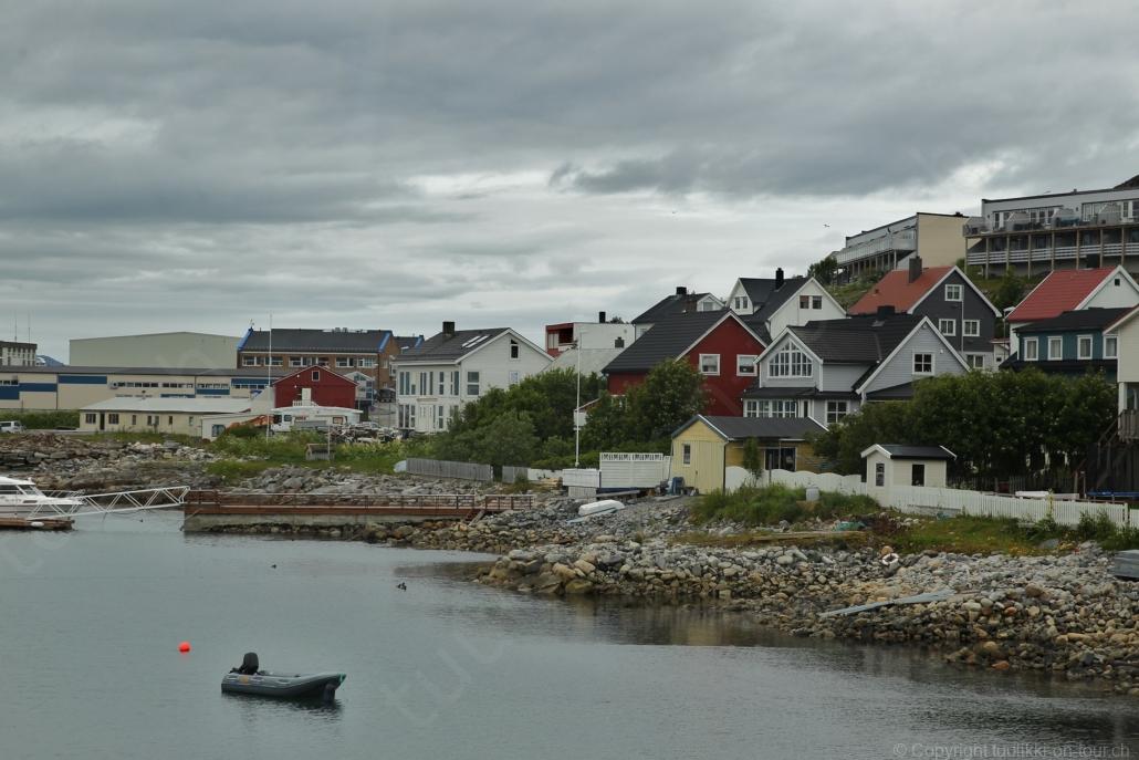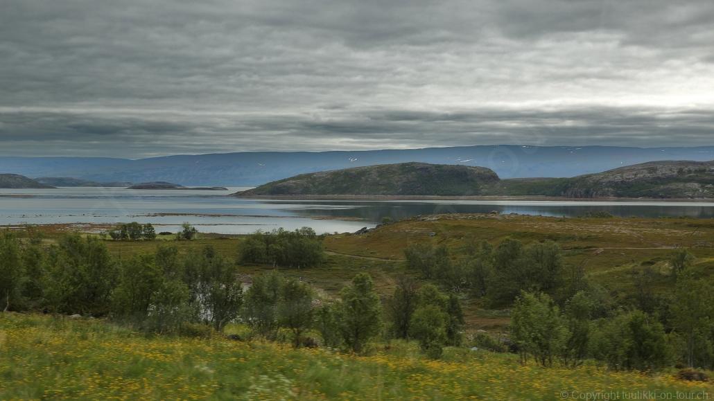 Ist das herrlich, so nah am Wasser zu wohnen und am Morgen als Erstes einen Strandspaziergang an der frischen Luft unternehmen zu können, dabei Muscheln zu finden, an kleinen herzigen Blümchen vorbeizukommen und immer einen Blick aufs ruhige Meer zu haben. Daran könnten wir uns als Bewohner eines Nichtanrainerstaats gewöhnen! Es ist bewölkt, warme 13°C und windstill. Aufgrund der Wetterprognosen der nächsten Tage entscheiden wir uns, heute zuerst Hammerfest anzufahren und das Nordkap resp. Havoysund auf anfangs Woche zu verschieben. In Lakselv kommen wir wieder auf die E6, wo es gemessen am Verkehr nur so von Wohnmobilen wimmelt, die wohl die meisten zum Nordkap wollen oder von dort herkommen. Wir folgen der E6 bis Olderfjord, wo wir unseren Anhänger stehen lassen und zweigen dann in Skaidi auf die 94. In Kvalsund überqueren wir die nördlichste und mit 575 m eine der längsten Hängebrücken, um auf die Insel Kvaloy und so nach Hammerfest, der Eisbärenstadt (Wappentier), zu kommen. Hier geht bis 26.7. die Sonne nicht unter, wenn sie denn scheint, denn an durchschnittlich 200 Tagen/Jr. soll es hier regnen. Dazu können wir aktuell nichts sagen, denn das Wetter hat sich gut gehalten, zwar bewölkt, aber hell und warm. Wir fahren durch die Stadt, sehen am Hafen zahlreiche Wohnmobile stehen, zu denen wir uns aber nicht gesellen wollen, also fahren wir weiter bis zum verschlossenen Tor zur Erdgasverflüssigungsanlage. Dann fahren wir den Hügel hoch, können von oben die Anlegestelle der Hurtigruten Schiffe erkennen, passieren ein grosses – nicht gerade anmächeliges – Neubauquartier und den Flughafen mit einer der kürzesten Start- und Landebahnen (880 m), die für den Linienflugbetrieb zugelassen sind, um nach ein paar weiteren Kilometern in Forsol, an der Nordküste der Insel zu ‚landen‘. Dort gibt’s einen Hafen mit Fischerbooten und einer Fischfabrik (ob die alle nur in der ‚Nacht‘ arbeiten, jedenfalls können wir niemanden entdecken, der einer Beschäftigung nachgeht). Von unserem Stellplatz gegenüber der Hafeneinfahrt aus, können wir beobachten, wie die Flut reinkommt und dann einem Bohlenweg zu mittelalterlichen Ausgrabungen und zu einem herrlichen Sandsträndchen folgen. Über die abgerundeten, z.T. bewachsenen Felsen sieht man einige Wege auf den Gipfel mit verschiedenen Gipfel-Steinhaufen. Einem solchen folgen wir fünf, bis wir zuoberst sind und auf alles herabsehen können. Zu unserem Pech sind unweit auch ein paar Rentiere zu sehen, womit der mühsame Abstieg besiegelt ist, denn statt mit uns runter, wollen die Hunde den Gehörnten nach, was wir natürlich zu verhindern wissen.