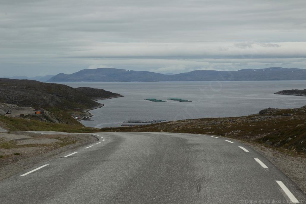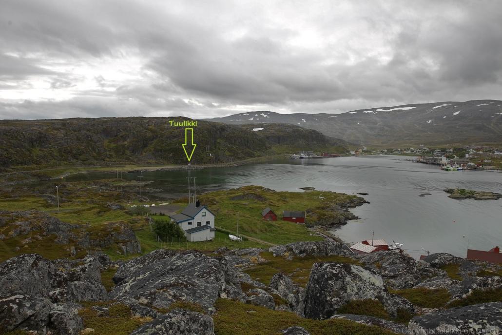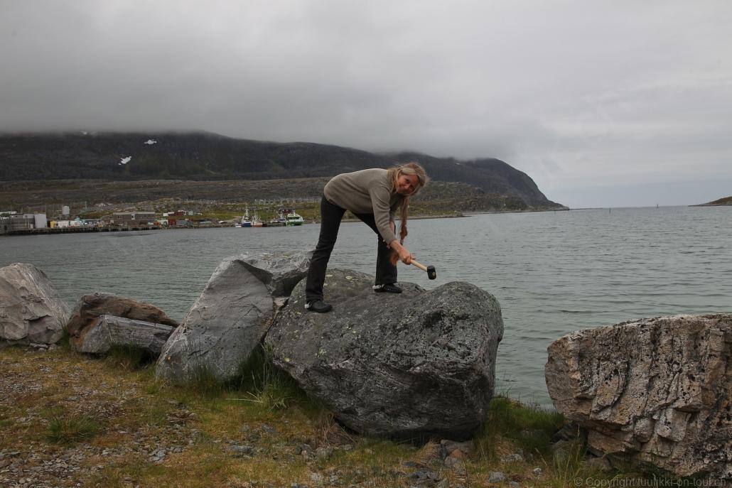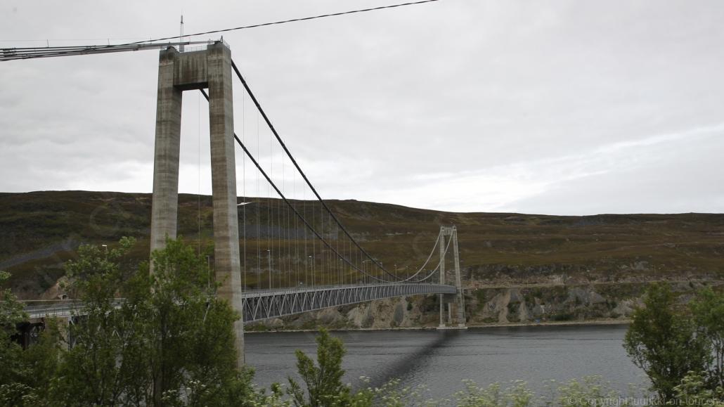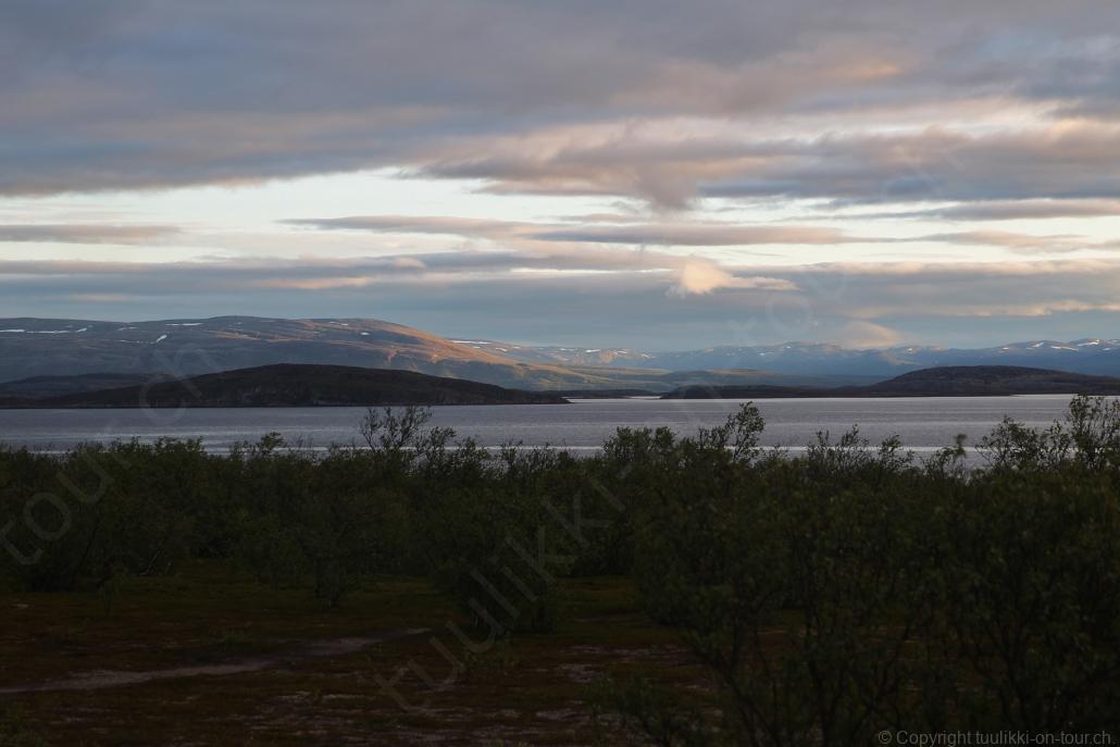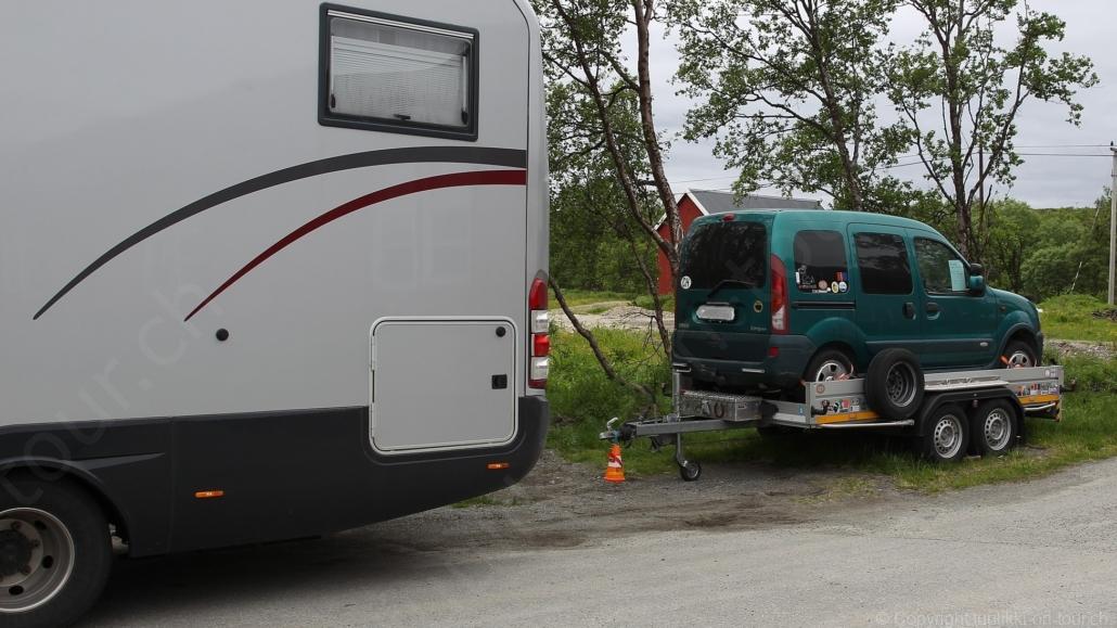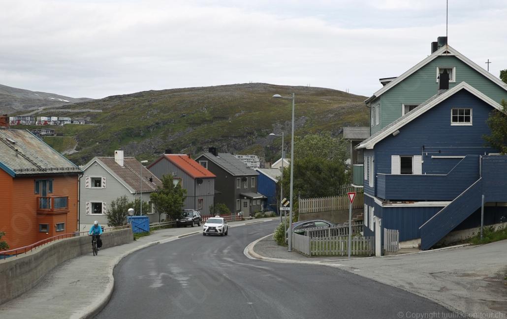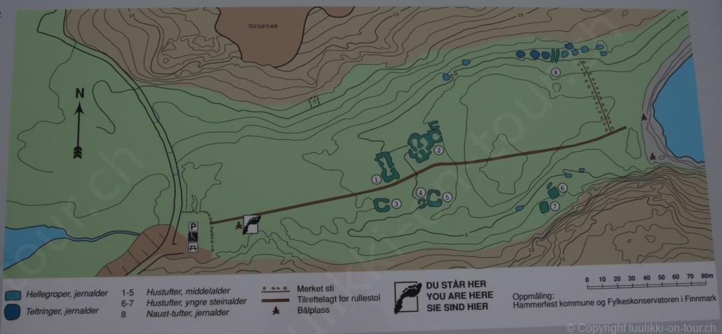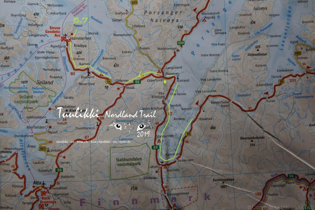 Ist das herrlich, so nah am Wasser zu wohnen und am Morgen als Erstes einen Strandspaziergang an der frischen Luft unternehmen zu können, dabei Muscheln zu finden, an kleinen herzigen Blümchen vorbeizukommen und immer einen Blick aufs ruhige Meer zu haben. Daran könnten wir uns als Bewohner eines Nichtanrainerstaats gewöhnen! Es ist bewölkt, warme 13°C und windstill. Aufgrund der Wetterprognosen der nächsten Tage entscheiden wir uns, heute zuerst Hammerfest anzufahren und das Nordkap resp. Havoysund auf anfangs Woche zu verschieben. In Lakselv kommen wir wieder auf die E6, wo es gemessen am Verkehr nur so von Wohnmobilen wimmelt, die wohl die meisten zum Nordkap wollen oder von dort herkommen. Wir folgen der E6 bis Olderfjord, wo wir unseren Anhänger stehen lassen und zweigen dann in Skaidi auf die 94. In Kvalsund überqueren wir die nördlichste und mit 575 m eine der längsten Hängebrücken, um auf die Insel Kvaloy und so nach Hammerfest, der Eisbärenstadt (Wappentier), zu kommen. Hier geht bis 26.7. die Sonne nicht unter, wenn sie denn scheint, denn an durchschnittlich 200 Tagen/Jr. soll es hier regnen. Dazu können wir aktuell nichts sagen, denn das Wetter hat sich gut gehalten, zwar bewölkt, aber hell und warm. Wir fahren durch die Stadt, sehen am Hafen zahlreiche Wohnmobile stehen, zu denen wir uns aber nicht gesellen wollen, also fahren wir weiter bis zum verschlossenen Tor zur Erdgasverflüssigungsanlage. Dann fahren wir den Hügel hoch, können von oben die Anlegestelle der Hurtigruten Schiffe erkennen, passieren ein grosses – nicht gerade anmächeliges – Neubauquartier und den Flughafen mit einer der kürzesten Start- und Landebahnen (880 m), die für den Linienflugbetrieb zugelassen sind, um nach ein paar weiteren Kilometern in Forsol, an der Nordküste der Insel zu ‚landen‘. Dort gibt’s einen Hafen mit Fischerbooten und einer Fischfabrik (ob die alle nur in der ‚Nacht‘ arbeiten, jedenfalls können wir niemanden entdecken, der einer Beschäftigung nachgeht). Von unserem Stellplatz gegenüber der Hafeneinfahrt aus, können wir beobachten, wie die Flut reinkommt und dann einem Bohlenweg zu mittelalterlichen Ausgrabungen und zu einem herrlichen Sandsträndchen folgen. Über die abgerundeten, z.T. bewachsenen Felsen sieht man einige Wege auf den Gipfel mit verschiedenen Gipfel-Steinhaufen. Einem solchen folgen wir fünf, bis wir zuoberst sind und auf alles herabsehen können. Zu unserem Pech sind unweit auch ein paar Rentiere zu sehen, womit der mühsame Abstieg besiegelt ist, denn statt mit uns runter, wollen die Hunde den Gehörnten nach, was wir natürlich zu verhindern wissen.