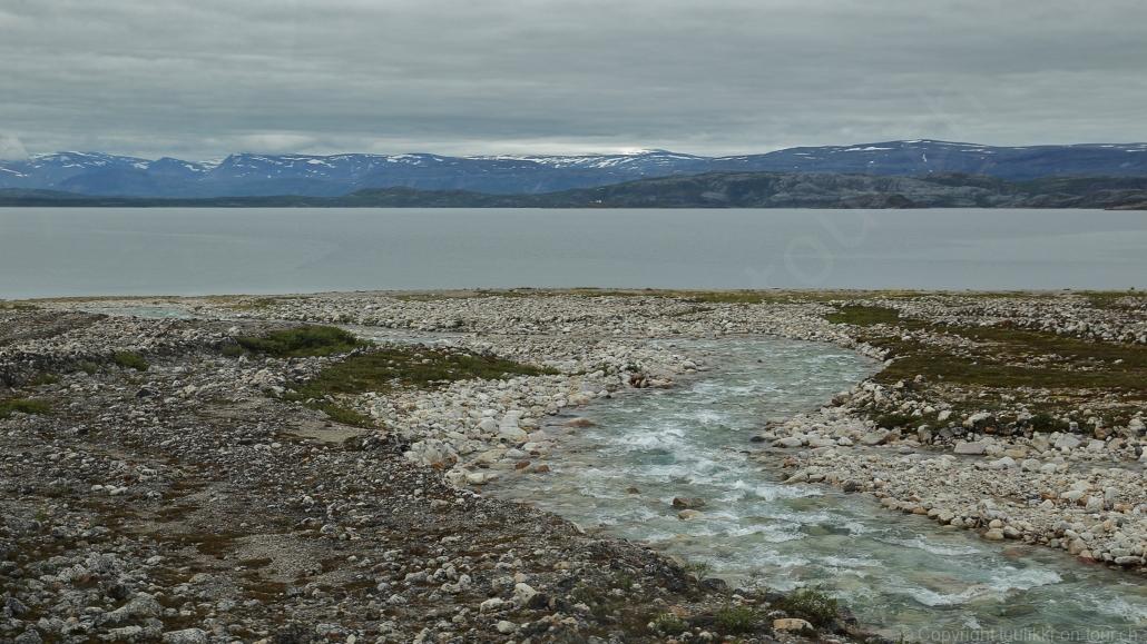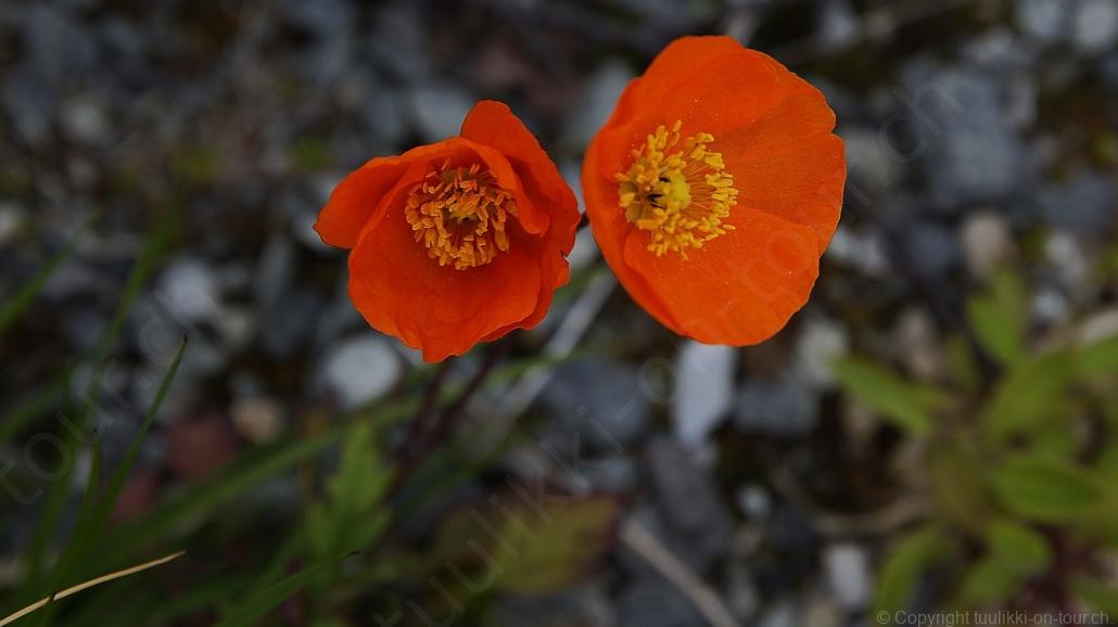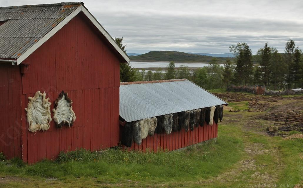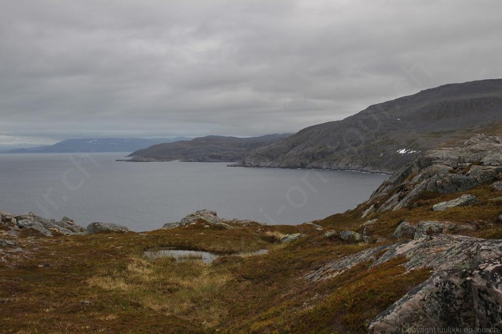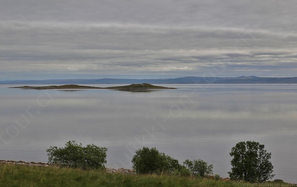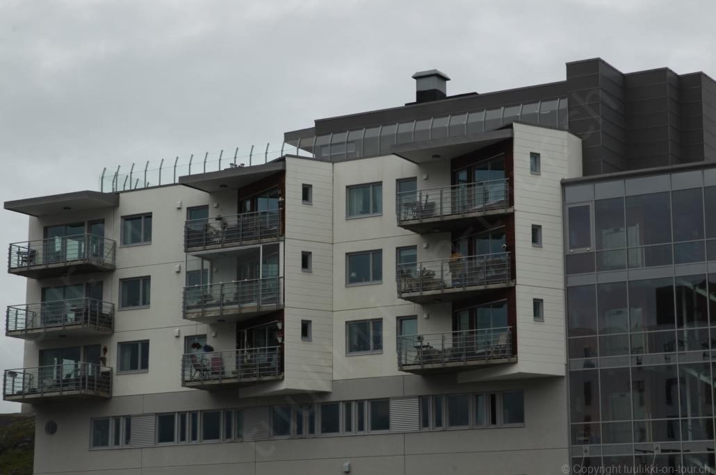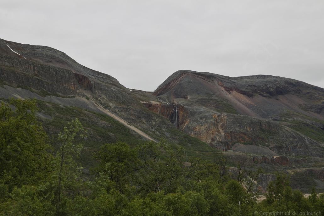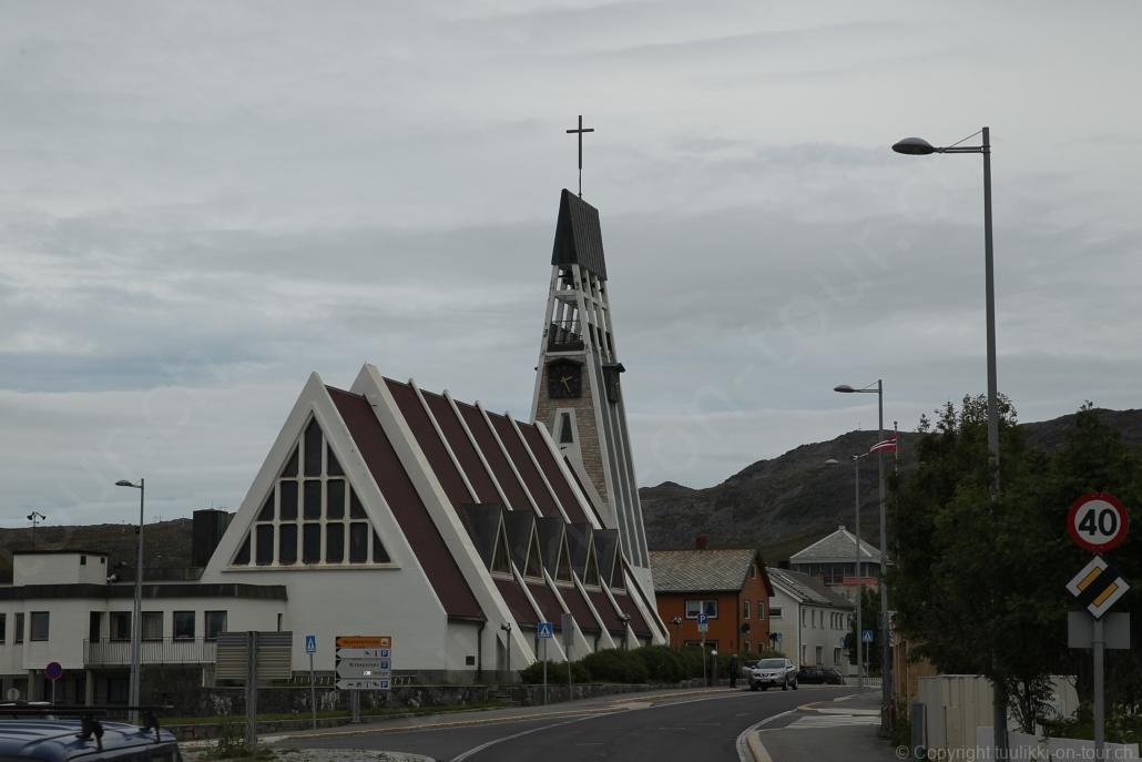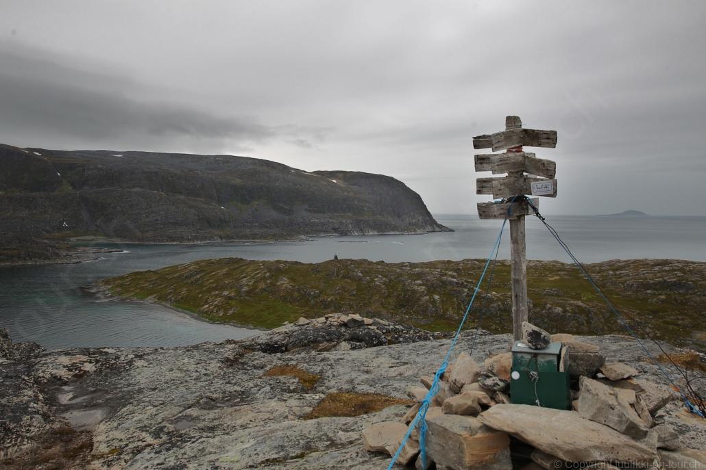 Ist das herrlich, so nah am Wasser zu wohnen und am Morgen als Erstes einen Strandspaziergang an der frischen Luft unternehmen zu können, dabei Muscheln zu finden, an kleinen herzigen Blümchen vorbeizukommen und immer einen Blick aufs ruhige Meer zu haben. Daran könnten wir uns als Bewohner eines Nichtanrainerstaats gewöhnen! Es ist bewölkt, warme 13°C und windstill. Aufgrund der Wetterprognosen der nächsten Tage entscheiden wir uns, heute zuerst Hammerfest anzufahren und das Nordkap resp. Havoysund auf anfangs Woche zu verschieben. In Lakselv kommen wir wieder auf die E6, wo es gemessen am Verkehr nur so von Wohnmobilen wimmelt, die wohl die meisten zum Nordkap wollen oder von dort herkommen. Wir folgen der E6 bis Olderfjord, wo wir unseren Anhänger stehen lassen und zweigen dann in Skaidi auf die 94. In Kvalsund überqueren wir die nördlichste und mit 575 m eine der längsten Hängebrücken, um auf die Insel Kvaloy und so nach Hammerfest, der Eisbärenstadt (Wappentier), zu kommen. Hier geht bis 26.7. die Sonne nicht unter, wenn sie denn scheint, denn an durchschnittlich 200 Tagen/Jr. soll es hier regnen. Dazu können wir aktuell nichts sagen, denn das Wetter hat sich gut gehalten, zwar bewölkt, aber hell und warm. Wir fahren durch die Stadt, sehen am Hafen zahlreiche Wohnmobile stehen, zu denen wir uns aber nicht gesellen wollen, also fahren wir weiter bis zum verschlossenen Tor zur Erdgasverflüssigungsanlage. Dann fahren wir den Hügel hoch, können von oben die Anlegestelle der Hurtigruten Schiffe erkennen, passieren ein grosses – nicht gerade anmächeliges – Neubauquartier und den Flughafen mit einer der kürzesten Start- und Landebahnen (880 m), die für den Linienflugbetrieb zugelassen sind, um nach ein paar weiteren Kilometern in Forsol, an der Nordküste der Insel zu ‚landen‘. Dort gibt’s einen Hafen mit Fischerbooten und einer Fischfabrik (ob die alle nur in der ‚Nacht‘ arbeiten, jedenfalls können wir niemanden entdecken, der einer Beschäftigung nachgeht). Von unserem Stellplatz gegenüber der Hafeneinfahrt aus, können wir beobachten, wie die Flut reinkommt und dann einem Bohlenweg zu mittelalterlichen Ausgrabungen und zu einem herrlichen Sandsträndchen folgen. Über die abgerundeten, z.T. bewachsenen Felsen sieht man einige Wege auf den Gipfel mit verschiedenen Gipfel-Steinhaufen. Einem solchen folgen wir fünf, bis wir zuoberst sind und auf alles herabsehen können. Zu unserem Pech sind unweit auch ein paar Rentiere zu sehen, womit der mühsame Abstieg besiegelt ist, denn statt mit uns runter, wollen die Hunde den Gehörnten nach, was wir natürlich zu verhindern wissen.