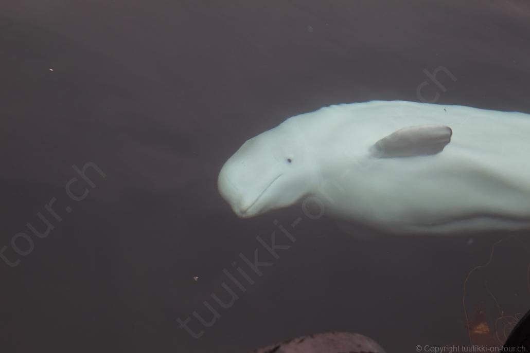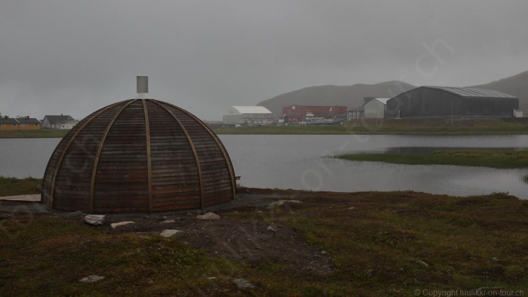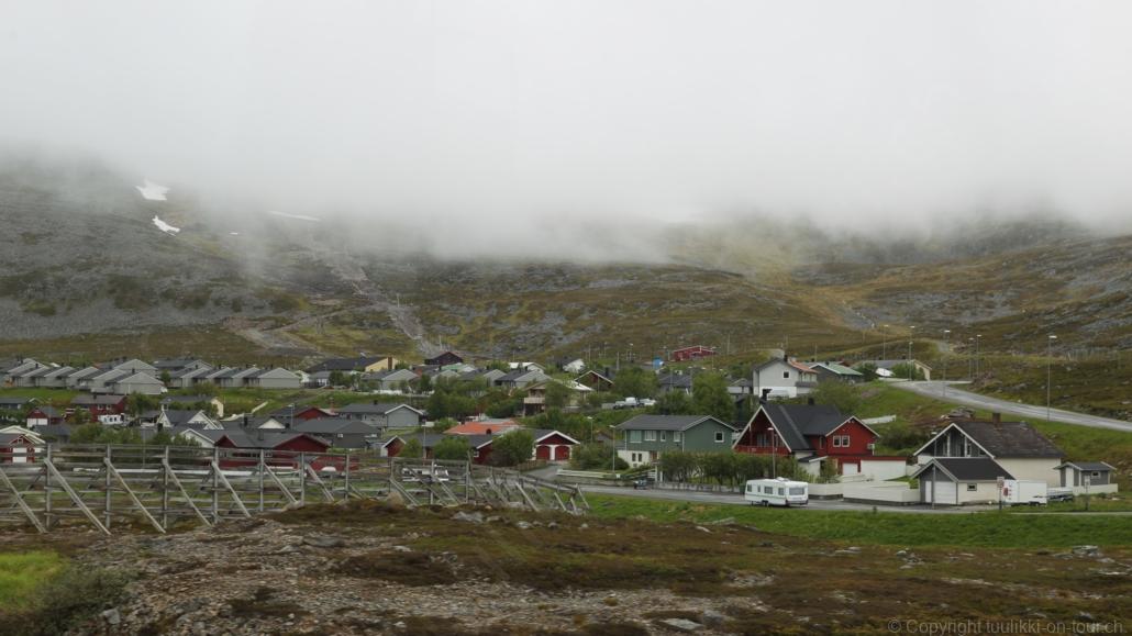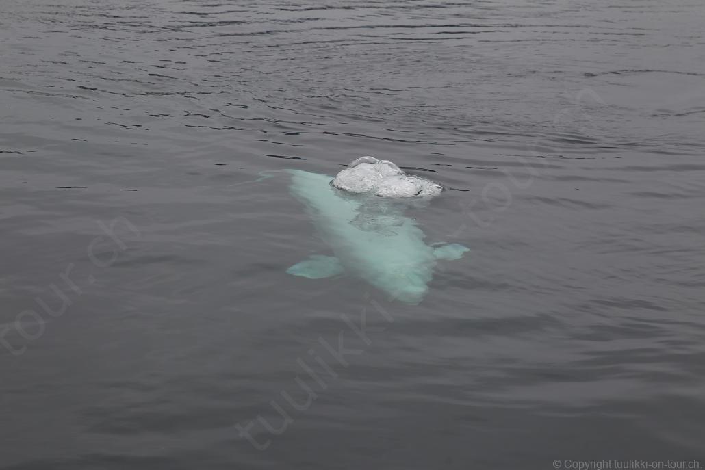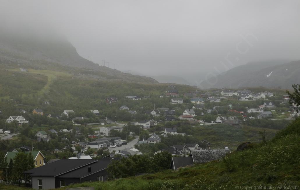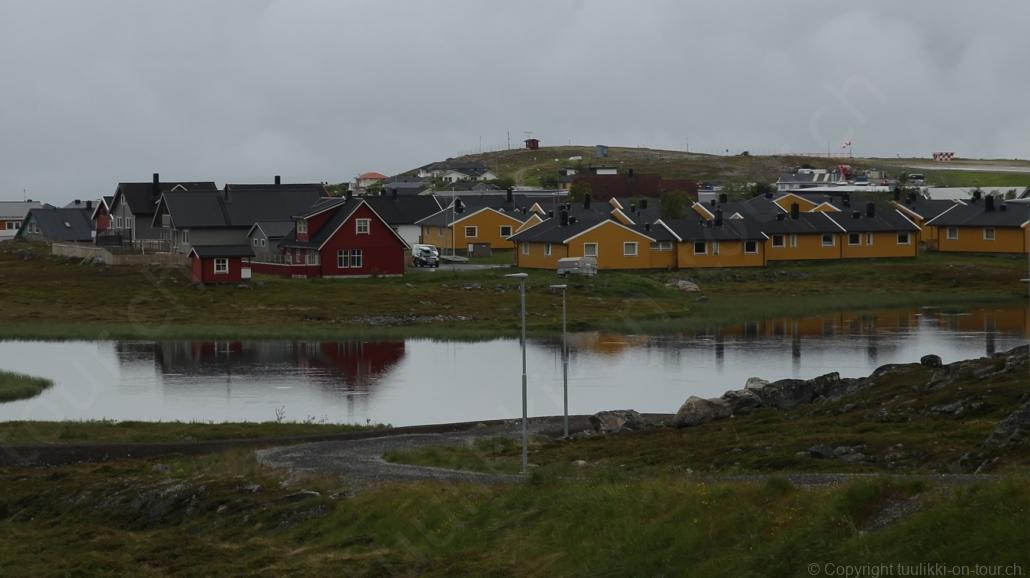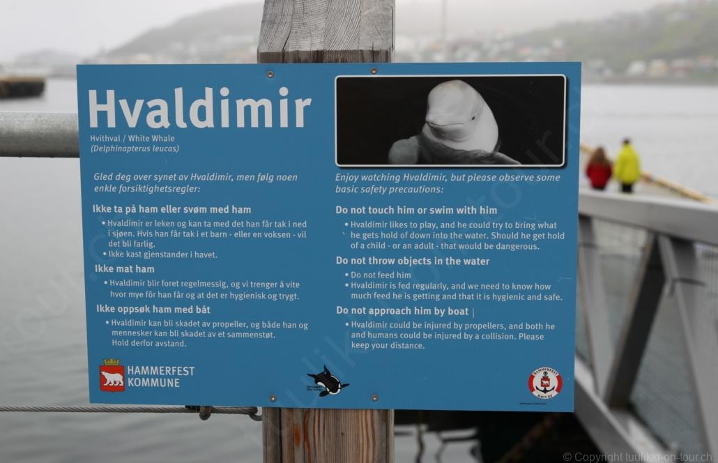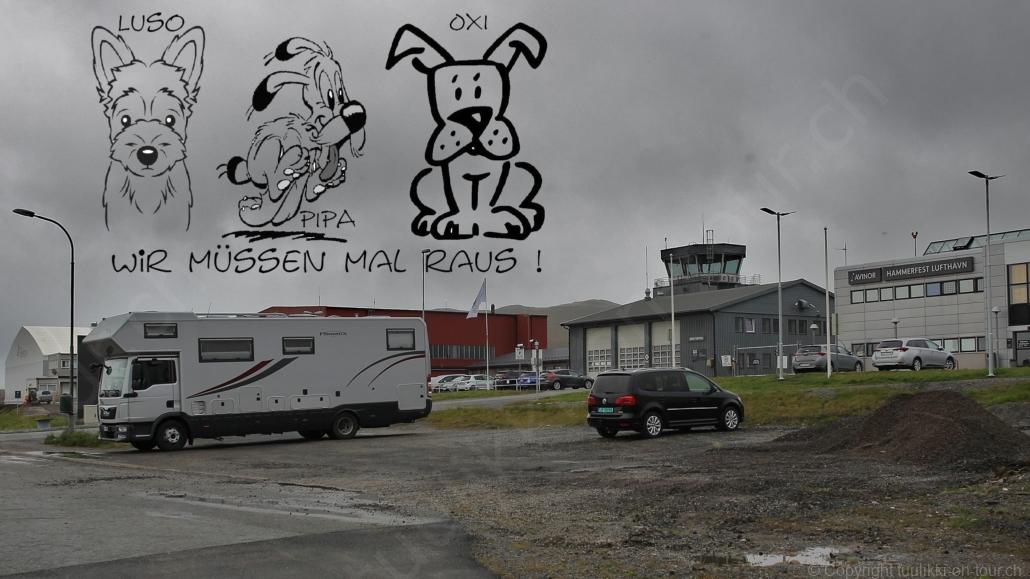 Heute ist ein Putz- und Einkaufstag, was immer viel Zeit in Anspruch nimmt. Wir fahren also von Forsol zurück nach Hammerfest und finden dort überraschend im Europris überzeugende Angebote für die Hunde. Pipa hat sich während einer gewissen Zeit den Spass daraus gemacht, Luso an der Leine zu führen. Das ging so, dass sie sich in die Leine von Luso verbiss und ihn daran herumzerrte. Trotz jeweiliger Intervention hat sie es geschafft, die Leine tüchtig zu schwächen; und hier haben wir diese nun ersetzt, zusätzlich gleich neue ‚Gstältli‘ angepasst, kurz eine ganze Garderobe mal drei erstanden! Danach ist schon wieder Zeit für den Mittagsspaziergang, den wir beim Flugplatz, ums Seelein herum und im Neubauquartier vorbei machen. Die sich kurz etwas angehobene Wolken-Nebel-Decke senkt sich wieder und man hat manchmal fast das Gefühl, der Himmel parkiere demnächst auf dem Kopf. Am Quai, beim WoMo-Platz stellen wir unser Gefährt dann ab, lassen den Hunden ihren Mittagsschlaf und machen uns zu Fuss durch das Städtchen. Für die Abfahrt der Hurtigruten sind wir eine Stunde zu spät, dafür können wir einen weissen Belugawal beobachten, der ganz entspannt im Hafenbecken schwimmt und sich offenbar dem Publikum präsentiert. Hin und her, mal auf dem Rücken, mal seitwärts, dann kommt er an die Oberfläche und öffnet sein Luftloch, um gleich danach elegant mit nur einer kurzen Schwanzflossen-Bewegung wieder zu tauchen. Er ist seit zwei Monaten Gast hier und wird von Fachleuten gefüttert, wieso er auch schon einen Namen erhalten hat: Hvaldimir. Über ihn wurde schon in den Nachrichten berichtet und vermutet, es sei ein Spionagewal und stamme von der russischen Kolahalbinsel. In der Stadt selbst scheint es nicht gut zu laufen, es sind viele Geschäftslokale leer, viele Häuser sehr mitgenommen und ungepflegt; nur gerade in der Hafengegend, wo täglich 2x die Hurtigruten anlegen schaut es besser aus. Natürlich gehört das obligate Foto mit den Eisbären vor dem Rathaus zum Pflicht-Klick; obwohl sich die Stadt aktuell überlegt, sich von Eisbären- in Belugawal-Stadt umzubenennen. Es gibt für uns keinen Grund, länger zu bleiben, also fahren wir die 60 km bis Skaidi auf der ‚94‘ , dann auf die E6 zurück und beziehen kurz vor Olderfjord im Birkenwald ‚Stellung‘. Unter den Biken blühen kleinste gelbe Stiefmütterchen, und zwar grosse Parzellen voll, soooo schön!