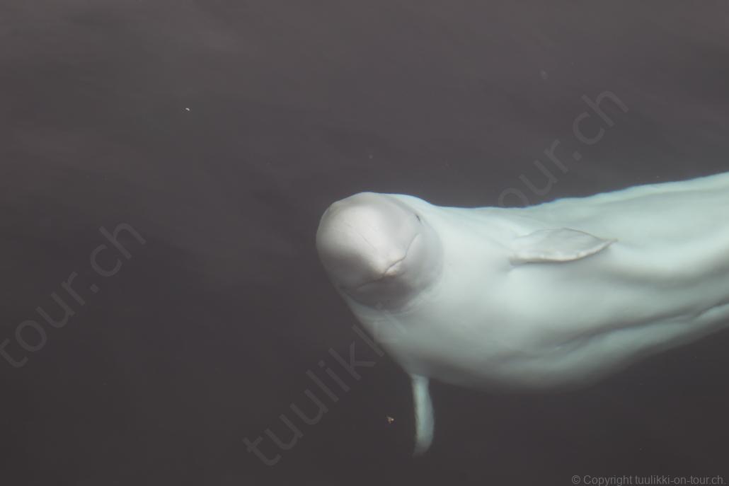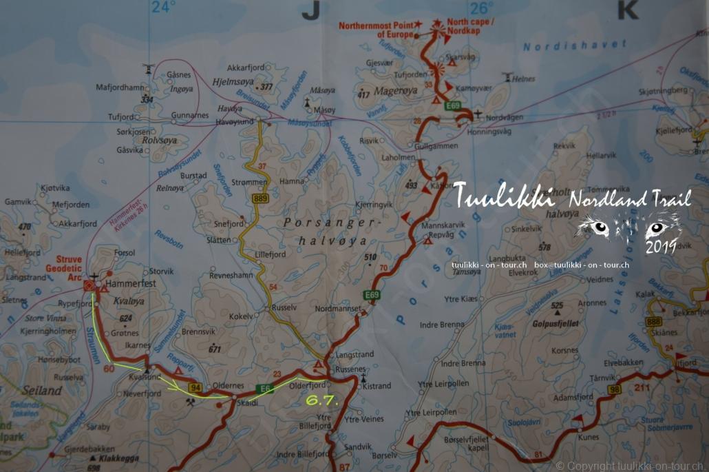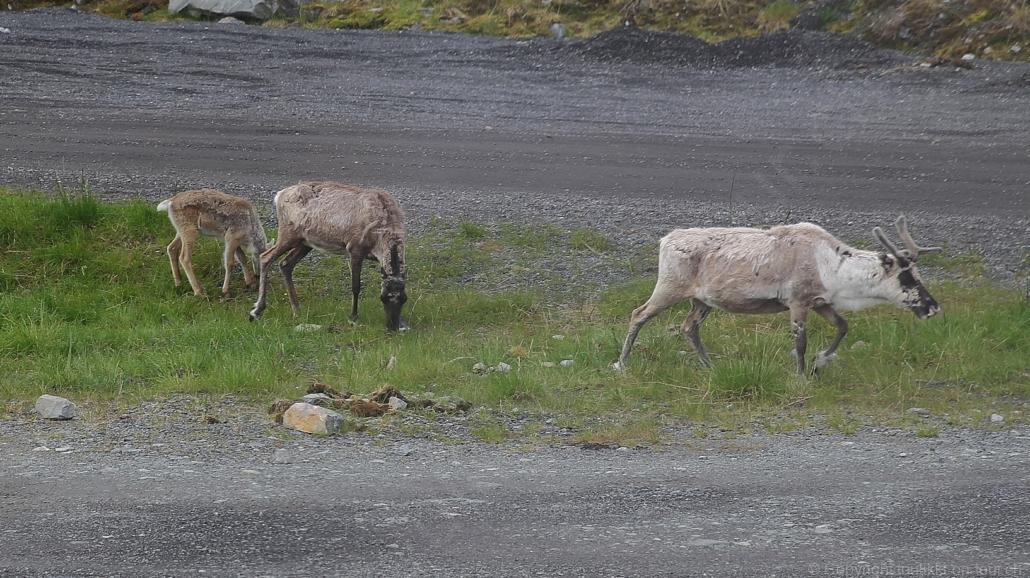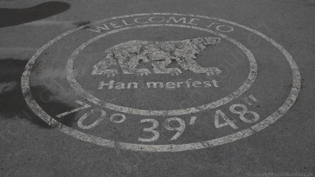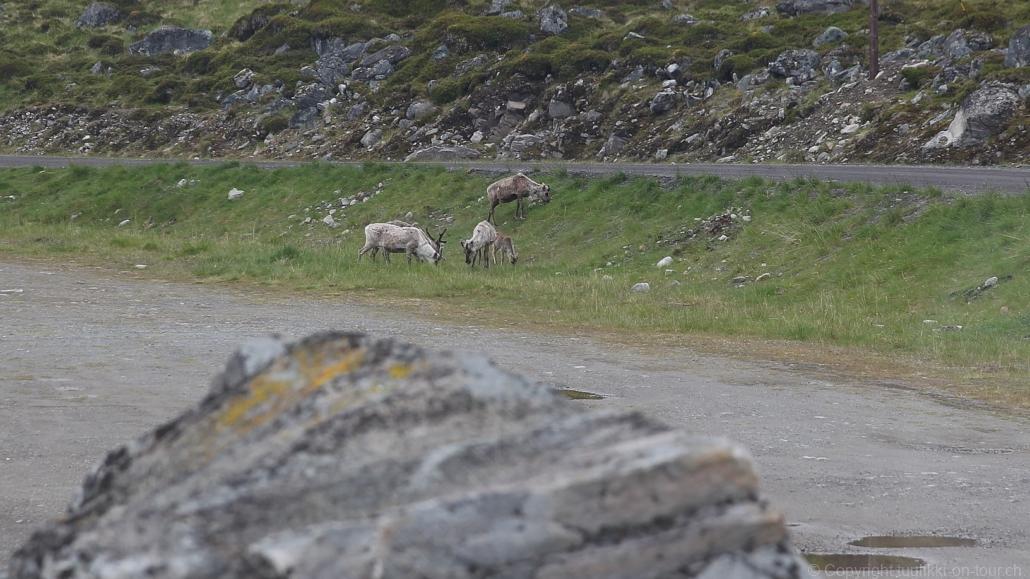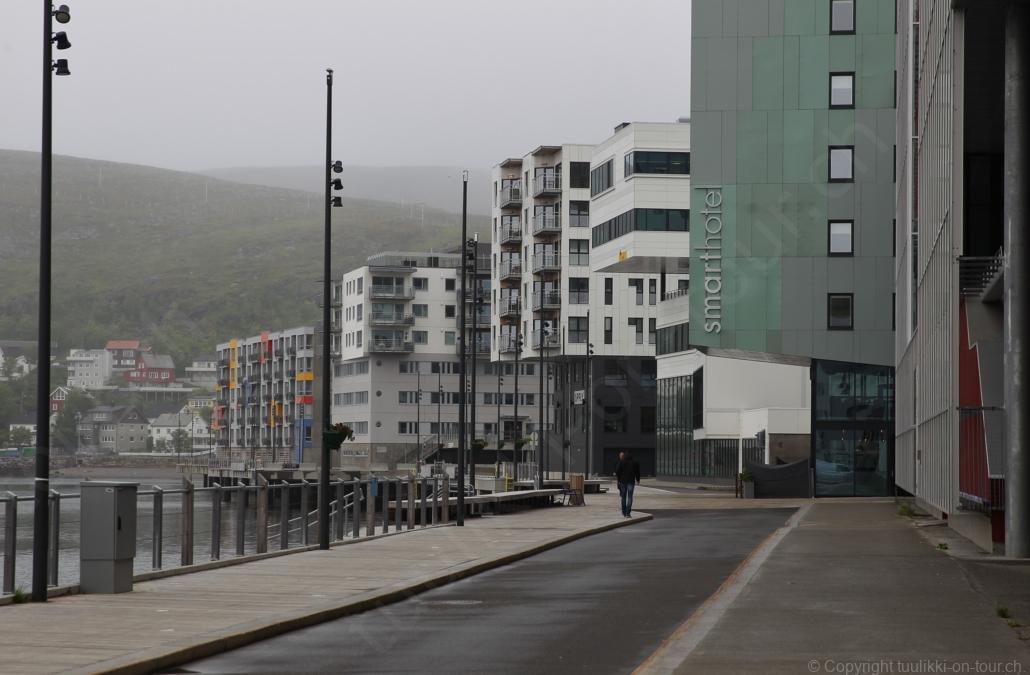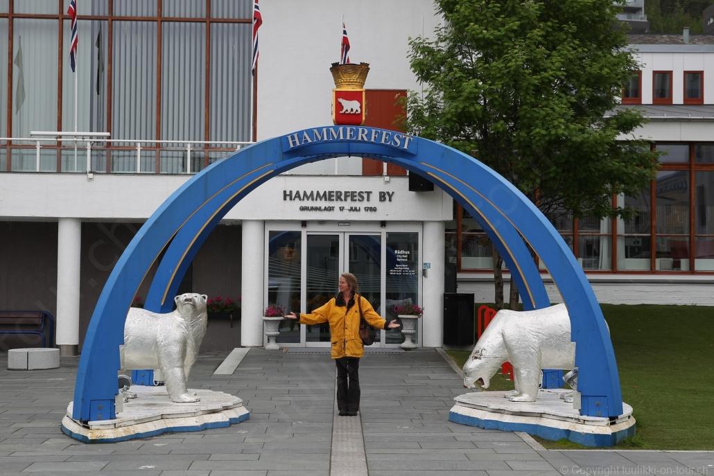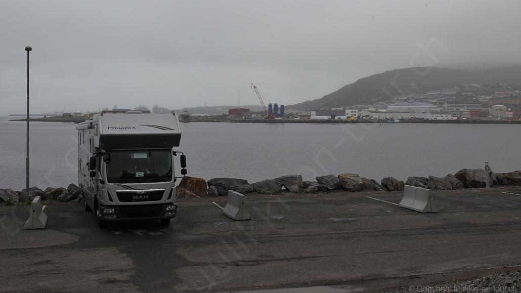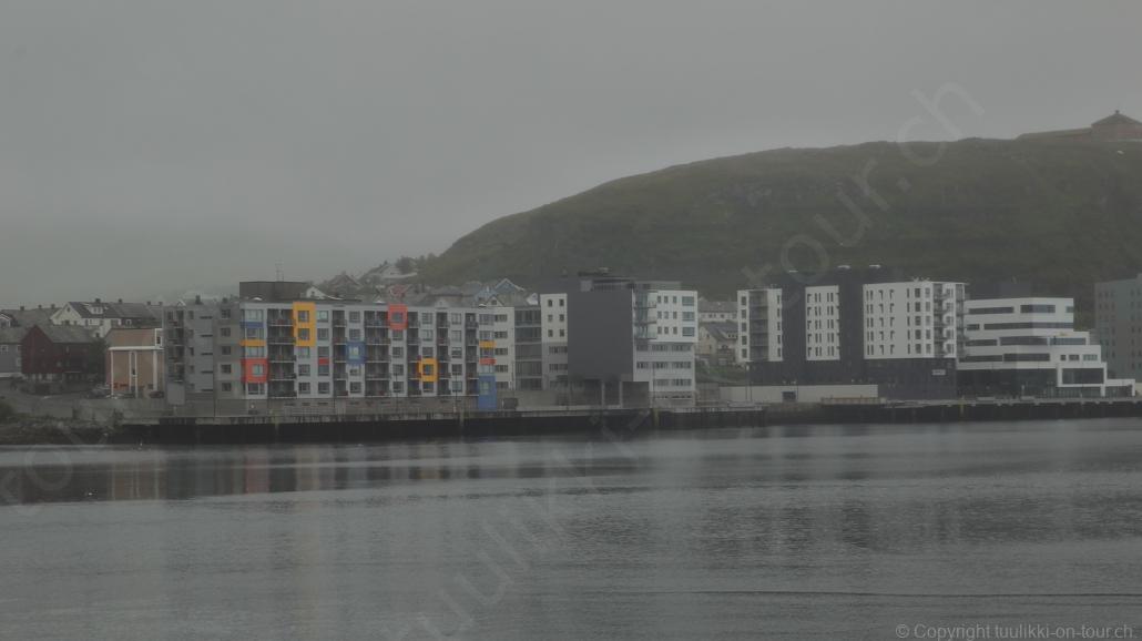 Heute ist ein Putz- und Einkaufstag, was immer viel Zeit in Anspruch nimmt. Wir fahren also von Forsol zurück nach Hammerfest und finden dort überraschend im Europris überzeugende Angebote für die Hunde. Pipa hat sich während einer gewissen Zeit den Spass daraus gemacht, Luso an der Leine zu führen. Das ging so, dass sie sich in die Leine von Luso verbiss und ihn daran herumzerrte. Trotz jeweiliger Intervention hat sie es geschafft, die Leine tüchtig zu schwächen; und hier haben wir diese nun ersetzt, zusätzlich gleich neue ‚Gstältli‘ angepasst, kurz eine ganze Garderobe mal drei erstanden! Danach ist schon wieder Zeit für den Mittagsspaziergang, den wir beim Flugplatz, ums Seelein herum und im Neubauquartier vorbei machen. Die sich kurz etwas angehobene Wolken-Nebel-Decke senkt sich wieder und man hat manchmal fast das Gefühl, der Himmel parkiere demnächst auf dem Kopf. Am Quai, beim WoMo-Platz stellen wir unser Gefährt dann ab, lassen den Hunden ihren Mittagsschlaf und machen uns zu Fuss durch das Städtchen. Für die Abfahrt der Hurtigruten sind wir eine Stunde zu spät, dafür können wir einen weissen Belugawal beobachten, der ganz entspannt im Hafenbecken schwimmt und sich offenbar dem Publikum präsentiert. Hin und her, mal auf dem Rücken, mal seitwärts, dann kommt er an die Oberfläche und öffnet sein Luftloch, um gleich danach elegant mit nur einer kurzen Schwanzflossen-Bewegung wieder zu tauchen. Er ist seit zwei Monaten Gast hier und wird von Fachleuten gefüttert, wieso er auch schon einen Namen erhalten hat: Hvaldimir. Über ihn wurde schon in den Nachrichten berichtet und vermutet, es sei ein Spionagewal und stamme von der russischen Kolahalbinsel. In der Stadt selbst scheint es nicht gut zu laufen, es sind viele Geschäftslokale leer, viele Häuser sehr mitgenommen und ungepflegt; nur gerade in der Hafengegend, wo täglich 2x die Hurtigruten anlegen schaut es besser aus. Natürlich gehört das obligate Foto mit den Eisbären vor dem Rathaus zum Pflicht-Klick; obwohl sich die Stadt aktuell überlegt, sich von Eisbären- in Belugawal-Stadt umzubenennen. Es gibt für uns keinen Grund, länger zu bleiben, also fahren wir die 60 km bis Skaidi auf der ‚94‘ , dann auf die E6 zurück und beziehen kurz vor Olderfjord im Birkenwald ‚Stellung‘. Unter den Biken blühen kleinste gelbe Stiefmütterchen, und zwar grosse Parzellen voll, soooo schön!