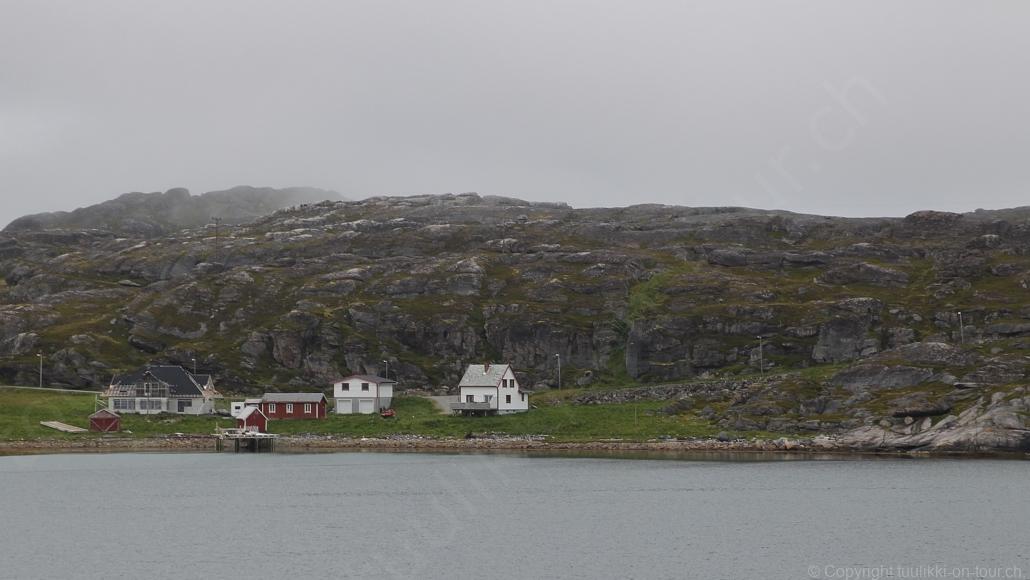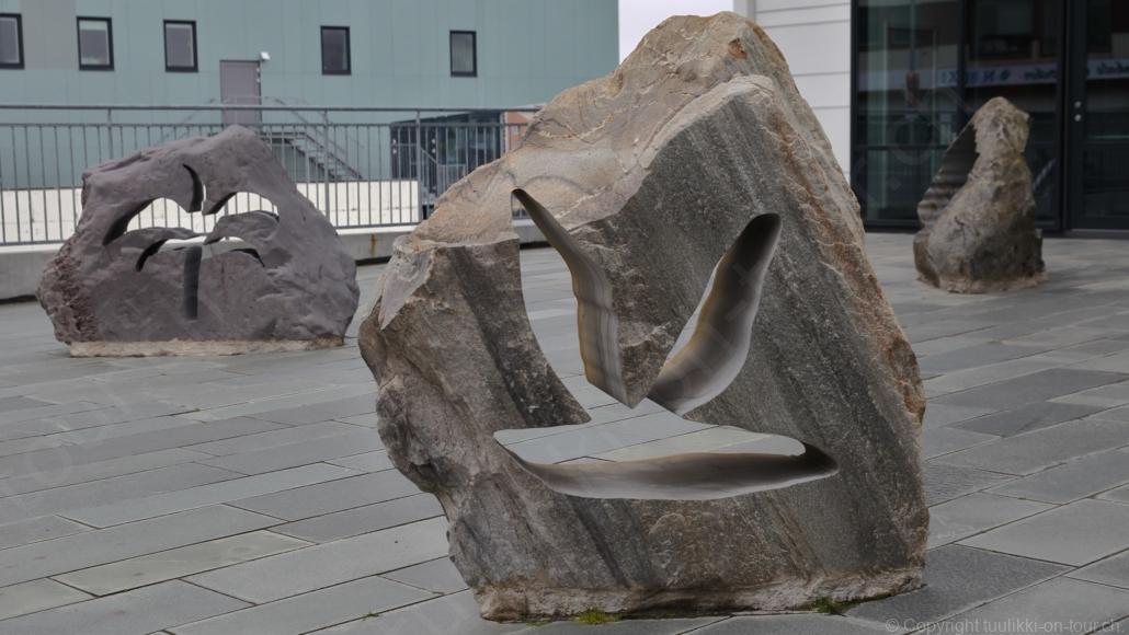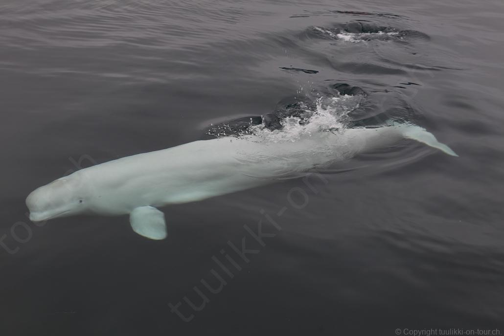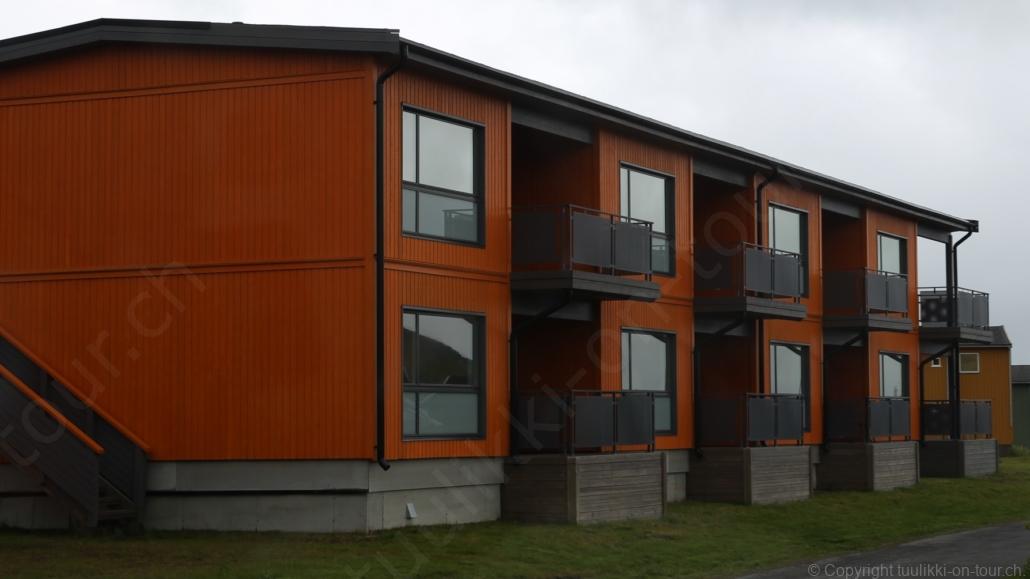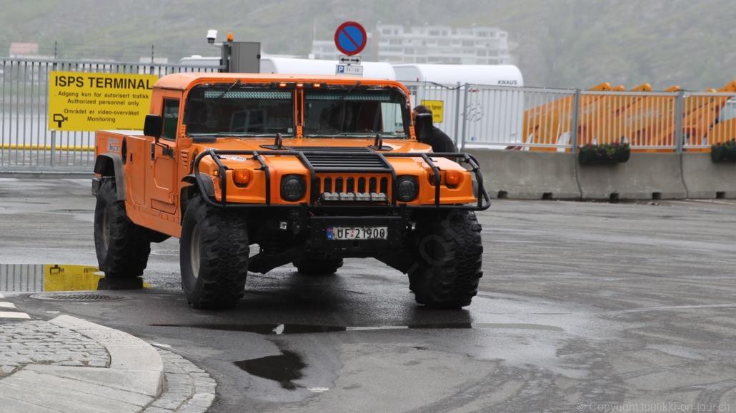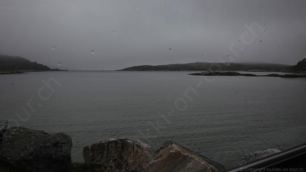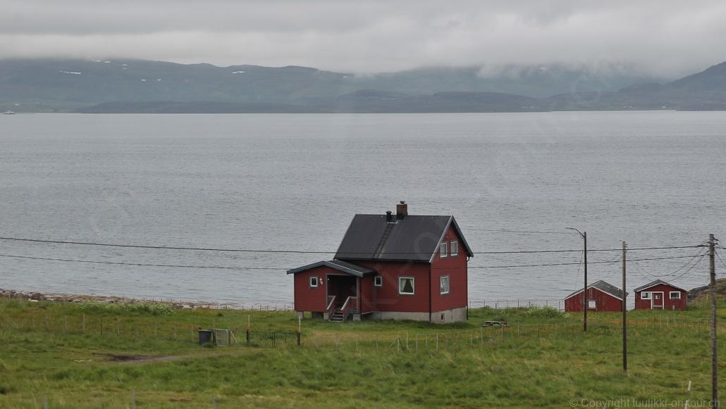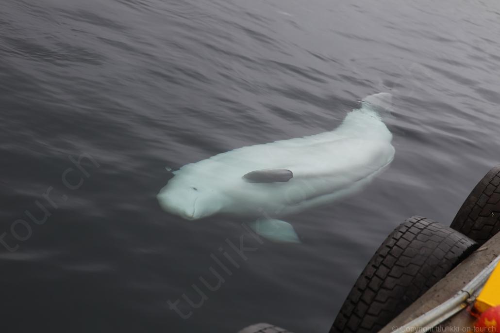 Heute ist ein Putz- und Einkaufstag, was immer viel Zeit in Anspruch nimmt. Wir fahren also von Forsol zurück nach Hammerfest und finden dort überraschend im Europris überzeugende Angebote für die Hunde. Pipa hat sich während einer gewissen Zeit den Spass daraus gemacht, Luso an der Leine zu führen. Das ging so, dass sie sich in die Leine von Luso verbiss und ihn daran herumzerrte. Trotz jeweiliger Intervention hat sie es geschafft, die Leine tüchtig zu schwächen; und hier haben wir diese nun ersetzt, zusätzlich gleich neue ‚Gstältli‘ angepasst, kurz eine ganze Garderobe mal drei erstanden! Danach ist schon wieder Zeit für den Mittagsspaziergang, den wir beim Flugplatz, ums Seelein herum und im Neubauquartier vorbei machen. Die sich kurz etwas angehobene Wolken-Nebel-Decke senkt sich wieder und man hat manchmal fast das Gefühl, der Himmel parkiere demnächst auf dem Kopf. Am Quai, beim WoMo-Platz stellen wir unser Gefährt dann ab, lassen den Hunden ihren Mittagsschlaf und machen uns zu Fuss durch das Städtchen. Für die Abfahrt der Hurtigruten sind wir eine Stunde zu spät, dafür können wir einen weissen Belugawal beobachten, der ganz entspannt im Hafenbecken schwimmt und sich offenbar dem Publikum präsentiert. Hin und her, mal auf dem Rücken, mal seitwärts, dann kommt er an die Oberfläche und öffnet sein Luftloch, um gleich danach elegant mit nur einer kurzen Schwanzflossen-Bewegung wieder zu tauchen. Er ist seit zwei Monaten Gast hier und wird von Fachleuten gefüttert, wieso er auch schon einen Namen erhalten hat: Hvaldimir. Über ihn wurde schon in den Nachrichten berichtet und vermutet, es sei ein Spionagewal und stamme von der russischen Kolahalbinsel. In der Stadt selbst scheint es nicht gut zu laufen, es sind viele Geschäftslokale leer, viele Häuser sehr mitgenommen und ungepflegt; nur gerade in der Hafengegend, wo täglich 2x die Hurtigruten anlegen schaut es besser aus. Natürlich gehört das obligate Foto mit den Eisbären vor dem Rathaus zum Pflicht-Klick; obwohl sich die Stadt aktuell überlegt, sich von Eisbären- in Belugawal-Stadt umzubenennen. Es gibt für uns keinen Grund, länger zu bleiben, also fahren wir die 60 km bis Skaidi auf der ‚94‘ , dann auf die E6 zurück und beziehen kurz vor Olderfjord im Birkenwald ‚Stellung‘. Unter den Biken blühen kleinste gelbe Stiefmütterchen, und zwar grosse Parzellen voll, soooo schön!