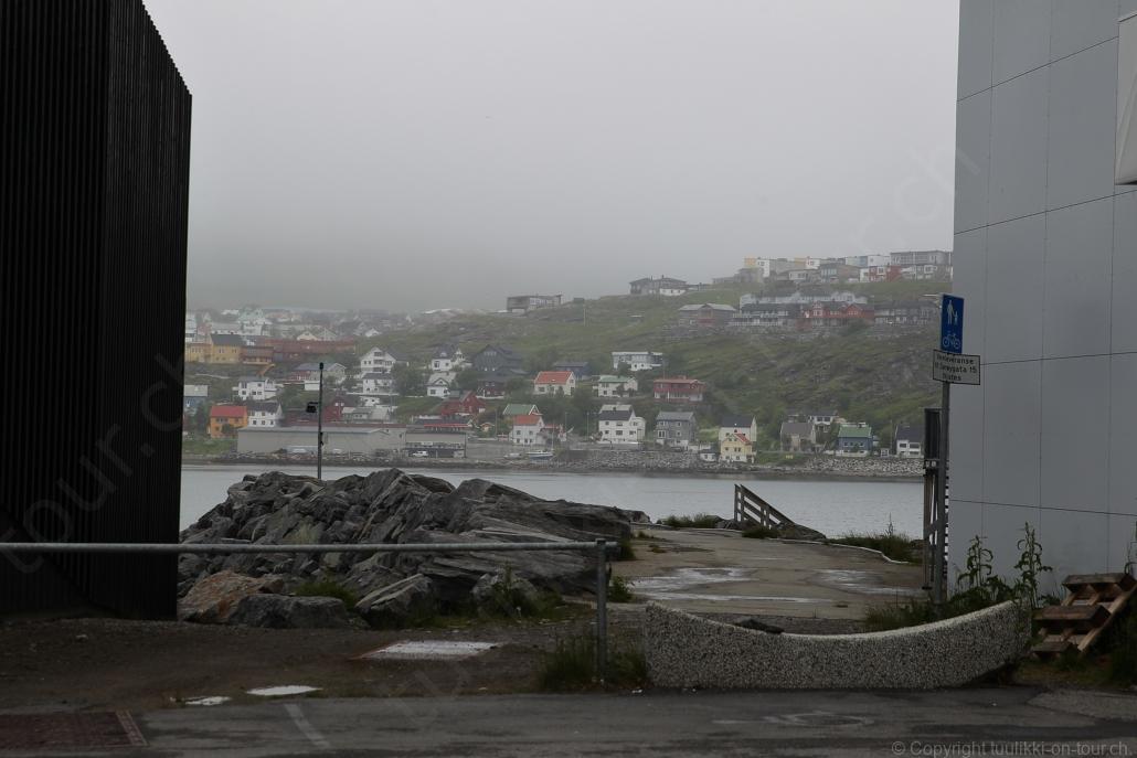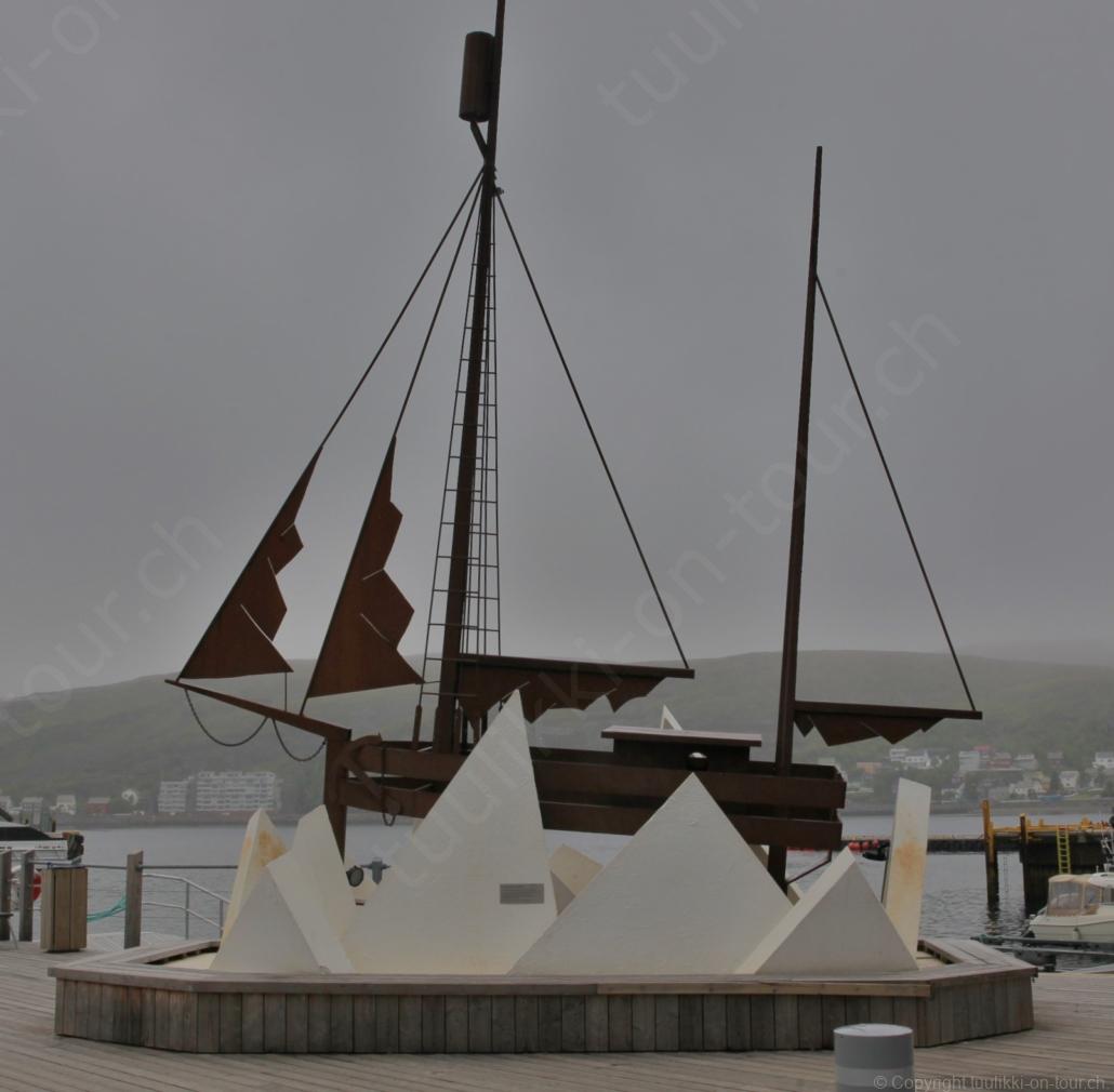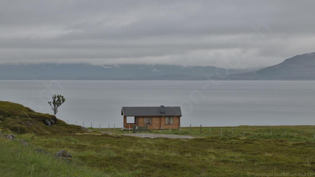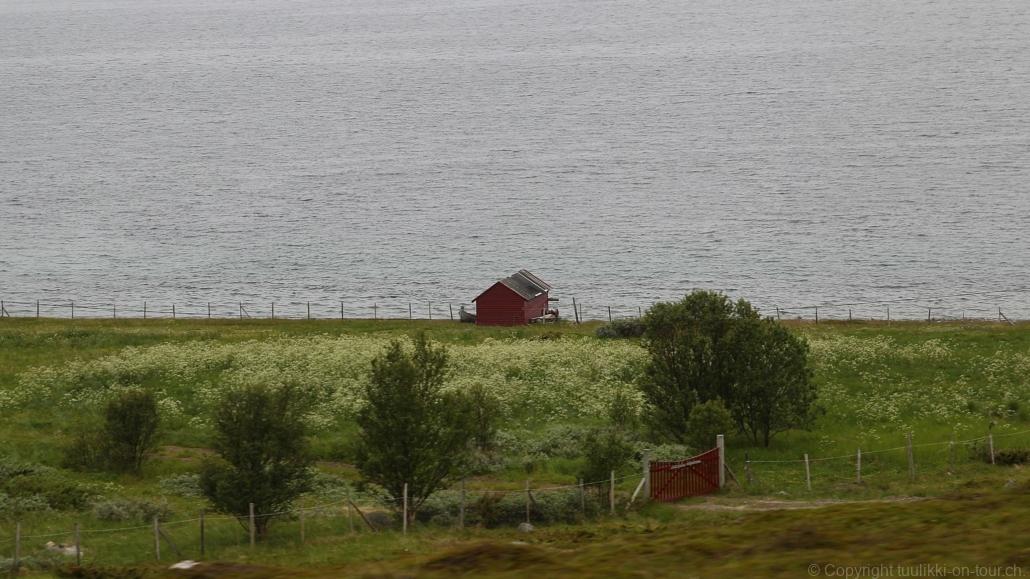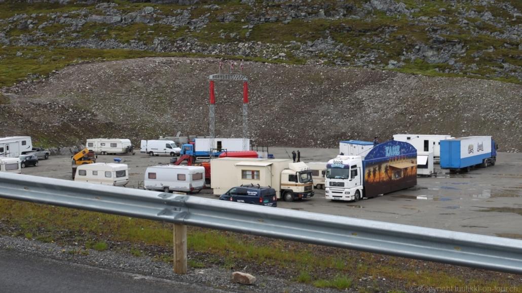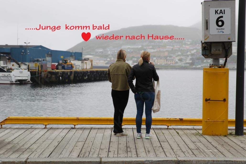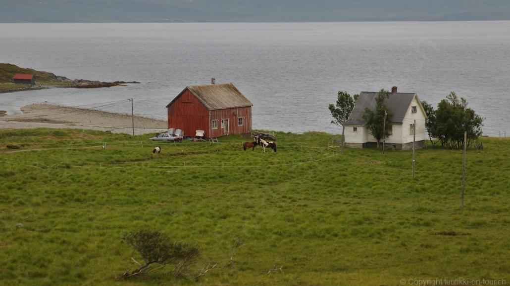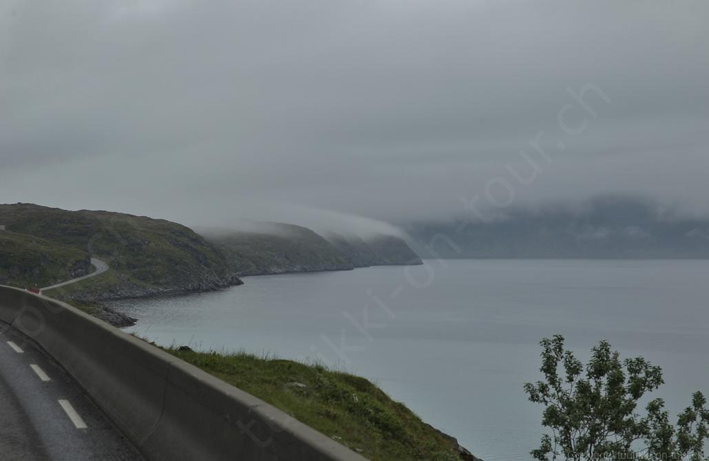 Heute ist ein Putz- und Einkaufstag, was immer viel Zeit in Anspruch nimmt. Wir fahren also von Forsol zurück nach Hammerfest und finden dort überraschend im Europris überzeugende Angebote für die Hunde. Pipa hat sich während einer gewissen Zeit den Spass daraus gemacht, Luso an der Leine zu führen. Das ging so, dass sie sich in die Leine von Luso verbiss und ihn daran herumzerrte. Trotz jeweiliger Intervention hat sie es geschafft, die Leine tüchtig zu schwächen; und hier haben wir diese nun ersetzt, zusätzlich gleich neue ‚Gstältli‘ angepasst, kurz eine ganze Garderobe mal drei erstanden! Danach ist schon wieder Zeit für den Mittagsspaziergang, den wir beim Flugplatz, ums Seelein herum und im Neubauquartier vorbei machen. Die sich kurz etwas angehobene Wolken-Nebel-Decke senkt sich wieder und man hat manchmal fast das Gefühl, der Himmel parkiere demnächst auf dem Kopf. Am Quai, beim WoMo-Platz stellen wir unser Gefährt dann ab, lassen den Hunden ihren Mittagsschlaf und machen uns zu Fuss durch das Städtchen. Für die Abfahrt der Hurtigruten sind wir eine Stunde zu spät, dafür können wir einen weissen Belugawal beobachten, der ganz entspannt im Hafenbecken schwimmt und sich offenbar dem Publikum präsentiert. Hin und her, mal auf dem Rücken, mal seitwärts, dann kommt er an die Oberfläche und öffnet sein Luftloch, um gleich danach elegant mit nur einer kurzen Schwanzflossen-Bewegung wieder zu tauchen. Er ist seit zwei Monaten Gast hier und wird von Fachleuten gefüttert, wieso er auch schon einen Namen erhalten hat: Hvaldimir. Über ihn wurde schon in den Nachrichten berichtet und vermutet, es sei ein Spionagewal und stamme von der russischen Kolahalbinsel. In der Stadt selbst scheint es nicht gut zu laufen, es sind viele Geschäftslokale leer, viele Häuser sehr mitgenommen und ungepflegt; nur gerade in der Hafengegend, wo täglich 2x die Hurtigruten anlegen schaut es besser aus. Natürlich gehört das obligate Foto mit den Eisbären vor dem Rathaus zum Pflicht-Klick; obwohl sich die Stadt aktuell überlegt, sich von Eisbären- in Belugawal-Stadt umzubenennen. Es gibt für uns keinen Grund, länger zu bleiben, also fahren wir die 60 km bis Skaidi auf der ‚94‘ , dann auf die E6 zurück und beziehen kurz vor Olderfjord im Birkenwald ‚Stellung‘. Unter den Biken blühen kleinste gelbe Stiefmütterchen, und zwar grosse Parzellen voll, soooo schön!