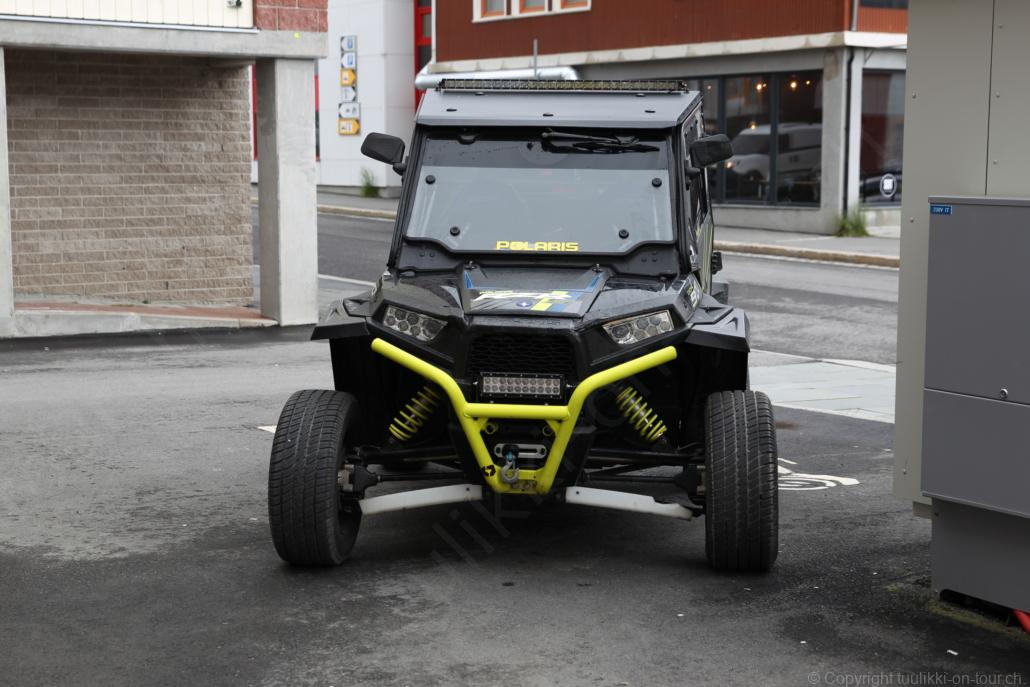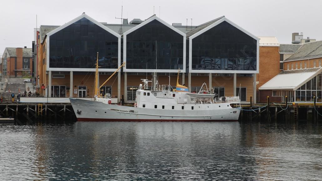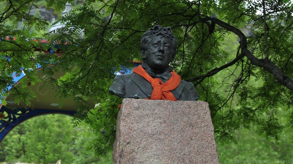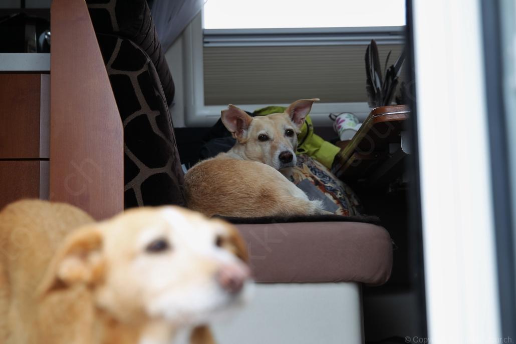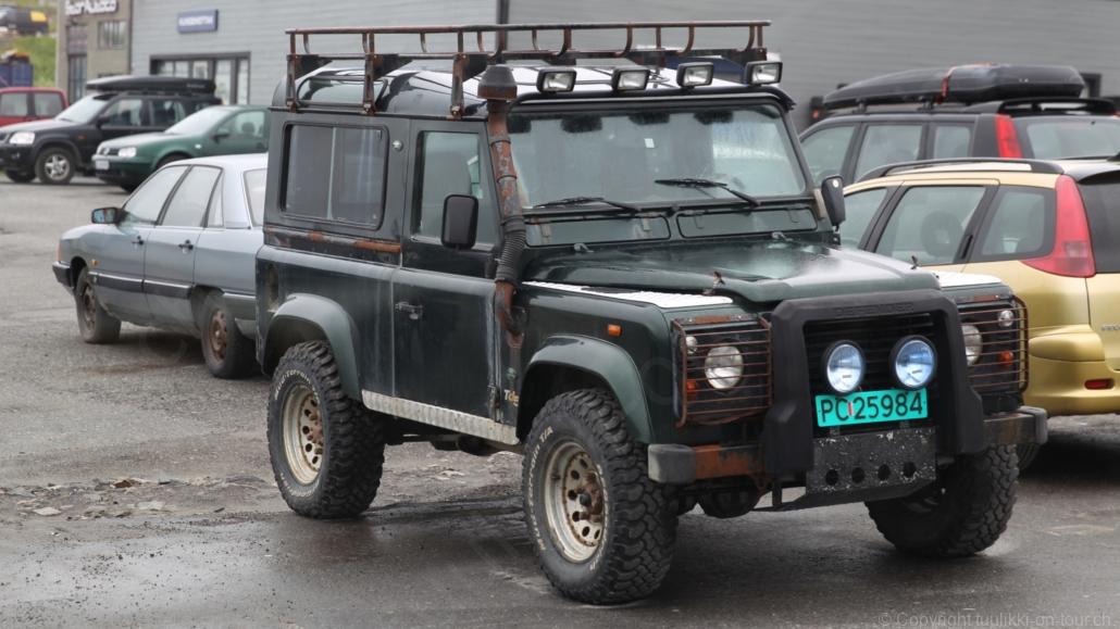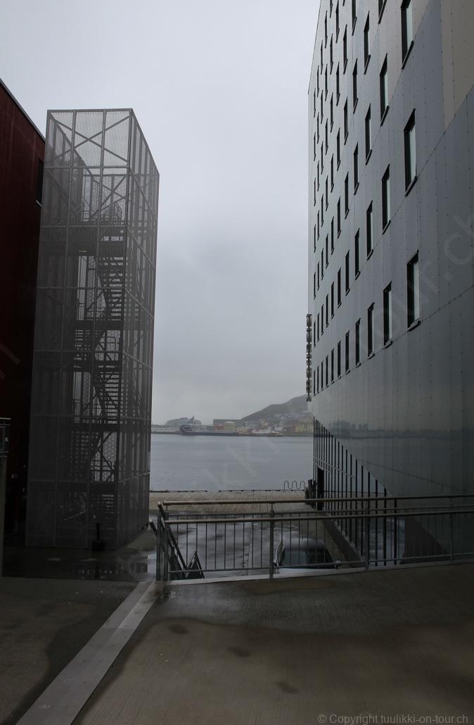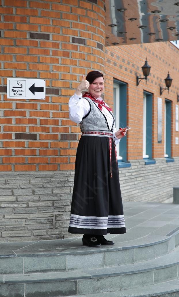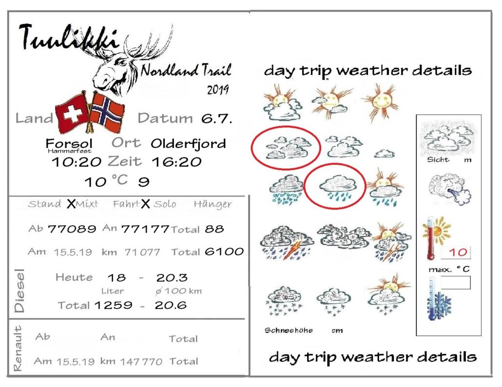 Heute ist ein Putz- und Einkaufstag, was immer viel Zeit in Anspruch nimmt. Wir fahren also von Forsol zurück nach Hammerfest und finden dort überraschend im Europris überzeugende Angebote für die Hunde. Pipa hat sich während einer gewissen Zeit den Spass daraus gemacht, Luso an der Leine zu führen. Das ging so, dass sie sich in die Leine von Luso verbiss und ihn daran herumzerrte. Trotz jeweiliger Intervention hat sie es geschafft, die Leine tüchtig zu schwächen; und hier haben wir diese nun ersetzt, zusätzlich gleich neue ‚Gstältli‘ angepasst, kurz eine ganze Garderobe mal drei erstanden! Danach ist schon wieder Zeit für den Mittagsspaziergang, den wir beim Flugplatz, ums Seelein herum und im Neubauquartier vorbei machen. Die sich kurz etwas angehobene Wolken-Nebel-Decke senkt sich wieder und man hat manchmal fast das Gefühl, der Himmel parkiere demnächst auf dem Kopf. Am Quai, beim WoMo-Platz stellen wir unser Gefährt dann ab, lassen den Hunden ihren Mittagsschlaf und machen uns zu Fuss durch das Städtchen. Für die Abfahrt der Hurtigruten sind wir eine Stunde zu spät, dafür können wir einen weissen Belugawal beobachten, der ganz entspannt im Hafenbecken schwimmt und sich offenbar dem Publikum präsentiert. Hin und her, mal auf dem Rücken, mal seitwärts, dann kommt er an die Oberfläche und öffnet sein Luftloch, um gleich danach elegant mit nur einer kurzen Schwanzflossen-Bewegung wieder zu tauchen. Er ist seit zwei Monaten Gast hier und wird von Fachleuten gefüttert, wieso er auch schon einen Namen erhalten hat: Hvaldimir. Über ihn wurde schon in den Nachrichten berichtet und vermutet, es sei ein Spionagewal und stamme von der russischen Kolahalbinsel. In der Stadt selbst scheint es nicht gut zu laufen, es sind viele Geschäftslokale leer, viele Häuser sehr mitgenommen und ungepflegt; nur gerade in der Hafengegend, wo täglich 2x die Hurtigruten anlegen schaut es besser aus. Natürlich gehört das obligate Foto mit den Eisbären vor dem Rathaus zum Pflicht-Klick; obwohl sich die Stadt aktuell überlegt, sich von Eisbären- in Belugawal-Stadt umzubenennen. Es gibt für uns keinen Grund, länger zu bleiben, also fahren wir die 60 km bis Skaidi auf der ‚94‘ , dann auf die E6 zurück und beziehen kurz vor Olderfjord im Birkenwald ‚Stellung‘. Unter den Biken blühen kleinste gelbe Stiefmütterchen, und zwar grosse Parzellen voll, soooo schön!
