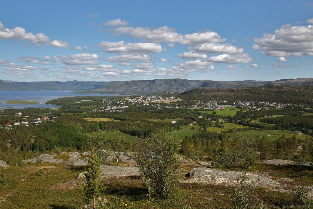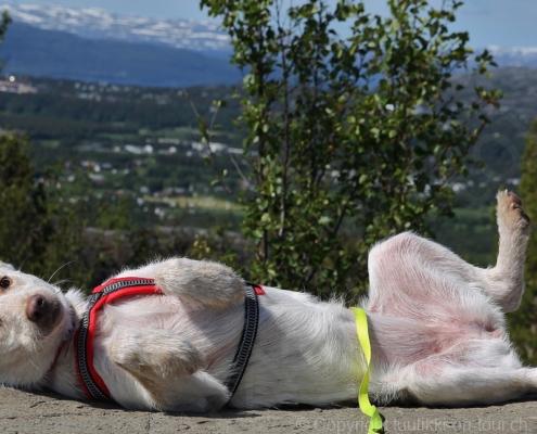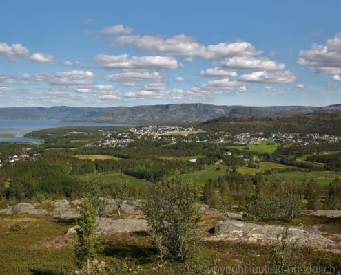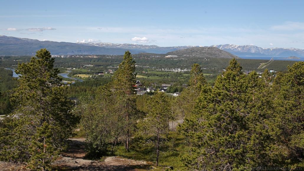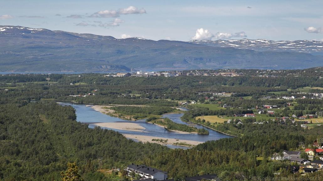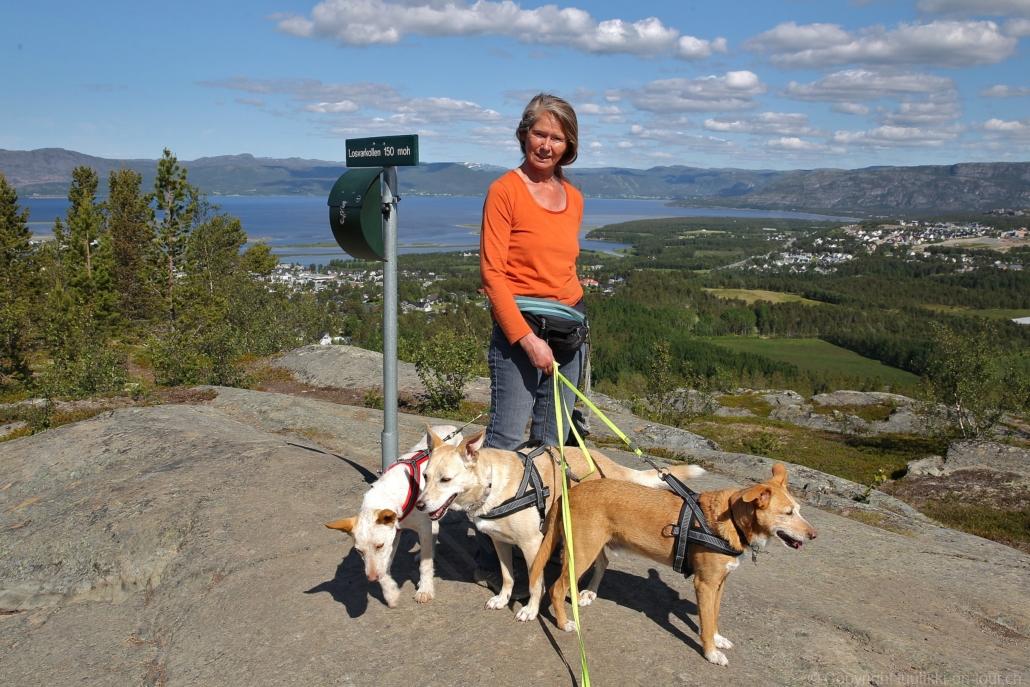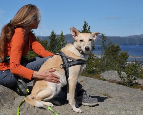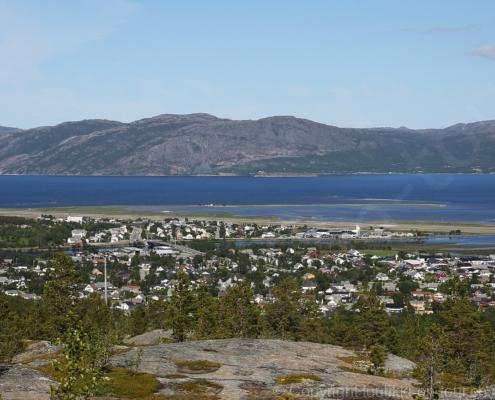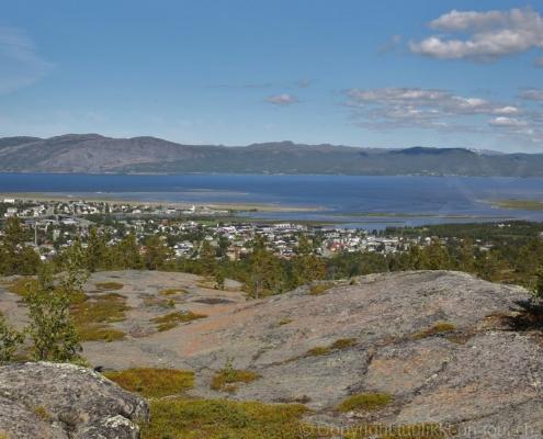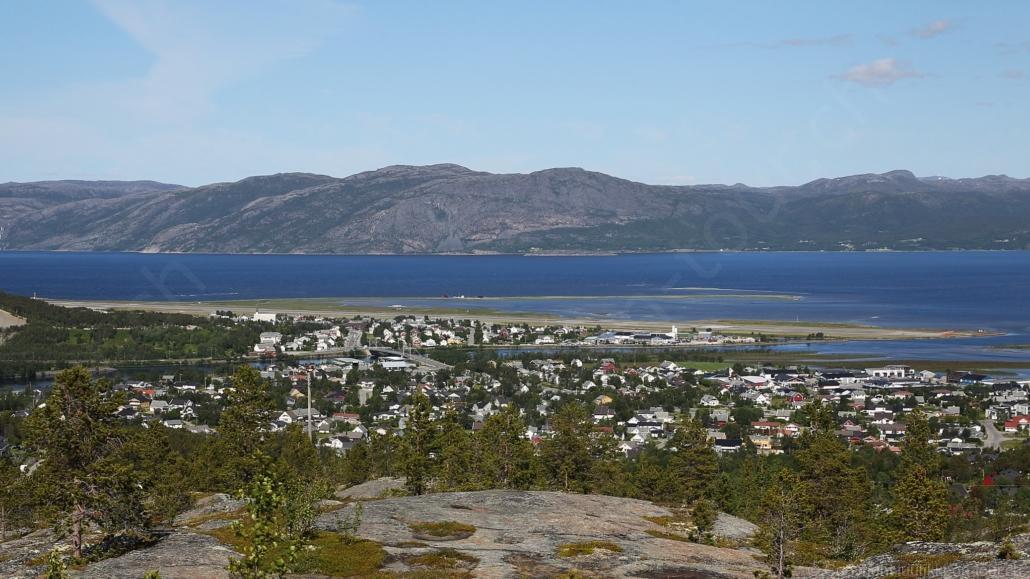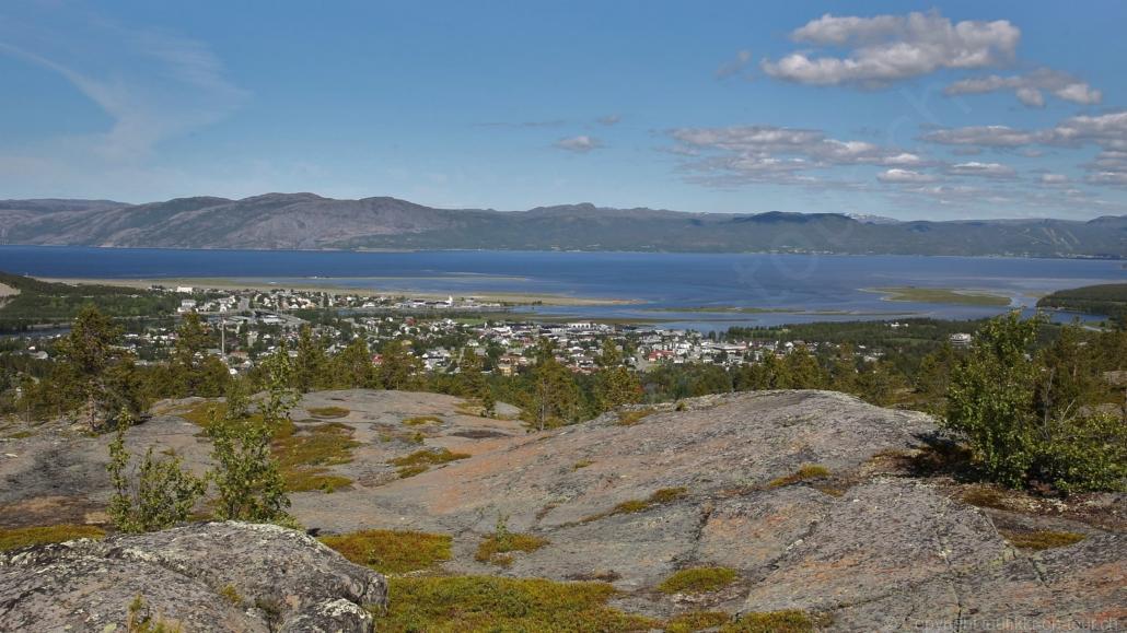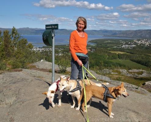 Kein Wölklein trübt den makellos blauen Himmel heute morgen; ein traumhaft schöner Sommertag beginnt. Nichtsdestotrotz steht am Vormittag eine Putz- und Aufräumrunde an; danach lassen wir die Sonne rein und lüften durch … und es riecht wieder frühlingshaft frisch im WoMo! Über den Mittag schauen wir uns kurz den Flughafen von Alta an, dann lassen wir uns vom Langlauf-Wegweiser Kaiskuru leiten. Auf dem dortigen Parkplatz stellen wir den Kangoo in eine Ecke und folgen dem mit blauen Punkten markierten hiking track auf den Losvarkollen über flache und leicht gerundete Felsen. Oben erwartet uns eine tolle Aussicht auf das grosse Delta des Alta River, den Alta Fjord sowie Alta und Umgebung inkl. der Skisprungschanze Altabakkene und wir können den Anflug einer Linienmaschine zum Airport Alta beobachten. Auch die Hunde lieben den Top-Platz, Pipa wälzt sich auf dem warmen Fels, Luso guckt sich die Gegend an und Oxi geniesst die Sonne mit geschlossenen Augen.