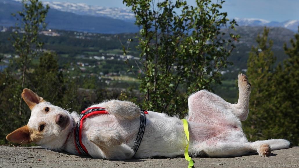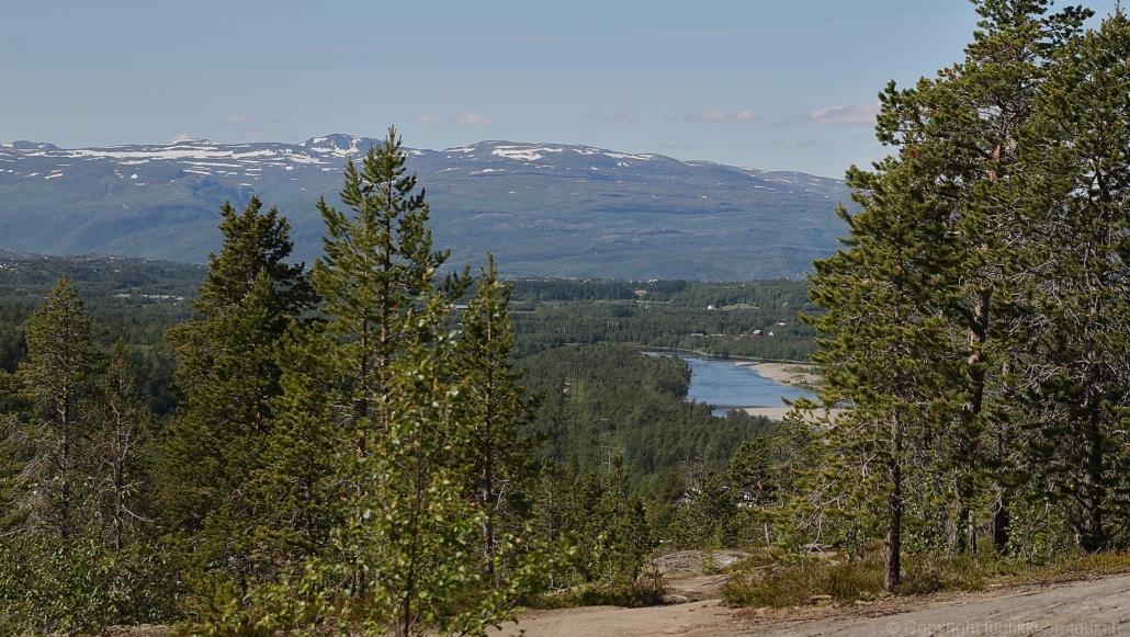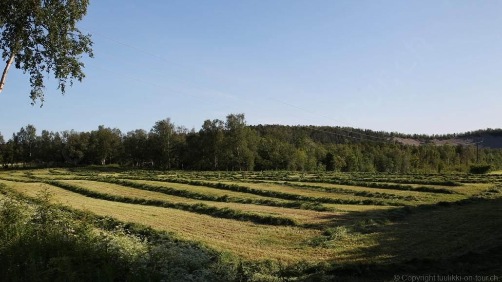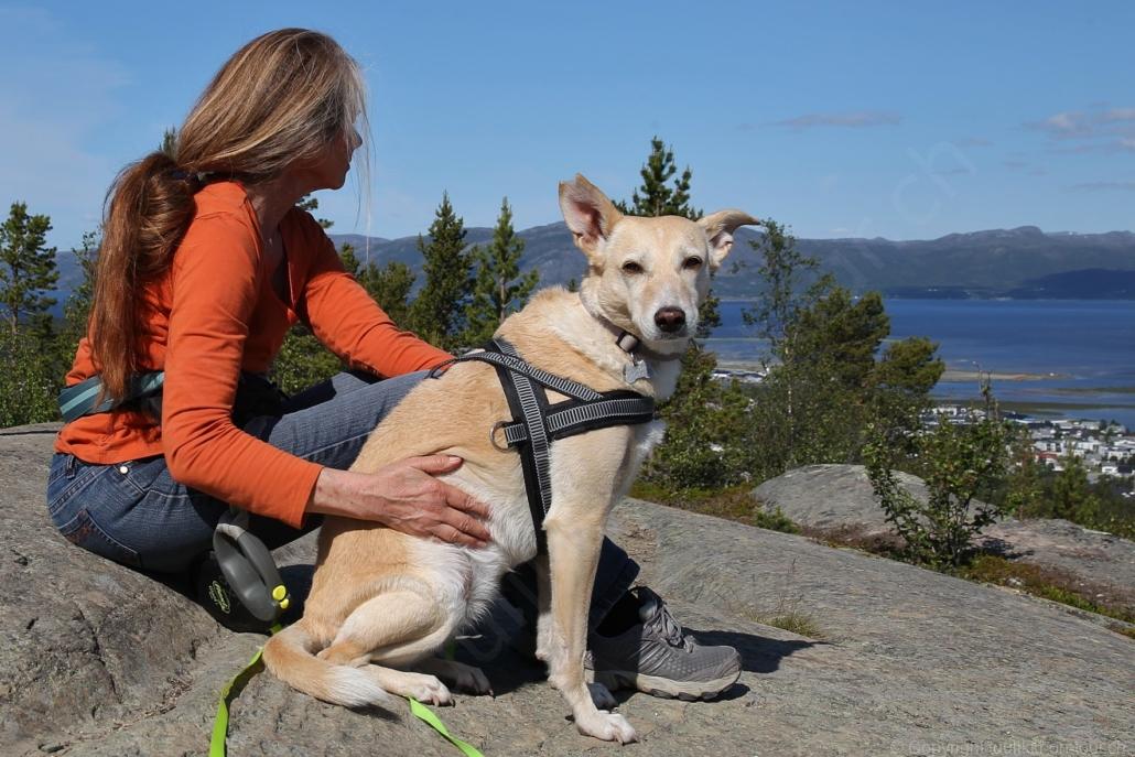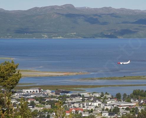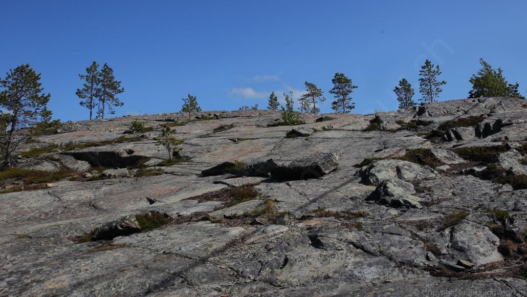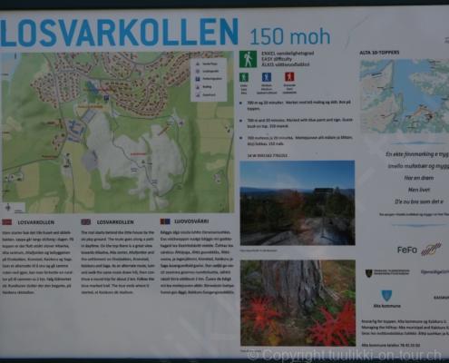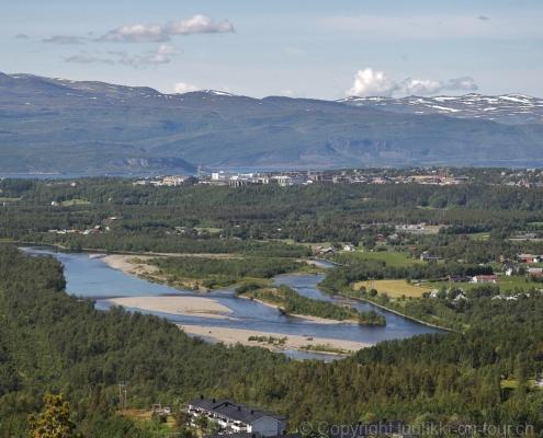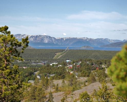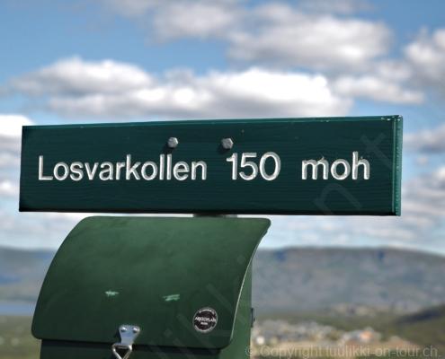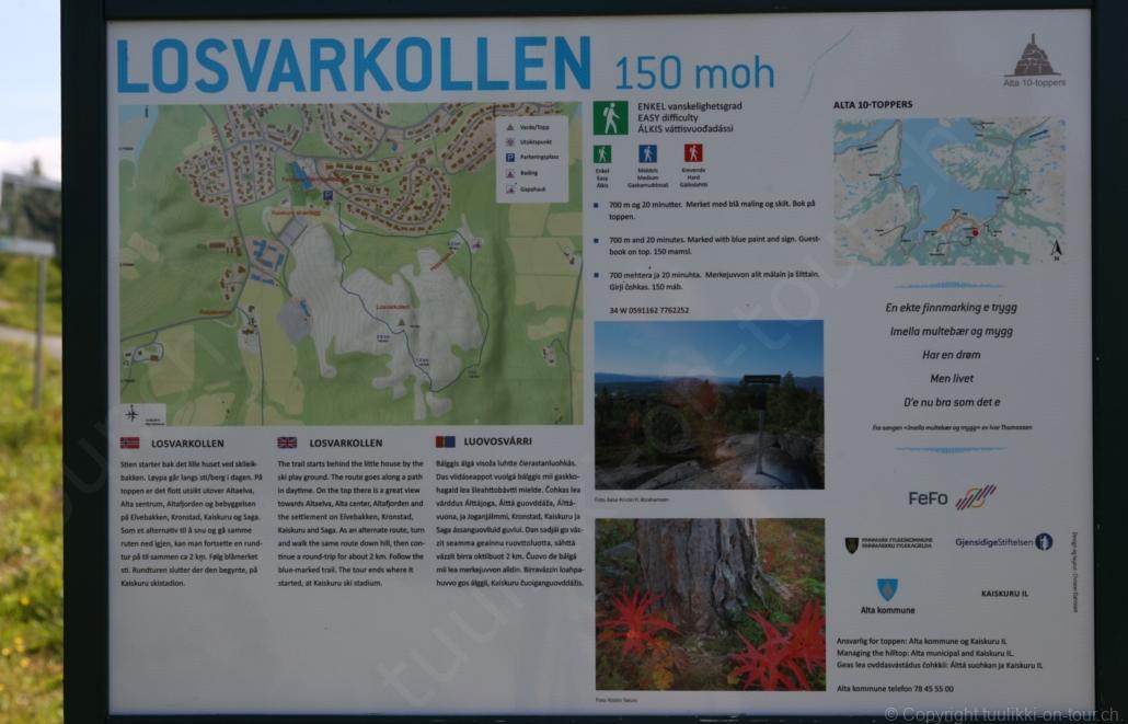 Kein Wölklein trübt den makellos blauen Himmel heute morgen; ein traumhaft schöner Sommertag beginnt. Nichtsdestotrotz steht am Vormittag eine Putz- und Aufräumrunde an; danach lassen wir die Sonne rein und lüften durch … und es riecht wieder frühlingshaft frisch im WoMo! Über den Mittag schauen wir uns kurz den Flughafen von Alta an, dann lassen wir uns vom Langlauf-Wegweiser Kaiskuru leiten. Auf dem dortigen Parkplatz stellen wir den Kangoo in eine Ecke und folgen dem mit blauen Punkten markierten hiking track auf den Losvarkollen über flache und leicht gerundete Felsen. Oben erwartet uns eine tolle Aussicht auf das grosse Delta des Alta River, den Alta Fjord sowie Alta und Umgebung inkl. der Skisprungschanze Altabakkene und wir können den Anflug einer Linienmaschine zum Airport Alta beobachten. Auch die Hunde lieben den Top-Platz, Pipa wälzt sich auf dem warmen Fels, Luso guckt sich die Gegend an und Oxi geniesst die Sonne mit geschlossenen Augen.