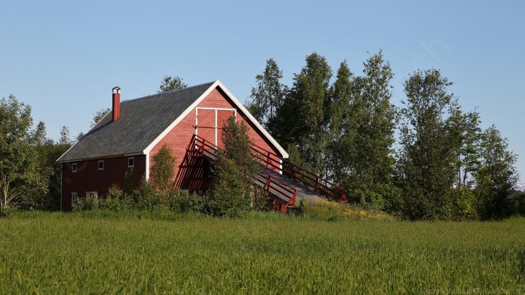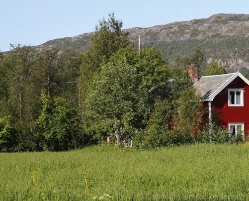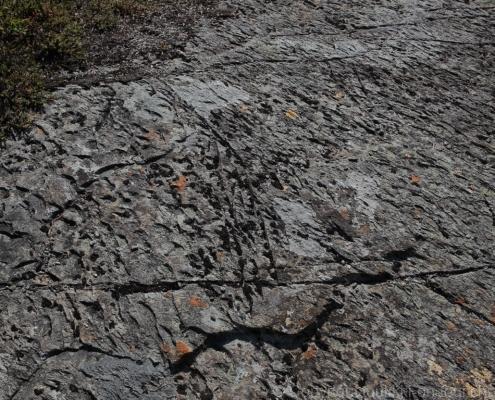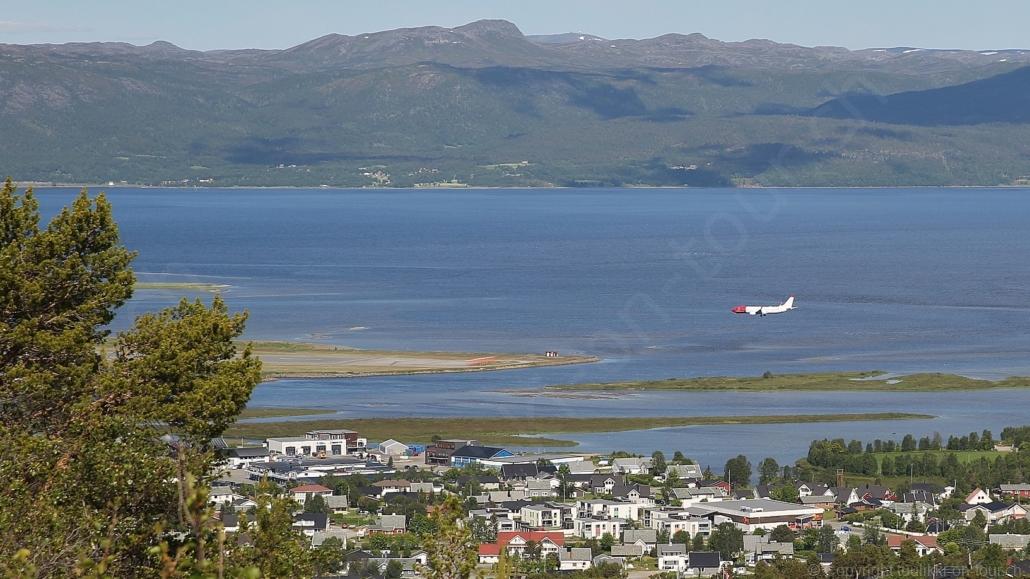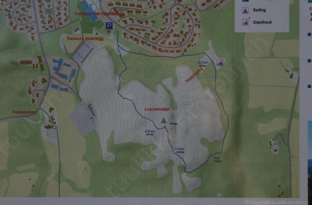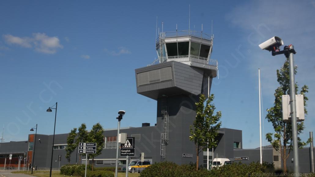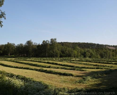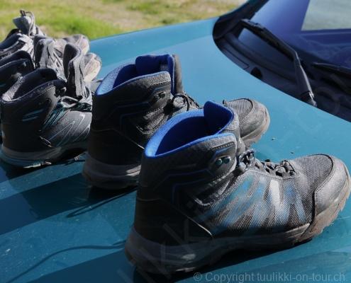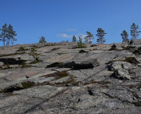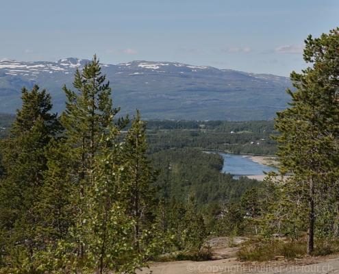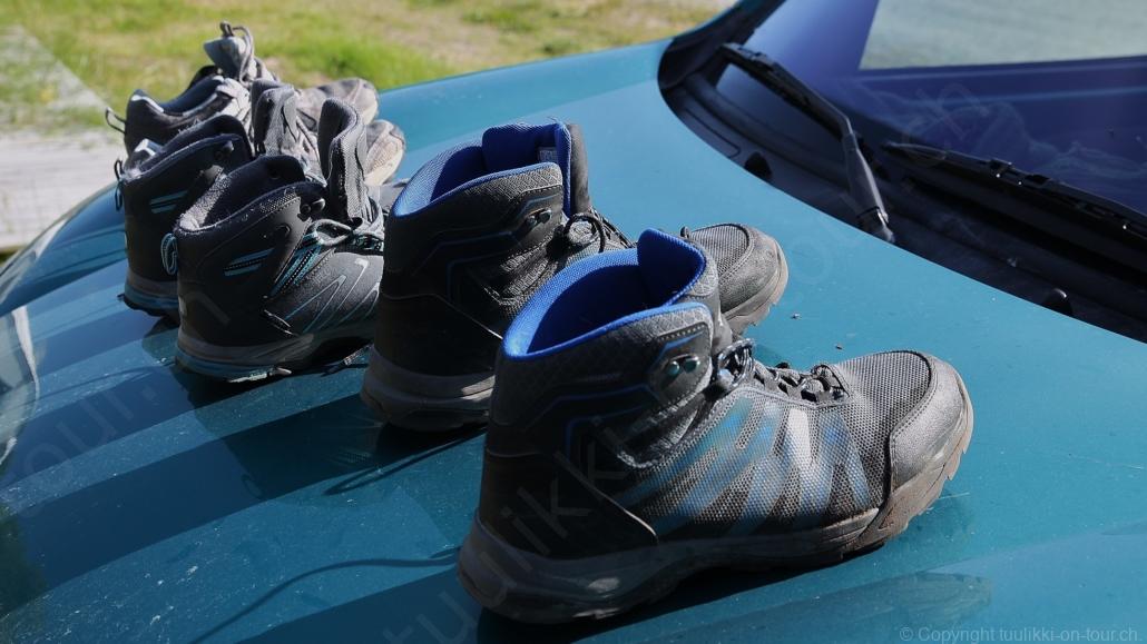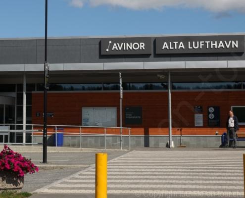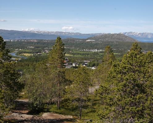 Kein Wölklein trübt den makellos blauen Himmel heute morgen; ein traumhaft schöner Sommertag beginnt. Nichtsdestotrotz steht am Vormittag eine Putz- und Aufräumrunde an; danach lassen wir die Sonne rein und lüften durch … und es riecht wieder frühlingshaft frisch im WoMo! Über den Mittag schauen wir uns kurz den Flughafen von Alta an, dann lassen wir uns vom Langlauf-Wegweiser Kaiskuru leiten. Auf dem dortigen Parkplatz stellen wir den Kangoo in eine Ecke und folgen dem mit blauen Punkten markierten hiking track auf den Losvarkollen über flache und leicht gerundete Felsen. Oben erwartet uns eine tolle Aussicht auf das grosse Delta des Alta River, den Alta Fjord sowie Alta und Umgebung inkl. der Skisprungschanze Altabakkene und wir können den Anflug einer Linienmaschine zum Airport Alta beobachten. Auch die Hunde lieben den Top-Platz, Pipa wälzt sich auf dem warmen Fels, Luso guckt sich die Gegend an und Oxi geniesst die Sonne mit geschlossenen Augen.