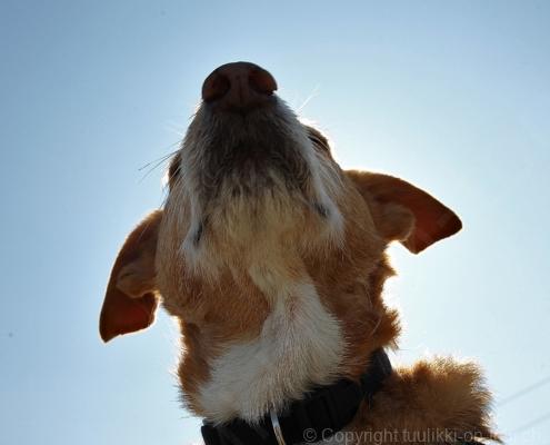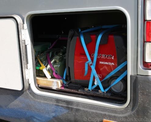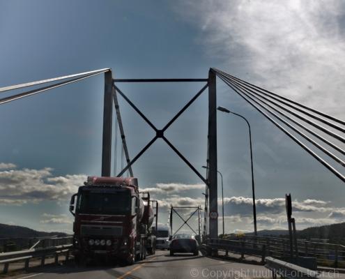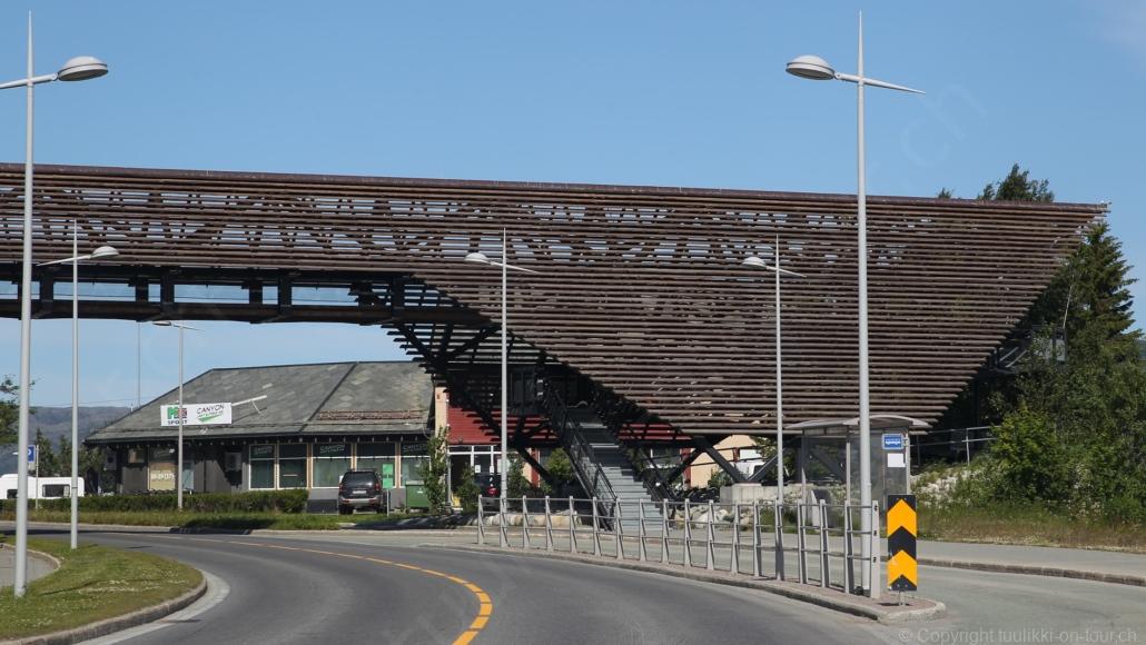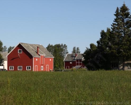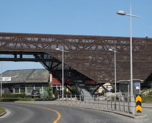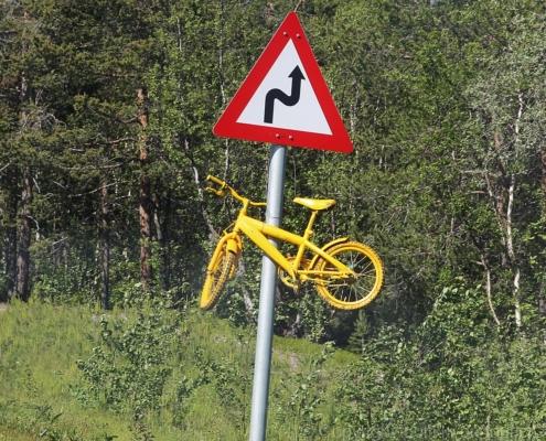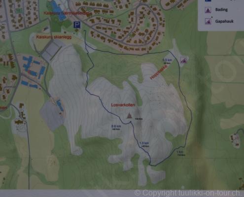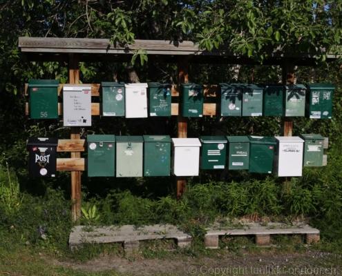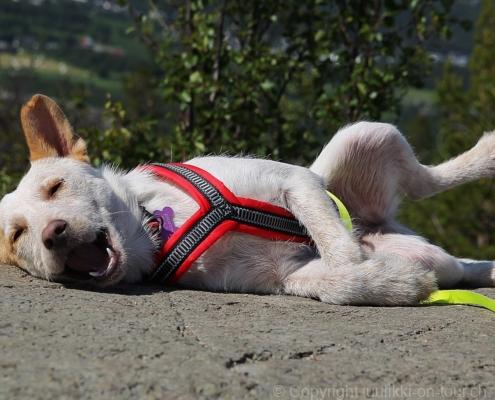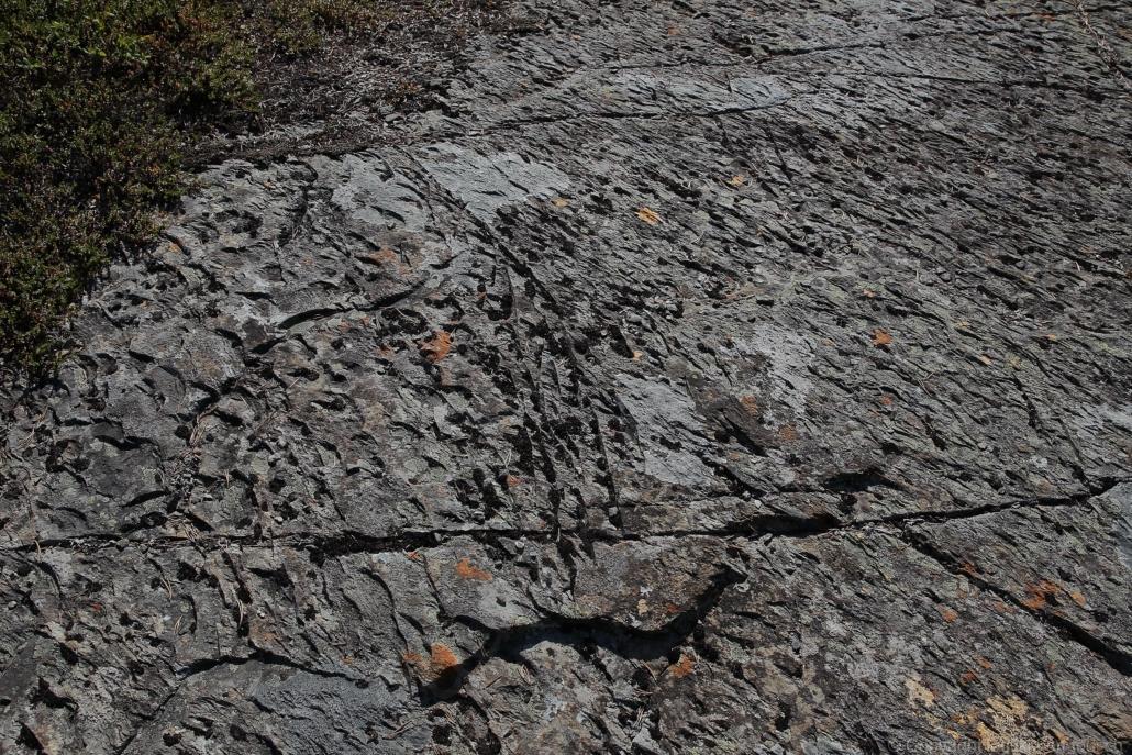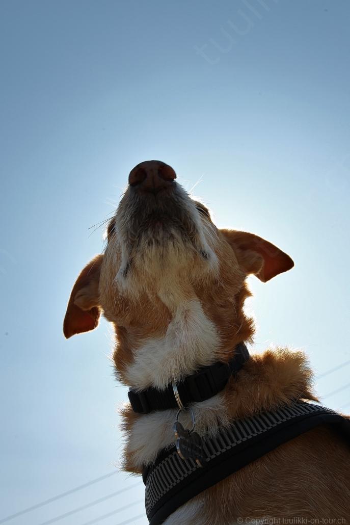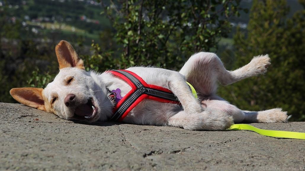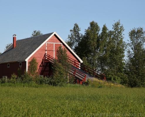 Kein Wölklein trübt den makellos blauen Himmel heute morgen; ein traumhaft schöner Sommertag beginnt. Nichtsdestotrotz steht am Vormittag eine Putz- und Aufräumrunde an; danach lassen wir die Sonne rein und lüften durch … und es riecht wieder frühlingshaft frisch im WoMo! Über den Mittag schauen wir uns kurz den Flughafen von Alta an, dann lassen wir uns vom Langlauf-Wegweiser Kaiskuru leiten. Auf dem dortigen Parkplatz stellen wir den Kangoo in eine Ecke und folgen dem mit blauen Punkten markierten hiking track auf den Losvarkollen über flache und leicht gerundete Felsen. Oben erwartet uns eine tolle Aussicht auf das grosse Delta des Alta River, den Alta Fjord sowie Alta und Umgebung inkl. der Skisprungschanze Altabakkene und wir können den Anflug einer Linienmaschine zum Airport Alta beobachten. Auch die Hunde lieben den Top-Platz, Pipa wälzt sich auf dem warmen Fels, Luso guckt sich die Gegend an und Oxi geniesst die Sonne mit geschlossenen Augen.