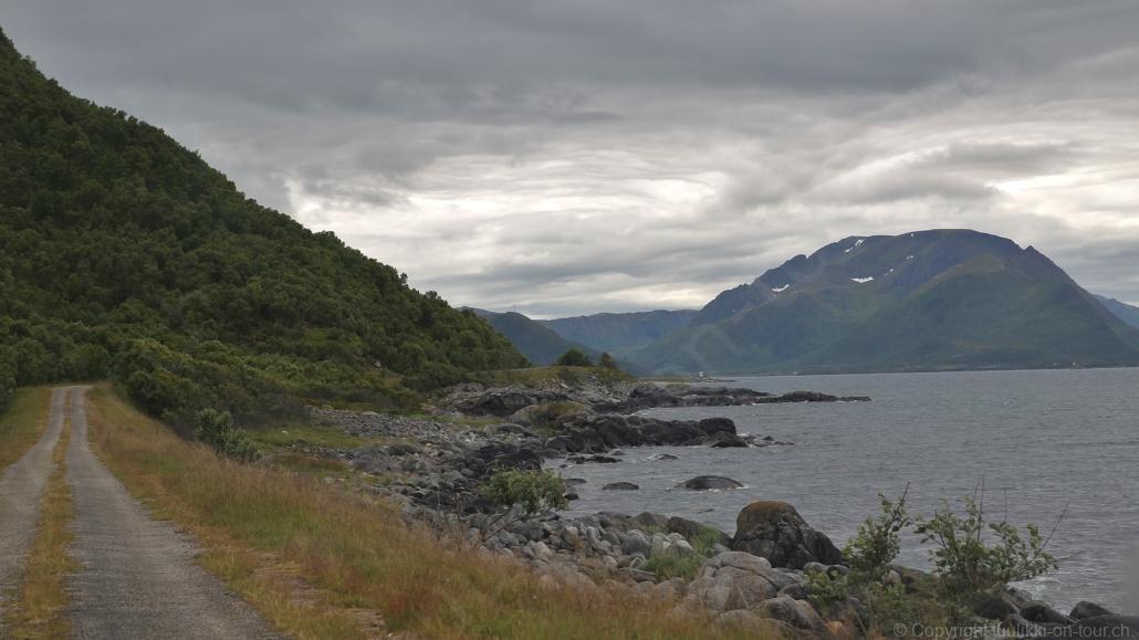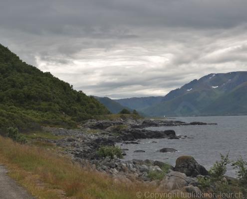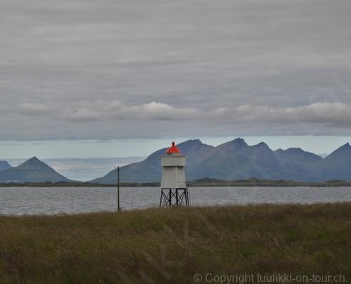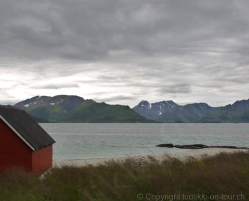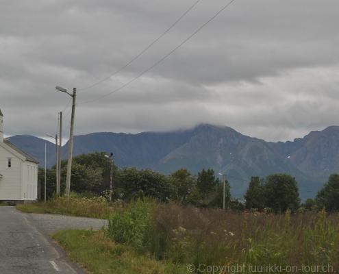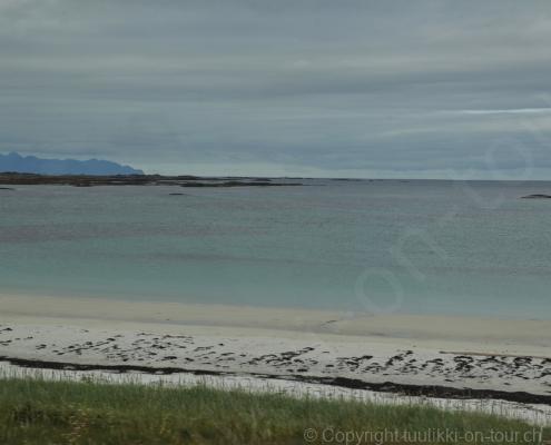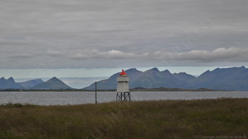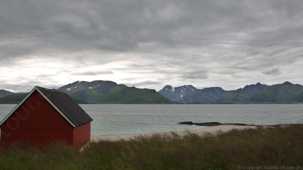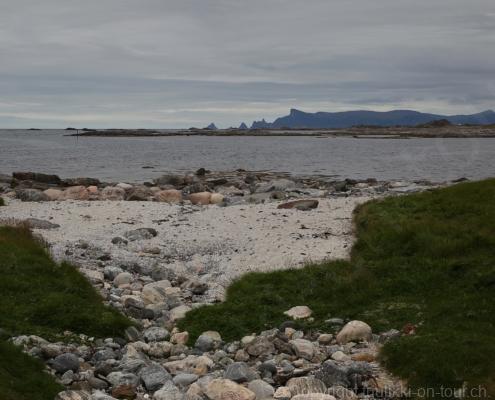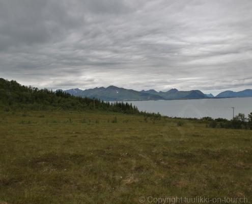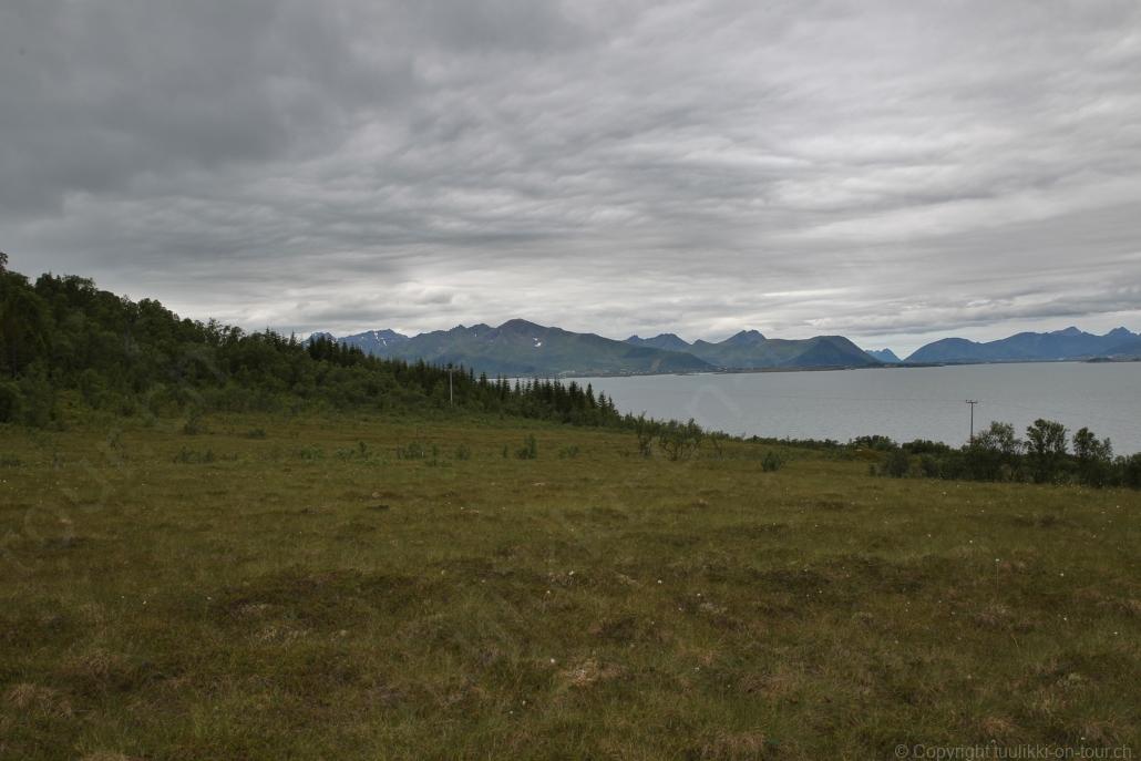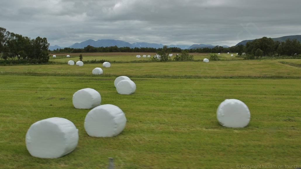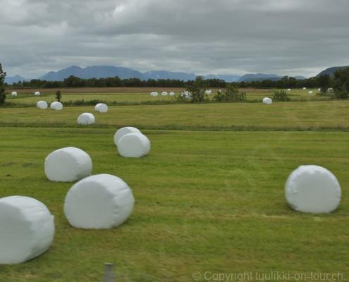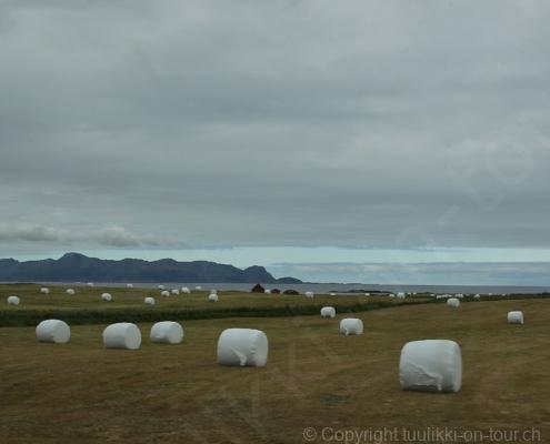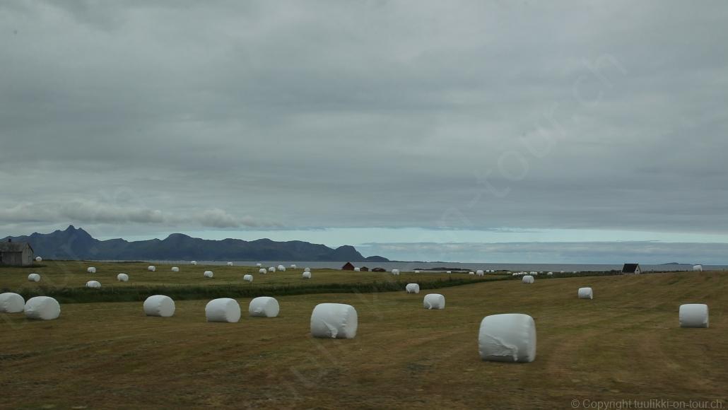 Die Westküste der zu den Vesteralen zählenden Insel Andoy zeigt sich auch heute mangels Sonne in grün und grau, was auf den Fotos weniger schön erscheint als es in Wirklichkeit ist. Trotzdem ist der ‚Auenfjord‘ besonders malerisch, eine ganze Schar von Inselchen scheint in ihm zu schwimmen. Weisse Sandstrände, die das Flair des Südens haben zeigen sich dann auf der einen Seite, aus dem Fenster gegenüber sieht man landwirtschaftliche Nutzung oder arktische Tundralandschaft. Wir kommen an einer belebten modernen Haltestelle vorbei, von der aus man bequem zum nahen Leuchtturm spazieren kann. Bei Skogvoll queren wir die hier nur 9 km breite Insel über eine Rumpelpiste bis Myre an der Ostküste und folgen dieser bis Å, der Gemeinde mit dem kürzesten Namen. Hier finden wir am Andfjord, hinter einem dekorativ mit grossen runden Steinblöcken ‚dekorierten‘, flachen Zipfel aus halb Wasser und halb Wiesland, einen perfekten Platz, um unser WoMo abzustellen und die Insel mit dem Kangoo weiter zu erfahren. Etwas weiter unten queren wir die Insel erneut, um auch den südlichsten Zipfel zu umrunden. Bald endet die geteerte schmale Strasse, ein wahrer Offroad-Trip beginnt. Es ist doch immer wieder nützlich, permanenten Allrad- und Vierpfoten-Antrieb dabei zu haben! Ein schmaler, nur gerade Renault-breiter Naturweg mit vielen Löchern führt eng dem steinigen Ufer entlang, eingerahmt von niedrig gewachsenen Birken mit Farn darunter. Ein Wegweiser macht uns auf einen Bergpfad in ein einsames Gebirgstal und auf einen 700 m hohen Hügel aufmerksam, dem wir folgen, bis uns das Hochmoor zu nass wird. Die gegenüber liegenden markanten Bergzacken spiegeln sich im ruhigen Wasser. Auf der Weiterfahrt zeigen weidende Schafe und einige verstreute Hütten die sich wieder nähernde Zivilisation an. Wir wechseln dann auf die Hauptstrasse 82, erreichen mitten am Nachmittag wieder den Ort Å und dort unser WoMo, wo wir bei toller Sicht auf Berge mit Schneeresten, Wasser und Wiese sowie Seevögeln einen späten Lunch zu uns nehmen und einen kurzen Mittagsschlaf nachholen. Wir beschliessen, den Rest des Tages und die Nacht hier zu bleiben, um morgen auf die Insel Hinnoya zu wechseln. Am Abend spazieren wir bei beginnender Bewölkungsauflockerung, ganz gemäss Wetterprognose, dem Küstenweg entlang, vorbei an kürzlich abgemähten Feldern und einem grossen Stapel der in weisse Riesenrollen gepackten Ernte.