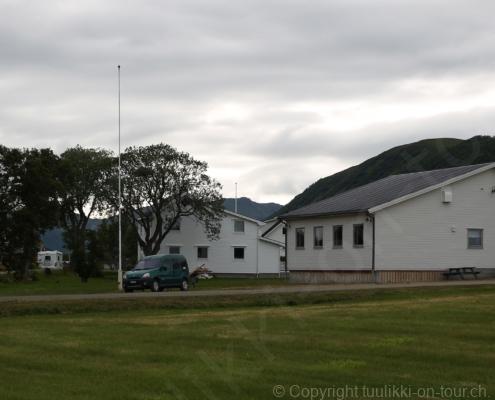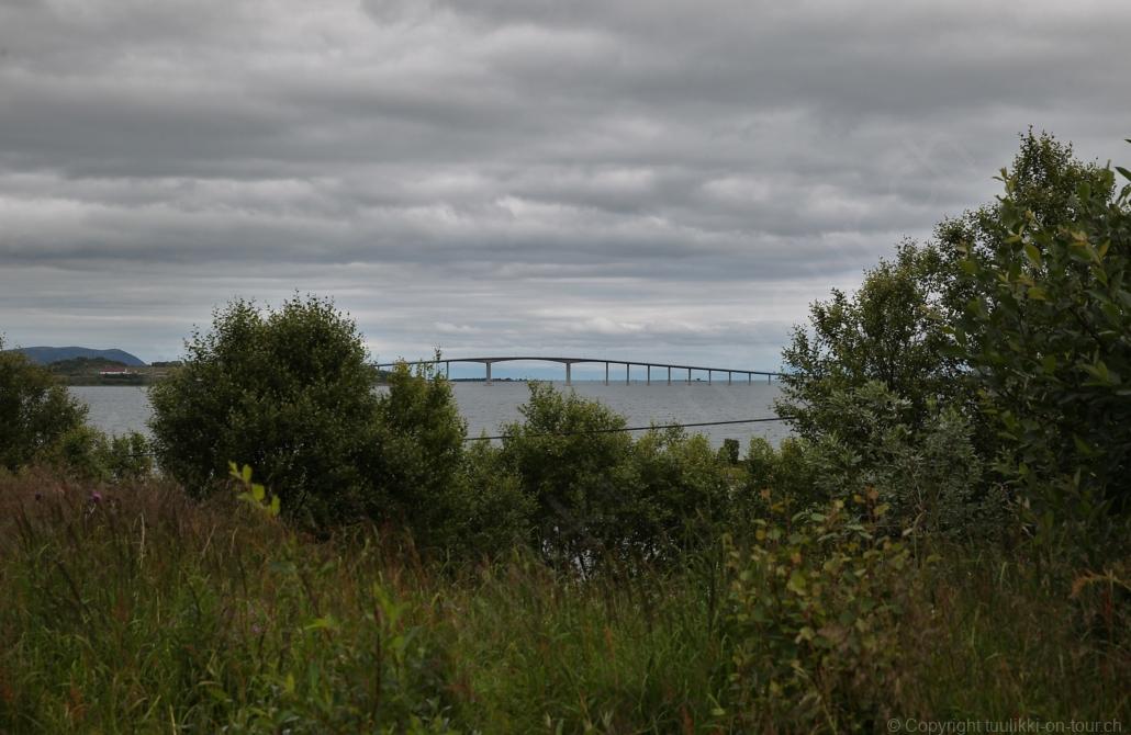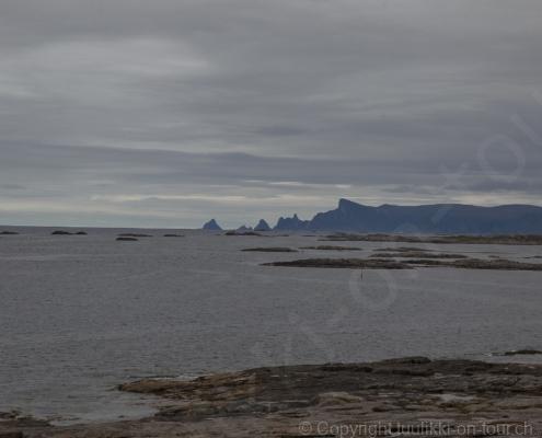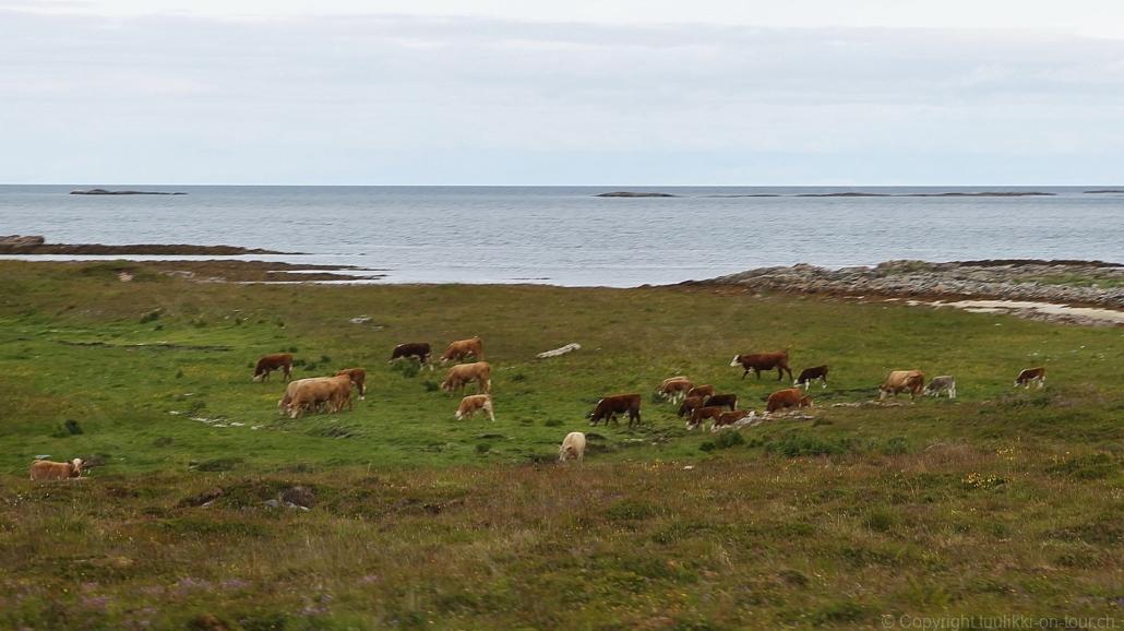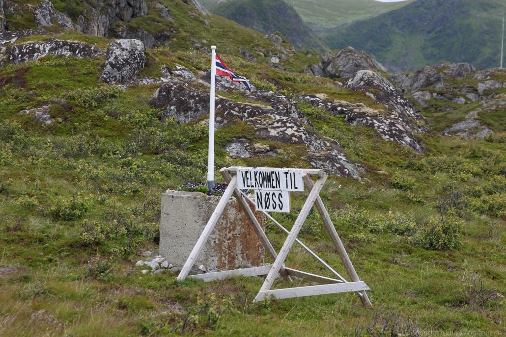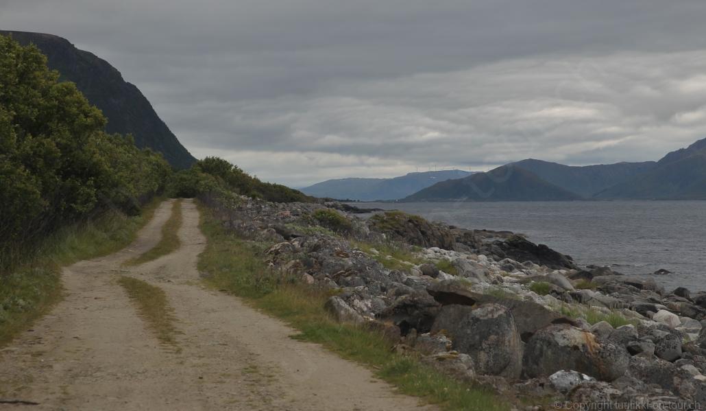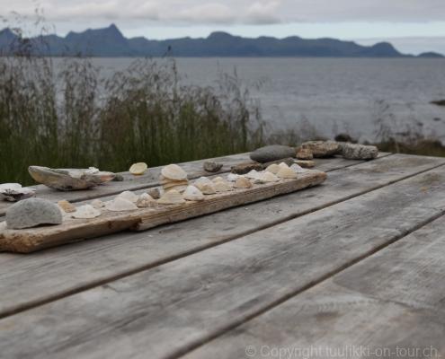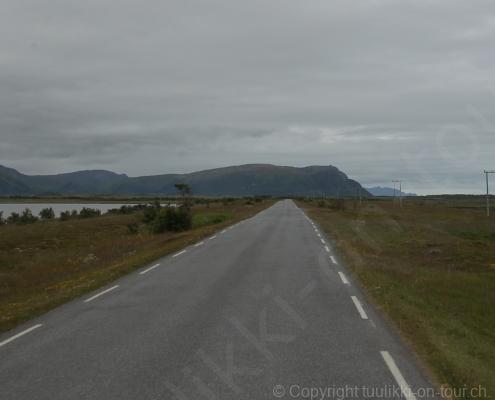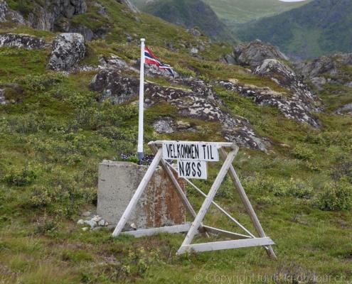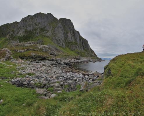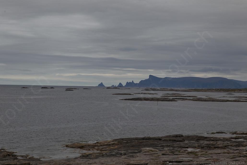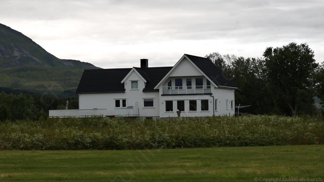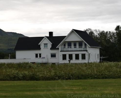 Die Westküste der zu den Vesteralen zählenden Insel Andoy zeigt sich auch heute mangels Sonne in grün und grau, was auf den Fotos weniger schön erscheint als es in Wirklichkeit ist. Trotzdem ist der ‚Auenfjord‘ besonders malerisch, eine ganze Schar von Inselchen scheint in ihm zu schwimmen. Weisse Sandstrände, die das Flair des Südens haben zeigen sich dann auf der einen Seite, aus dem Fenster gegenüber sieht man landwirtschaftliche Nutzung oder arktische Tundralandschaft. Wir kommen an einer belebten modernen Haltestelle vorbei, von der aus man bequem zum nahen Leuchtturm spazieren kann. Bei Skogvoll queren wir die hier nur 9 km breite Insel über eine Rumpelpiste bis Myre an der Ostküste und folgen dieser bis Å, der Gemeinde mit dem kürzesten Namen. Hier finden wir am Andfjord, hinter einem dekorativ mit grossen runden Steinblöcken ‚dekorierten‘, flachen Zipfel aus halb Wasser und halb Wiesland, einen perfekten Platz, um unser WoMo abzustellen und die Insel mit dem Kangoo weiter zu erfahren. Etwas weiter unten queren wir die Insel erneut, um auch den südlichsten Zipfel zu umrunden. Bald endet die geteerte schmale Strasse, ein wahrer Offroad-Trip beginnt. Es ist doch immer wieder nützlich, permanenten Allrad- und Vierpfoten-Antrieb dabei zu haben! Ein schmaler, nur gerade Renault-breiter Naturweg mit vielen Löchern führt eng dem steinigen Ufer entlang, eingerahmt von niedrig gewachsenen Birken mit Farn darunter. Ein Wegweiser macht uns auf einen Bergpfad in ein einsames Gebirgstal und auf einen 700 m hohen Hügel aufmerksam, dem wir folgen, bis uns das Hochmoor zu nass wird. Die gegenüber liegenden markanten Bergzacken spiegeln sich im ruhigen Wasser. Auf der Weiterfahrt zeigen weidende Schafe und einige verstreute Hütten die sich wieder nähernde Zivilisation an. Wir wechseln dann auf die Hauptstrasse 82, erreichen mitten am Nachmittag wieder den Ort Å und dort unser WoMo, wo wir bei toller Sicht auf Berge mit Schneeresten, Wasser und Wiese sowie Seevögeln einen späten Lunch zu uns nehmen und einen kurzen Mittagsschlaf nachholen. Wir beschliessen, den Rest des Tages und die Nacht hier zu bleiben, um morgen auf die Insel Hinnoya zu wechseln. Am Abend spazieren wir bei beginnender Bewölkungsauflockerung, ganz gemäss Wetterprognose, dem Küstenweg entlang, vorbei an kürzlich abgemähten Feldern und einem grossen Stapel der in weisse Riesenrollen gepackten Ernte.