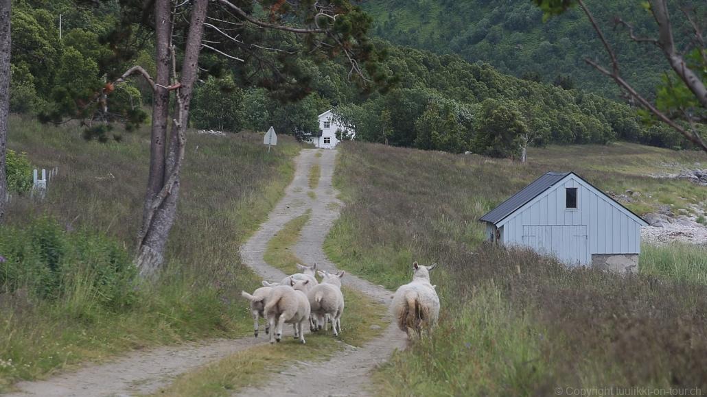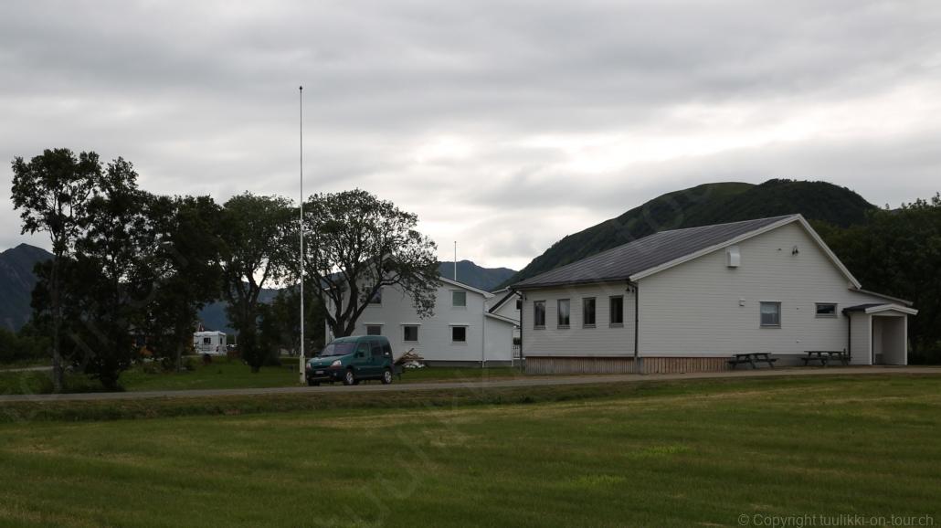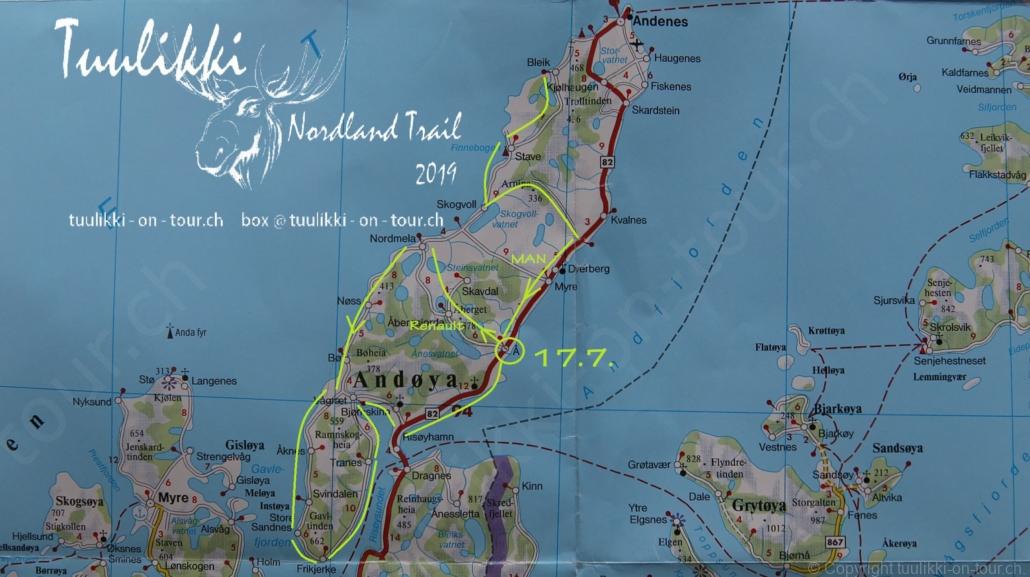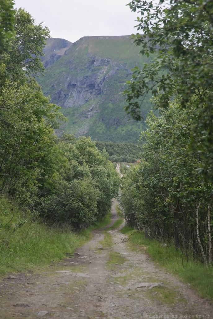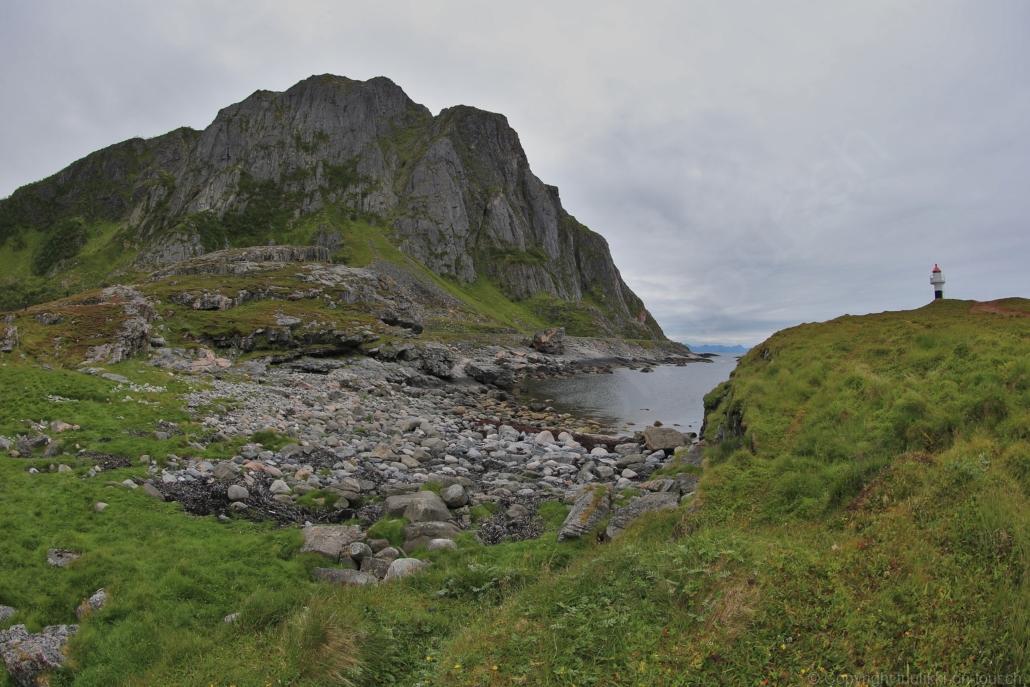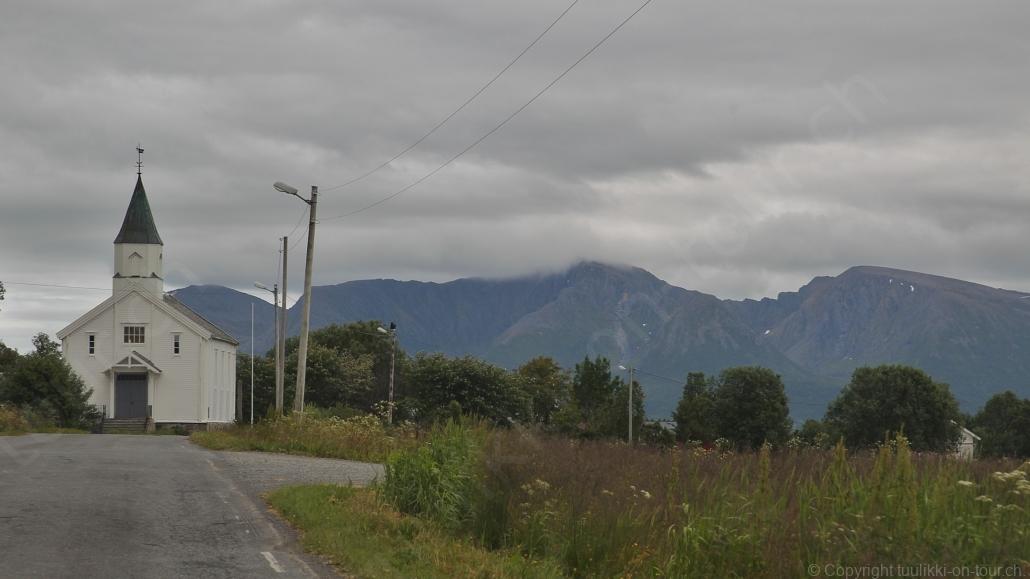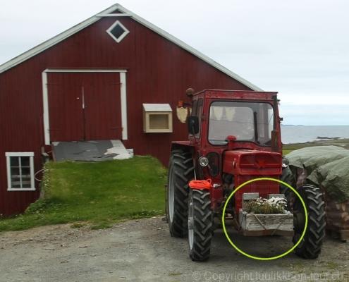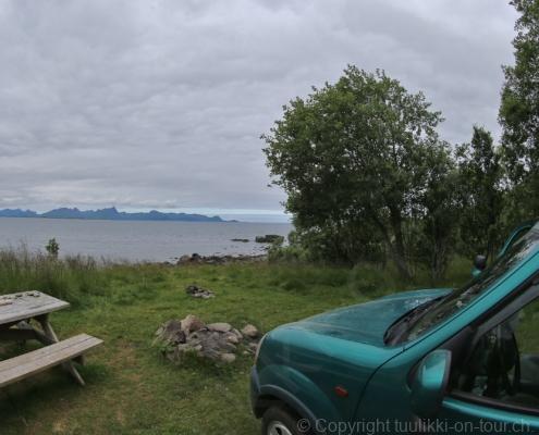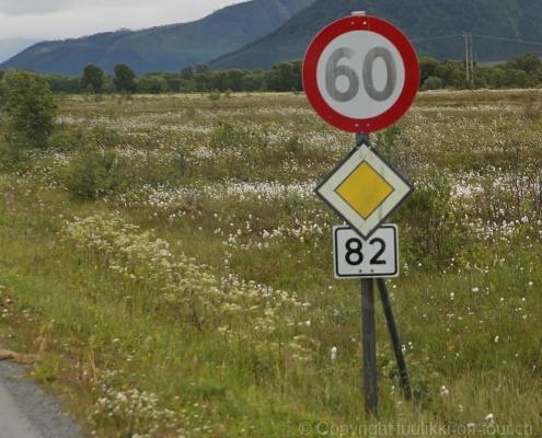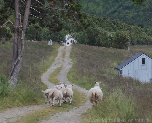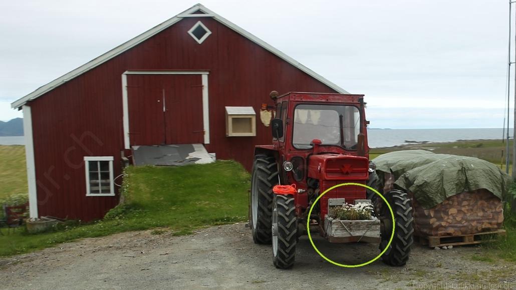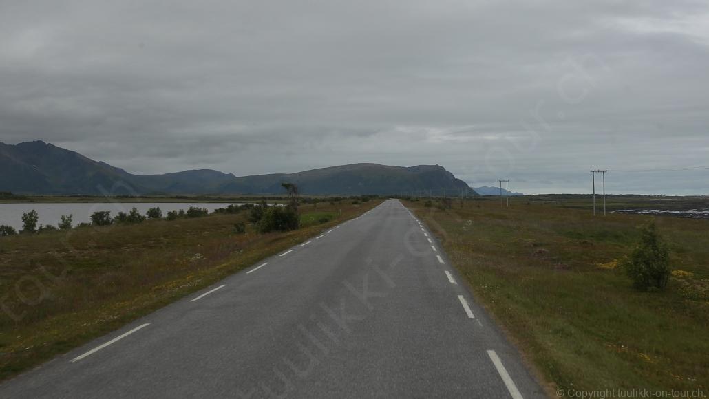 Die Westküste der zu den Vesteralen zählenden Insel Andoy zeigt sich auch heute mangels Sonne in grün und grau, was auf den Fotos weniger schön erscheint als es in Wirklichkeit ist. Trotzdem ist der ‚Auenfjord‘ besonders malerisch, eine ganze Schar von Inselchen scheint in ihm zu schwimmen. Weisse Sandstrände, die das Flair des Südens haben zeigen sich dann auf der einen Seite, aus dem Fenster gegenüber sieht man landwirtschaftliche Nutzung oder arktische Tundralandschaft. Wir kommen an einer belebten modernen Haltestelle vorbei, von der aus man bequem zum nahen Leuchtturm spazieren kann. Bei Skogvoll queren wir die hier nur 9 km breite Insel über eine Rumpelpiste bis Myre an der Ostküste und folgen dieser bis Å, der Gemeinde mit dem kürzesten Namen. Hier finden wir am Andfjord, hinter einem dekorativ mit grossen runden Steinblöcken ‚dekorierten‘, flachen Zipfel aus halb Wasser und halb Wiesland, einen perfekten Platz, um unser WoMo abzustellen und die Insel mit dem Kangoo weiter zu erfahren. Etwas weiter unten queren wir die Insel erneut, um auch den südlichsten Zipfel zu umrunden. Bald endet die geteerte schmale Strasse, ein wahrer Offroad-Trip beginnt. Es ist doch immer wieder nützlich, permanenten Allrad- und Vierpfoten-Antrieb dabei zu haben! Ein schmaler, nur gerade Renault-breiter Naturweg mit vielen Löchern führt eng dem steinigen Ufer entlang, eingerahmt von niedrig gewachsenen Birken mit Farn darunter. Ein Wegweiser macht uns auf einen Bergpfad in ein einsames Gebirgstal und auf einen 700 m hohen Hügel aufmerksam, dem wir folgen, bis uns das Hochmoor zu nass wird. Die gegenüber liegenden markanten Bergzacken spiegeln sich im ruhigen Wasser. Auf der Weiterfahrt zeigen weidende Schafe und einige verstreute Hütten die sich wieder nähernde Zivilisation an. Wir wechseln dann auf die Hauptstrasse 82, erreichen mitten am Nachmittag wieder den Ort Å und dort unser WoMo, wo wir bei toller Sicht auf Berge mit Schneeresten, Wasser und Wiese sowie Seevögeln einen späten Lunch zu uns nehmen und einen kurzen Mittagsschlaf nachholen. Wir beschliessen, den Rest des Tages und die Nacht hier zu bleiben, um morgen auf die Insel Hinnoya zu wechseln. Am Abend spazieren wir bei beginnender Bewölkungsauflockerung, ganz gemäss Wetterprognose, dem Küstenweg entlang, vorbei an kürzlich abgemähten Feldern und einem grossen Stapel der in weisse Riesenrollen gepackten Ernte.
