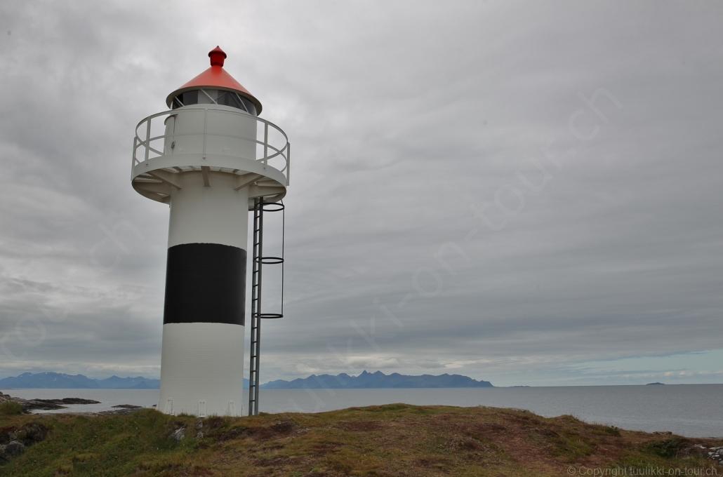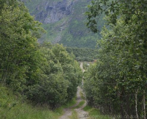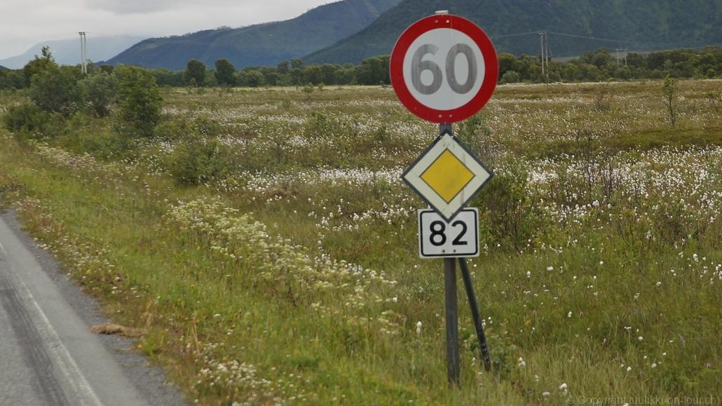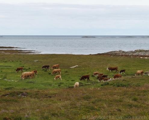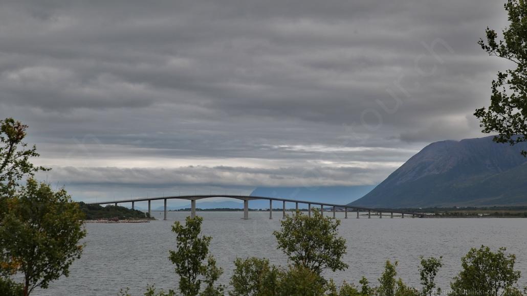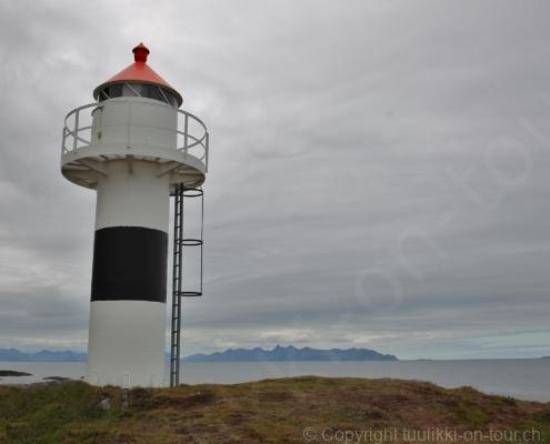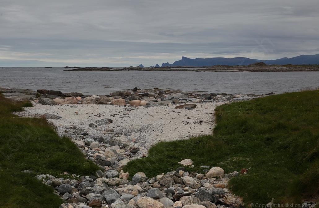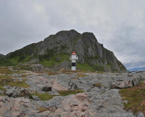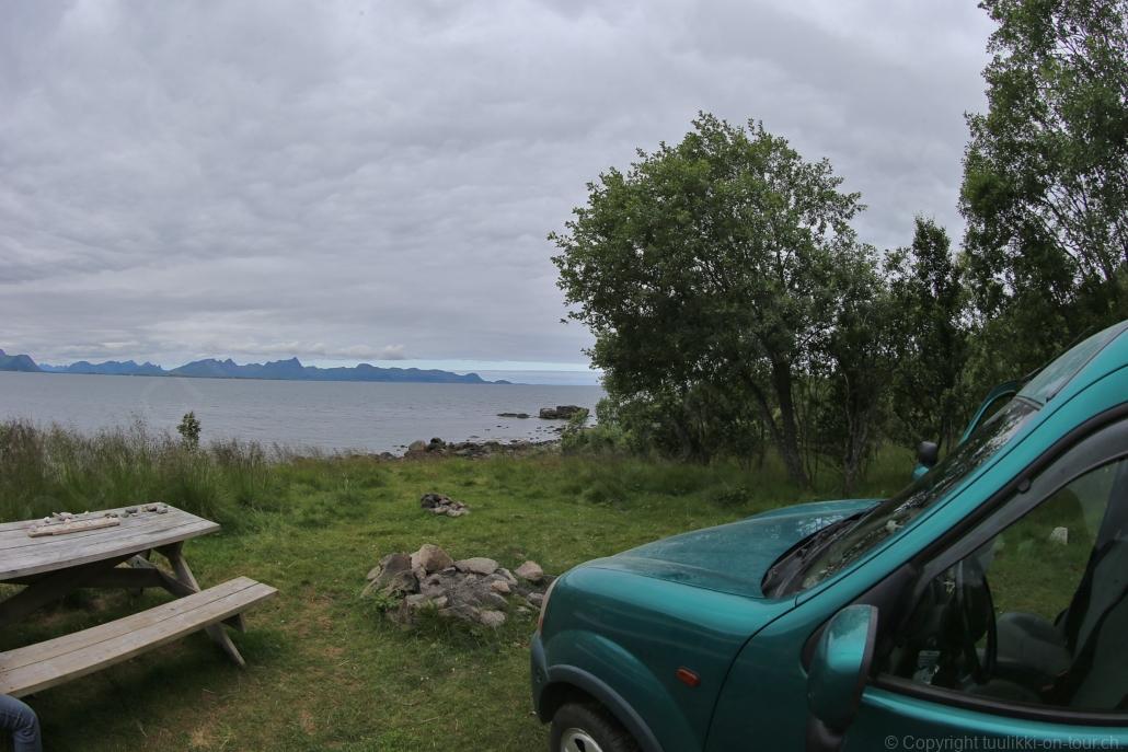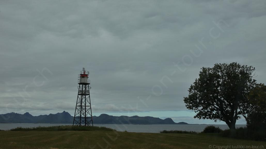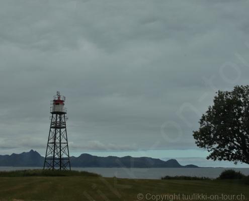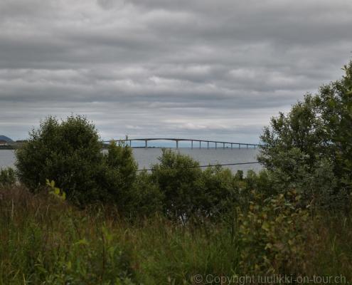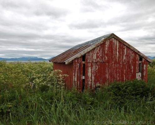 Die Westküste der zu den Vesteralen zählenden Insel Andoy zeigt sich auch heute mangels Sonne in grün und grau, was auf den Fotos weniger schön erscheint als es in Wirklichkeit ist. Trotzdem ist der ‚Auenfjord‘ besonders malerisch, eine ganze Schar von Inselchen scheint in ihm zu schwimmen. Weisse Sandstrände, die das Flair des Südens haben zeigen sich dann auf der einen Seite, aus dem Fenster gegenüber sieht man landwirtschaftliche Nutzung oder arktische Tundralandschaft. Wir kommen an einer belebten modernen Haltestelle vorbei, von der aus man bequem zum nahen Leuchtturm spazieren kann. Bei Skogvoll queren wir die hier nur 9 km breite Insel über eine Rumpelpiste bis Myre an der Ostküste und folgen dieser bis Å, der Gemeinde mit dem kürzesten Namen. Hier finden wir am Andfjord, hinter einem dekorativ mit grossen runden Steinblöcken ‚dekorierten‘, flachen Zipfel aus halb Wasser und halb Wiesland, einen perfekten Platz, um unser WoMo abzustellen und die Insel mit dem Kangoo weiter zu erfahren. Etwas weiter unten queren wir die Insel erneut, um auch den südlichsten Zipfel zu umrunden. Bald endet die geteerte schmale Strasse, ein wahrer Offroad-Trip beginnt. Es ist doch immer wieder nützlich, permanenten Allrad- und Vierpfoten-Antrieb dabei zu haben! Ein schmaler, nur gerade Renault-breiter Naturweg mit vielen Löchern führt eng dem steinigen Ufer entlang, eingerahmt von niedrig gewachsenen Birken mit Farn darunter. Ein Wegweiser macht uns auf einen Bergpfad in ein einsames Gebirgstal und auf einen 700 m hohen Hügel aufmerksam, dem wir folgen, bis uns das Hochmoor zu nass wird. Die gegenüber liegenden markanten Bergzacken spiegeln sich im ruhigen Wasser. Auf der Weiterfahrt zeigen weidende Schafe und einige verstreute Hütten die sich wieder nähernde Zivilisation an. Wir wechseln dann auf die Hauptstrasse 82, erreichen mitten am Nachmittag wieder den Ort Å und dort unser WoMo, wo wir bei toller Sicht auf Berge mit Schneeresten, Wasser und Wiese sowie Seevögeln einen späten Lunch zu uns nehmen und einen kurzen Mittagsschlaf nachholen. Wir beschliessen, den Rest des Tages und die Nacht hier zu bleiben, um morgen auf die Insel Hinnoya zu wechseln. Am Abend spazieren wir bei beginnender Bewölkungsauflockerung, ganz gemäss Wetterprognose, dem Küstenweg entlang, vorbei an kürzlich abgemähten Feldern und einem grossen Stapel der in weisse Riesenrollen gepackten Ernte.