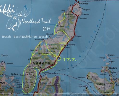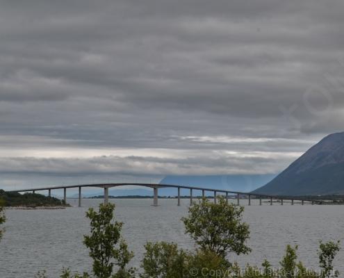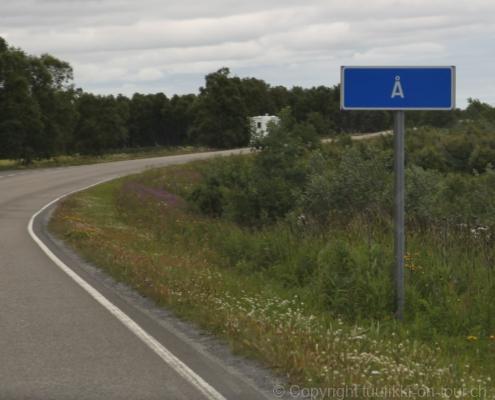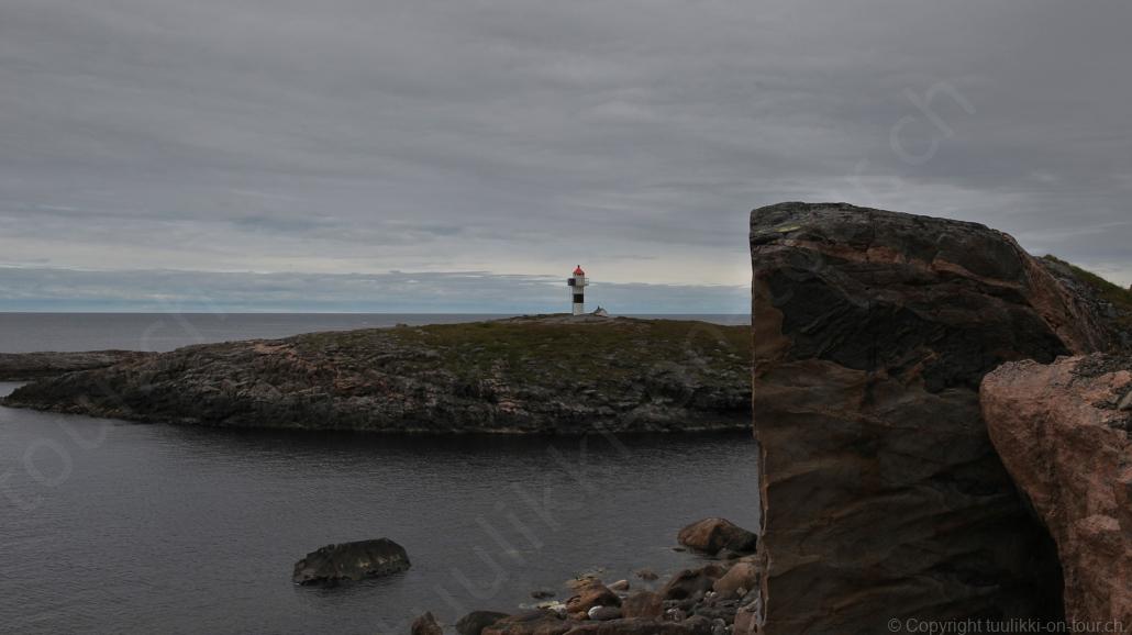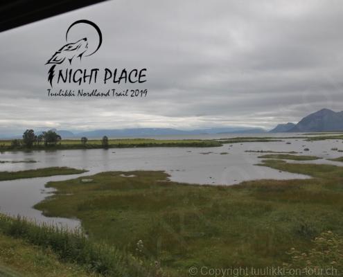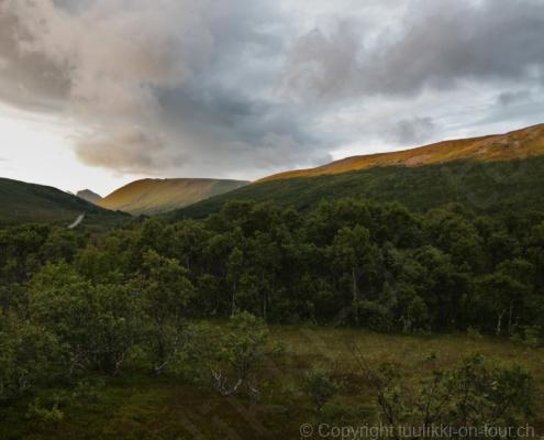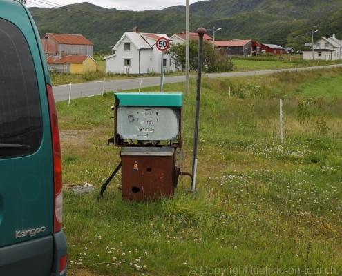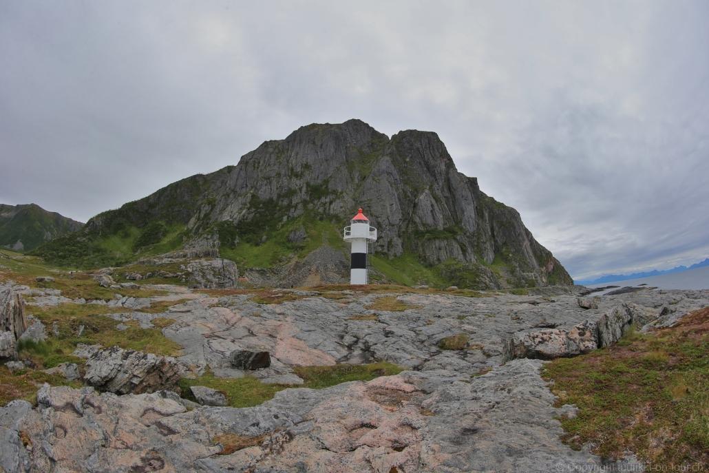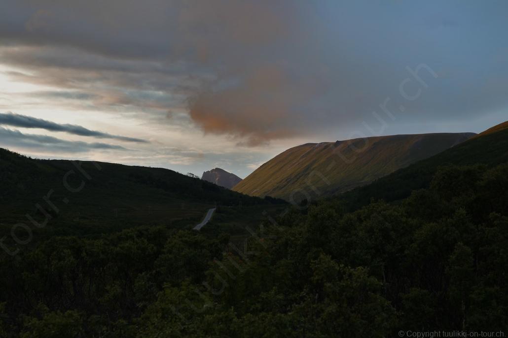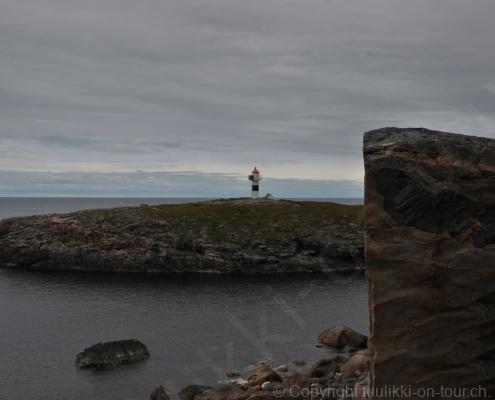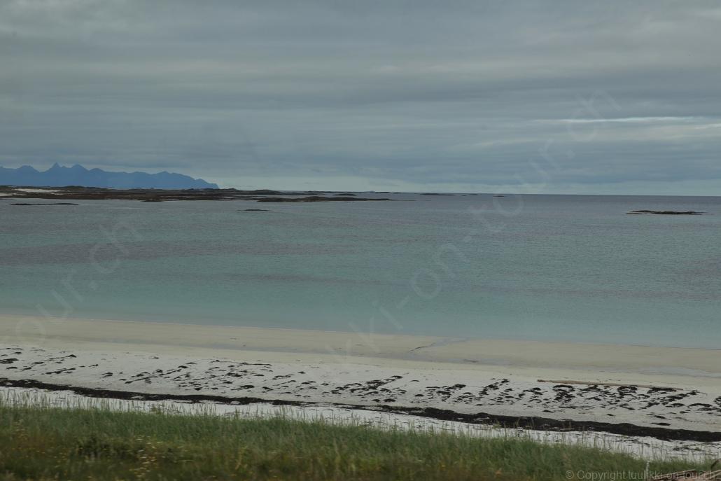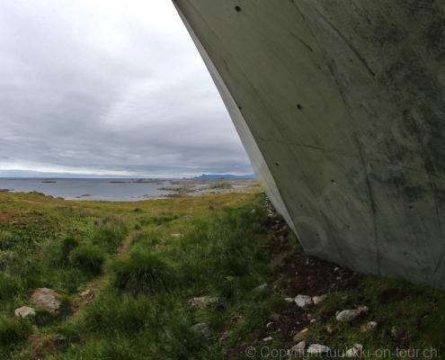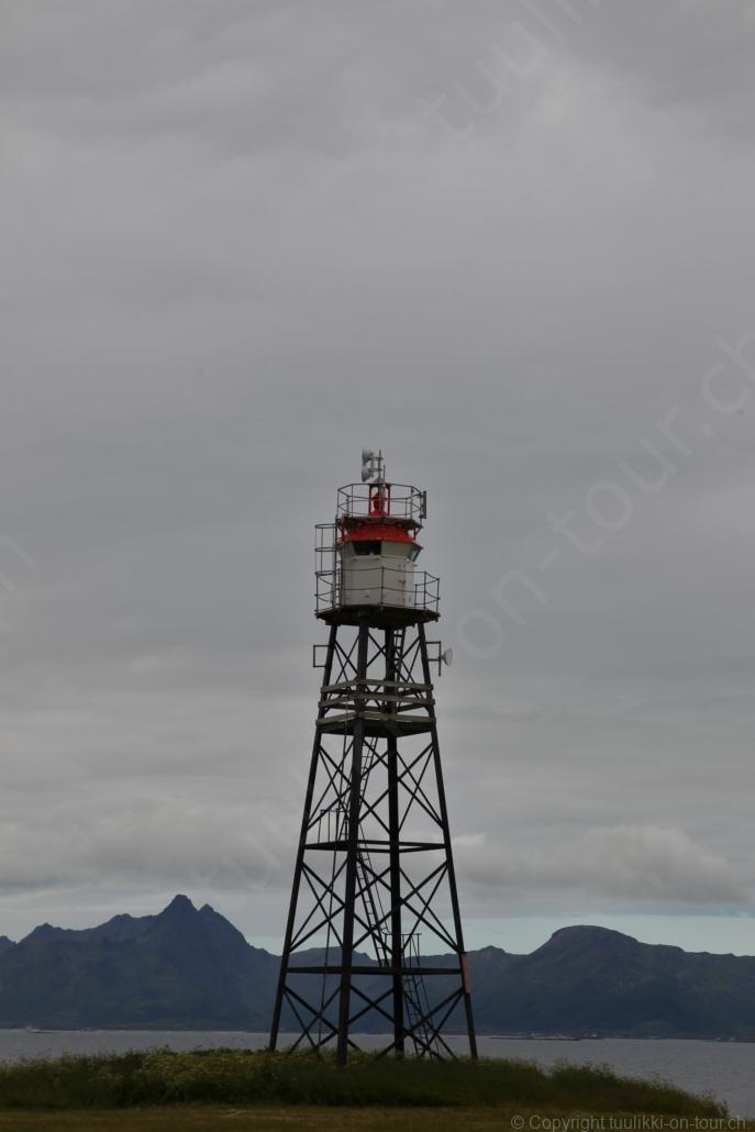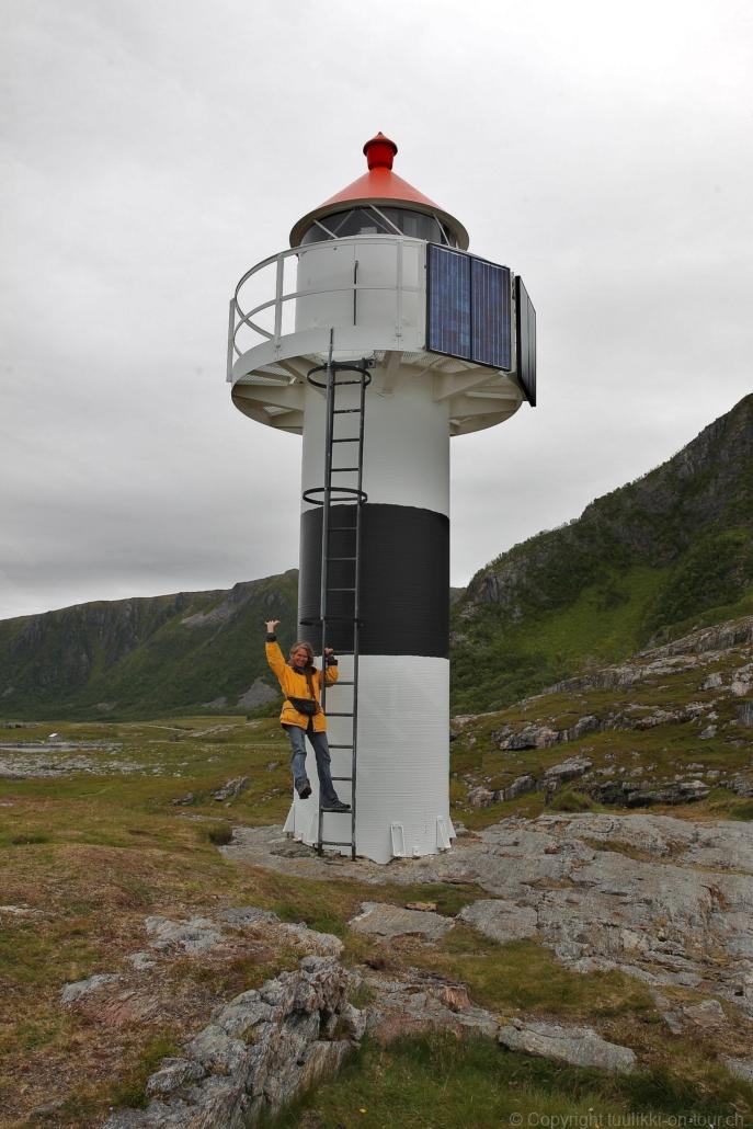 Die Westküste der zu den Vesteralen zählenden Insel Andoy zeigt sich auch heute mangels Sonne in grün und grau, was auf den Fotos weniger schön erscheint als es in Wirklichkeit ist. Trotzdem ist der ‚Auenfjord‘ besonders malerisch, eine ganze Schar von Inselchen scheint in ihm zu schwimmen. Weisse Sandstrände, die das Flair des Südens haben zeigen sich dann auf der einen Seite, aus dem Fenster gegenüber sieht man landwirtschaftliche Nutzung oder arktische Tundralandschaft. Wir kommen an einer belebten modernen Haltestelle vorbei, von der aus man bequem zum nahen Leuchtturm spazieren kann. Bei Skogvoll queren wir die hier nur 9 km breite Insel über eine Rumpelpiste bis Myre an der Ostküste und folgen dieser bis Å, der Gemeinde mit dem kürzesten Namen. Hier finden wir am Andfjord, hinter einem dekorativ mit grossen runden Steinblöcken ‚dekorierten‘, flachen Zipfel aus halb Wasser und halb Wiesland, einen perfekten Platz, um unser WoMo abzustellen und die Insel mit dem Kangoo weiter zu erfahren. Etwas weiter unten queren wir die Insel erneut, um auch den südlichsten Zipfel zu umrunden. Bald endet die geteerte schmale Strasse, ein wahrer Offroad-Trip beginnt. Es ist doch immer wieder nützlich, permanenten Allrad- und Vierpfoten-Antrieb dabei zu haben! Ein schmaler, nur gerade Renault-breiter Naturweg mit vielen Löchern führt eng dem steinigen Ufer entlang, eingerahmt von niedrig gewachsenen Birken mit Farn darunter. Ein Wegweiser macht uns auf einen Bergpfad in ein einsames Gebirgstal und auf einen 700 m hohen Hügel aufmerksam, dem wir folgen, bis uns das Hochmoor zu nass wird. Die gegenüber liegenden markanten Bergzacken spiegeln sich im ruhigen Wasser. Auf der Weiterfahrt zeigen weidende Schafe und einige verstreute Hütten die sich wieder nähernde Zivilisation an. Wir wechseln dann auf die Hauptstrasse 82, erreichen mitten am Nachmittag wieder den Ort Å und dort unser WoMo, wo wir bei toller Sicht auf Berge mit Schneeresten, Wasser und Wiese sowie Seevögeln einen späten Lunch zu uns nehmen und einen kurzen Mittagsschlaf nachholen. Wir beschliessen, den Rest des Tages und die Nacht hier zu bleiben, um morgen auf die Insel Hinnoya zu wechseln. Am Abend spazieren wir bei beginnender Bewölkungsauflockerung, ganz gemäss Wetterprognose, dem Küstenweg entlang, vorbei an kürzlich abgemähten Feldern und einem grossen Stapel der in weisse Riesenrollen gepackten Ernte.