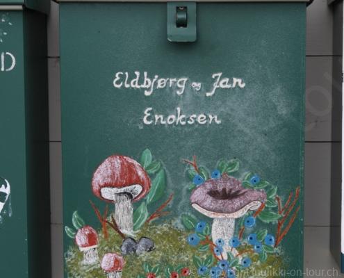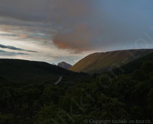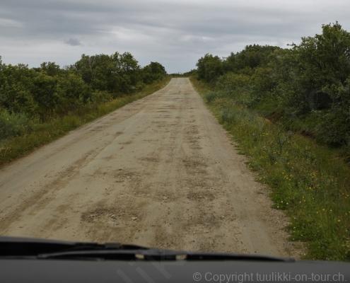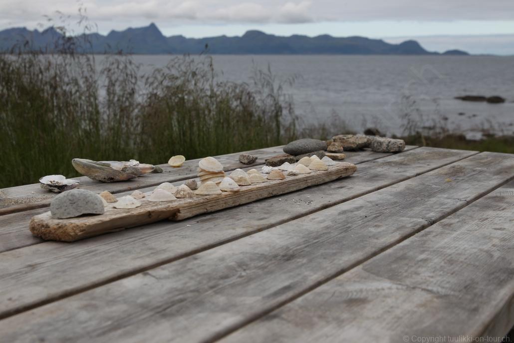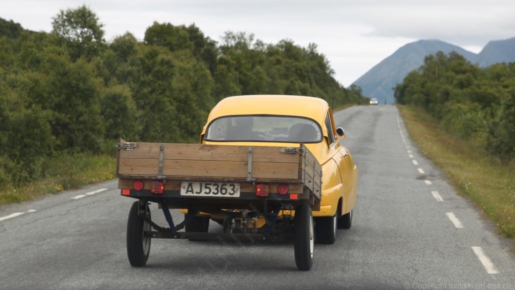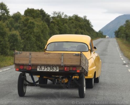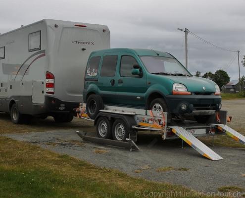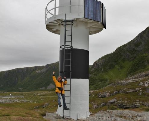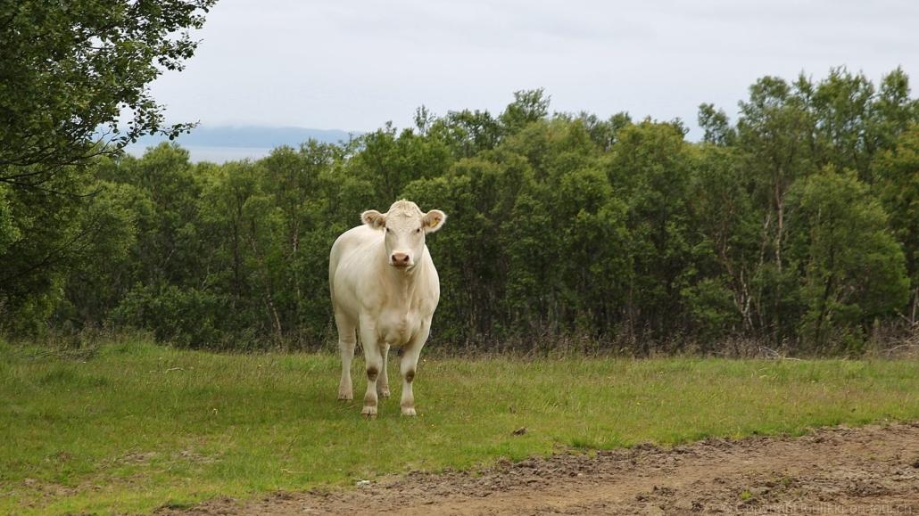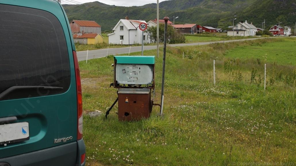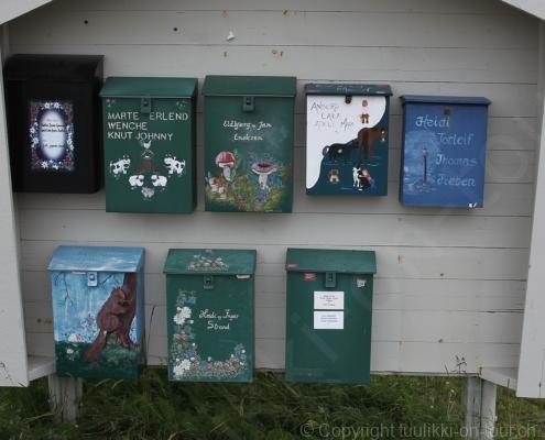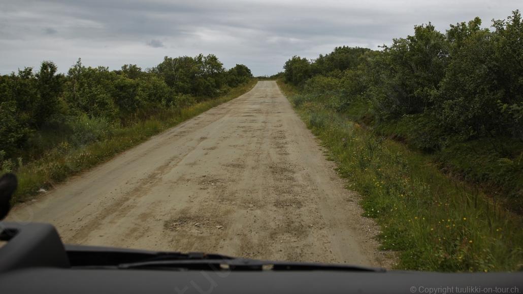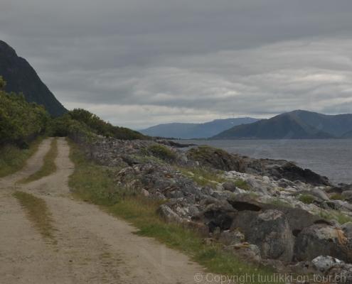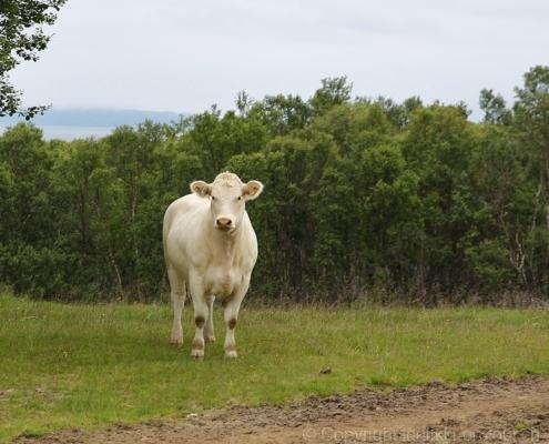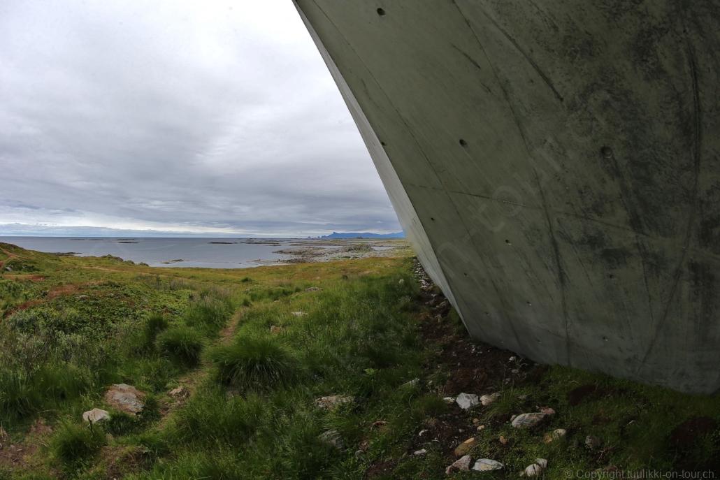 Die Westküste der zu den Vesteralen zählenden Insel Andoy zeigt sich auch heute mangels Sonne in grün und grau, was auf den Fotos weniger schön erscheint als es in Wirklichkeit ist. Trotzdem ist der ‚Auenfjord‘ besonders malerisch, eine ganze Schar von Inselchen scheint in ihm zu schwimmen. Weisse Sandstrände, die das Flair des Südens haben zeigen sich dann auf der einen Seite, aus dem Fenster gegenüber sieht man landwirtschaftliche Nutzung oder arktische Tundralandschaft. Wir kommen an einer belebten modernen Haltestelle vorbei, von der aus man bequem zum nahen Leuchtturm spazieren kann. Bei Skogvoll queren wir die hier nur 9 km breite Insel über eine Rumpelpiste bis Myre an der Ostküste und folgen dieser bis Å, der Gemeinde mit dem kürzesten Namen. Hier finden wir am Andfjord, hinter einem dekorativ mit grossen runden Steinblöcken ‚dekorierten‘, flachen Zipfel aus halb Wasser und halb Wiesland, einen perfekten Platz, um unser WoMo abzustellen und die Insel mit dem Kangoo weiter zu erfahren. Etwas weiter unten queren wir die Insel erneut, um auch den südlichsten Zipfel zu umrunden. Bald endet die geteerte schmale Strasse, ein wahrer Offroad-Trip beginnt. Es ist doch immer wieder nützlich, permanenten Allrad- und Vierpfoten-Antrieb dabei zu haben! Ein schmaler, nur gerade Renault-breiter Naturweg mit vielen Löchern führt eng dem steinigen Ufer entlang, eingerahmt von niedrig gewachsenen Birken mit Farn darunter. Ein Wegweiser macht uns auf einen Bergpfad in ein einsames Gebirgstal und auf einen 700 m hohen Hügel aufmerksam, dem wir folgen, bis uns das Hochmoor zu nass wird. Die gegenüber liegenden markanten Bergzacken spiegeln sich im ruhigen Wasser. Auf der Weiterfahrt zeigen weidende Schafe und einige verstreute Hütten die sich wieder nähernde Zivilisation an. Wir wechseln dann auf die Hauptstrasse 82, erreichen mitten am Nachmittag wieder den Ort Å und dort unser WoMo, wo wir bei toller Sicht auf Berge mit Schneeresten, Wasser und Wiese sowie Seevögeln einen späten Lunch zu uns nehmen und einen kurzen Mittagsschlaf nachholen. Wir beschliessen, den Rest des Tages und die Nacht hier zu bleiben, um morgen auf die Insel Hinnoya zu wechseln. Am Abend spazieren wir bei beginnender Bewölkungsauflockerung, ganz gemäss Wetterprognose, dem Küstenweg entlang, vorbei an kürzlich abgemähten Feldern und einem grossen Stapel der in weisse Riesenrollen gepackten Ernte.