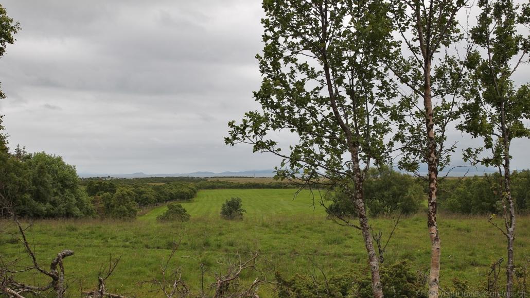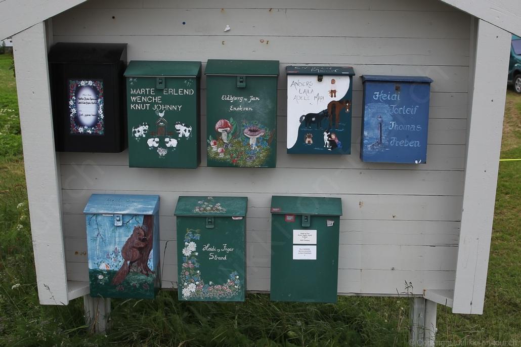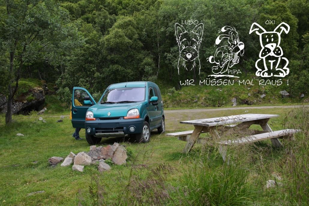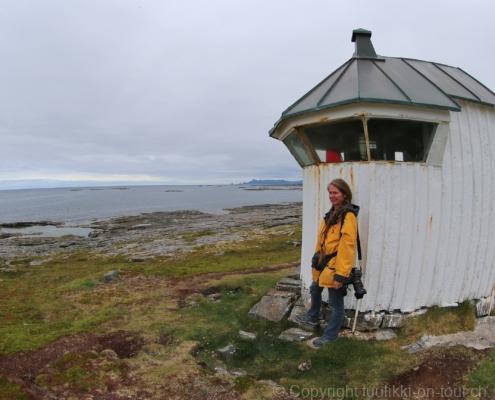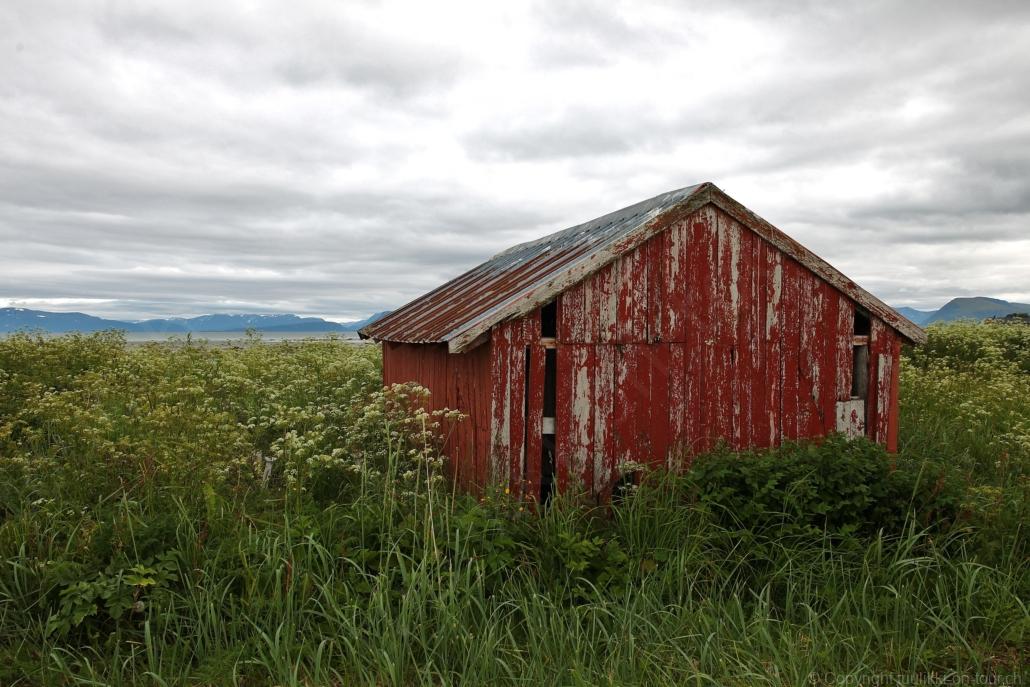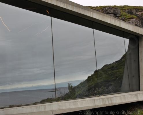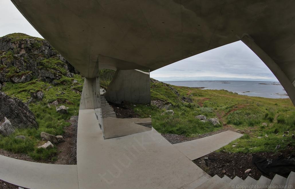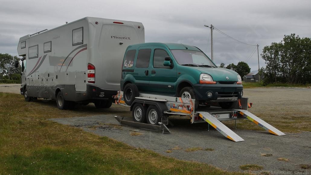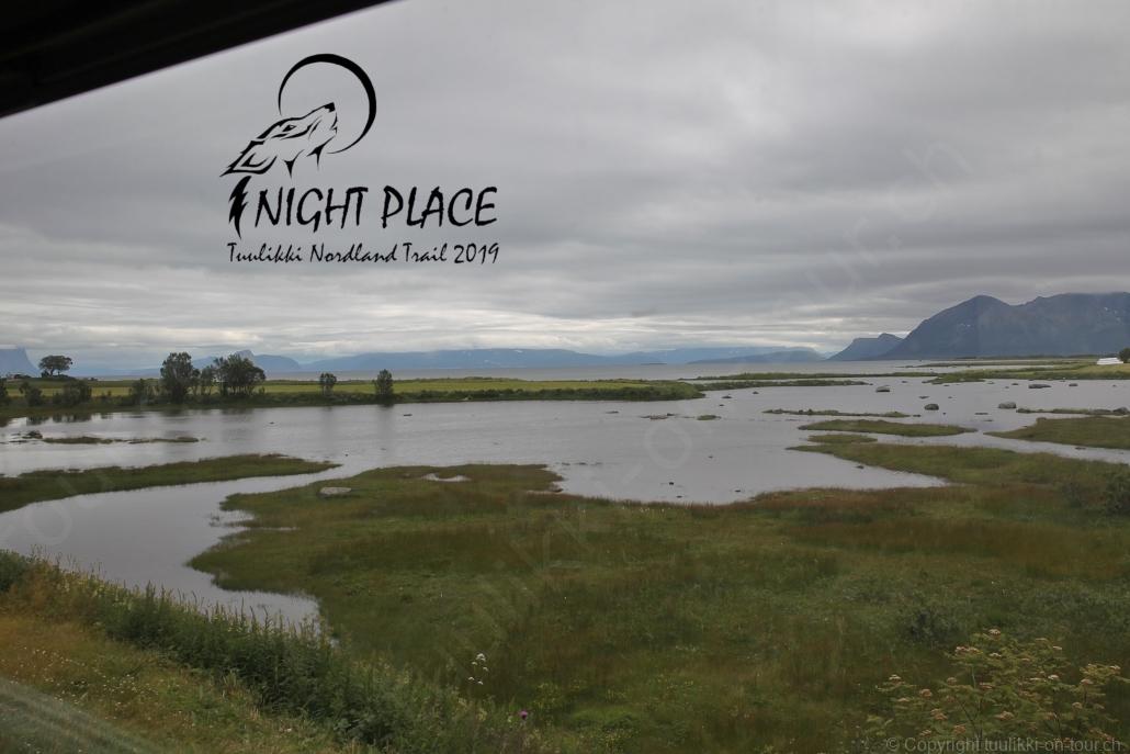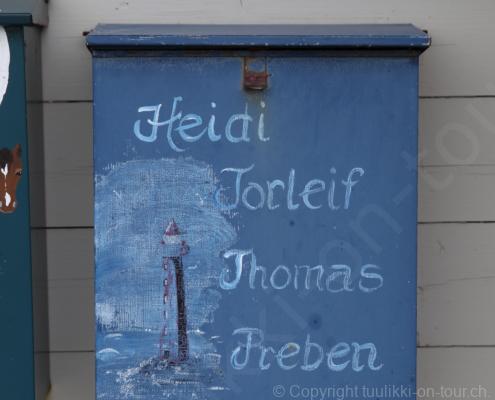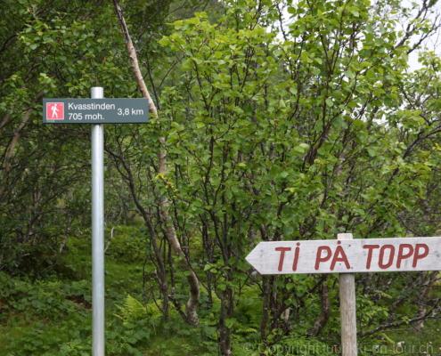 Die Westküste der zu den Vesteralen zählenden Insel Andoy zeigt sich auch heute mangels Sonne in grün und grau, was auf den Fotos weniger schön erscheint als es in Wirklichkeit ist. Trotzdem ist der ‚Auenfjord‘ besonders malerisch, eine ganze Schar von Inselchen scheint in ihm zu schwimmen. Weisse Sandstrände, die das Flair des Südens haben zeigen sich dann auf der einen Seite, aus dem Fenster gegenüber sieht man landwirtschaftliche Nutzung oder arktische Tundralandschaft. Wir kommen an einer belebten modernen Haltestelle vorbei, von der aus man bequem zum nahen Leuchtturm spazieren kann. Bei Skogvoll queren wir die hier nur 9 km breite Insel über eine Rumpelpiste bis Myre an der Ostküste und folgen dieser bis Å, der Gemeinde mit dem kürzesten Namen. Hier finden wir am Andfjord, hinter einem dekorativ mit grossen runden Steinblöcken ‚dekorierten‘, flachen Zipfel aus halb Wasser und halb Wiesland, einen perfekten Platz, um unser WoMo abzustellen und die Insel mit dem Kangoo weiter zu erfahren. Etwas weiter unten queren wir die Insel erneut, um auch den südlichsten Zipfel zu umrunden. Bald endet die geteerte schmale Strasse, ein wahrer Offroad-Trip beginnt. Es ist doch immer wieder nützlich, permanenten Allrad- und Vierpfoten-Antrieb dabei zu haben! Ein schmaler, nur gerade Renault-breiter Naturweg mit vielen Löchern führt eng dem steinigen Ufer entlang, eingerahmt von niedrig gewachsenen Birken mit Farn darunter. Ein Wegweiser macht uns auf einen Bergpfad in ein einsames Gebirgstal und auf einen 700 m hohen Hügel aufmerksam, dem wir folgen, bis uns das Hochmoor zu nass wird. Die gegenüber liegenden markanten Bergzacken spiegeln sich im ruhigen Wasser. Auf der Weiterfahrt zeigen weidende Schafe und einige verstreute Hütten die sich wieder nähernde Zivilisation an. Wir wechseln dann auf die Hauptstrasse 82, erreichen mitten am Nachmittag wieder den Ort Å und dort unser WoMo, wo wir bei toller Sicht auf Berge mit Schneeresten, Wasser und Wiese sowie Seevögeln einen späten Lunch zu uns nehmen und einen kurzen Mittagsschlaf nachholen. Wir beschliessen, den Rest des Tages und die Nacht hier zu bleiben, um morgen auf die Insel Hinnoya zu wechseln. Am Abend spazieren wir bei beginnender Bewölkungsauflockerung, ganz gemäss Wetterprognose, dem Küstenweg entlang, vorbei an kürzlich abgemähten Feldern und einem grossen Stapel der in weisse Riesenrollen gepackten Ernte.