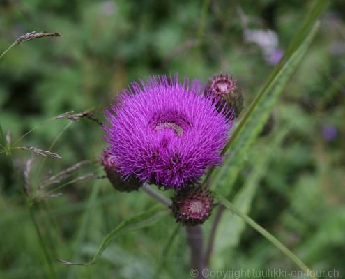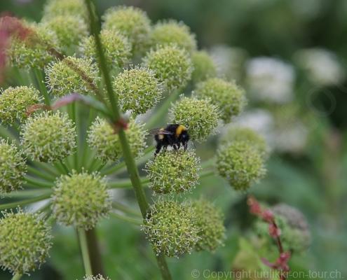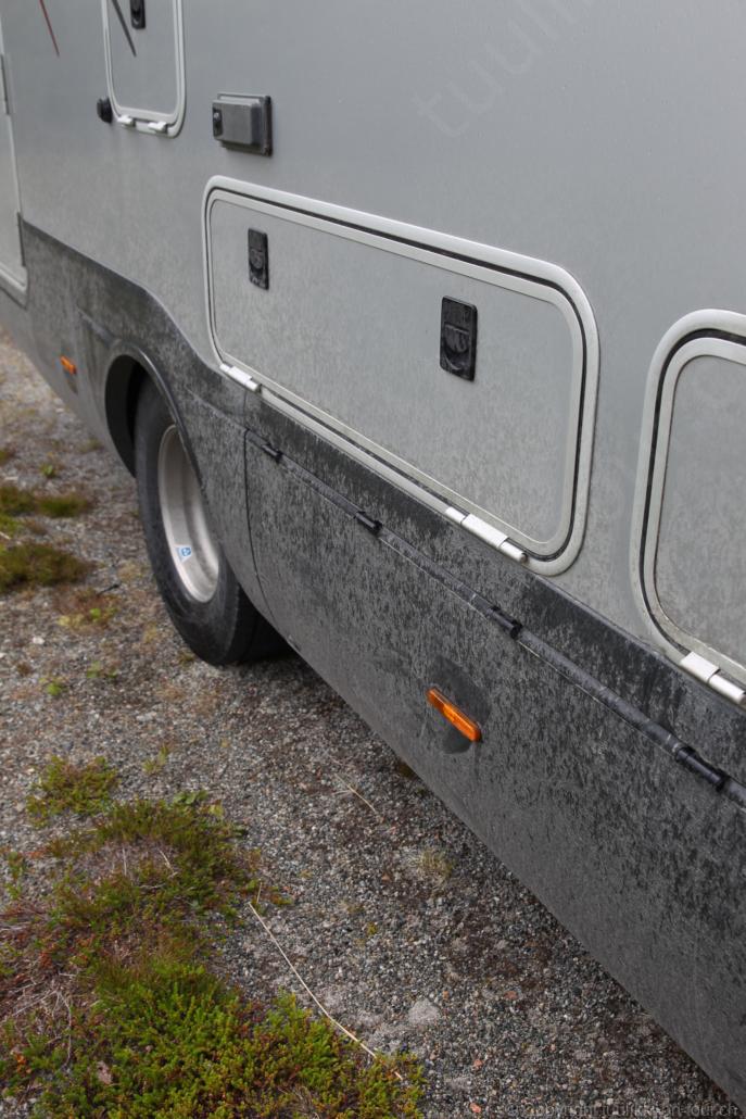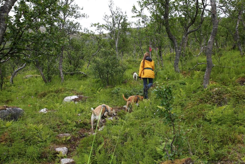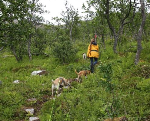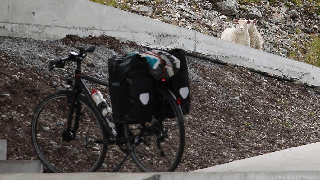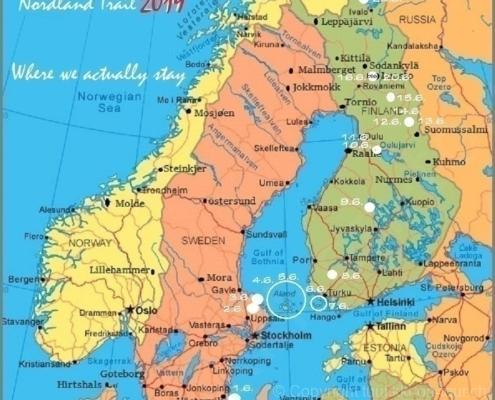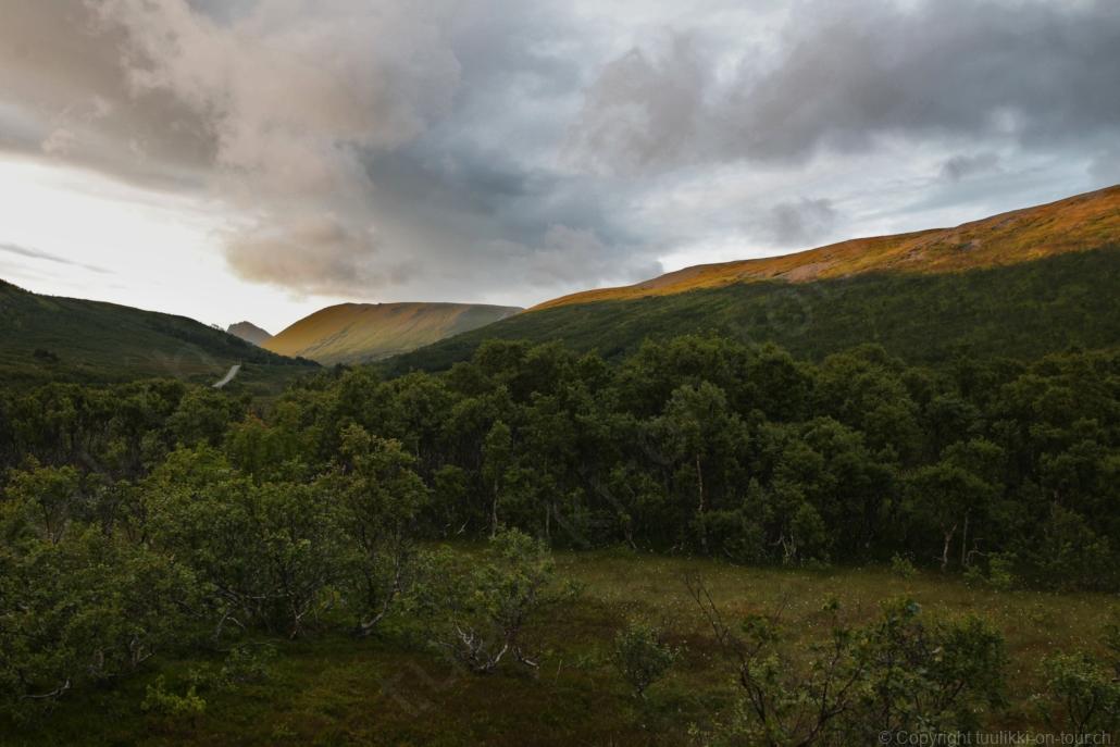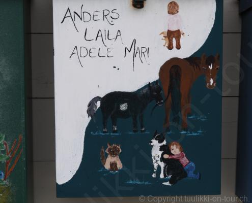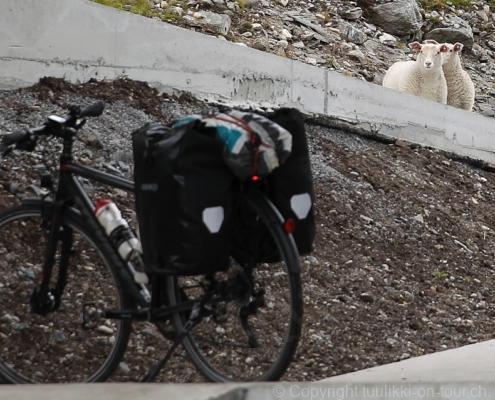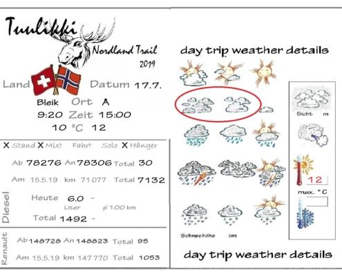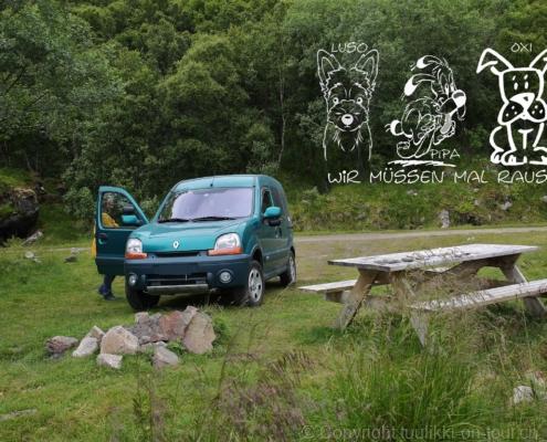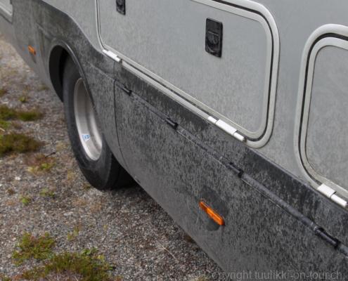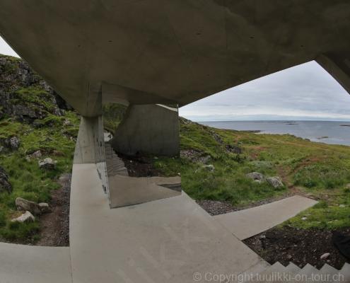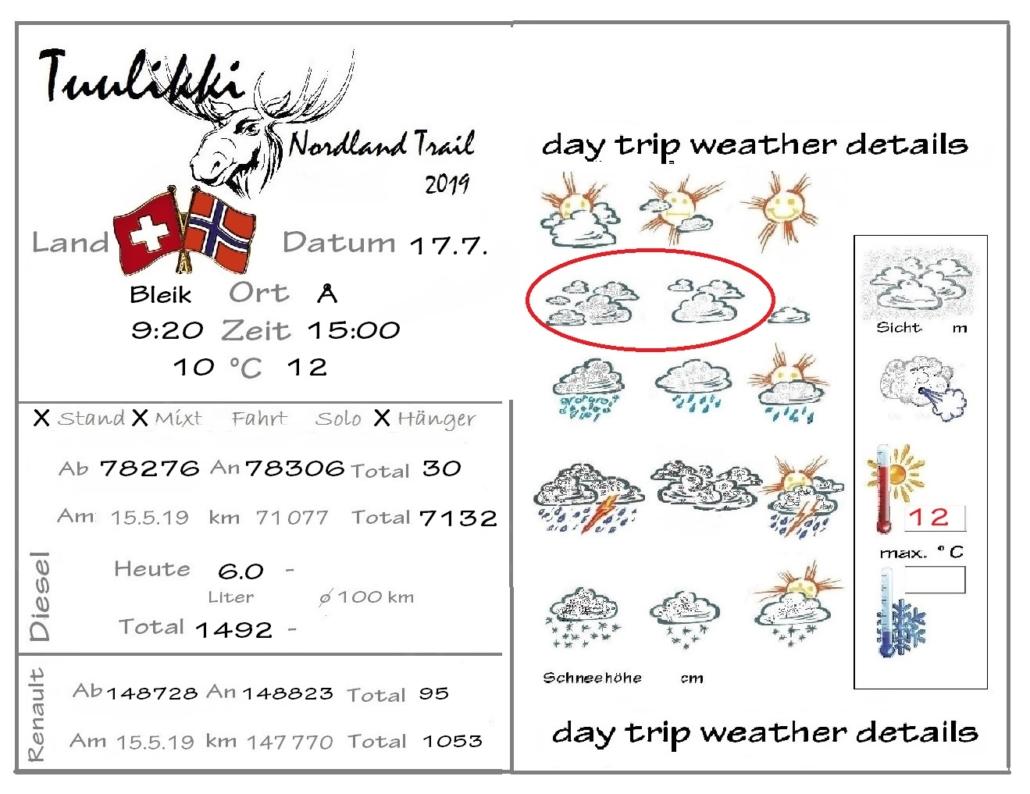 Die Westküste der zu den Vesteralen zählenden Insel Andoy zeigt sich auch heute mangels Sonne in grün und grau, was auf den Fotos weniger schön erscheint als es in Wirklichkeit ist. Trotzdem ist der ‚Auenfjord‘ besonders malerisch, eine ganze Schar von Inselchen scheint in ihm zu schwimmen. Weisse Sandstrände, die das Flair des Südens haben zeigen sich dann auf der einen Seite, aus dem Fenster gegenüber sieht man landwirtschaftliche Nutzung oder arktische Tundralandschaft. Wir kommen an einer belebten modernen Haltestelle vorbei, von der aus man bequem zum nahen Leuchtturm spazieren kann. Bei Skogvoll queren wir die hier nur 9 km breite Insel über eine Rumpelpiste bis Myre an der Ostküste und folgen dieser bis Å, der Gemeinde mit dem kürzesten Namen. Hier finden wir am Andfjord, hinter einem dekorativ mit grossen runden Steinblöcken ‚dekorierten‘, flachen Zipfel aus halb Wasser und halb Wiesland, einen perfekten Platz, um unser WoMo abzustellen und die Insel mit dem Kangoo weiter zu erfahren. Etwas weiter unten queren wir die Insel erneut, um auch den südlichsten Zipfel zu umrunden. Bald endet die geteerte schmale Strasse, ein wahrer Offroad-Trip beginnt. Es ist doch immer wieder nützlich, permanenten Allrad- und Vierpfoten-Antrieb dabei zu haben! Ein schmaler, nur gerade Renault-breiter Naturweg mit vielen Löchern führt eng dem steinigen Ufer entlang, eingerahmt von niedrig gewachsenen Birken mit Farn darunter. Ein Wegweiser macht uns auf einen Bergpfad in ein einsames Gebirgstal und auf einen 700 m hohen Hügel aufmerksam, dem wir folgen, bis uns das Hochmoor zu nass wird. Die gegenüber liegenden markanten Bergzacken spiegeln sich im ruhigen Wasser. Auf der Weiterfahrt zeigen weidende Schafe und einige verstreute Hütten die sich wieder nähernde Zivilisation an. Wir wechseln dann auf die Hauptstrasse 82, erreichen mitten am Nachmittag wieder den Ort Å und dort unser WoMo, wo wir bei toller Sicht auf Berge mit Schneeresten, Wasser und Wiese sowie Seevögeln einen späten Lunch zu uns nehmen und einen kurzen Mittagsschlaf nachholen. Wir beschliessen, den Rest des Tages und die Nacht hier zu bleiben, um morgen auf die Insel Hinnoya zu wechseln. Am Abend spazieren wir bei beginnender Bewölkungsauflockerung, ganz gemäss Wetterprognose, dem Küstenweg entlang, vorbei an kürzlich abgemähten Feldern und einem grossen Stapel der in weisse Riesenrollen gepackten Ernte.