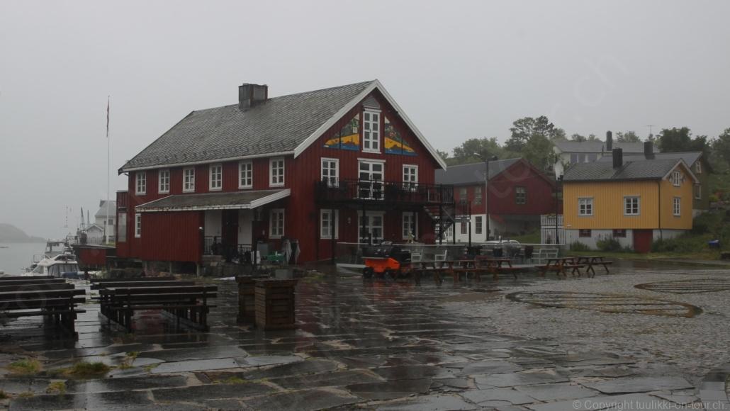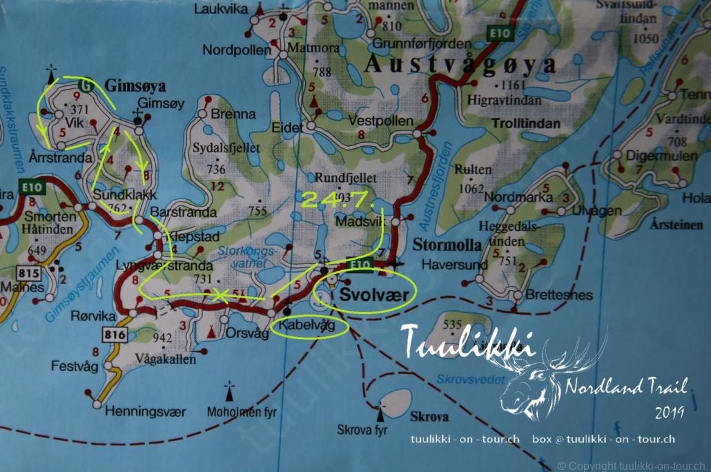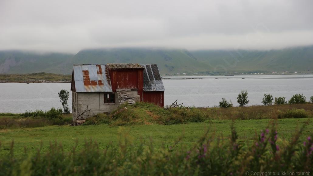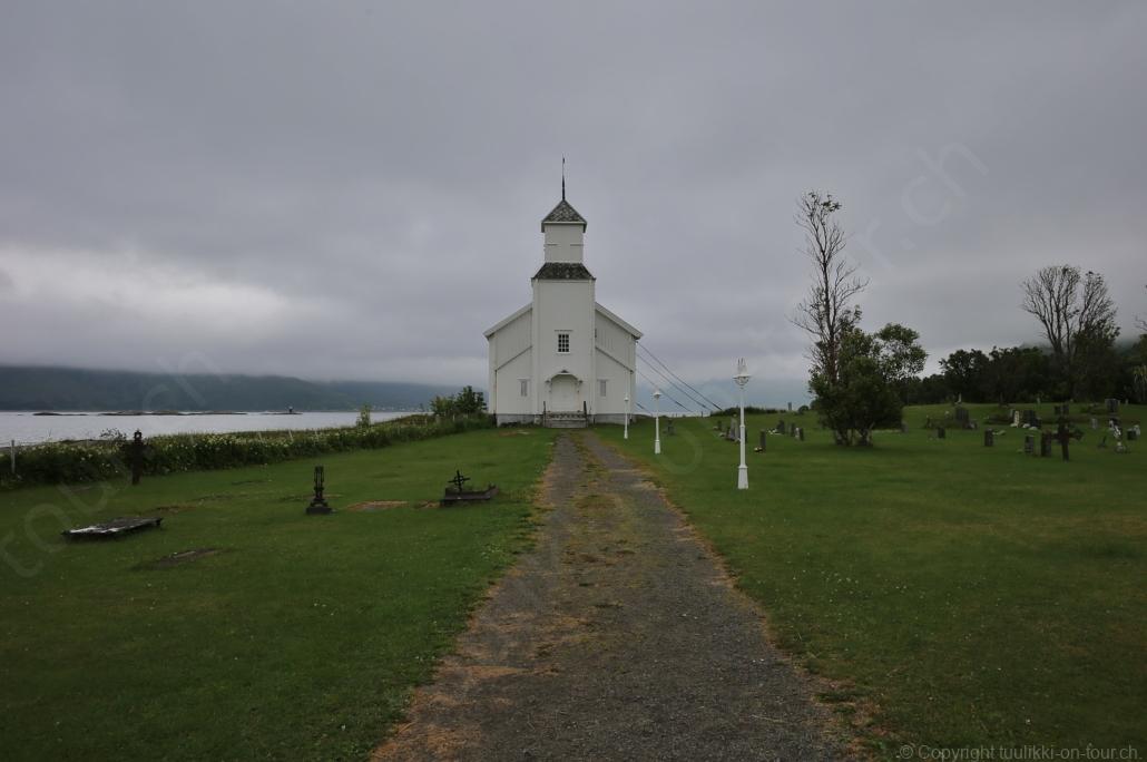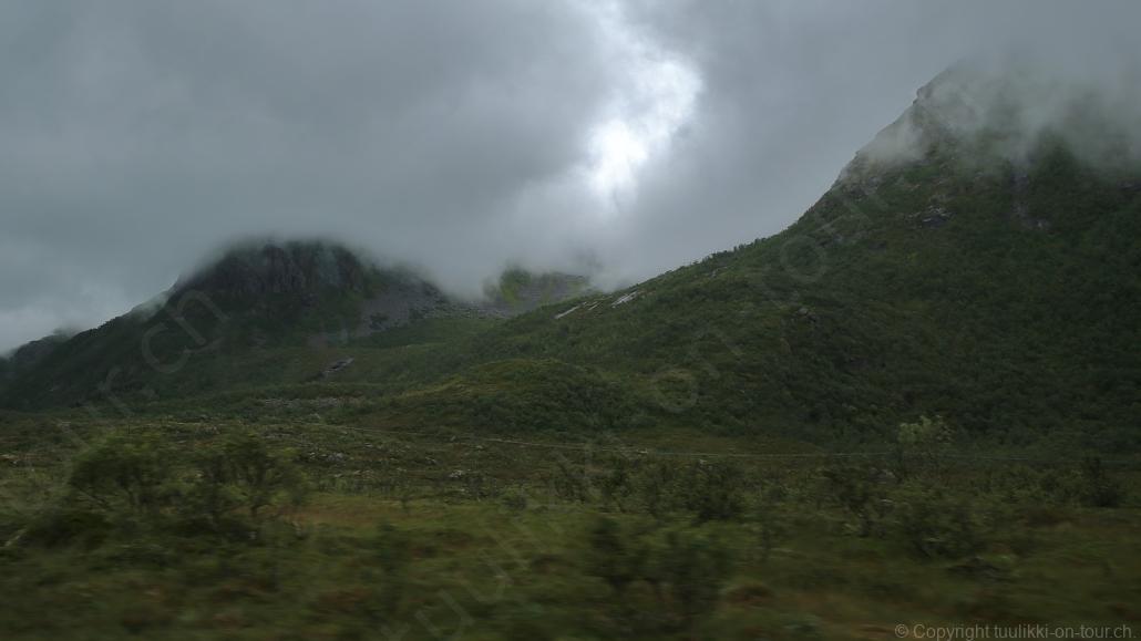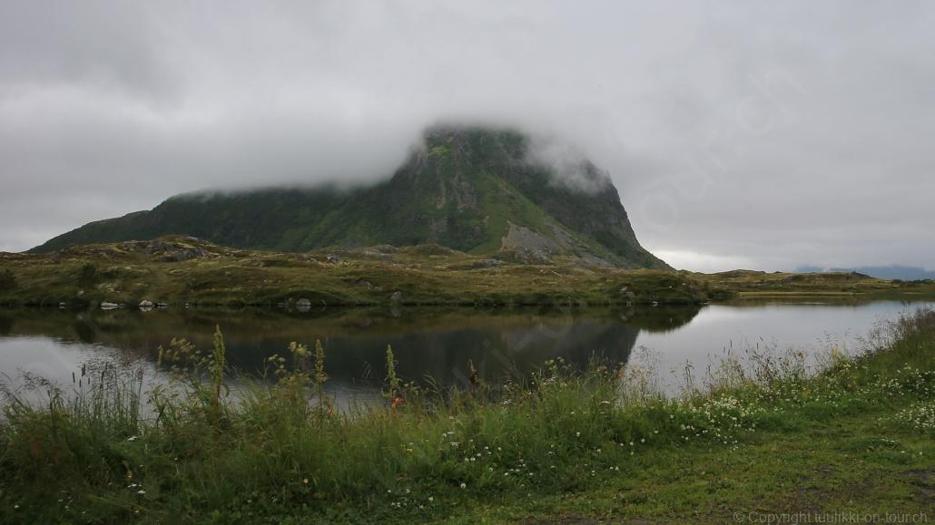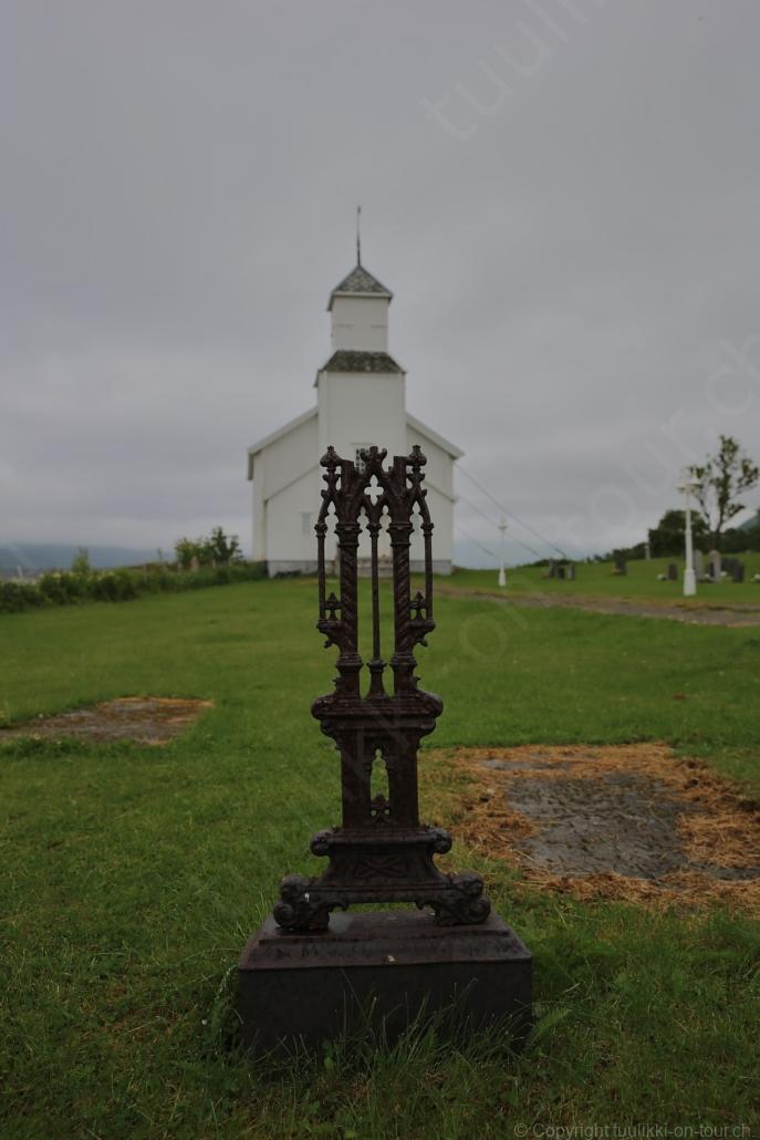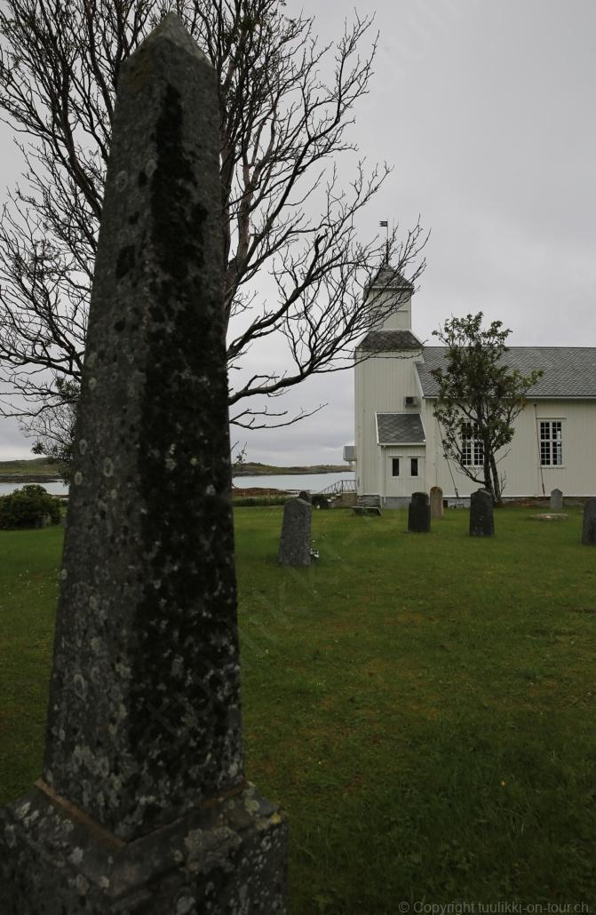 Trüb und nass mit tiefhängenden Wolken über den Bergketten und um einiges kühler (ca. 14°C) beginnt der heutige Tag. Diese Temperatur geniessen wir geradezu, wenn wir bedenken, dass es in der Schweiz zur Zeit 34-37°C heiss ist! Hier ist es richtiges Schlaf- und Fress-Wetter und so entscheiden wir, unser Programm entsprechend zu gestalten. Wir lassen die Hunde im WoMo und schauen uns während den nächsten Stunden die beiden Orte Svolvær und Kabelvåg etwas genauer an. Svolvær’s Strassen sollen im Winter mit Skifahrern gefüllt sein, im Sommer – zumindest an Nicht-Regentagen – mit Touristen, die das farbenfrohe Stadtbild, das hier herrschende Licht und die zahlreichen Galerien und Museen schätzen. Heute morgen aber sind nur einige Hartgesottene auszumachen, die unter dem Regenschirm die Stadt zu entdecken suchen und solche, die in einen Laden reinspazieren und umgezogen, in einheitliches Ölzeugs gekleidet wieder rauskommen um in einem Boot Platz zu nehmen. Ich kann mir nicht vorstellen, dass die bei dieser Seeadler Tour viel sehen werden. Auch die ca. 3000 Fischer, die in der Hauptfangzeit bis zu 50‘000 Tonnen Kabeljau fangen, können wir nicht sehen (aber die Hauptfangzeit von Januar bis April ist ja vorbei). Wir sind schon pflotschnass, als wir zum ältesten Fischerdorf der Lofoten, das auch einmal das grösste war, in Kabelvåg unsere Besichtigung weiterführen. Die umliegenden Inseln, die steil aufragenden Berge und schöne Strände sowie geschützte Buchten sind üblicherweise die perfekte Kulisse für Fotos. Heute ist davon aber nicht viel zu sehen, wir konzentrieren uns auf die malerischen und kulinarischen Seiten im Ort. Hier hat es nämlich eine Bäckerei, die frisches, knuspriges Brot aller Arten und vegane Spezialitäten (aus D importiert) anbietet und offensichtlich damit Erfolg hat, ist doch das angegliederte Café gut besucht. Die Hunde kommen gähnend und sich streckend auf ihren Betten, als wir die WoMo-Türe öffnen und scheinen uns sagen zu wollen „was, ihr seid schon zurück“. Gewisse innere Widerstände müssen sie sichtlich überwinden, um in ihre ‚Gstältli‘ zu schlüpfen und ins nasse Wetter raus zu hüpfen. Also lassen wir sie nach dem Mittags-Ausgang wieder schlafen, während wir zwei uns entschliessen, eine Nachmittagsrunde auf die Insel Gimsøya anzuhängen. 35 km später zweigen wir von der E10 auf eine Kommunalstrasse ab, die um die Insel führt und schöne Ausblicke auf die Inselwelt bietet. Letztere fällt ziemlich aus dem landschaftlichen Rahmen der ansonsten bergigen und zerklüfteten Lofoten. Es präsentiert sich eine flache, weite, offene Landschaft. Etwa zwei Drittel von Gimsøya sind mit Torfmooren bedeckt, welche in den vergangenen Zeiten – der Torfabbau wurde im grossen Stil betrieben – den einzigen Brennstoff auf den Lofoten bot. Heute steht die ganze Insel unter Naturschutz … ein Golfplatz wurde aber im nördlichsten Zipfel trotzdem angelegt. Die weisse Holzkirche von 1876 ist ein echter Hingucker; sie wurde quasi am Strand gebaut und bergseits mit Stahlstangen gesichert, um nicht vom Sturm fortgetragen zu werden. Um die Kirche herum liegt der Friedhof mit uralten, z.T. gusseisernen Grabplatten. Zwischenzeitlich sind Waschmaschine und Trockner gelaufen und wir freuen uns auf ein frisch angezogenes, frühlingshaft duftendes Bett. Zuvor aber – die Wolken haben sich ausgeregnet – lassen wir die Hunde nochmals raus und kochen dann einen Süsskartoffel-Kürbis-Cornatur Eintopf an einer Kokosnussmilch-Sauce.