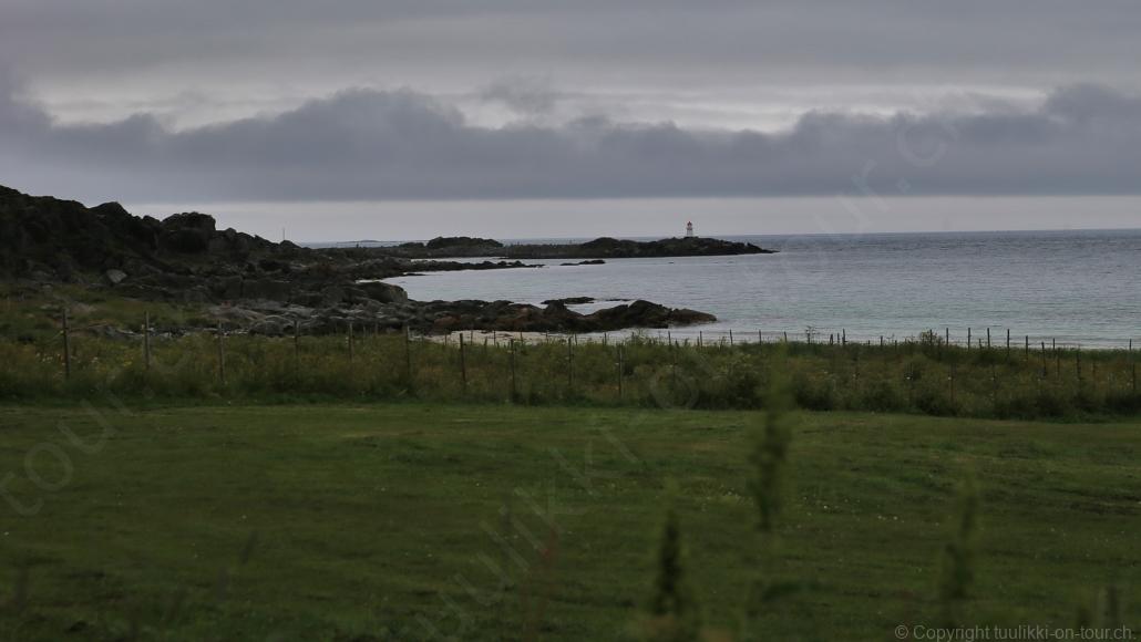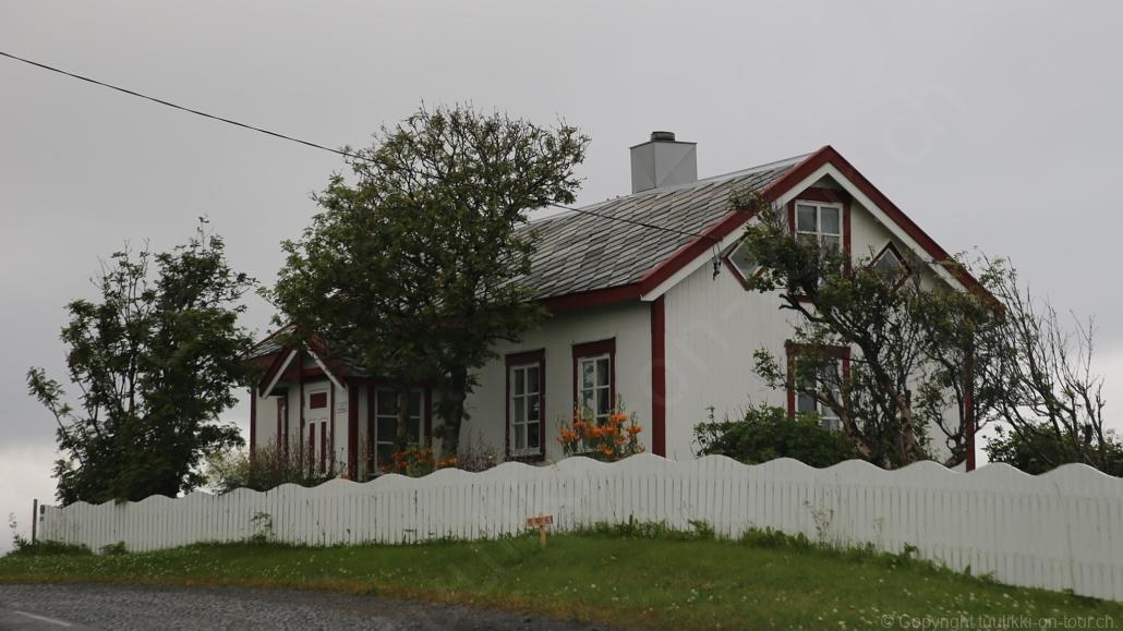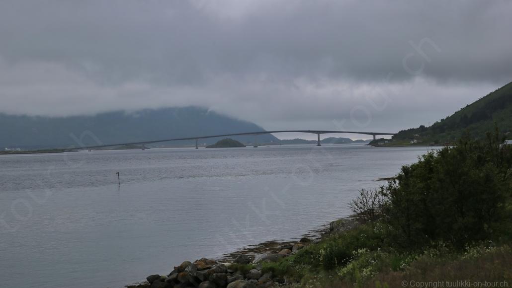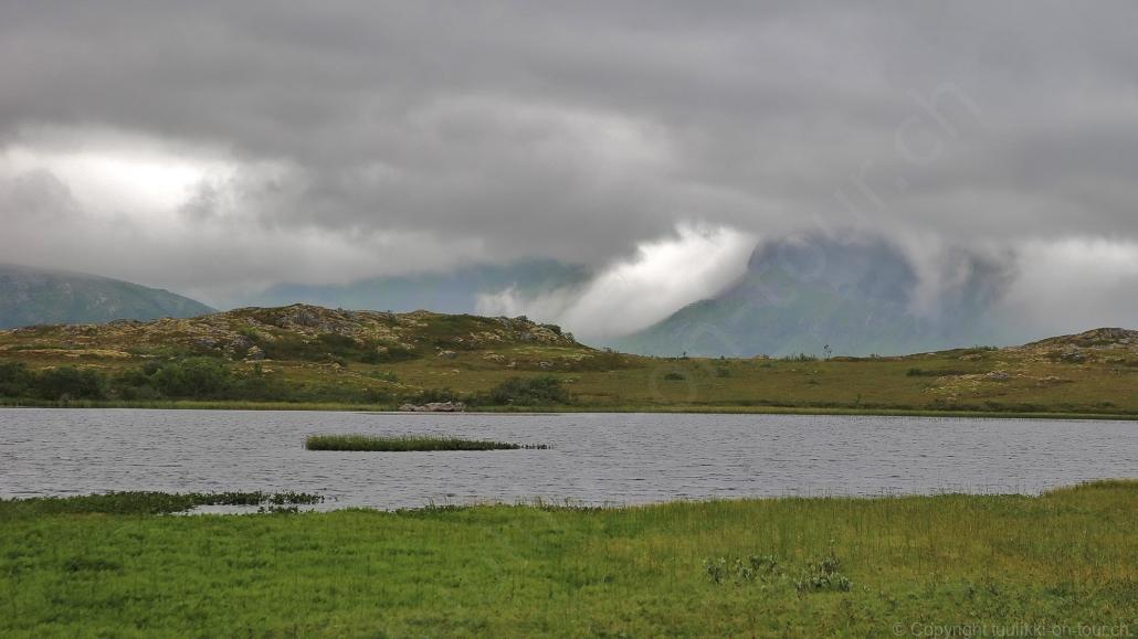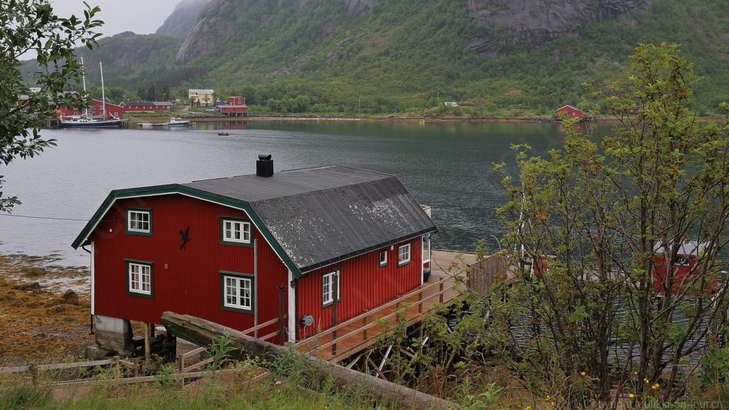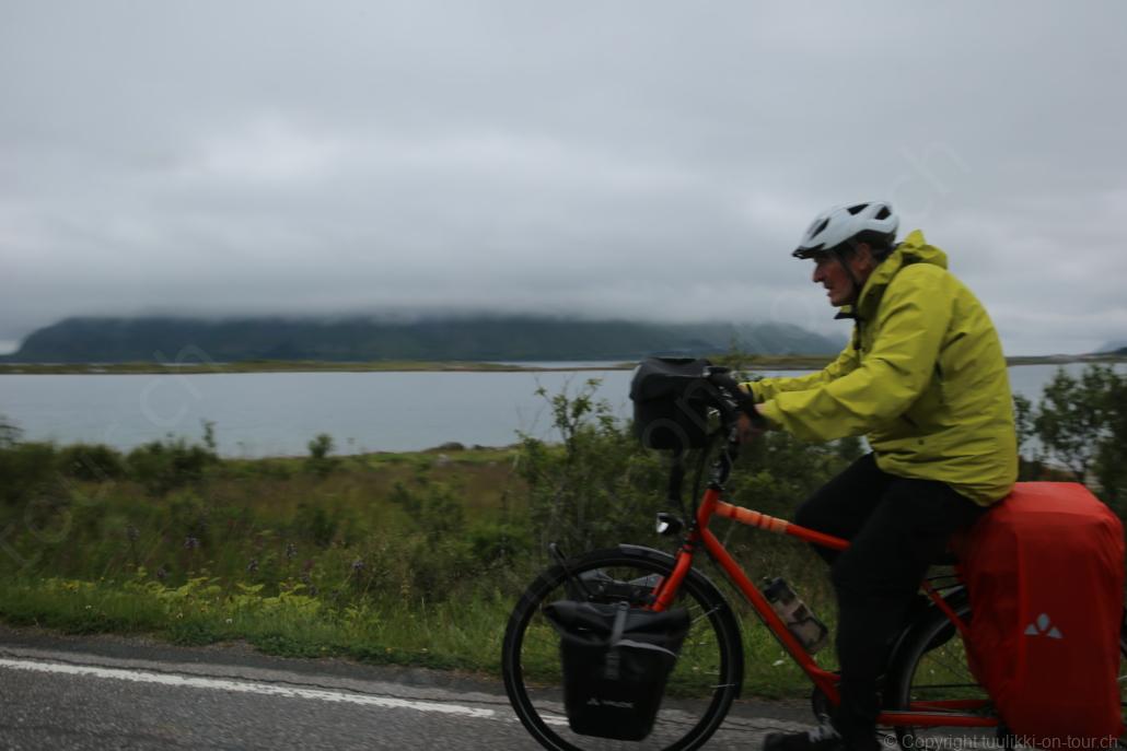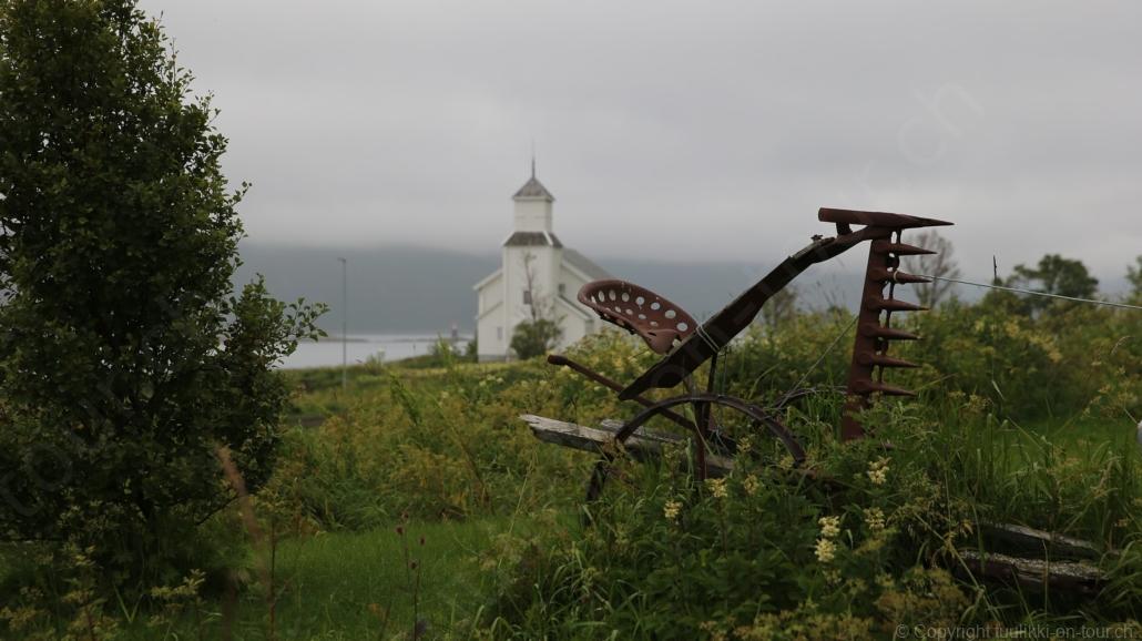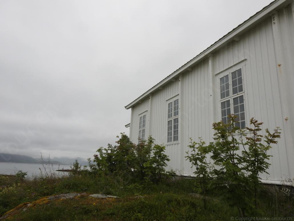 Trüb und nass mit tiefhängenden Wolken über den Bergketten und um einiges kühler (ca. 14°C) beginnt der heutige Tag. Diese Temperatur geniessen wir geradezu, wenn wir bedenken, dass es in der Schweiz zur Zeit 34-37°C heiss ist! Hier ist es richtiges Schlaf- und Fress-Wetter und so entscheiden wir, unser Programm entsprechend zu gestalten. Wir lassen die Hunde im WoMo und schauen uns während den nächsten Stunden die beiden Orte Svolvær und Kabelvåg etwas genauer an. Svolvær’s Strassen sollen im Winter mit Skifahrern gefüllt sein, im Sommer – zumindest an Nicht-Regentagen – mit Touristen, die das farbenfrohe Stadtbild, das hier herrschende Licht und die zahlreichen Galerien und Museen schätzen. Heute morgen aber sind nur einige Hartgesottene auszumachen, die unter dem Regenschirm die Stadt zu entdecken suchen und solche, die in einen Laden reinspazieren und umgezogen, in einheitliches Ölzeugs gekleidet wieder rauskommen um in einem Boot Platz zu nehmen. Ich kann mir nicht vorstellen, dass die bei dieser Seeadler Tour viel sehen werden. Auch die ca. 3000 Fischer, die in der Hauptfangzeit bis zu 50‘000 Tonnen Kabeljau fangen, können wir nicht sehen (aber die Hauptfangzeit von Januar bis April ist ja vorbei). Wir sind schon pflotschnass, als wir zum ältesten Fischerdorf der Lofoten, das auch einmal das grösste war, in Kabelvåg unsere Besichtigung weiterführen. Die umliegenden Inseln, die steil aufragenden Berge und schöne Strände sowie geschützte Buchten sind üblicherweise die perfekte Kulisse für Fotos. Heute ist davon aber nicht viel zu sehen, wir konzentrieren uns auf die malerischen und kulinarischen Seiten im Ort. Hier hat es nämlich eine Bäckerei, die frisches, knuspriges Brot aller Arten und vegane Spezialitäten (aus D importiert) anbietet und offensichtlich damit Erfolg hat, ist doch das angegliederte Café gut besucht. Die Hunde kommen gähnend und sich streckend auf ihren Betten, als wir die WoMo-Türe öffnen und scheinen uns sagen zu wollen „was, ihr seid schon zurück“. Gewisse innere Widerstände müssen sie sichtlich überwinden, um in ihre ‚Gstältli‘ zu schlüpfen und ins nasse Wetter raus zu hüpfen. Also lassen wir sie nach dem Mittags-Ausgang wieder schlafen, während wir zwei uns entschliessen, eine Nachmittagsrunde auf die Insel Gimsøya anzuhängen. 35 km später zweigen wir von der E10 auf eine Kommunalstrasse ab, die um die Insel führt und schöne Ausblicke auf die Inselwelt bietet. Letztere fällt ziemlich aus dem landschaftlichen Rahmen der ansonsten bergigen und zerklüfteten Lofoten. Es präsentiert sich eine flache, weite, offene Landschaft. Etwa zwei Drittel von Gimsøya sind mit Torfmooren bedeckt, welche in den vergangenen Zeiten – der Torfabbau wurde im grossen Stil betrieben – den einzigen Brennstoff auf den Lofoten bot. Heute steht die ganze Insel unter Naturschutz … ein Golfplatz wurde aber im nördlichsten Zipfel trotzdem angelegt. Die weisse Holzkirche von 1876 ist ein echter Hingucker; sie wurde quasi am Strand gebaut und bergseits mit Stahlstangen gesichert, um nicht vom Sturm fortgetragen zu werden. Um die Kirche herum liegt der Friedhof mit uralten, z.T. gusseisernen Grabplatten. Zwischenzeitlich sind Waschmaschine und Trockner gelaufen und wir freuen uns auf ein frisch angezogenes, frühlingshaft duftendes Bett. Zuvor aber – die Wolken haben sich ausgeregnet – lassen wir die Hunde nochmals raus und kochen dann einen Süsskartoffel-Kürbis-Cornatur Eintopf an einer Kokosnussmilch-Sauce.