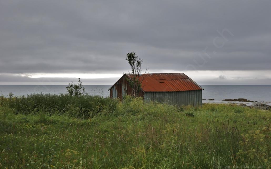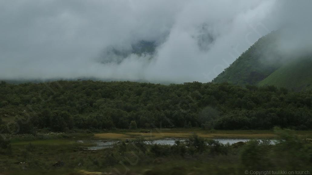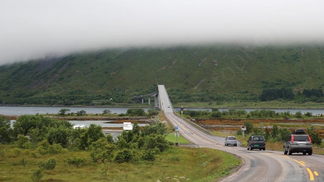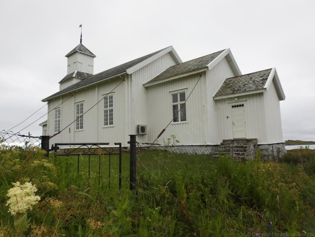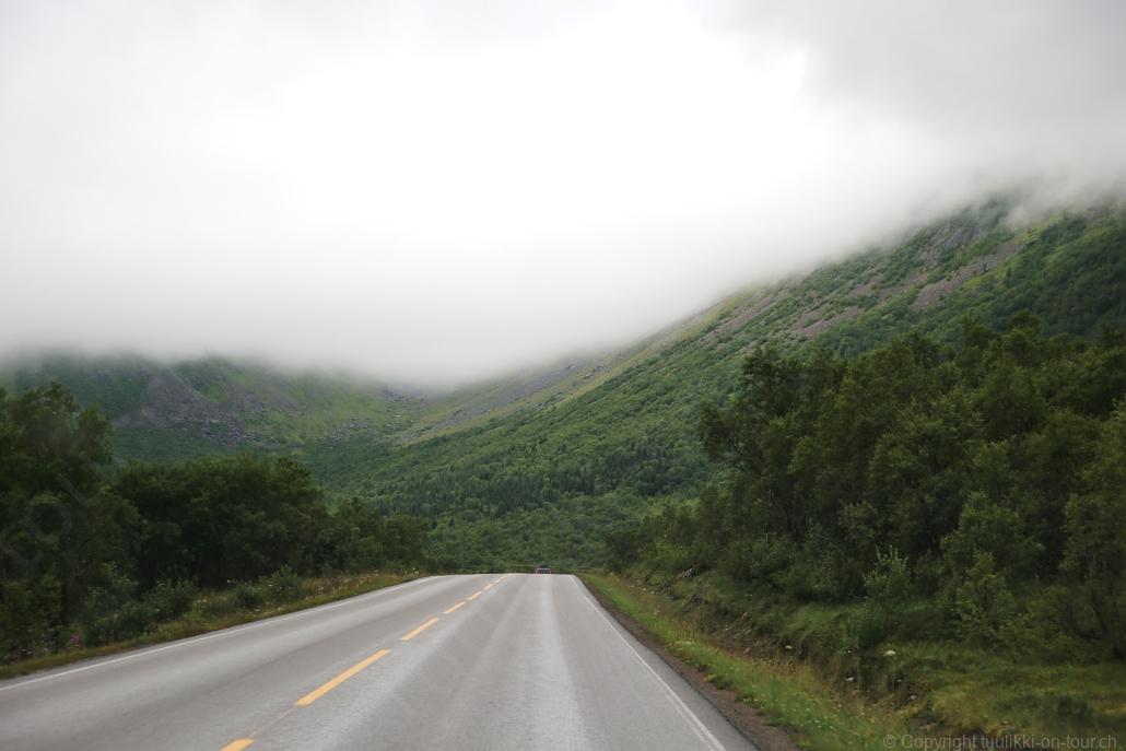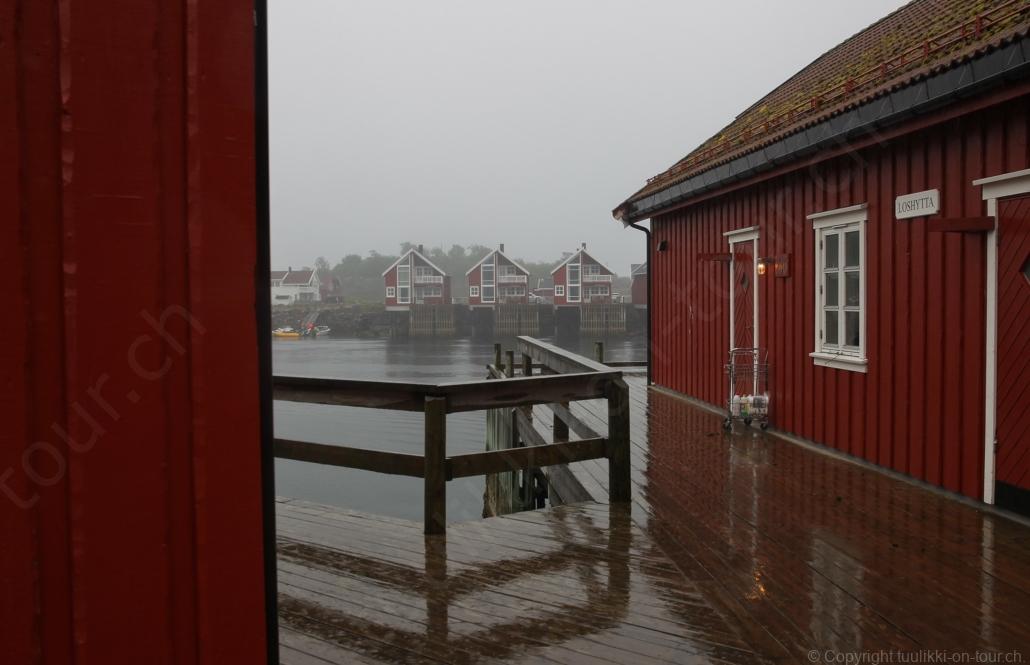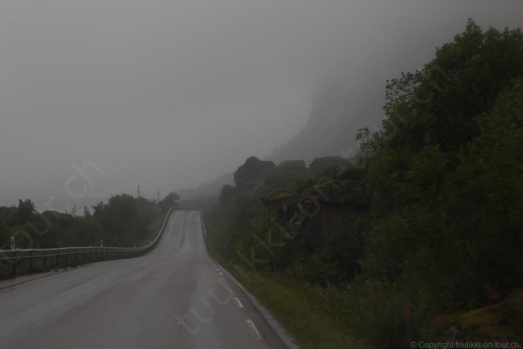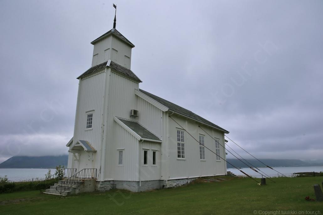 Trüb und nass mit tiefhängenden Wolken über den Bergketten und um einiges kühler (ca. 14°C) beginnt der heutige Tag. Diese Temperatur geniessen wir geradezu, wenn wir bedenken, dass es in der Schweiz zur Zeit 34-37°C heiss ist! Hier ist es richtiges Schlaf- und Fress-Wetter und so entscheiden wir, unser Programm entsprechend zu gestalten. Wir lassen die Hunde im WoMo und schauen uns während den nächsten Stunden die beiden Orte Svolvær und Kabelvåg etwas genauer an. Svolvær’s Strassen sollen im Winter mit Skifahrern gefüllt sein, im Sommer – zumindest an Nicht-Regentagen – mit Touristen, die das farbenfrohe Stadtbild, das hier herrschende Licht und die zahlreichen Galerien und Museen schätzen. Heute morgen aber sind nur einige Hartgesottene auszumachen, die unter dem Regenschirm die Stadt zu entdecken suchen und solche, die in einen Laden reinspazieren und umgezogen, in einheitliches Ölzeugs gekleidet wieder rauskommen um in einem Boot Platz zu nehmen. Ich kann mir nicht vorstellen, dass die bei dieser Seeadler Tour viel sehen werden. Auch die ca. 3000 Fischer, die in der Hauptfangzeit bis zu 50‘000 Tonnen Kabeljau fangen, können wir nicht sehen (aber die Hauptfangzeit von Januar bis April ist ja vorbei). Wir sind schon pflotschnass, als wir zum ältesten Fischerdorf der Lofoten, das auch einmal das grösste war, in Kabelvåg unsere Besichtigung weiterführen. Die umliegenden Inseln, die steil aufragenden Berge und schöne Strände sowie geschützte Buchten sind üblicherweise die perfekte Kulisse für Fotos. Heute ist davon aber nicht viel zu sehen, wir konzentrieren uns auf die malerischen und kulinarischen Seiten im Ort. Hier hat es nämlich eine Bäckerei, die frisches, knuspriges Brot aller Arten und vegane Spezialitäten (aus D importiert) anbietet und offensichtlich damit Erfolg hat, ist doch das angegliederte Café gut besucht. Die Hunde kommen gähnend und sich streckend auf ihren Betten, als wir die WoMo-Türe öffnen und scheinen uns sagen zu wollen „was, ihr seid schon zurück“. Gewisse innere Widerstände müssen sie sichtlich überwinden, um in ihre ‚Gstältli‘ zu schlüpfen und ins nasse Wetter raus zu hüpfen. Also lassen wir sie nach dem Mittags-Ausgang wieder schlafen, während wir zwei uns entschliessen, eine Nachmittagsrunde auf die Insel Gimsøya anzuhängen. 35 km später zweigen wir von der E10 auf eine Kommunalstrasse ab, die um die Insel führt und schöne Ausblicke auf die Inselwelt bietet. Letztere fällt ziemlich aus dem landschaftlichen Rahmen der ansonsten bergigen und zerklüfteten Lofoten. Es präsentiert sich eine flache, weite, offene Landschaft. Etwa zwei Drittel von Gimsøya sind mit Torfmooren bedeckt, welche in den vergangenen Zeiten – der Torfabbau wurde im grossen Stil betrieben – den einzigen Brennstoff auf den Lofoten bot. Heute steht die ganze Insel unter Naturschutz … ein Golfplatz wurde aber im nördlichsten Zipfel trotzdem angelegt. Die weisse Holzkirche von 1876 ist ein echter Hingucker; sie wurde quasi am Strand gebaut und bergseits mit Stahlstangen gesichert, um nicht vom Sturm fortgetragen zu werden. Um die Kirche herum liegt der Friedhof mit uralten, z.T. gusseisernen Grabplatten. Zwischenzeitlich sind Waschmaschine und Trockner gelaufen und wir freuen uns auf ein frisch angezogenes, frühlingshaft duftendes Bett. Zuvor aber – die Wolken haben sich ausgeregnet – lassen wir die Hunde nochmals raus und kochen dann einen Süsskartoffel-Kürbis-Cornatur Eintopf an einer Kokosnussmilch-Sauce.