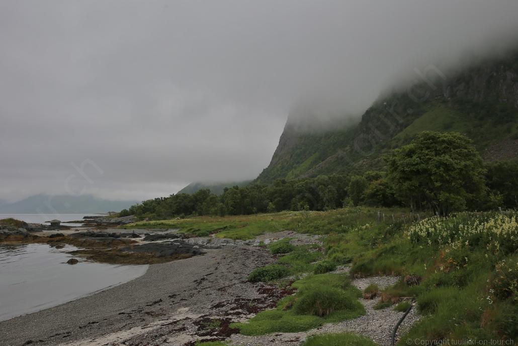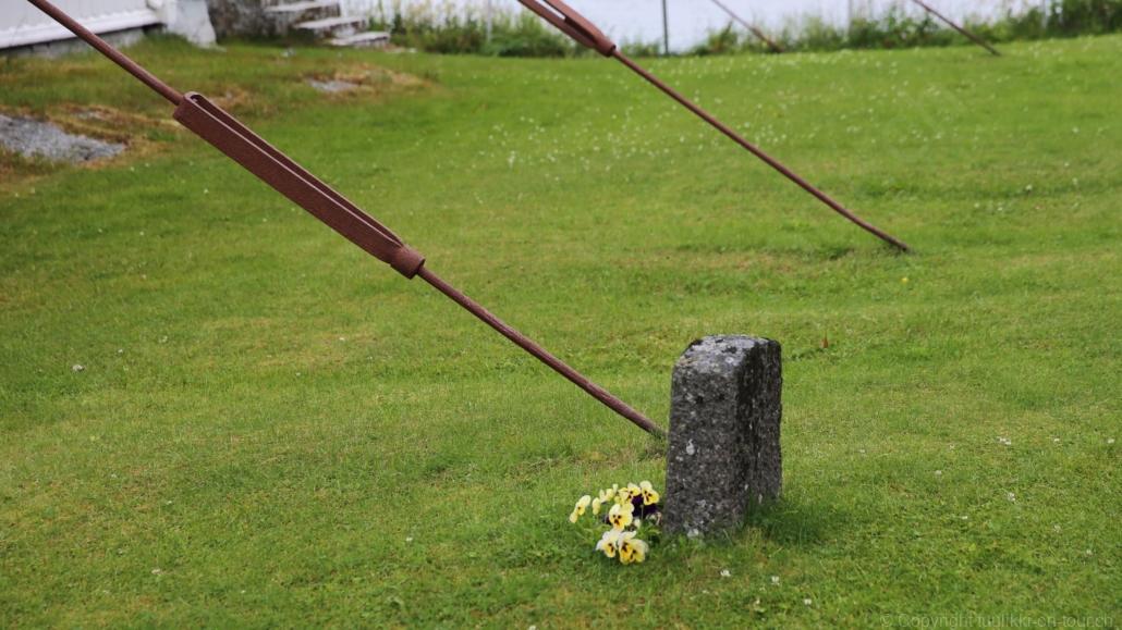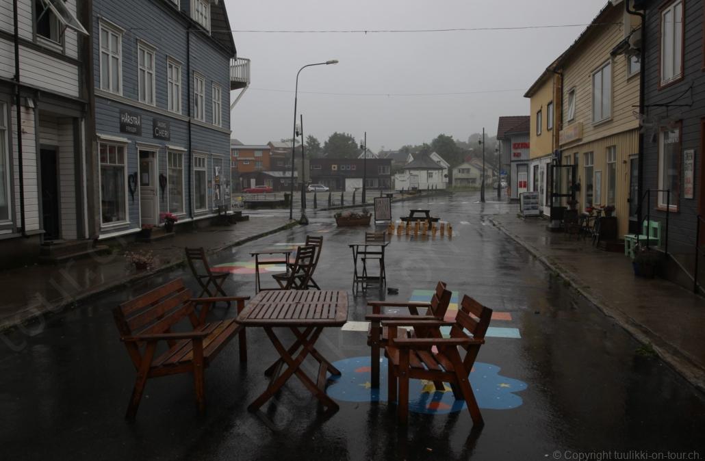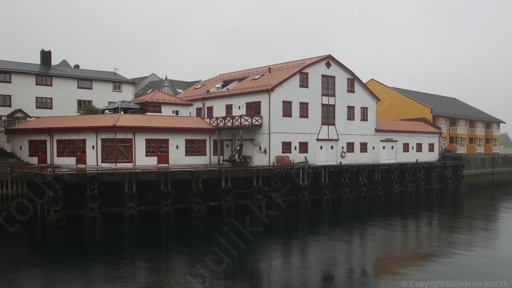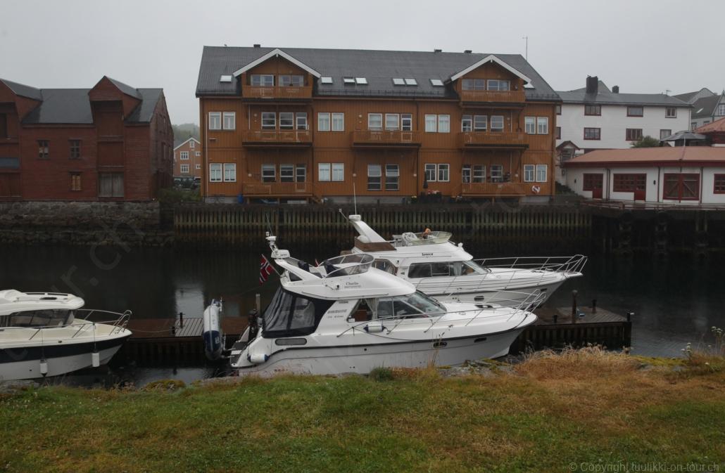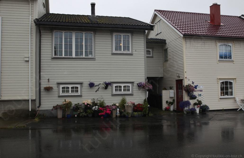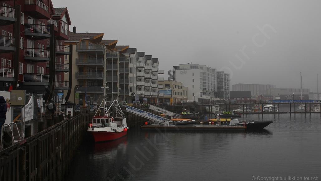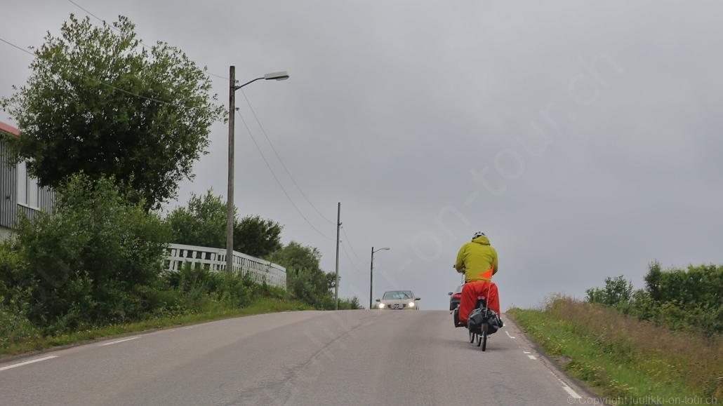 Trüb und nass mit tiefhängenden Wolken über den Bergketten und um einiges kühler (ca. 14°C) beginnt der heutige Tag. Diese Temperatur geniessen wir geradezu, wenn wir bedenken, dass es in der Schweiz zur Zeit 34-37°C heiss ist! Hier ist es richtiges Schlaf- und Fress-Wetter und so entscheiden wir, unser Programm entsprechend zu gestalten. Wir lassen die Hunde im WoMo und schauen uns während den nächsten Stunden die beiden Orte Svolvær und Kabelvåg etwas genauer an. Svolvær’s Strassen sollen im Winter mit Skifahrern gefüllt sein, im Sommer – zumindest an Nicht-Regentagen – mit Touristen, die das farbenfrohe Stadtbild, das hier herrschende Licht und die zahlreichen Galerien und Museen schätzen. Heute morgen aber sind nur einige Hartgesottene auszumachen, die unter dem Regenschirm die Stadt zu entdecken suchen und solche, die in einen Laden reinspazieren und umgezogen, in einheitliches Ölzeugs gekleidet wieder rauskommen um in einem Boot Platz zu nehmen. Ich kann mir nicht vorstellen, dass die bei dieser Seeadler Tour viel sehen werden. Auch die ca. 3000 Fischer, die in der Hauptfangzeit bis zu 50‘000 Tonnen Kabeljau fangen, können wir nicht sehen (aber die Hauptfangzeit von Januar bis April ist ja vorbei). Wir sind schon pflotschnass, als wir zum ältesten Fischerdorf der Lofoten, das auch einmal das grösste war, in Kabelvåg unsere Besichtigung weiterführen. Die umliegenden Inseln, die steil aufragenden Berge und schöne Strände sowie geschützte Buchten sind üblicherweise die perfekte Kulisse für Fotos. Heute ist davon aber nicht viel zu sehen, wir konzentrieren uns auf die malerischen und kulinarischen Seiten im Ort. Hier hat es nämlich eine Bäckerei, die frisches, knuspriges Brot aller Arten und vegane Spezialitäten (aus D importiert) anbietet und offensichtlich damit Erfolg hat, ist doch das angegliederte Café gut besucht. Die Hunde kommen gähnend und sich streckend auf ihren Betten, als wir die WoMo-Türe öffnen und scheinen uns sagen zu wollen „was, ihr seid schon zurück“. Gewisse innere Widerstände müssen sie sichtlich überwinden, um in ihre ‚Gstältli‘ zu schlüpfen und ins nasse Wetter raus zu hüpfen. Also lassen wir sie nach dem Mittags-Ausgang wieder schlafen, während wir zwei uns entschliessen, eine Nachmittagsrunde auf die Insel Gimsøya anzuhängen. 35 km später zweigen wir von der E10 auf eine Kommunalstrasse ab, die um die Insel führt und schöne Ausblicke auf die Inselwelt bietet. Letztere fällt ziemlich aus dem landschaftlichen Rahmen der ansonsten bergigen und zerklüfteten Lofoten. Es präsentiert sich eine flache, weite, offene Landschaft. Etwa zwei Drittel von Gimsøya sind mit Torfmooren bedeckt, welche in den vergangenen Zeiten – der Torfabbau wurde im grossen Stil betrieben – den einzigen Brennstoff auf den Lofoten bot. Heute steht die ganze Insel unter Naturschutz … ein Golfplatz wurde aber im nördlichsten Zipfel trotzdem angelegt. Die weisse Holzkirche von 1876 ist ein echter Hingucker; sie wurde quasi am Strand gebaut und bergseits mit Stahlstangen gesichert, um nicht vom Sturm fortgetragen zu werden. Um die Kirche herum liegt der Friedhof mit uralten, z.T. gusseisernen Grabplatten. Zwischenzeitlich sind Waschmaschine und Trockner gelaufen und wir freuen uns auf ein frisch angezogenes, frühlingshaft duftendes Bett. Zuvor aber – die Wolken haben sich ausgeregnet – lassen wir die Hunde nochmals raus und kochen dann einen Süsskartoffel-Kürbis-Cornatur Eintopf an einer Kokosnussmilch-Sauce.