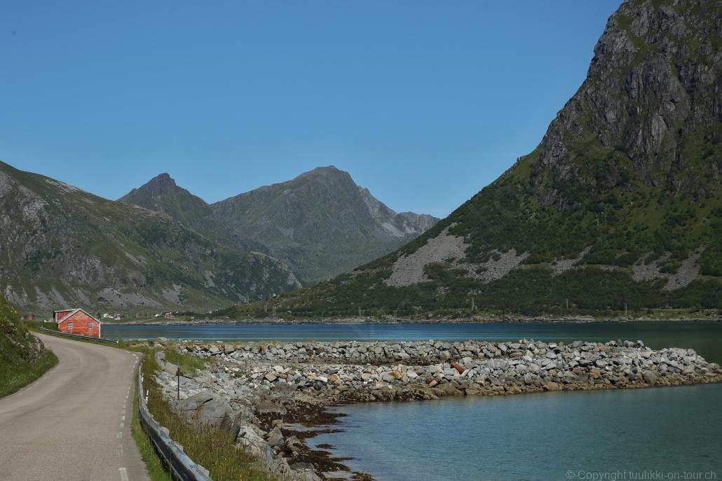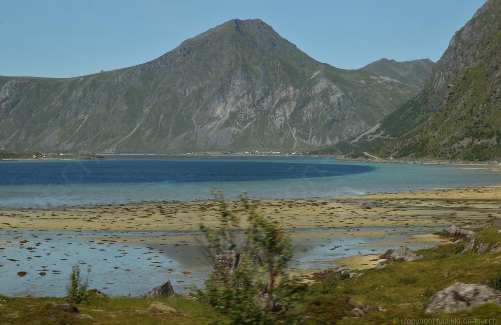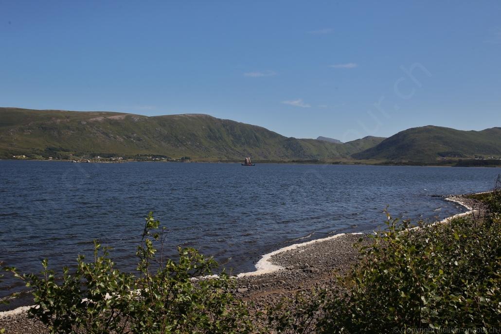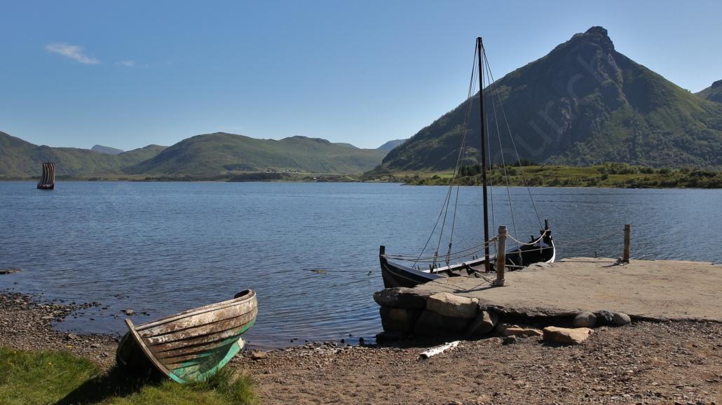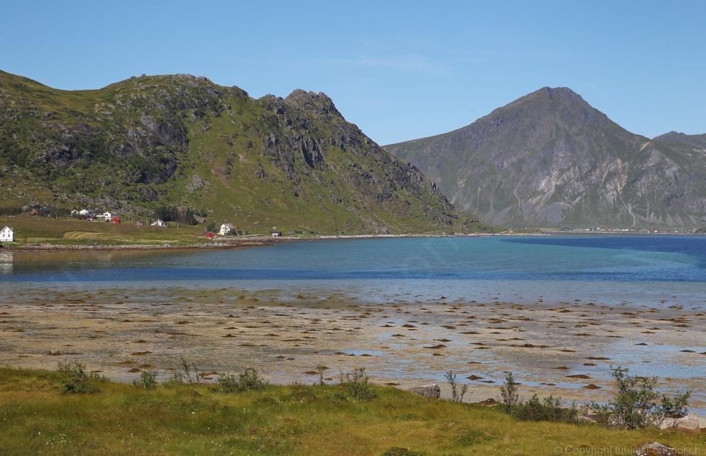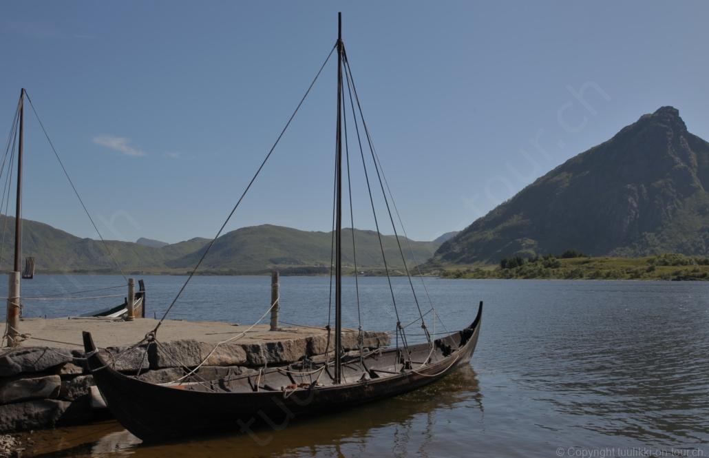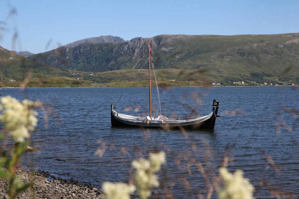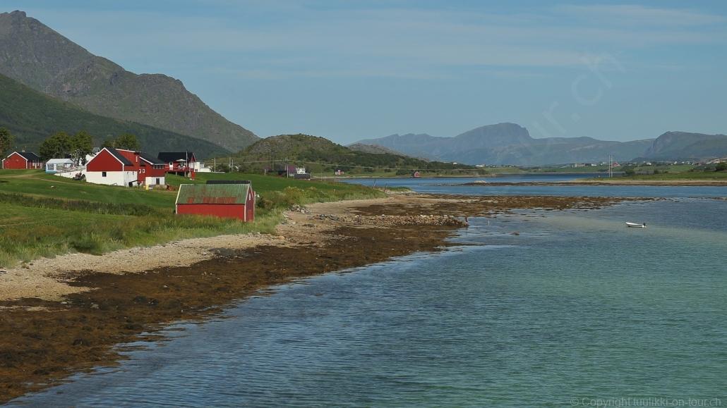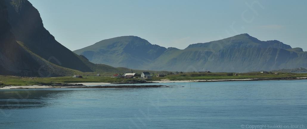 Ein strahlend schöner Tag soll unser letzter auf den Lofoten werden. Schon am frühen Morgen weckt uns die Sonne und bei 17°C wird es schon ein recht warmer Spaziergang dem Inlet entlang. Das Wasser ist ganz ruhig, die umliegenden Berge spiegeln sich in ihm. Als ob die Hunde Abschied nehmen wollten von einem lieb gewordenen Spaziergang, verweilen sie lange am Ufer, schauen ins Wasser, den Möwen und Gänsen nach und fressen noch etwas Gras. Nach dem Frühstück heisst es Kangoo aufladen, zusammenräumen (Wasser gefüllt haben wir noch gestern Abend) und dann kann es los gehen. Auf der E10, die sich ja durch die ganzen Lofoten dahinzieht, fahren wir wieder (da waren wir ja mit dem Kangoo) vorbei an Svolvaer und über die Bogenbrücken bis Smorten, ab da ist die Gegend neu für uns. Wir passieren viele ruhige, kleine Fjorde, die auf den ersten Blick wie Bergsee aussehen, aber die Algen und Muscheln sowie das salzige Wasser verraten es halt dann doch. Die Gegend auf der Vestvågøya-Insel bietet nebst Bergen und Inlets auch flachere, weite Gebiete. Hoch auf einem Hügel, von weitem sichtbar steht in Bøstad eine moderne Kirche. Wir fahren am Wikinger-Museum vorbei und hoch auf den grossen Parkplatz vor der – geschlossenen – Kirche, folgen dort einem Pfad, der zum Freiluftmuseum und zum Hafen führt, von wo ein nachgebautes Wikinger Schiff Passagiere auf eine 30-minütige Fahrt mitnimmt. Der Pfad geht über einen Bohlenweg dem Ufer entlang weiter und endet dann wieder bei der Kirche resp. dem Museum. Auf der Weiterfahrt muss Nils ab und zu abbremsen, weil Schwalben vor dem Auto fliegen und sich nicht entscheiden können, rechts oder links wegzusegeln. Nach Leknes, einem grösseren Ort mit Flug- und Seehafen wird die Strasse schmaler, so dass zwei dicke WoMos nicht mehr ohne weiteres aneinander vorbeikommen, sie schlängelt sich quer über die Insel Flakstadøya, zwei Fjords entlang zur Insel Moskenesøya, dort folgt sie der Ostküste bis zu unserem heutigen Ziel, dem Fähranlieger Moskenes in Sørvågen. Alles ist ziemlich eng, keine Möglichkeit zum Freistehen, so dass wir uns 250 m weiter auf dem dortigen Camping einnisten, möglichst nahe, denn morgen geht es früh los, um 06:15 Uhr müssen wir in die Reihe stehen. Wir haben diese Passage vorreserviert, weil auf den Lofoten viel los ist und wir mit unseren 14 m doch ziemlichen Platzbedarf haben. Den Grossteil des Nachmittags können wir direkt am breiten Vestfjorden den Wellen beim Anschlagen auf die Felsen zusehen/-hören. Am Abend besteigen wir den Dorfhügel und können an der Sonne sitzend zusehen, wie die Fähre einläuft, ihren Schlund langsam öffnet und die bereit stehenden PWs und Camper darin verschwinden.