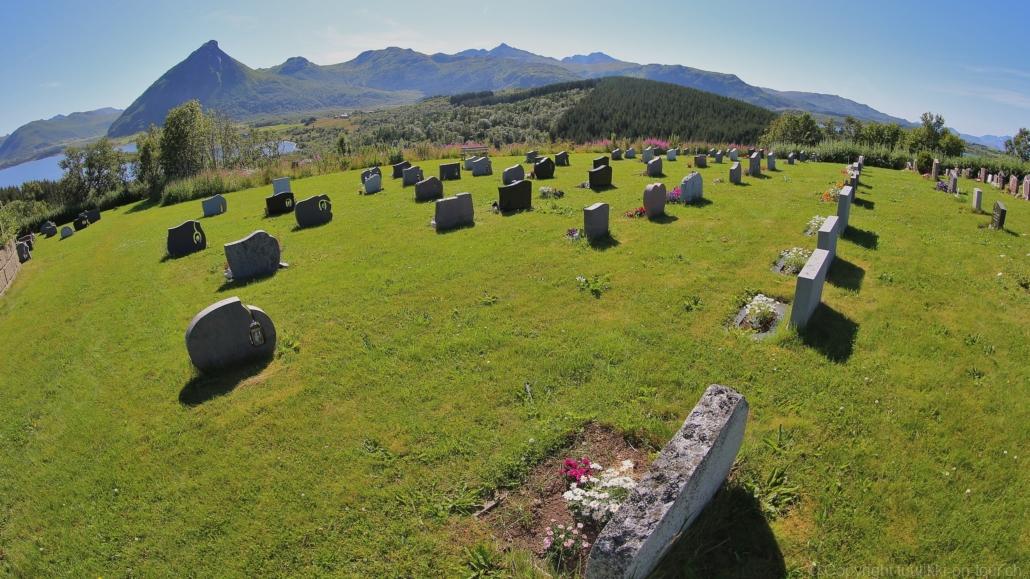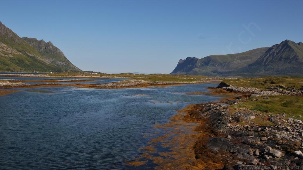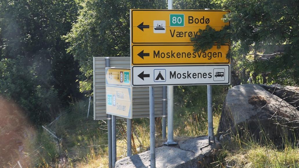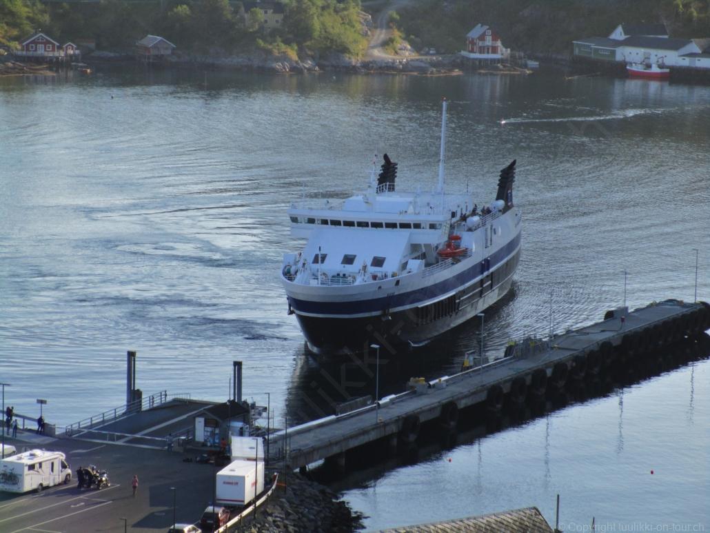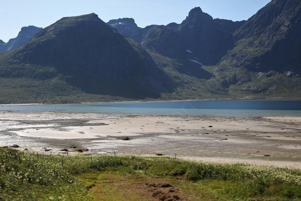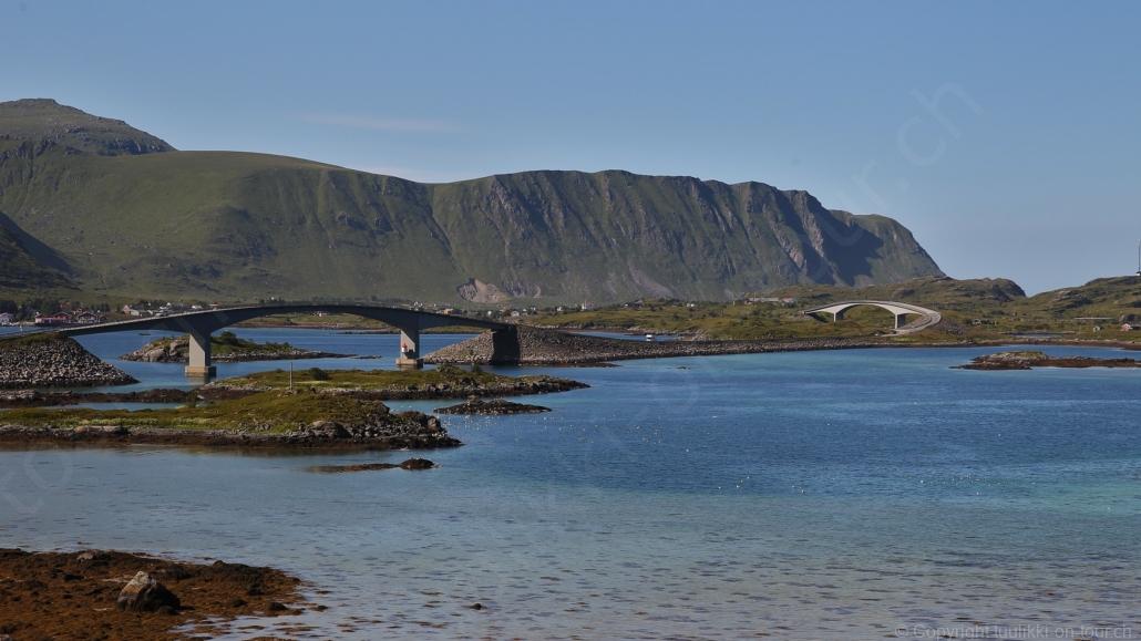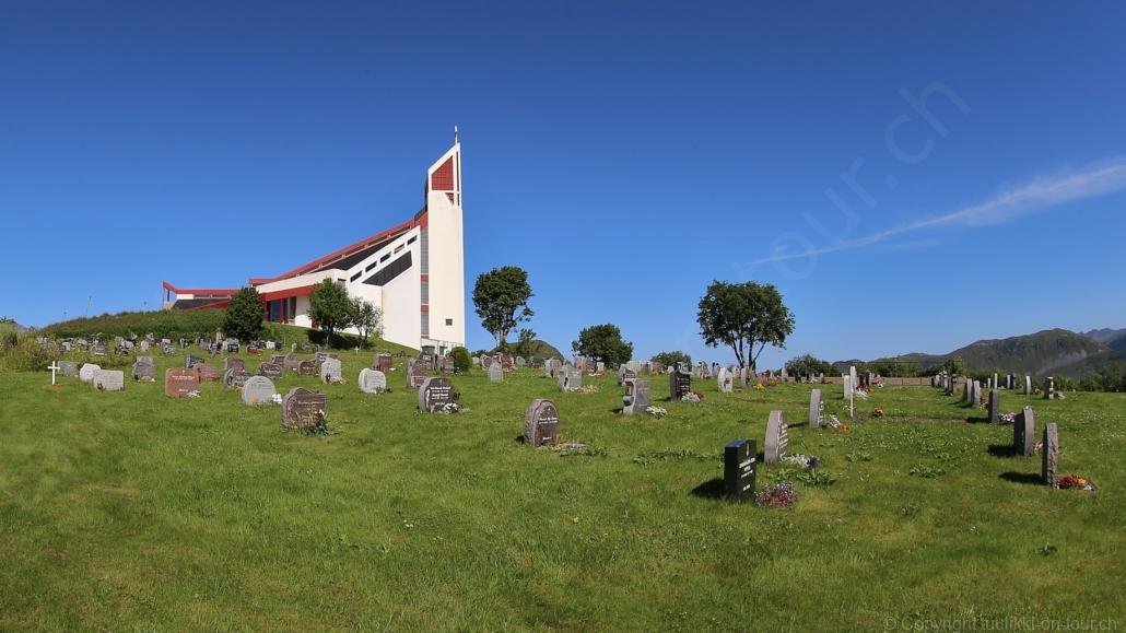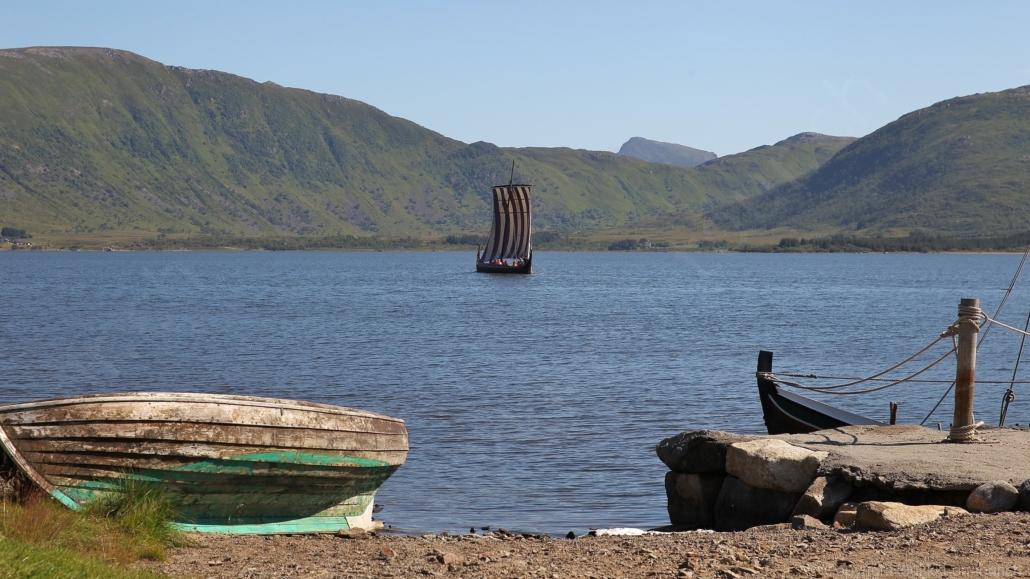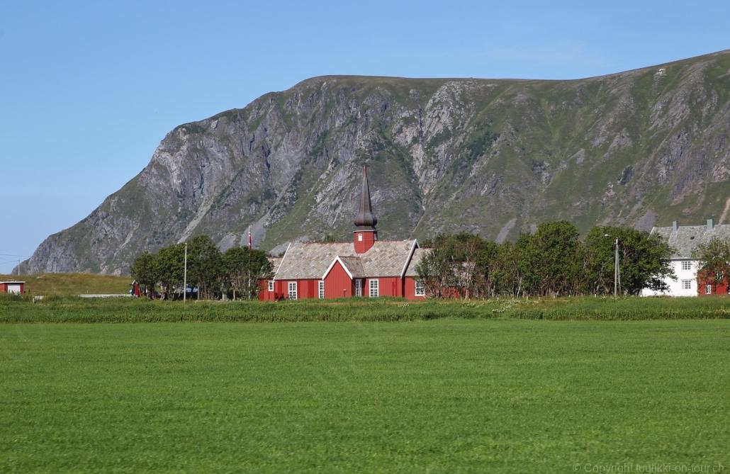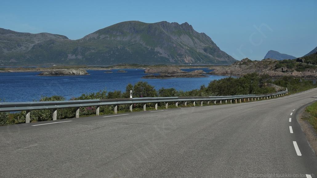 Ein strahlend schöner Tag soll unser letzter auf den Lofoten werden. Schon am frühen Morgen weckt uns die Sonne und bei 17°C wird es schon ein recht warmer Spaziergang dem Inlet entlang. Das Wasser ist ganz ruhig, die umliegenden Berge spiegeln sich in ihm. Als ob die Hunde Abschied nehmen wollten von einem lieb gewordenen Spaziergang, verweilen sie lange am Ufer, schauen ins Wasser, den Möwen und Gänsen nach und fressen noch etwas Gras. Nach dem Frühstück heisst es Kangoo aufladen, zusammenräumen (Wasser gefüllt haben wir noch gestern Abend) und dann kann es los gehen. Auf der E10, die sich ja durch die ganzen Lofoten dahinzieht, fahren wir wieder (da waren wir ja mit dem Kangoo) vorbei an Svolvaer und über die Bogenbrücken bis Smorten, ab da ist die Gegend neu für uns. Wir passieren viele ruhige, kleine Fjorde, die auf den ersten Blick wie Bergsee aussehen, aber die Algen und Muscheln sowie das salzige Wasser verraten es halt dann doch. Die Gegend auf der Vestvågøya-Insel bietet nebst Bergen und Inlets auch flachere, weite Gebiete. Hoch auf einem Hügel, von weitem sichtbar steht in Bøstad eine moderne Kirche. Wir fahren am Wikinger-Museum vorbei und hoch auf den grossen Parkplatz vor der – geschlossenen – Kirche, folgen dort einem Pfad, der zum Freiluftmuseum und zum Hafen führt, von wo ein nachgebautes Wikinger Schiff Passagiere auf eine 30-minütige Fahrt mitnimmt. Der Pfad geht über einen Bohlenweg dem Ufer entlang weiter und endet dann wieder bei der Kirche resp. dem Museum. Auf der Weiterfahrt muss Nils ab und zu abbremsen, weil Schwalben vor dem Auto fliegen und sich nicht entscheiden können, rechts oder links wegzusegeln. Nach Leknes, einem grösseren Ort mit Flug- und Seehafen wird die Strasse schmaler, so dass zwei dicke WoMos nicht mehr ohne weiteres aneinander vorbeikommen, sie schlängelt sich quer über die Insel Flakstadøya, zwei Fjords entlang zur Insel Moskenesøya, dort folgt sie der Ostküste bis zu unserem heutigen Ziel, dem Fähranlieger Moskenes in Sørvågen. Alles ist ziemlich eng, keine Möglichkeit zum Freistehen, so dass wir uns 250 m weiter auf dem dortigen Camping einnisten, möglichst nahe, denn morgen geht es früh los, um 06:15 Uhr müssen wir in die Reihe stehen. Wir haben diese Passage vorreserviert, weil auf den Lofoten viel los ist und wir mit unseren 14 m doch ziemlichen Platzbedarf haben. Den Grossteil des Nachmittags können wir direkt am breiten Vestfjorden den Wellen beim Anschlagen auf die Felsen zusehen/-hören. Am Abend besteigen wir den Dorfhügel und können an der Sonne sitzend zusehen, wie die Fähre einläuft, ihren Schlund langsam öffnet und die bereit stehenden PWs und Camper darin verschwinden.