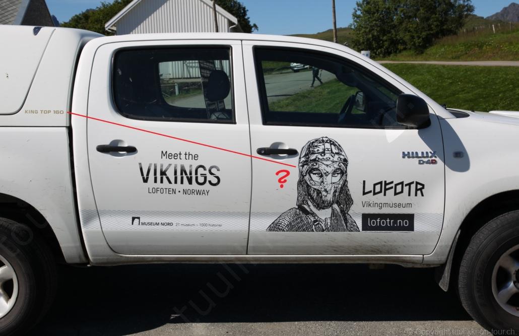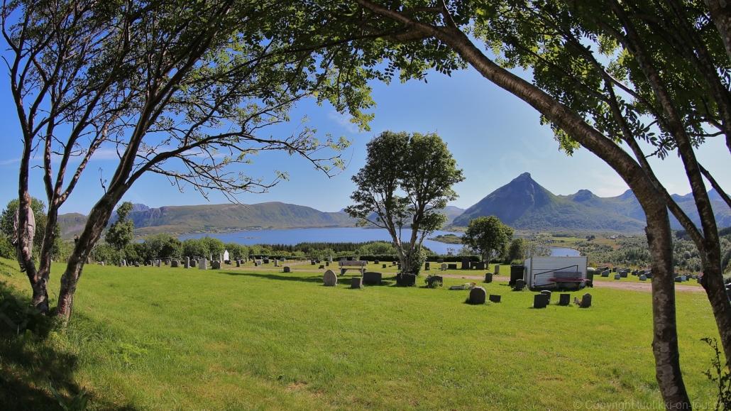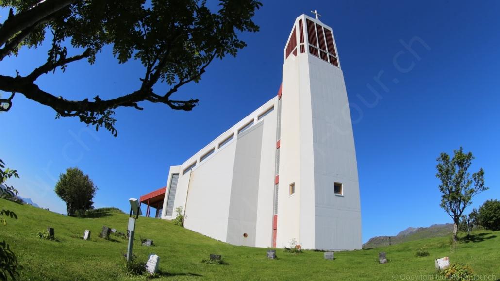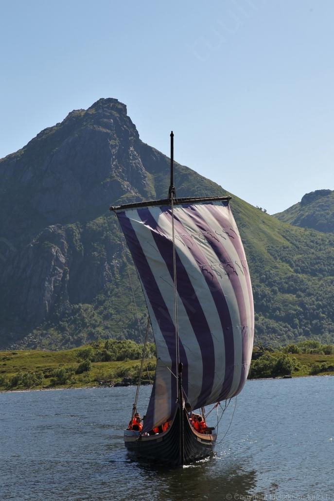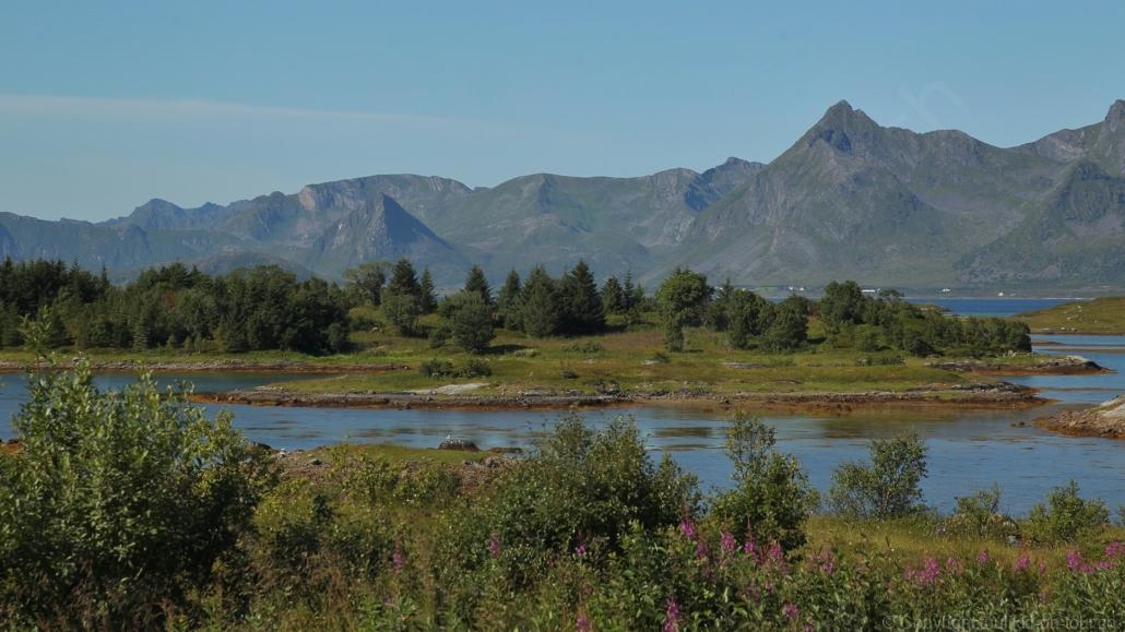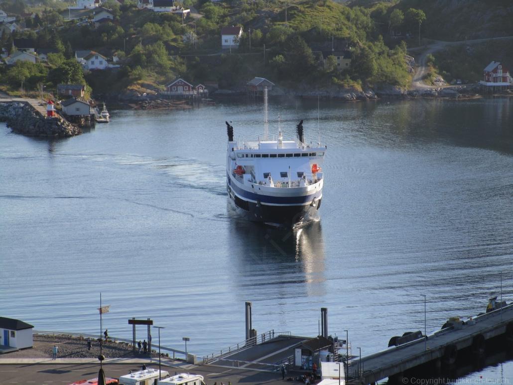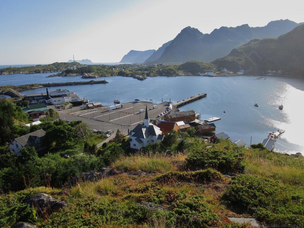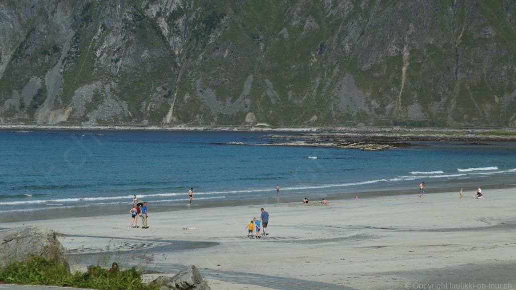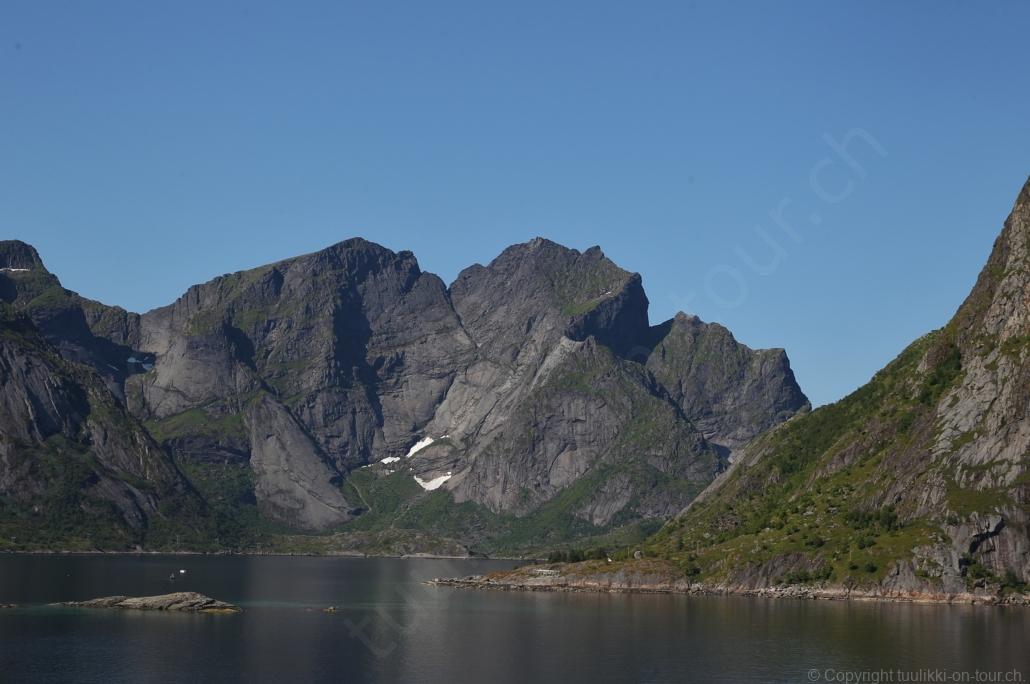Ein strahlend schöner Tag soll unser letzter auf den Lofoten werden. Schon am frühen Morgen weckt uns die Sonne und bei 17°C wird es schon ein recht warmer Spaziergang dem Inlet entlang. Das Wasser ist ganz ruhig, die umliegenden Berge spiegeln sich in ihm. Als ob die Hunde Abschied nehmen wollten von einem lieb gewordenen Spaziergang, verweilen sie lange am Ufer, schauen ins Wasser, den Möwen und Gänsen nach und fressen noch etwas Gras. Nach dem Frühstück heisst es Kangoo aufladen, zusammenräumen (Wasser gefüllt haben wir noch gestern Abend) und dann kann es los gehen. Auf der E10, die sich ja durch die ganzen Lofoten dahinzieht, fahren wir wieder (da waren wir ja mit dem Kangoo) vorbei an Svolvaer und über die Bogenbrücken bis Smorten, ab da ist die Gegend neu für uns. Wir passieren viele ruhige, kleine Fjorde, die auf den ersten Blick wie Bergsee aussehen, aber die Algen und Muscheln sowie das salzige Wasser verraten es halt dann doch. Die Gegend auf der Vestvågøya-Insel bietet nebst Bergen und Inlets auch flachere, weite Gebiete. Hoch auf einem Hügel, von weitem sichtbar steht in Bøstad eine moderne Kirche. Wir fahren am Wikinger-Museum vorbei und hoch auf den grossen Parkplatz vor der – geschlossenen – Kirche, folgen dort einem Pfad, der zum Freiluftmuseum und zum Hafen führt, von wo ein nachgebautes Wikinger Schiff Passagiere auf eine 30-minütige Fahrt mitnimmt. Der Pfad geht über einen Bohlenweg dem Ufer entlang weiter und endet dann wieder bei der Kirche resp. dem Museum. Auf der Weiterfahrt muss Nils ab und zu abbremsen, weil Schwalben vor dem Auto fliegen und sich nicht entscheiden können, rechts oder links wegzusegeln. Nach Leknes, einem grösseren Ort mit Flug- und Seehafen wird die Strasse schmaler, so dass zwei dicke WoMos nicht mehr ohne weiteres aneinander vorbeikommen, sie schlängelt sich quer über die Insel Flakstadøya, zwei Fjords entlang zur Insel Moskenesøya, dort folgt sie der Ostküste bis zu unserem heutigen Ziel, dem Fähranlieger Moskenes in Sørvågen. Alles ist ziemlich eng, keine Möglichkeit zum Freistehen, so dass wir uns 250 m weiter auf dem dortigen Camping einnisten, möglichst nahe, denn morgen geht es früh los, um 06:15 Uhr müssen wir in die Reihe stehen. Wir haben diese Passage vorreserviert, weil auf den Lofoten viel los ist und wir mit unseren 14 m doch ziemlichen Platzbedarf haben. Den Grossteil des Nachmittags können wir direkt am breiten Vestfjorden den Wellen beim Anschlagen auf die Felsen zusehen/-hören. Am Abend besteigen wir den Dorfhügel und können an der Sonne sitzend zusehen, wie die Fähre einläuft, ihren Schlund langsam öffnet und die bereit stehenden PWs und Camper darin verschwinden.