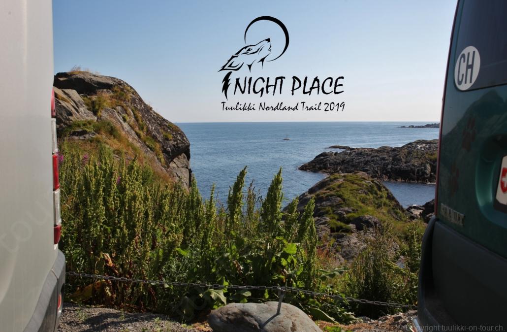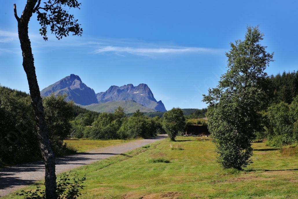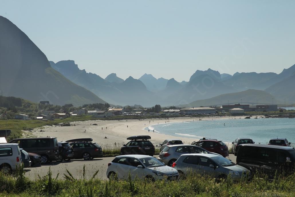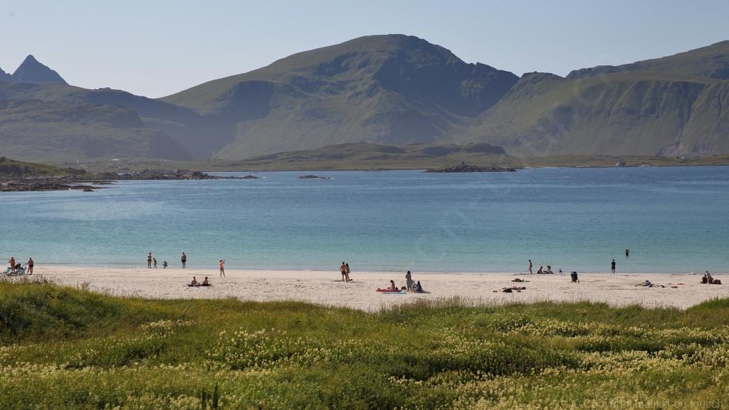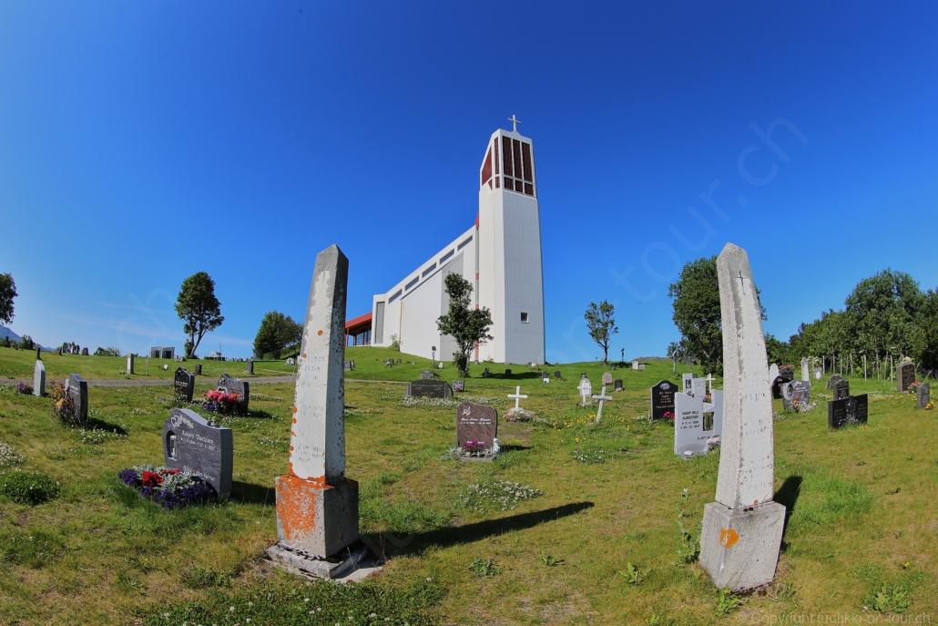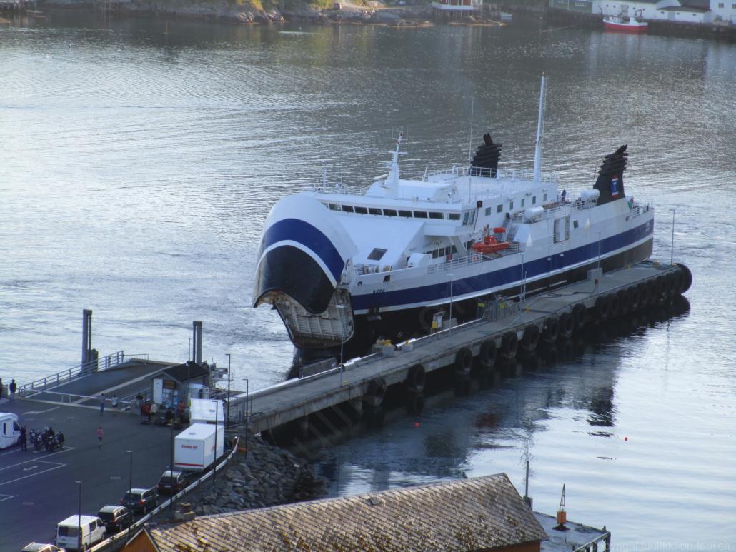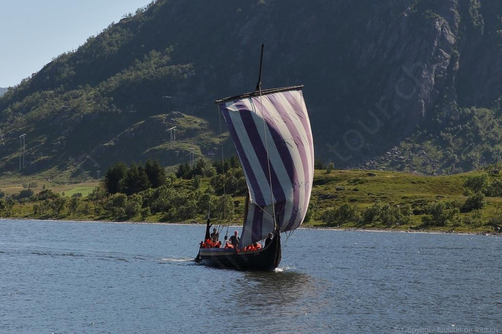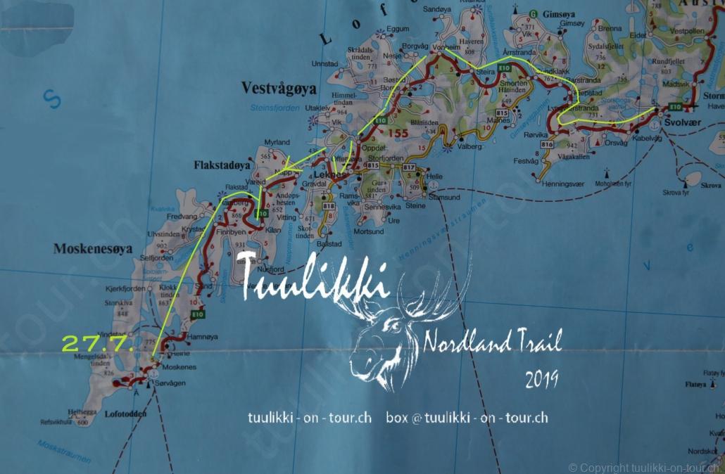 Ein strahlend schöner Tag soll unser letzter auf den Lofoten werden. Schon am frühen Morgen weckt uns die Sonne und bei 17°C wird es schon ein recht warmer Spaziergang dem Inlet entlang. Das Wasser ist ganz ruhig, die umliegenden Berge spiegeln sich in ihm. Als ob die Hunde Abschied nehmen wollten von einem lieb gewordenen Spaziergang, verweilen sie lange am Ufer, schauen ins Wasser, den Möwen und Gänsen nach und fressen noch etwas Gras. Nach dem Frühstück heisst es Kangoo aufladen, zusammenräumen (Wasser gefüllt haben wir noch gestern Abend) und dann kann es los gehen. Auf der E10, die sich ja durch die ganzen Lofoten dahinzieht, fahren wir wieder (da waren wir ja mit dem Kangoo) vorbei an Svolvaer und über die Bogenbrücken bis Smorten, ab da ist die Gegend neu für uns. Wir passieren viele ruhige, kleine Fjorde, die auf den ersten Blick wie Bergsee aussehen, aber die Algen und Muscheln sowie das salzige Wasser verraten es halt dann doch. Die Gegend auf der Vestvågøya-Insel bietet nebst Bergen und Inlets auch flachere, weite Gebiete. Hoch auf einem Hügel, von weitem sichtbar steht in Bøstad eine moderne Kirche. Wir fahren am Wikinger-Museum vorbei und hoch auf den grossen Parkplatz vor der – geschlossenen – Kirche, folgen dort einem Pfad, der zum Freiluftmuseum und zum Hafen führt, von wo ein nachgebautes Wikinger Schiff Passagiere auf eine 30-minütige Fahrt mitnimmt. Der Pfad geht über einen Bohlenweg dem Ufer entlang weiter und endet dann wieder bei der Kirche resp. dem Museum. Auf der Weiterfahrt muss Nils ab und zu abbremsen, weil Schwalben vor dem Auto fliegen und sich nicht entscheiden können, rechts oder links wegzusegeln. Nach Leknes, einem grösseren Ort mit Flug- und Seehafen wird die Strasse schmaler, so dass zwei dicke WoMos nicht mehr ohne weiteres aneinander vorbeikommen, sie schlängelt sich quer über die Insel Flakstadøya, zwei Fjords entlang zur Insel Moskenesøya, dort folgt sie der Ostküste bis zu unserem heutigen Ziel, dem Fähranlieger Moskenes in Sørvågen. Alles ist ziemlich eng, keine Möglichkeit zum Freistehen, so dass wir uns 250 m weiter auf dem dortigen Camping einnisten, möglichst nahe, denn morgen geht es früh los, um 06:15 Uhr müssen wir in die Reihe stehen. Wir haben diese Passage vorreserviert, weil auf den Lofoten viel los ist und wir mit unseren 14 m doch ziemlichen Platzbedarf haben. Den Grossteil des Nachmittags können wir direkt am breiten Vestfjorden den Wellen beim Anschlagen auf die Felsen zusehen/-hören. Am Abend besteigen wir den Dorfhügel und können an der Sonne sitzend zusehen, wie die Fähre einläuft, ihren Schlund langsam öffnet und die bereit stehenden PWs und Camper darin verschwinden.