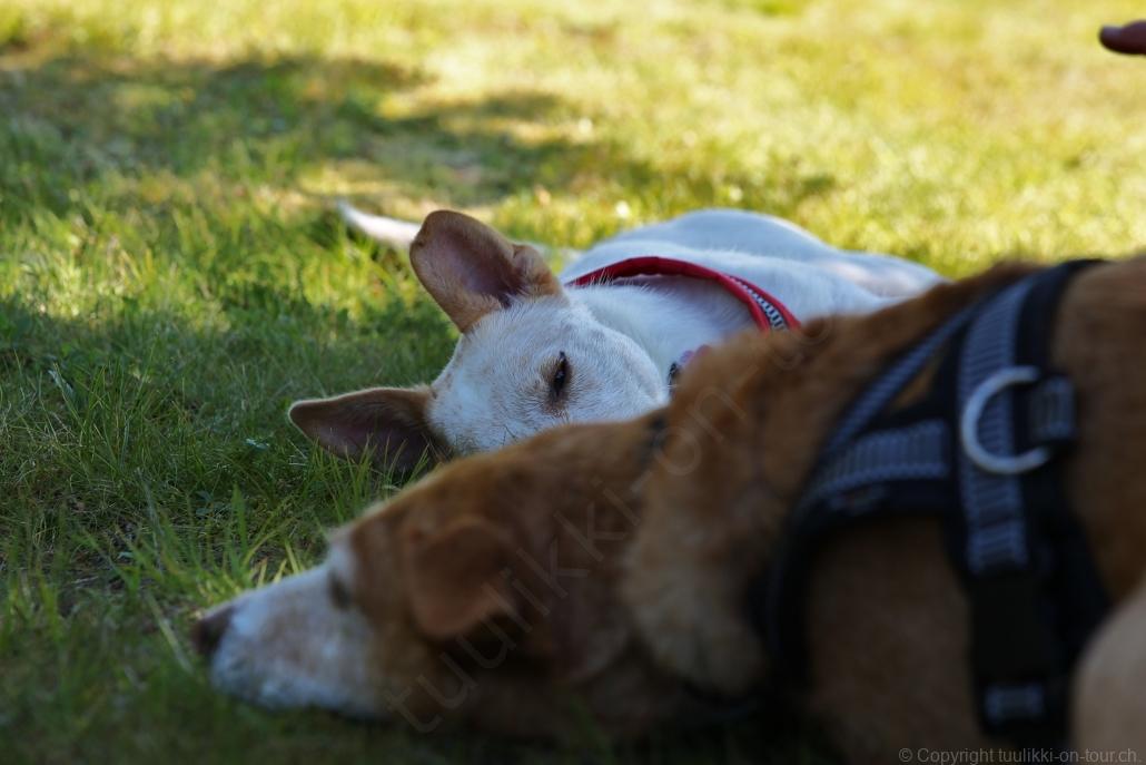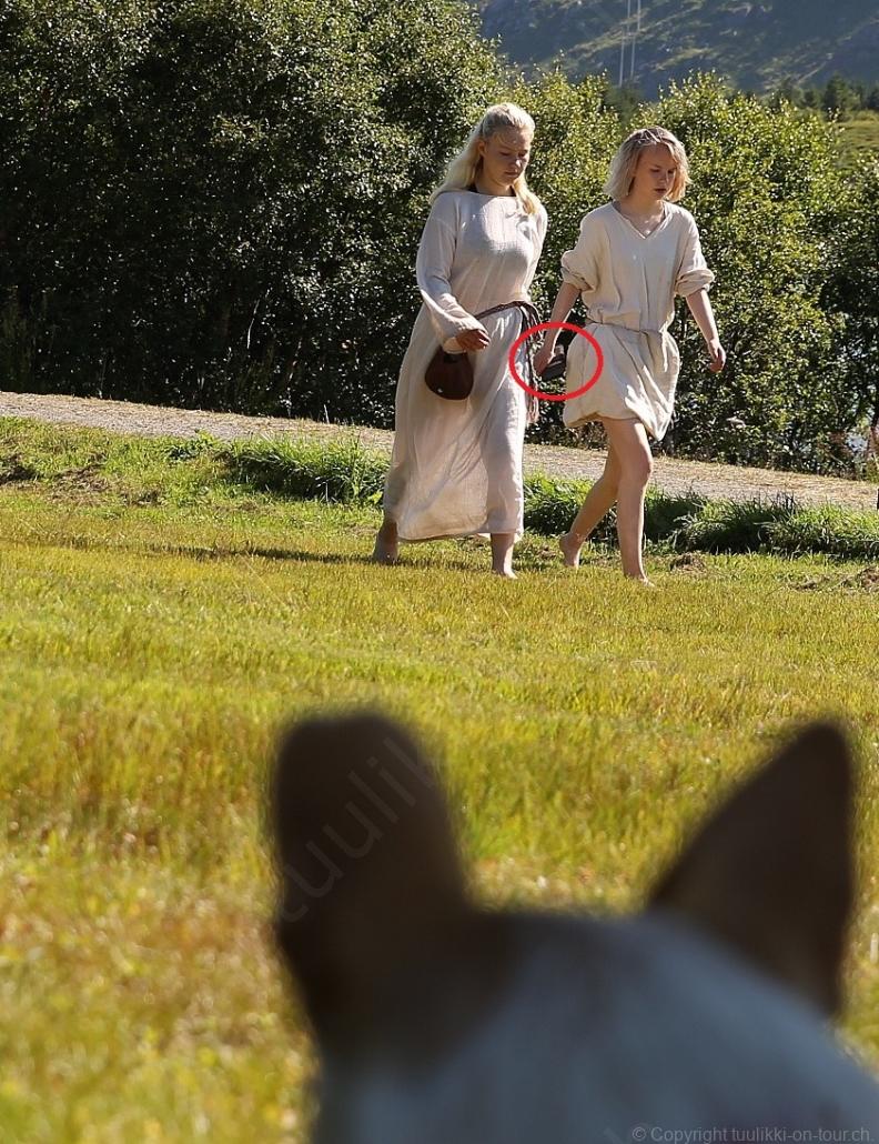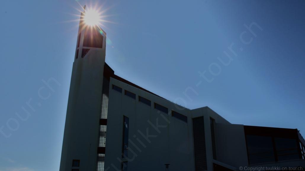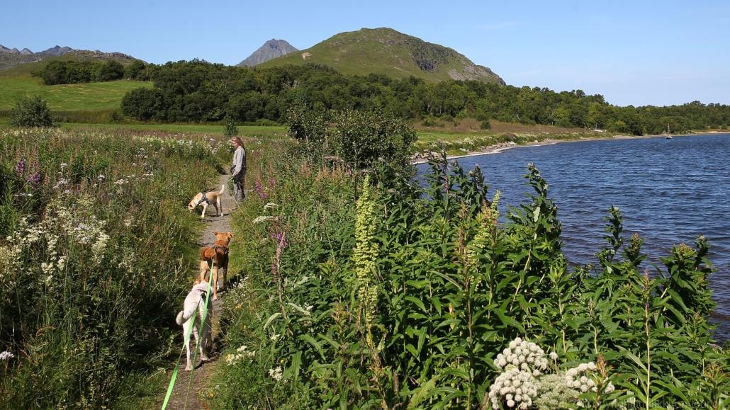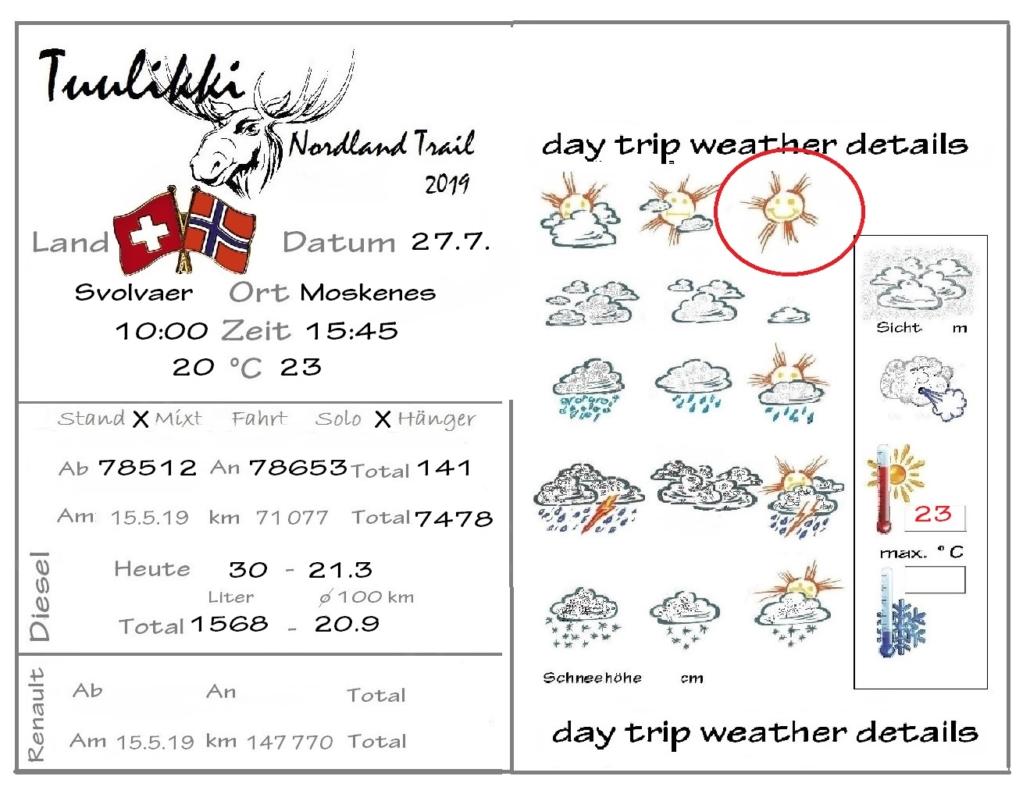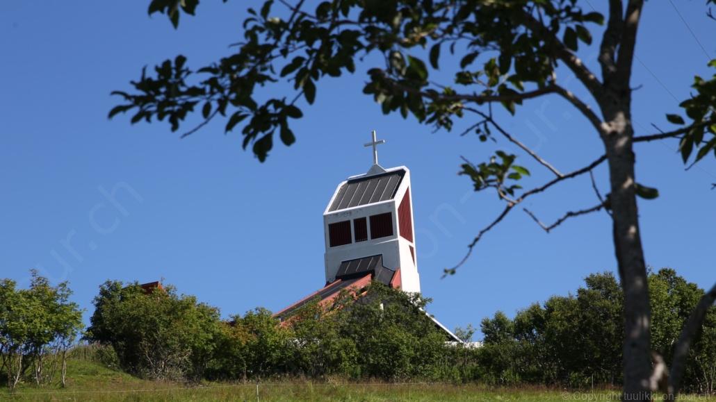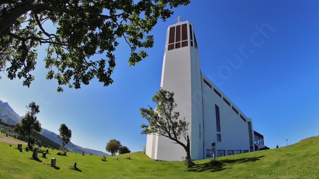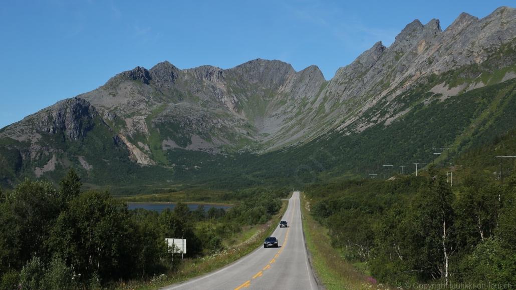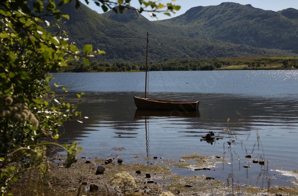 Ein strahlend schöner Tag soll unser letzter auf den Lofoten werden. Schon am frühen Morgen weckt uns die Sonne und bei 17°C wird es schon ein recht warmer Spaziergang dem Inlet entlang. Das Wasser ist ganz ruhig, die umliegenden Berge spiegeln sich in ihm. Als ob die Hunde Abschied nehmen wollten von einem lieb gewordenen Spaziergang, verweilen sie lange am Ufer, schauen ins Wasser, den Möwen und Gänsen nach und fressen noch etwas Gras. Nach dem Frühstück heisst es Kangoo aufladen, zusammenräumen (Wasser gefüllt haben wir noch gestern Abend) und dann kann es los gehen. Auf der E10, die sich ja durch die ganzen Lofoten dahinzieht, fahren wir wieder (da waren wir ja mit dem Kangoo) vorbei an Svolvaer und über die Bogenbrücken bis Smorten, ab da ist die Gegend neu für uns. Wir passieren viele ruhige, kleine Fjorde, die auf den ersten Blick wie Bergsee aussehen, aber die Algen und Muscheln sowie das salzige Wasser verraten es halt dann doch. Die Gegend auf der Vestvågøya-Insel bietet nebst Bergen und Inlets auch flachere, weite Gebiete. Hoch auf einem Hügel, von weitem sichtbar steht in Bøstad eine moderne Kirche. Wir fahren am Wikinger-Museum vorbei und hoch auf den grossen Parkplatz vor der – geschlossenen – Kirche, folgen dort einem Pfad, der zum Freiluftmuseum und zum Hafen führt, von wo ein nachgebautes Wikinger Schiff Passagiere auf eine 30-minütige Fahrt mitnimmt. Der Pfad geht über einen Bohlenweg dem Ufer entlang weiter und endet dann wieder bei der Kirche resp. dem Museum. Auf der Weiterfahrt muss Nils ab und zu abbremsen, weil Schwalben vor dem Auto fliegen und sich nicht entscheiden können, rechts oder links wegzusegeln. Nach Leknes, einem grösseren Ort mit Flug- und Seehafen wird die Strasse schmaler, so dass zwei dicke WoMos nicht mehr ohne weiteres aneinander vorbeikommen, sie schlängelt sich quer über die Insel Flakstadøya, zwei Fjords entlang zur Insel Moskenesøya, dort folgt sie der Ostküste bis zu unserem heutigen Ziel, dem Fähranlieger Moskenes in Sørvågen. Alles ist ziemlich eng, keine Möglichkeit zum Freistehen, so dass wir uns 250 m weiter auf dem dortigen Camping einnisten, möglichst nahe, denn morgen geht es früh los, um 06:15 Uhr müssen wir in die Reihe stehen. Wir haben diese Passage vorreserviert, weil auf den Lofoten viel los ist und wir mit unseren 14 m doch ziemlichen Platzbedarf haben. Den Grossteil des Nachmittags können wir direkt am breiten Vestfjorden den Wellen beim Anschlagen auf die Felsen zusehen/-hören. Am Abend besteigen wir den Dorfhügel und können an der Sonne sitzend zusehen, wie die Fähre einläuft, ihren Schlund langsam öffnet und die bereit stehenden PWs und Camper darin verschwinden.
