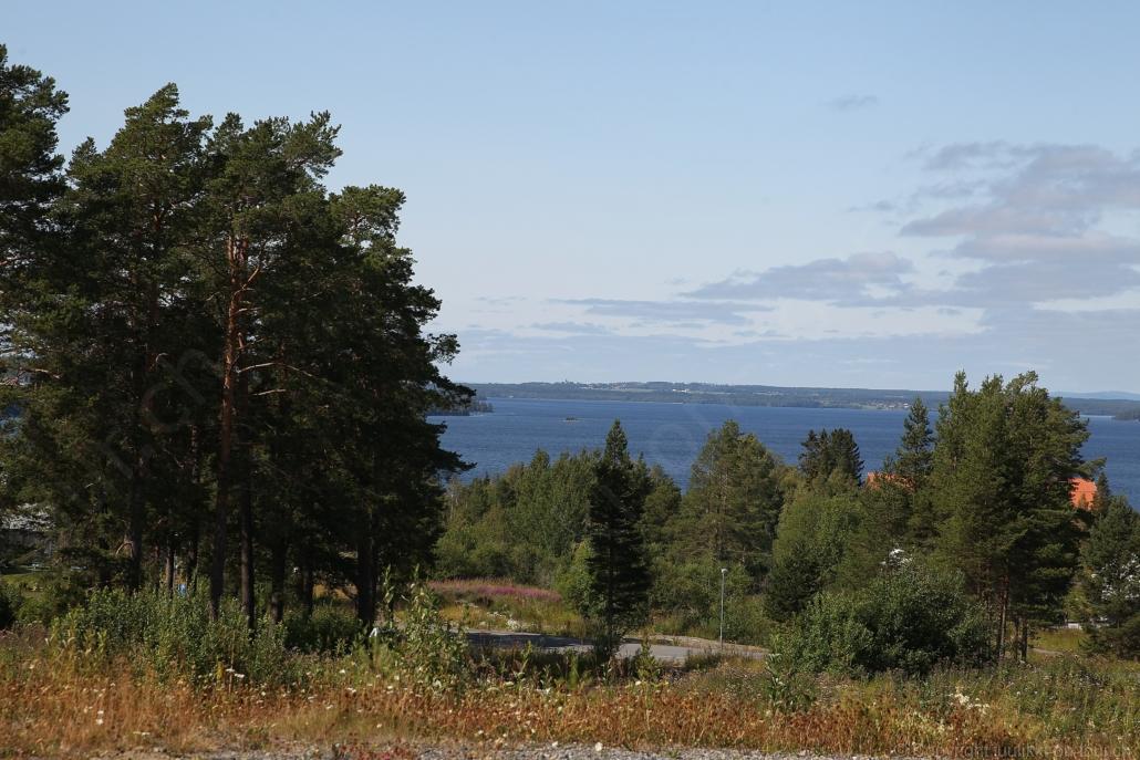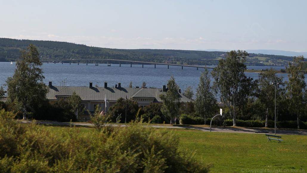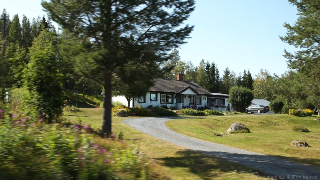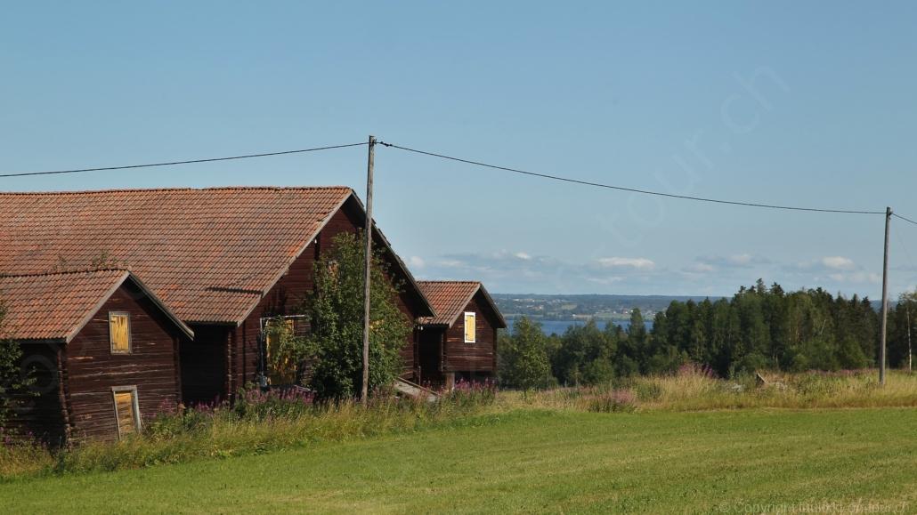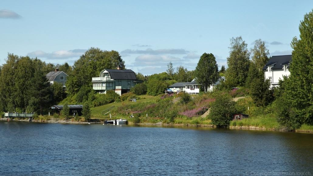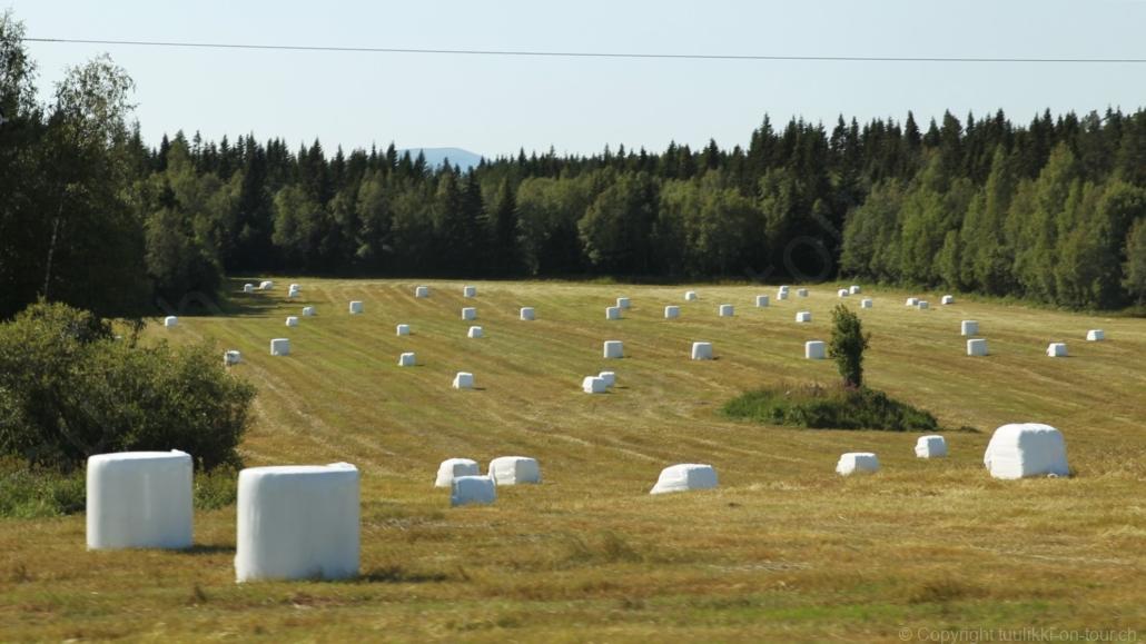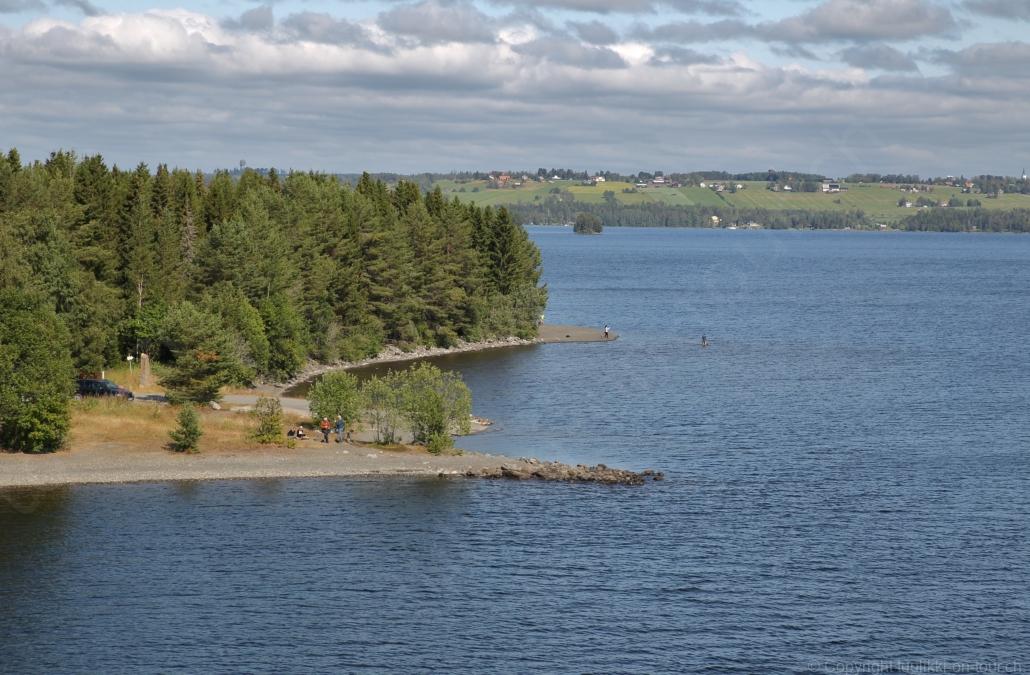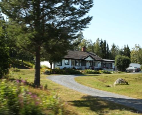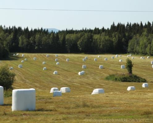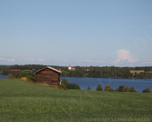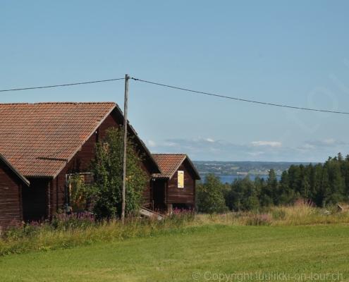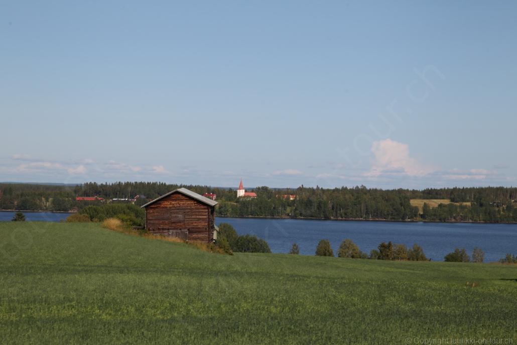 Noch vor Mitternacht wurden wir eingenebelt – nein, dieses Mal war es nicht ein Wetterphänomen, sondern der Staub der jungen Fahrer, die auf dem Kiesplatz die Beherrschung ihres Autos übten. Die Sonne weckt uns dann erst wieder um 7 Uhr, versteckt sich bald hinter Wolken und kommt dann für den Rest des Tages wieder hervor, sie schenkt uns einen wunderbar warmen Nachmittag. Den Vormittag verbrauchen wir eh für Tierarzt (die 28-Tage Wurmkur ist wieder nach für den Fall, dass wir nochmals nach Norwegen oder Finnland einreisen), Einkauf (im nördlichsten Lidl Schwedens) und Tankstopp. Im Biathlon-Wald drehen wir nochmals eine Runde bevor wir Östersund verlassen und dem 70 km langen See Stosjön entlang fahren. Östersund und die nähere Umgebung sind sehr grosszügig angelegt, es hat viele grosse leere Plätze und die Häuser etwas ausserhalb des Zentrums haben Umschwung. Wir wählen die Route über die Halbinsel Frösö, kommen am Flughafen vorbei und erhaschen immer wieder gute Blicke auf schöne Häuser und den blauen See. Landwirtschaft wird auf dem weiteren Weg gross geschrieben, Kühe weiden, Kartoffeln und Raps blühen, die Erdbeeren und Trübeli (Johannisbeeren) leuchten rot zwischen dem Kraut hervor und viele Felder sind voller weisser Grasballen, dazwischen sehen wir aber auch noch wie sogar in althergebrachter Manier geheut wird (über Holzgestecke). Nach kurzer Fahrt auf der E14 wechseln wir wieder auf eine niedriger klassierte Strasse (in der Karte als ‚scenic route‘ vermerkt), die dem Störsjön südwärts entlang führt – das Seeungeheuer, eine Seeschlange mit hundeähnlichem Schädel von etwa 6 m, das im See leben soll, haben wir nicht gesehen. Es herrscht fast kein Verkehr, so können Wald, Wiese, Orte, Kirchen und Wasser gut ‚begutachtet‘ werden. Entlang der Strasse wird wieder vor Rehen, Elchen, Schneemobilen und Kindern gewarnt – wir sehen und überholen nur einen Jogger im oben-ohne Tenu. In Kövra, am Südwest-Ufer entdecken wir eine spezielle Holzkirche mit einem Schindeln-bedecktem Turm und daneben einen Gedenkstein an den Pastor John Ongman der anfangs 20. Jahrhundert in Indien, Brasilien, Kongo, und sogar Japan missionierte. Zur Kirche selbst konnten wir leider nicht mehr herausfinden. Unser heutiger Nachtplatz ist vor einem Fussball-Feld und in der Nähe der Skistation. Nebenan gibt es eine Wiese, auf der Kraniche herumstolzieren. Den Apéro nehmen wir draussen in der Sonne ein und weil’s so schön und ruhig ist, ohne Mücken und Fliegen, bleiben die Hunde gleich liegen bis zum Abendspaziergang.