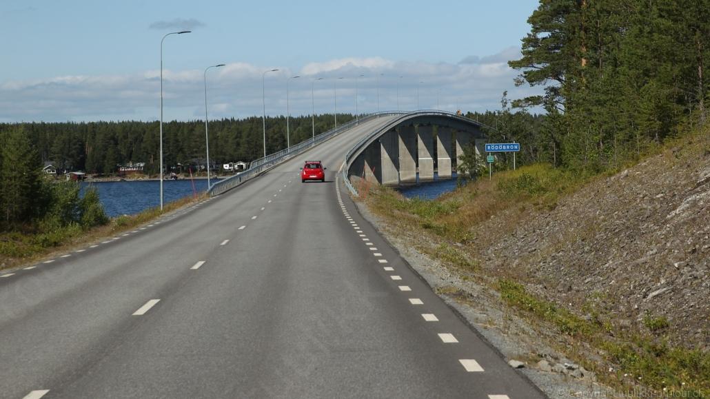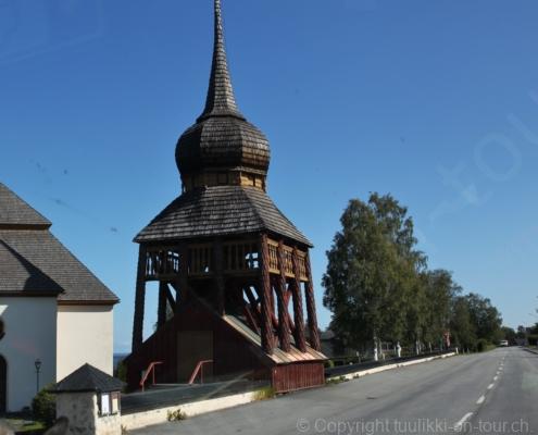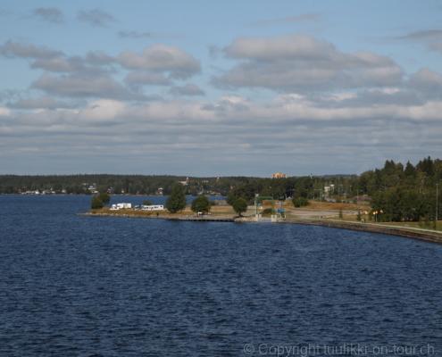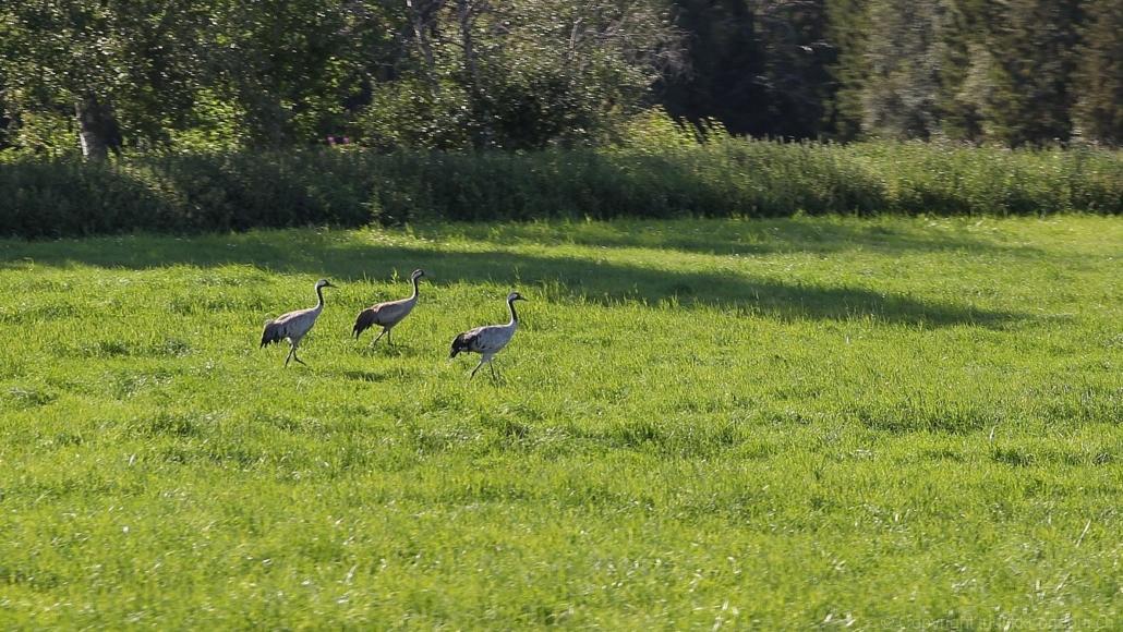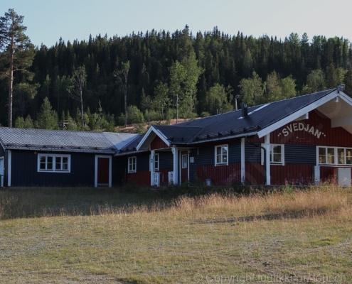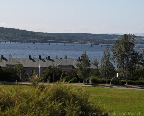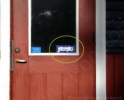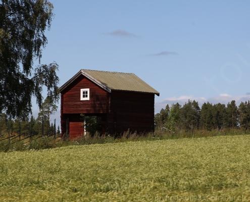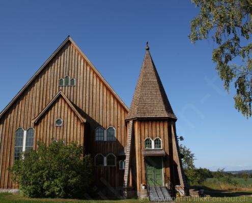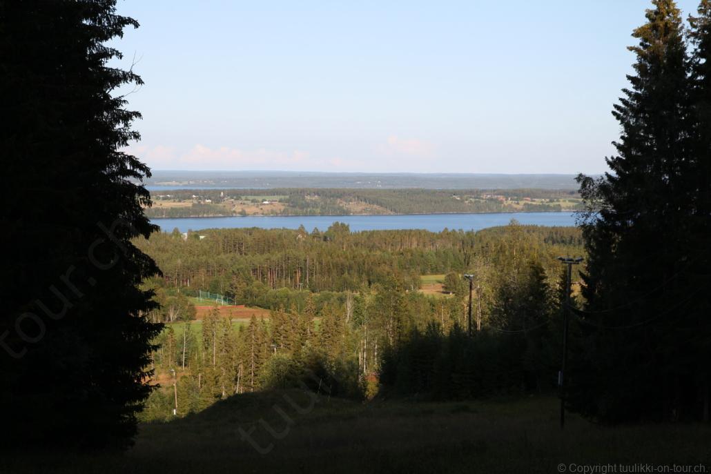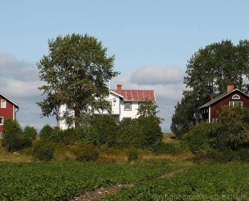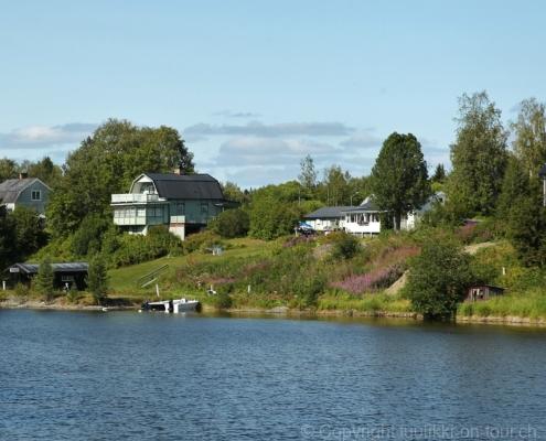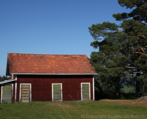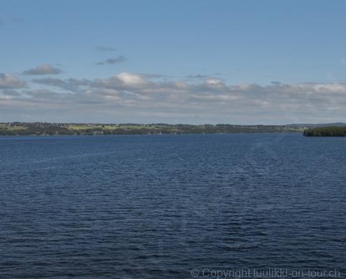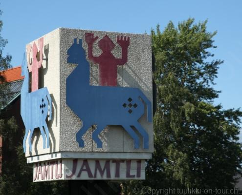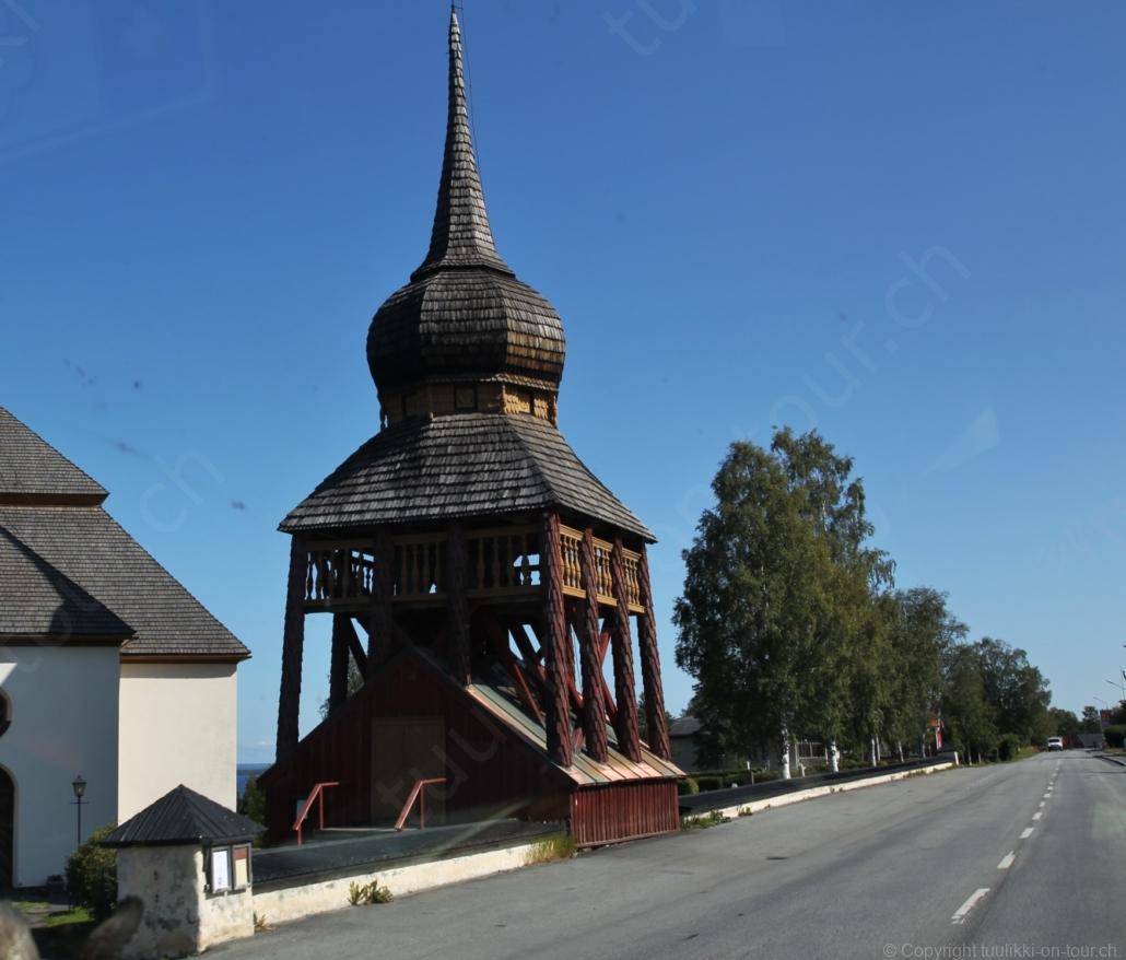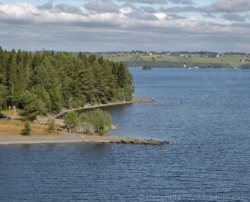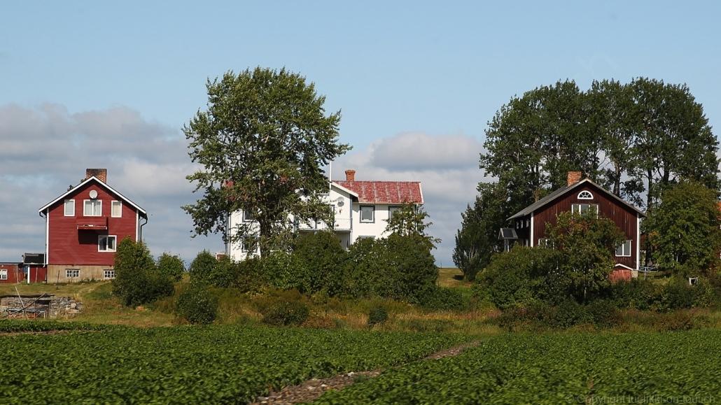 Noch vor Mitternacht wurden wir eingenebelt – nein, dieses Mal war es nicht ein Wetterphänomen, sondern der Staub der jungen Fahrer, die auf dem Kiesplatz die Beherrschung ihres Autos übten. Die Sonne weckt uns dann erst wieder um 7 Uhr, versteckt sich bald hinter Wolken und kommt dann für den Rest des Tages wieder hervor, sie schenkt uns einen wunderbar warmen Nachmittag. Den Vormittag verbrauchen wir eh für Tierarzt (die 28-Tage Wurmkur ist wieder nach für den Fall, dass wir nochmals nach Norwegen oder Finnland einreisen), Einkauf (im nördlichsten Lidl Schwedens) und Tankstopp. Im Biathlon-Wald drehen wir nochmals eine Runde bevor wir Östersund verlassen und dem 70 km langen See Stosjön entlang fahren. Östersund und die nähere Umgebung sind sehr grosszügig angelegt, es hat viele grosse leere Plätze und die Häuser etwas ausserhalb des Zentrums haben Umschwung. Wir wählen die Route über die Halbinsel Frösö, kommen am Flughafen vorbei und erhaschen immer wieder gute Blicke auf schöne Häuser und den blauen See. Landwirtschaft wird auf dem weiteren Weg gross geschrieben, Kühe weiden, Kartoffeln und Raps blühen, die Erdbeeren und Trübeli (Johannisbeeren) leuchten rot zwischen dem Kraut hervor und viele Felder sind voller weisser Grasballen, dazwischen sehen wir aber auch noch wie sogar in althergebrachter Manier geheut wird (über Holzgestecke). Nach kurzer Fahrt auf der E14 wechseln wir wieder auf eine niedriger klassierte Strasse (in der Karte als ‚scenic route‘ vermerkt), die dem Störsjön südwärts entlang führt – das Seeungeheuer, eine Seeschlange mit hundeähnlichem Schädel von etwa 6 m, das im See leben soll, haben wir nicht gesehen. Es herrscht fast kein Verkehr, so können Wald, Wiese, Orte, Kirchen und Wasser gut ‚begutachtet‘ werden. Entlang der Strasse wird wieder vor Rehen, Elchen, Schneemobilen und Kindern gewarnt – wir sehen und überholen nur einen Jogger im oben-ohne Tenu. In Kövra, am Südwest-Ufer entdecken wir eine spezielle Holzkirche mit einem Schindeln-bedecktem Turm und daneben einen Gedenkstein an den Pastor John Ongman der anfangs 20. Jahrhundert in Indien, Brasilien, Kongo, und sogar Japan missionierte. Zur Kirche selbst konnten wir leider nicht mehr herausfinden. Unser heutiger Nachtplatz ist vor einem Fussball-Feld und in der Nähe der Skistation. Nebenan gibt es eine Wiese, auf der Kraniche herumstolzieren. Den Apéro nehmen wir draussen in der Sonne ein und weil’s so schön und ruhig ist, ohne Mücken und Fliegen, bleiben die Hunde gleich liegen bis zum Abendspaziergang.